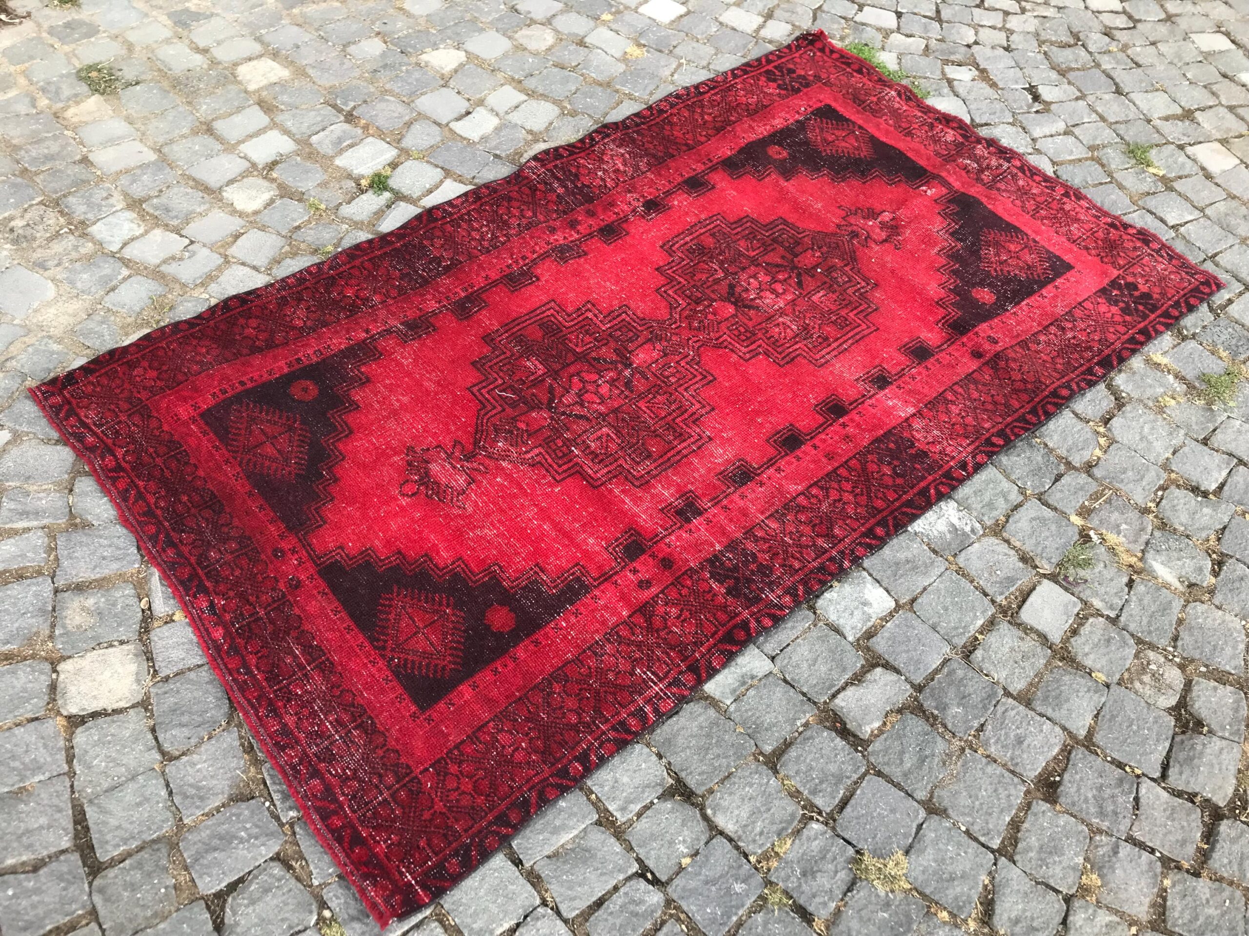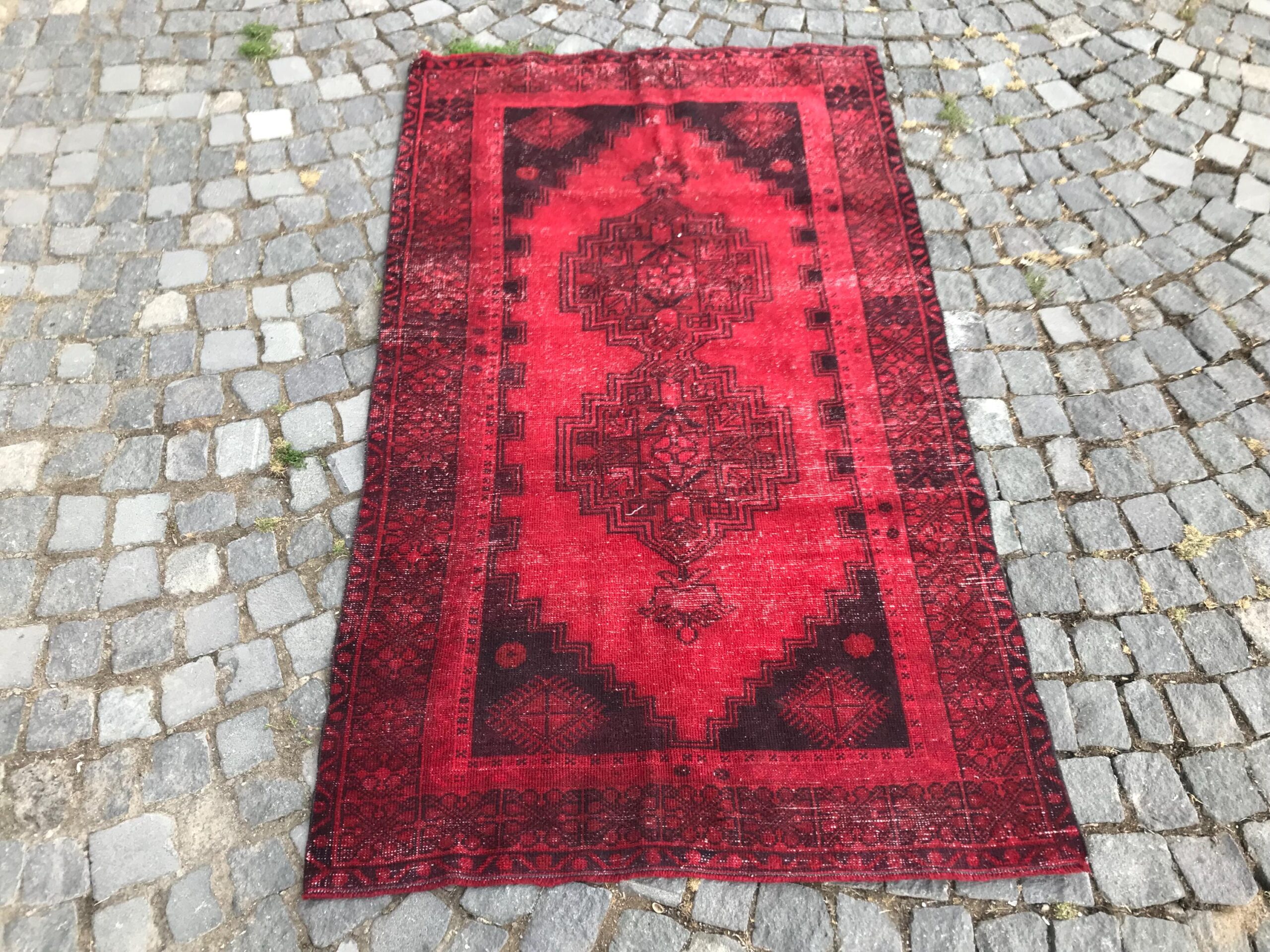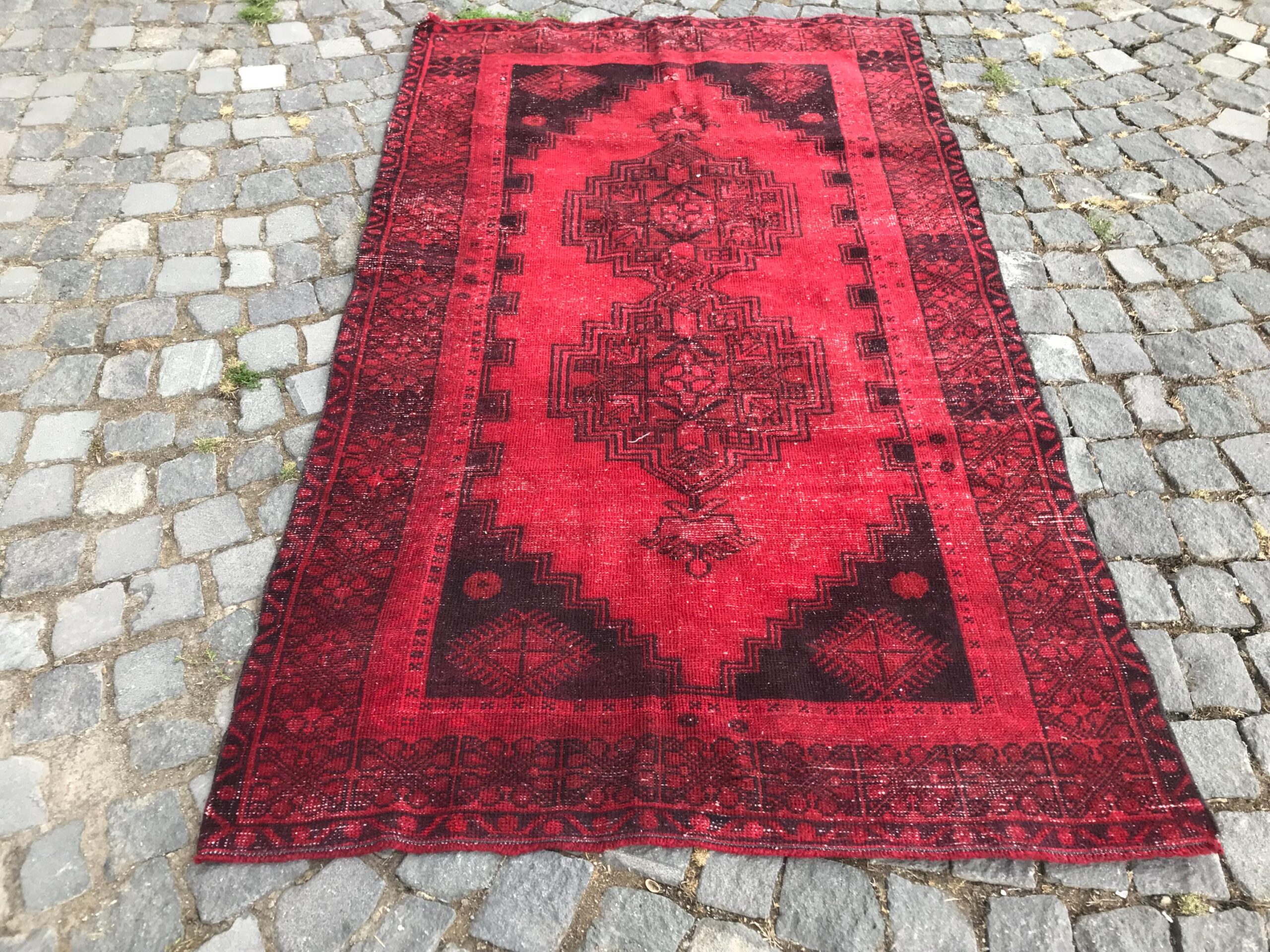 This is a vintage overdyed rug made through over-dyeing an authentic vintage Turkish rug using natural (vegetable) dyes. This rug originated in a small village in Turkey where it was hand-knotted from natural wool (sheep) by skilled Anatolian women during around the 1980s. Natural materials are more durable than synthetic materials guaranteeing a rug that can last for years while natural dyes provide colors that gets more beautiful as years pass by especially when in direct sunlight.