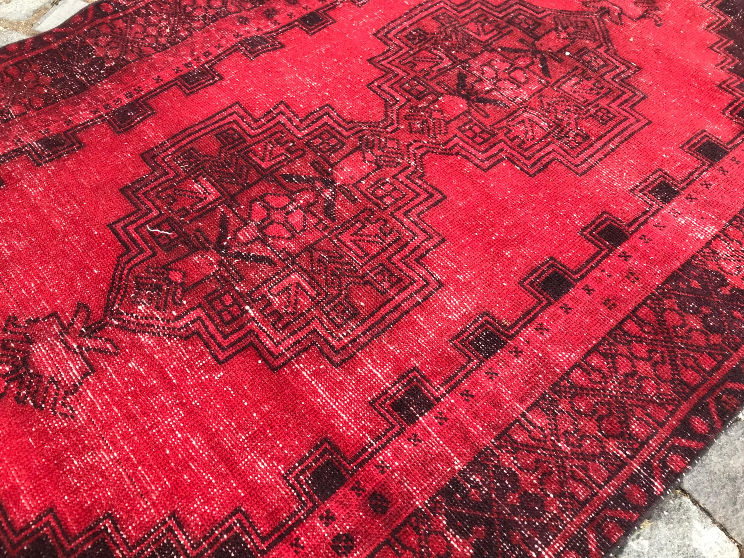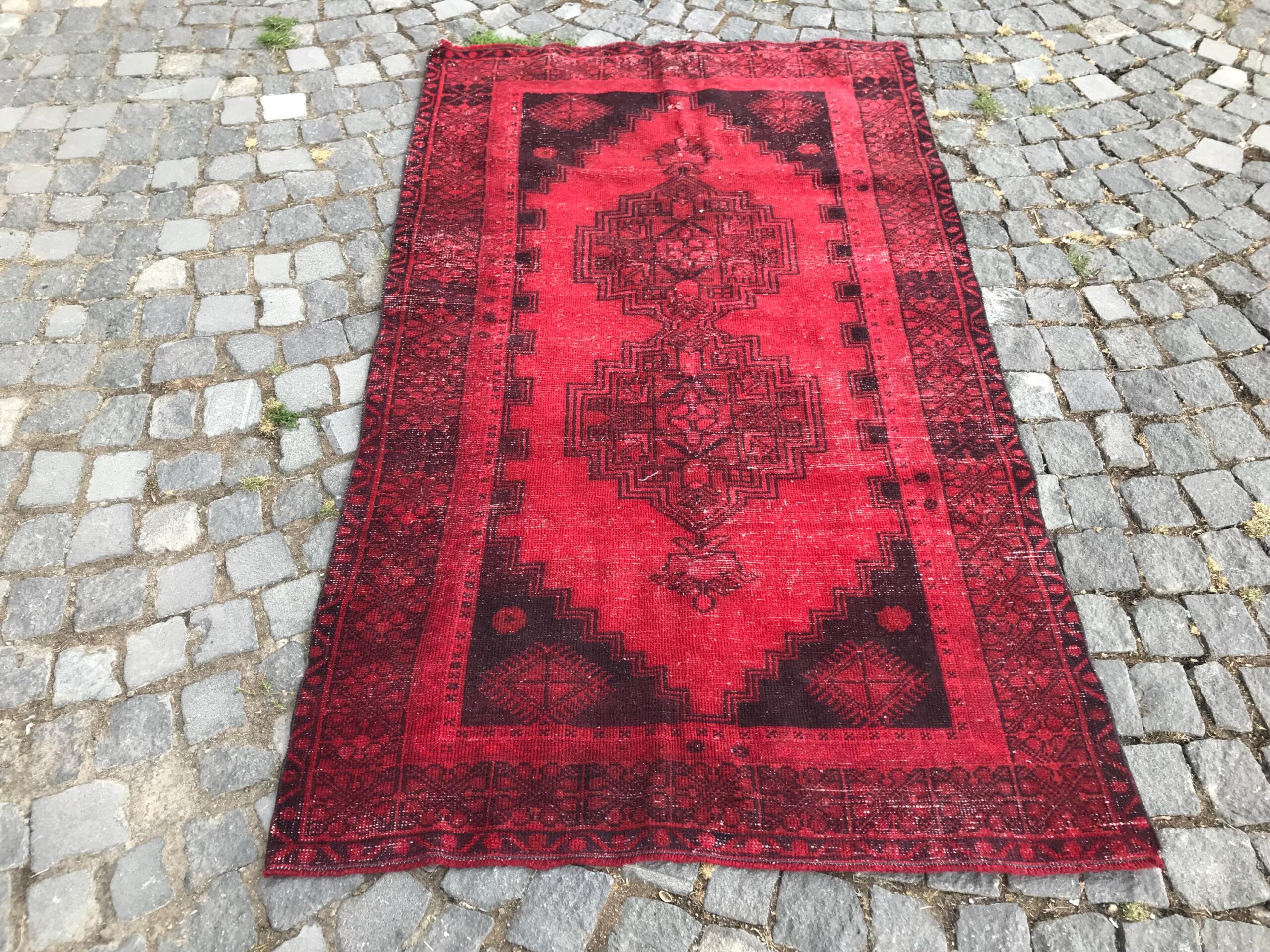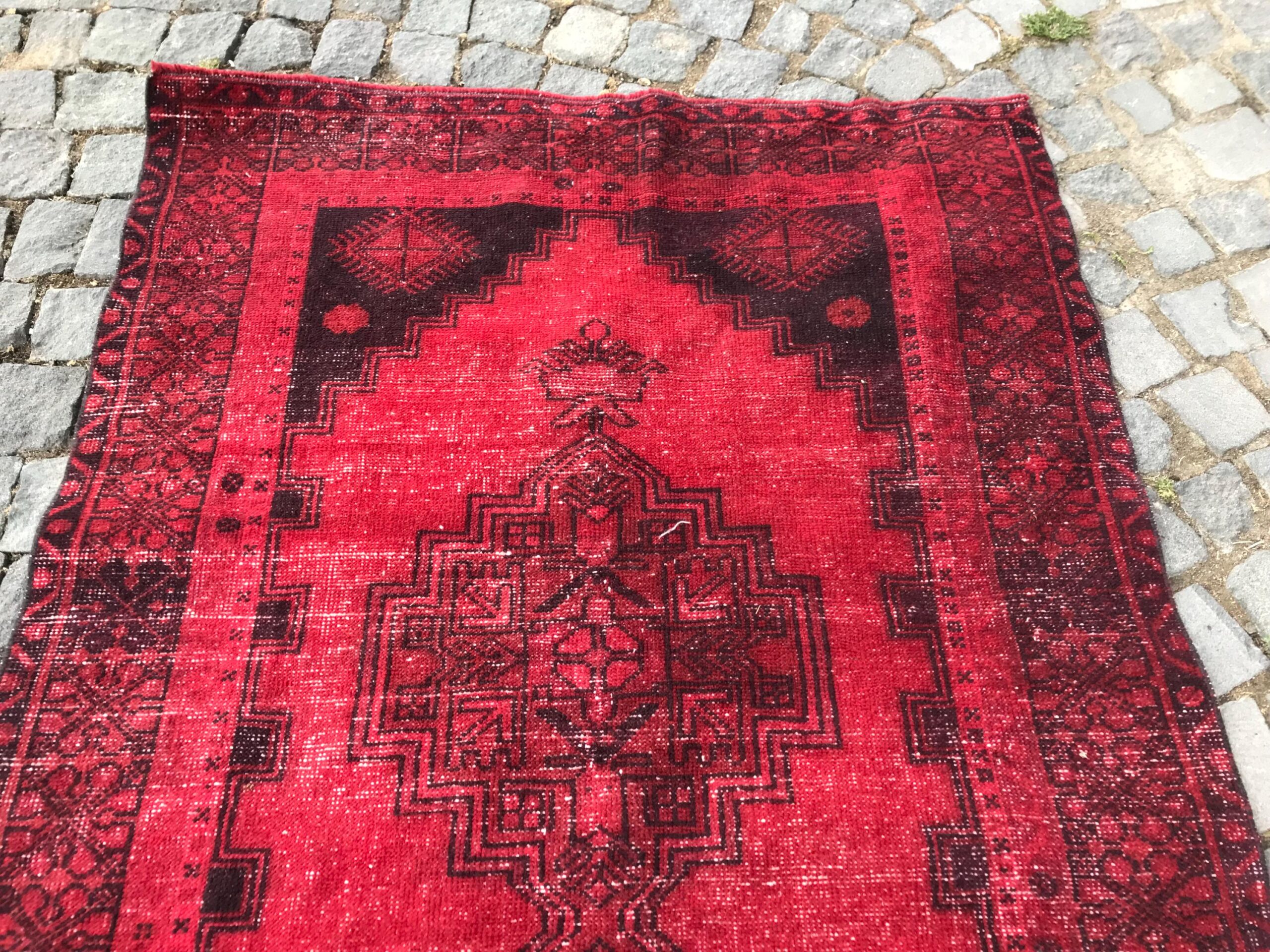 This is a vintage overdyed rug made through over-dyeing an authentic vintage Turkish rug using natural (vegetable) dyes. This rug originated in a small village in Turkey where it was hand-knotted from natural wool (sheep) by skilled Anatolian women during around the 1980s. Natural materials are more durable than synthetic materials guaranteeing a rug that can last for years while natural dyes provide colors that gets more beautiful as years pass by especially when in direct sunlight.
