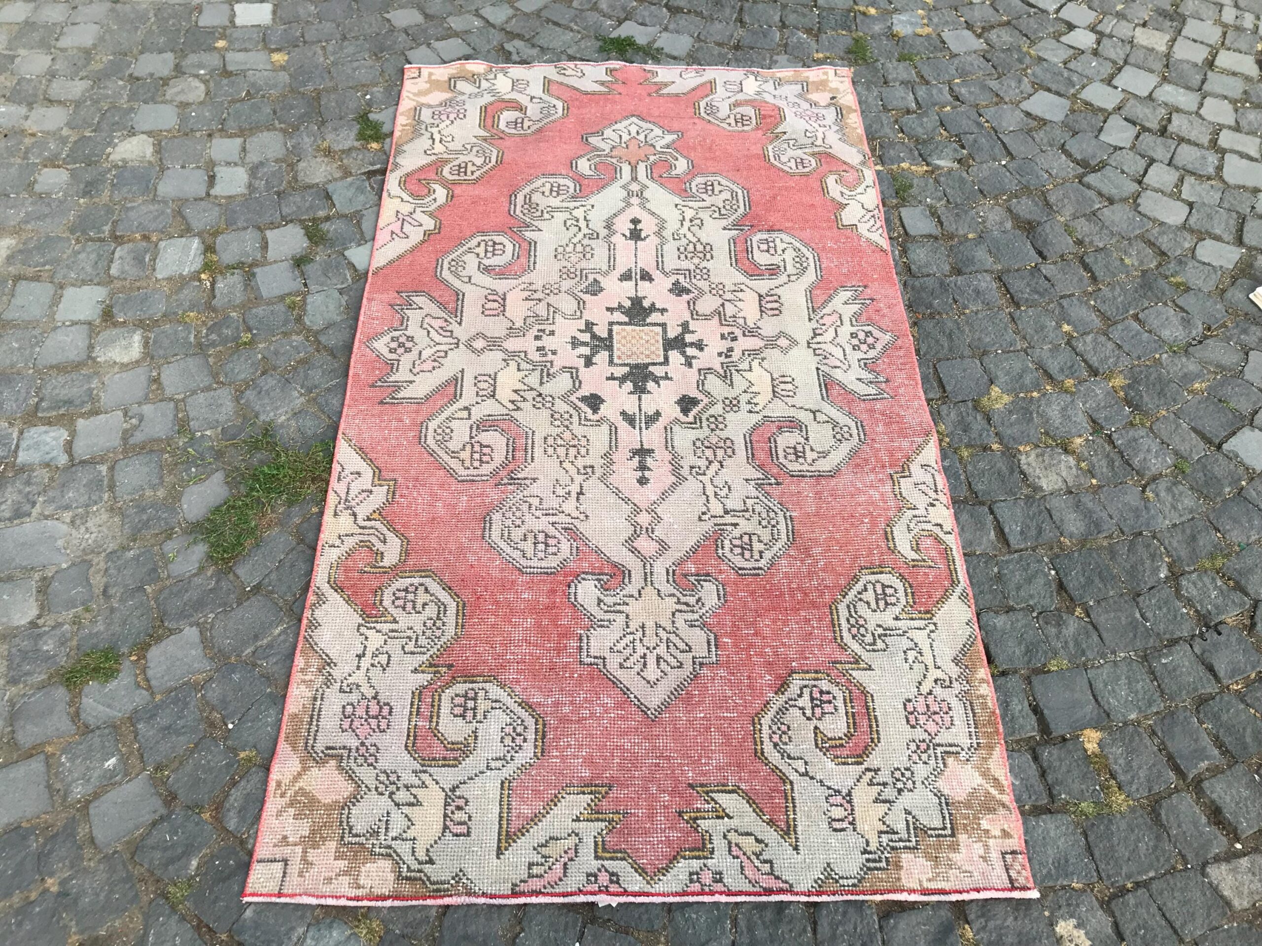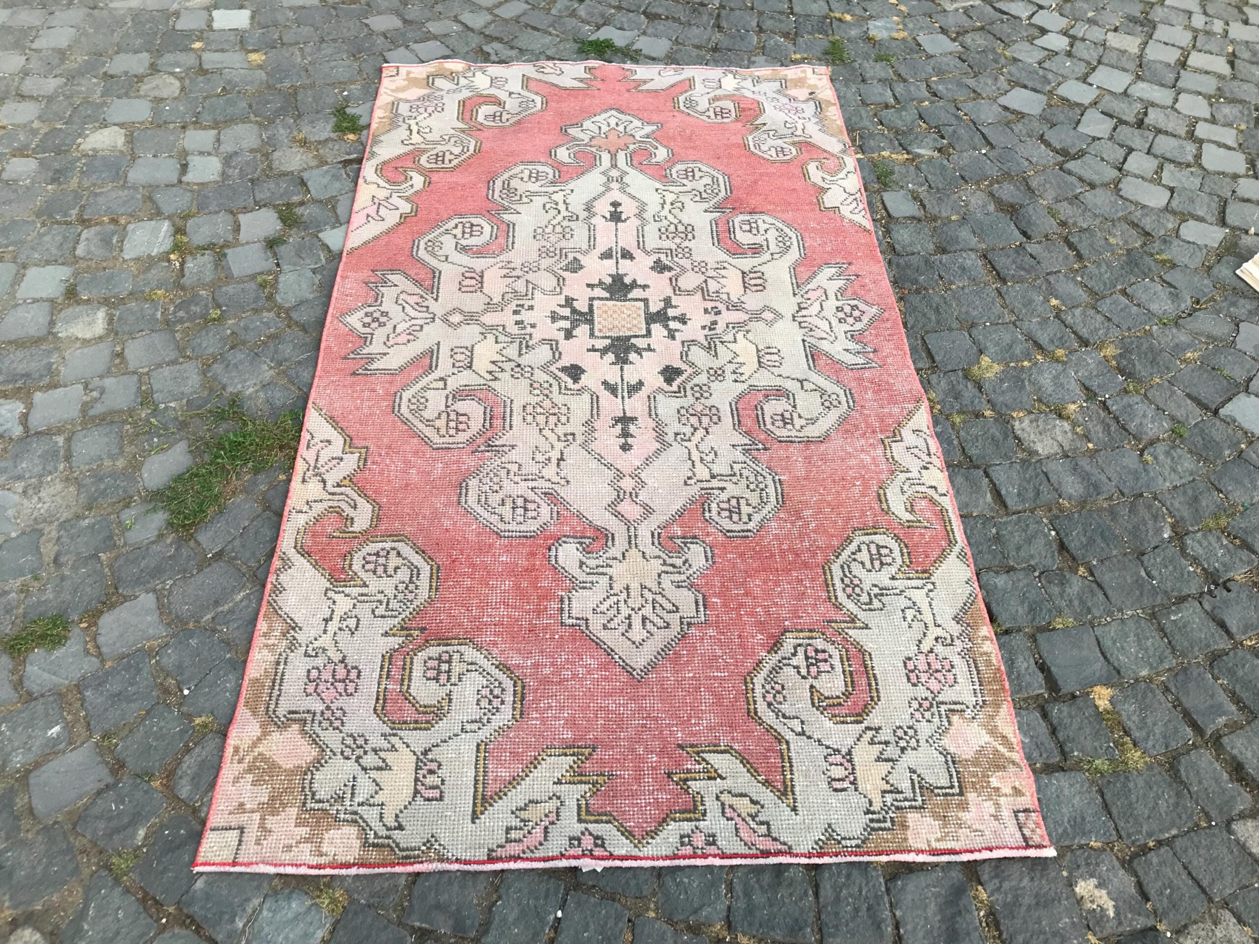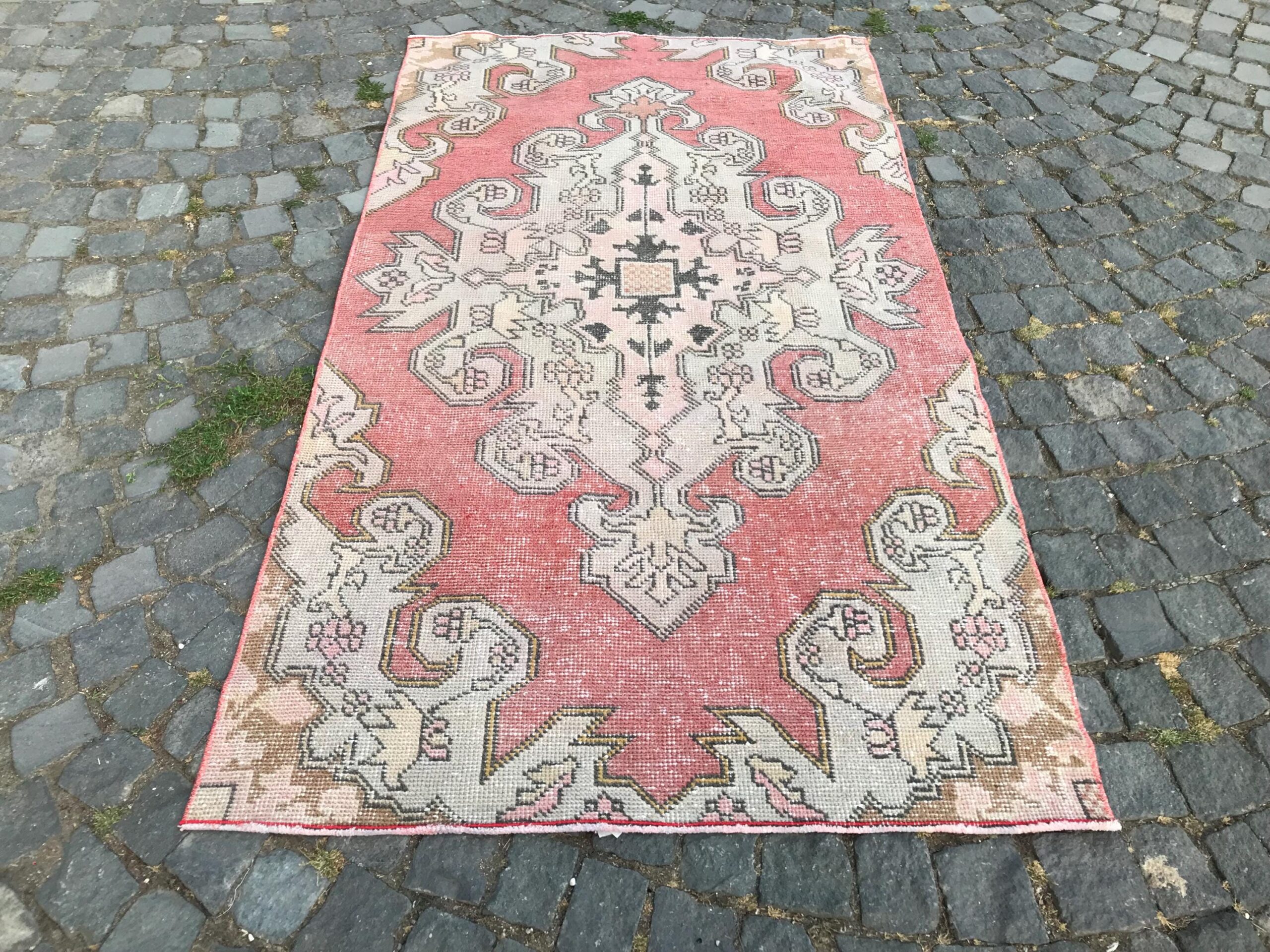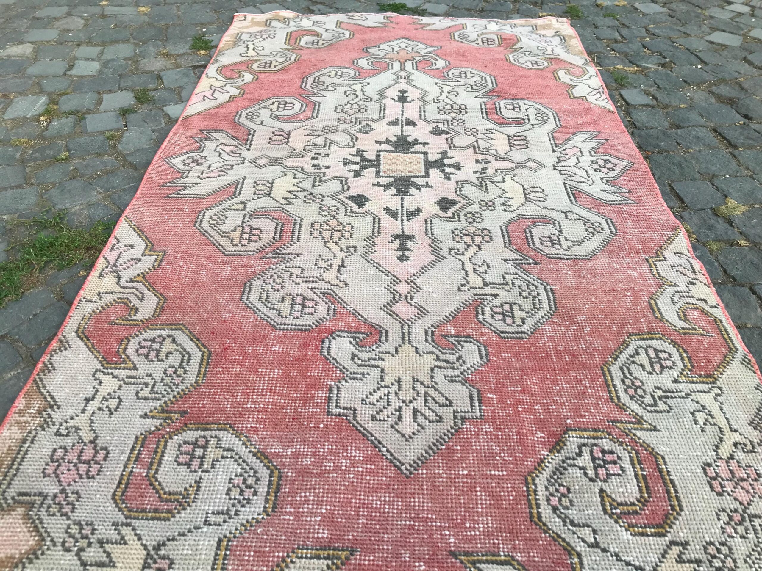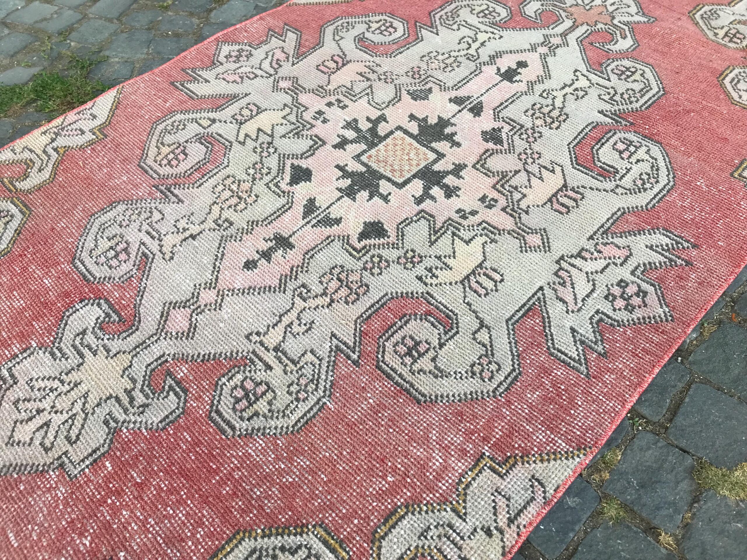 This is a vintage Turkish rug hand-knotted in a small village in Turkey by skilled Anatolian women during around the 1970s. It is made from natural wool (sheep) and dyed using all-natural (vegetable) dyes. Natural materials are more durable than synthetic materials guaranteeing a rug that can last for years while natural dyes provide colors that gets more beautiful as years pass by especially when in direct sunlight.