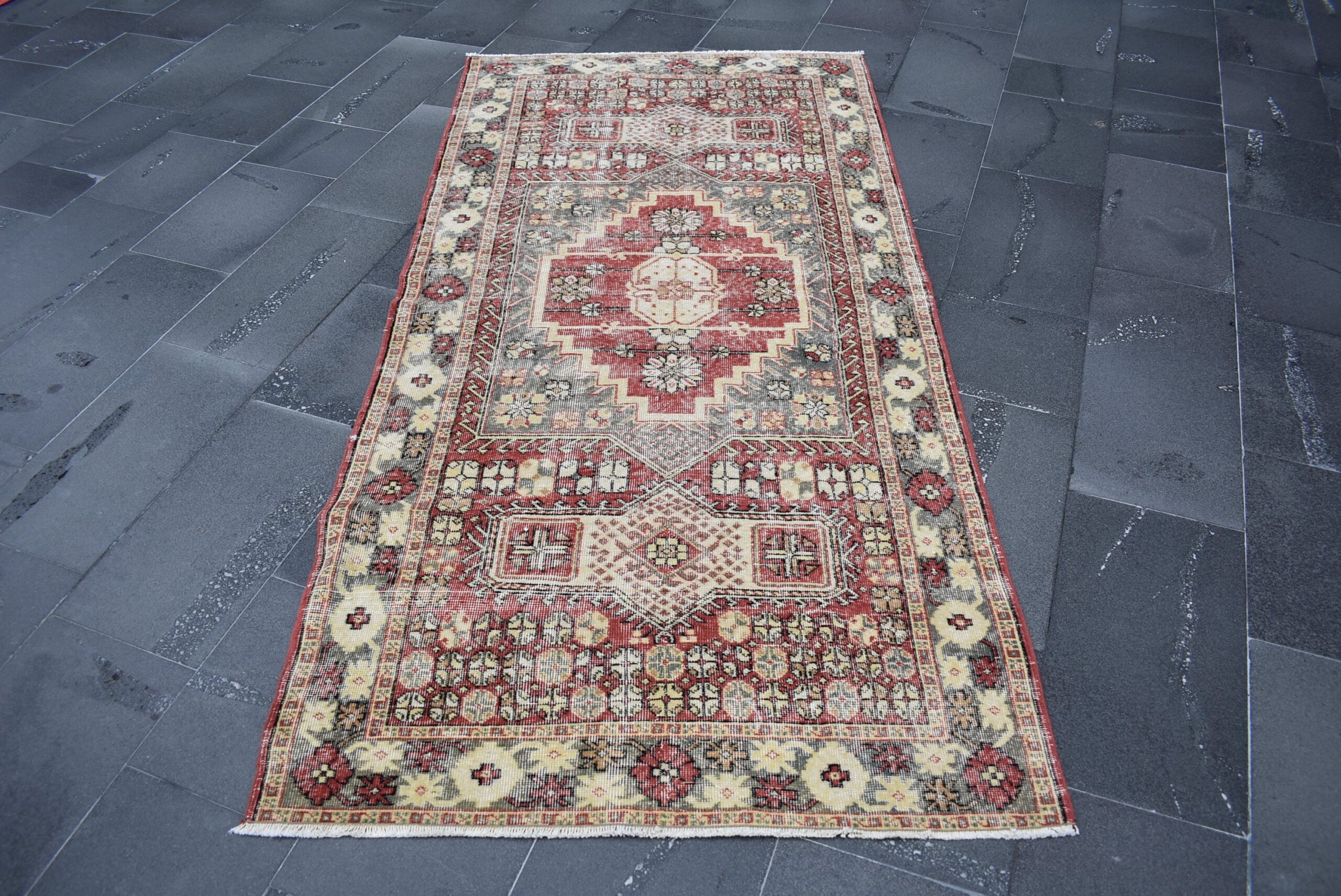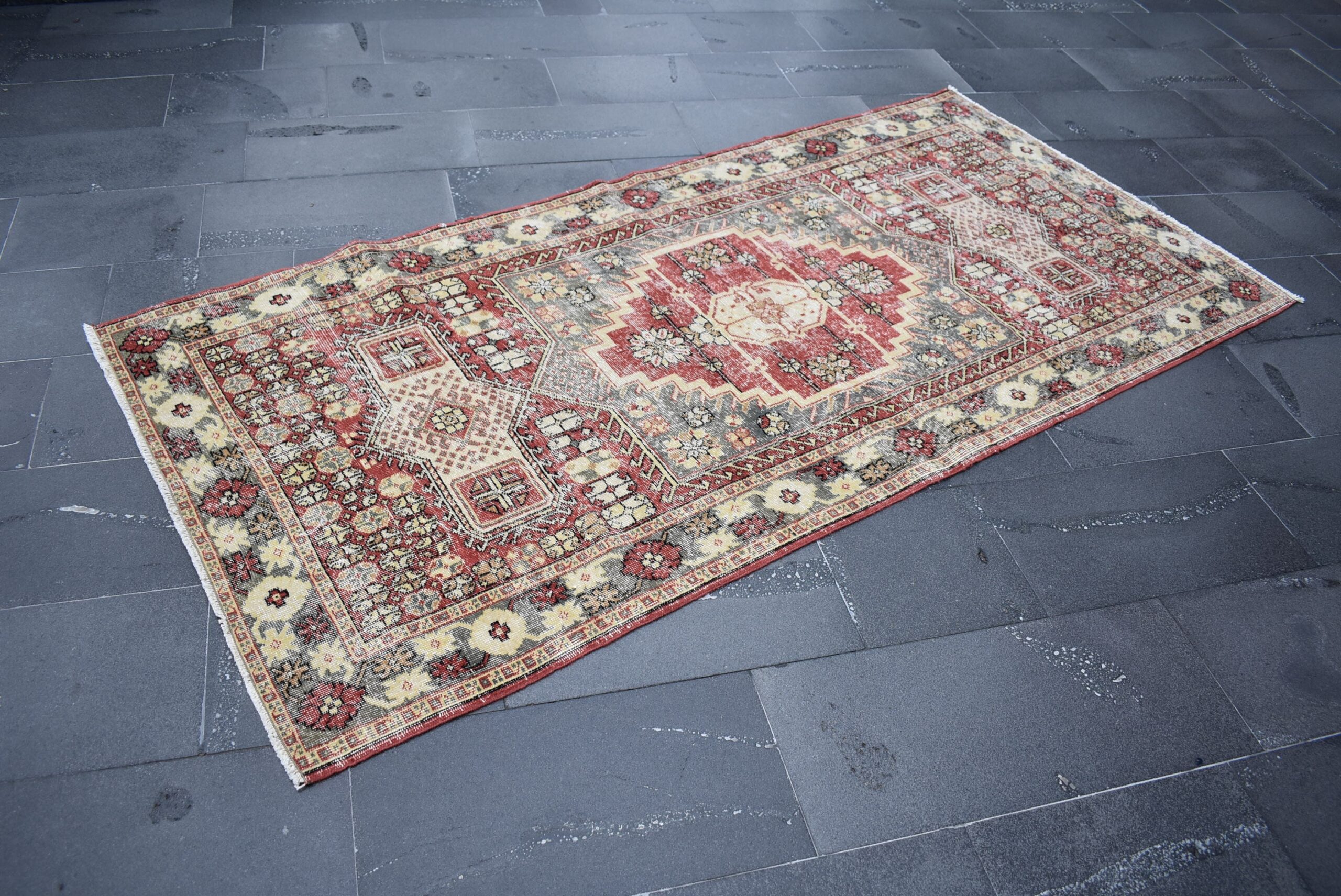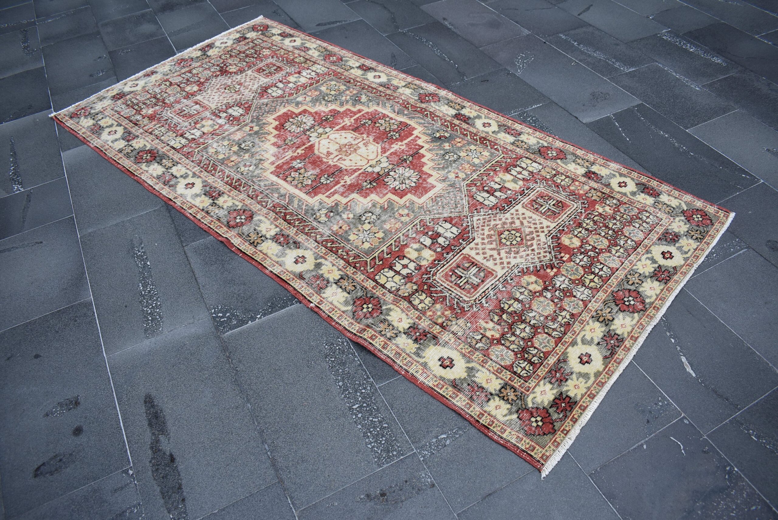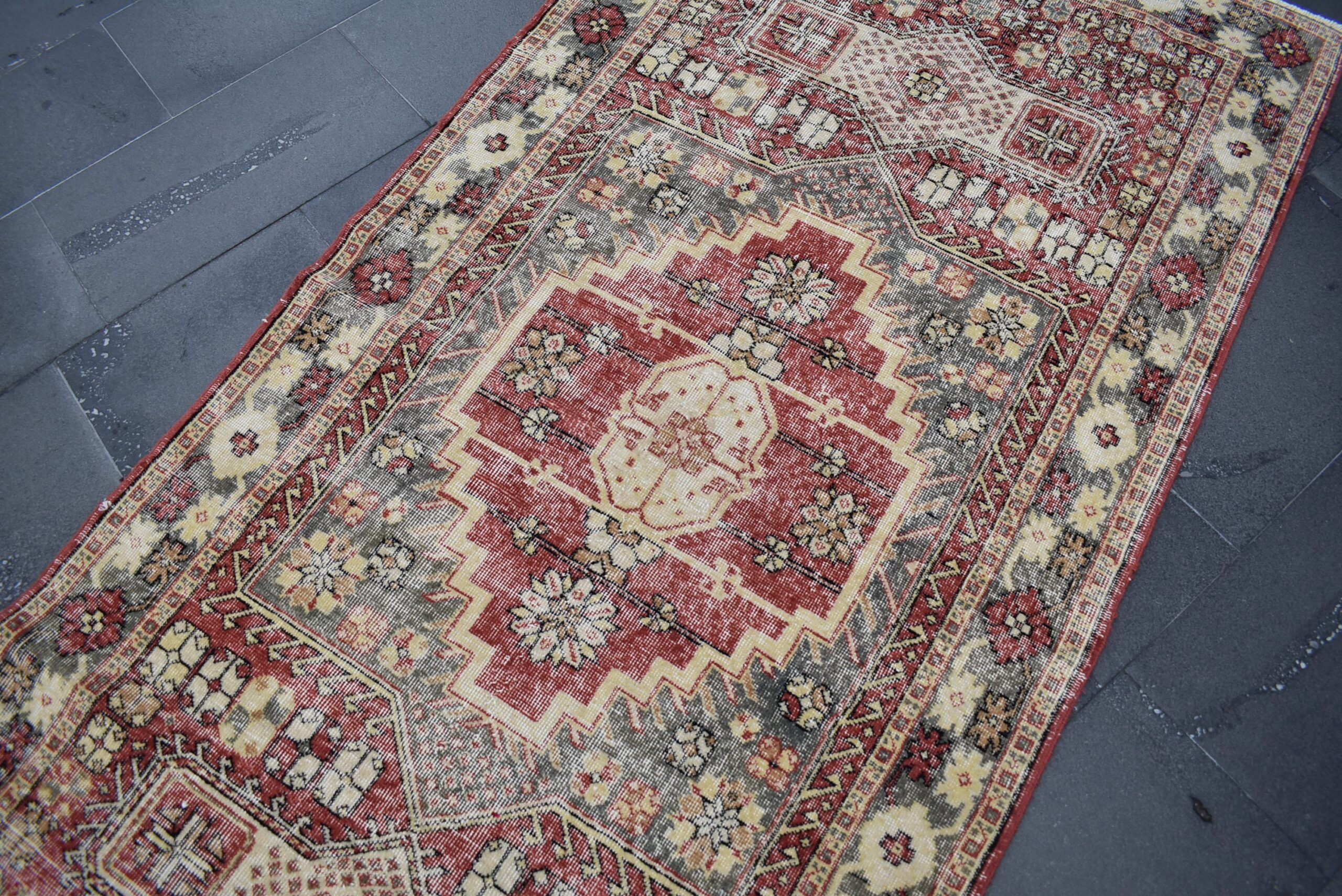 Beautiful and one-of-a-kind 3.8 ft. x 7.9 ft. (115 cm x 240 cm) vintage Turkish rug hand-knotted in Turkey from organic wool. This is an authentic vintage Turkish rug from the 1980s that has worn admirably to perfection.