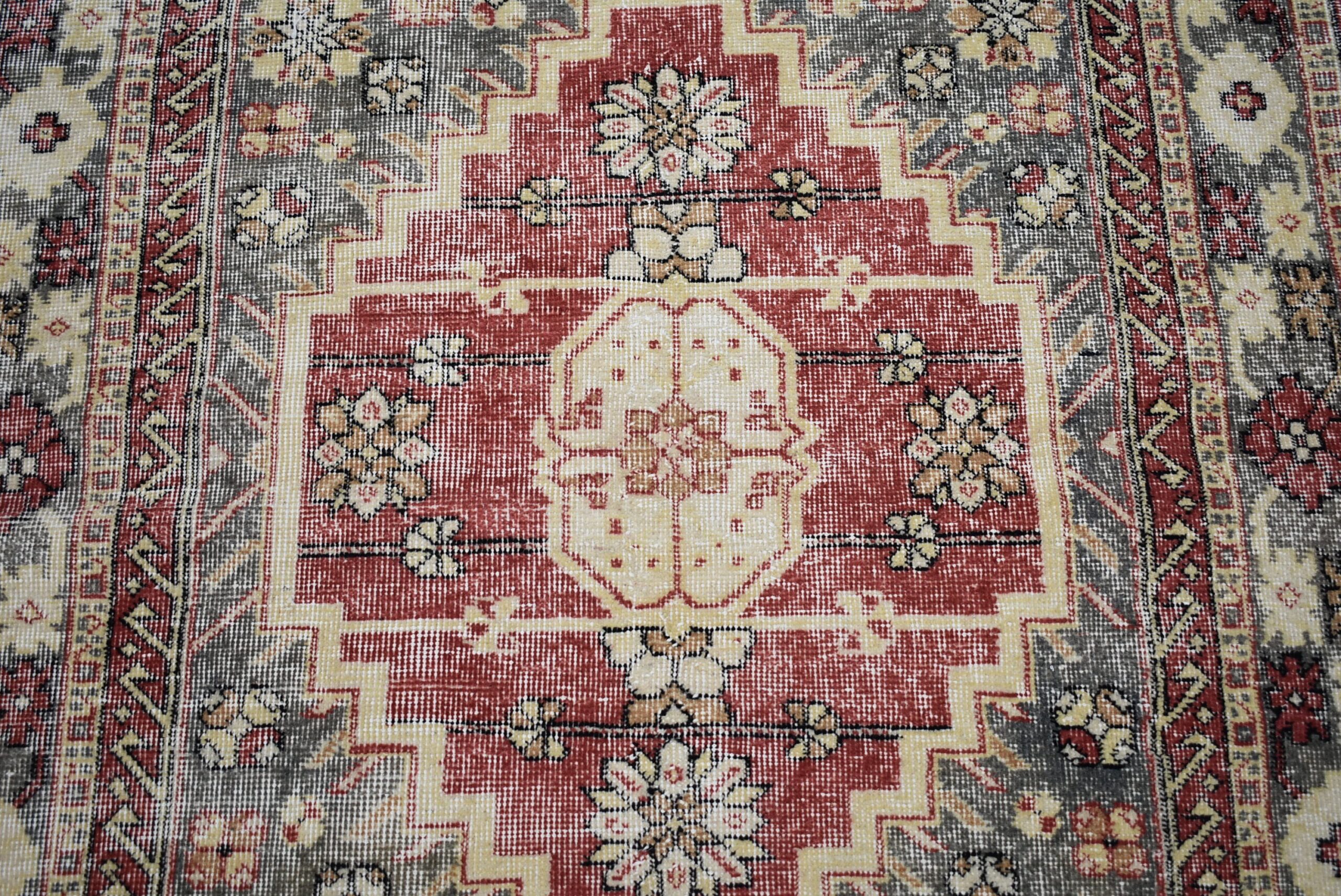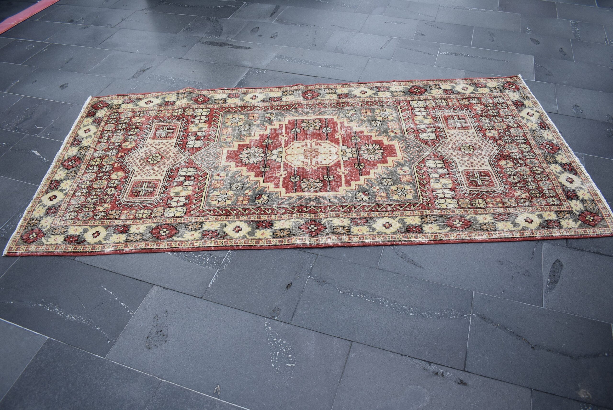 This is a vintage Turkish rug hand-knotted in a small village in Turkey by skilled Anatolian women during around the 1980s. It is made from natural wool (sheep) and dyed using all-natural (vegetable) dyes. Natural materials are more durable than synthetic materials guaranteeing a rug that can last for years while natural dyes provide colors that gets more beautiful as years pass by especially when in direct sunlight.