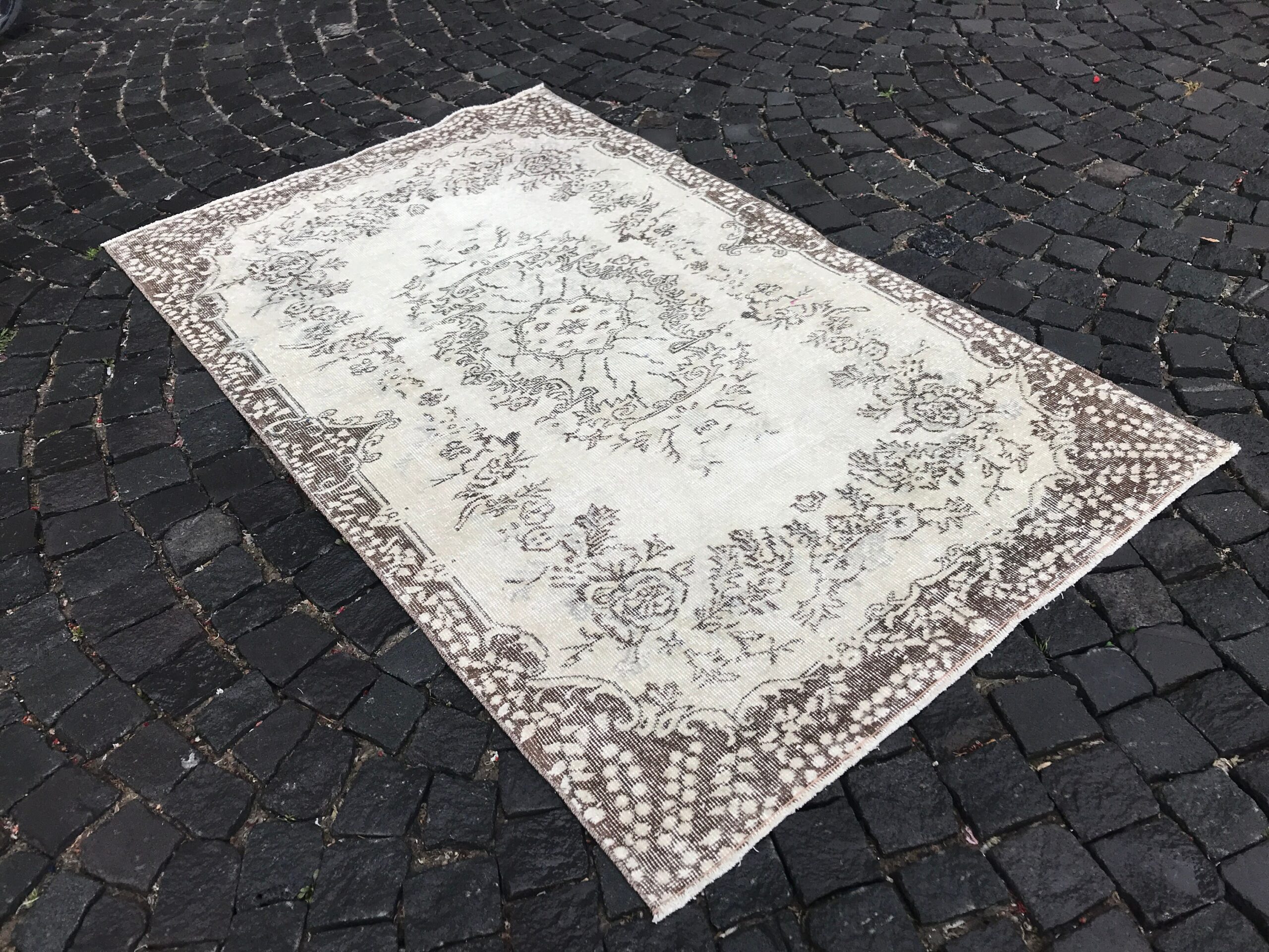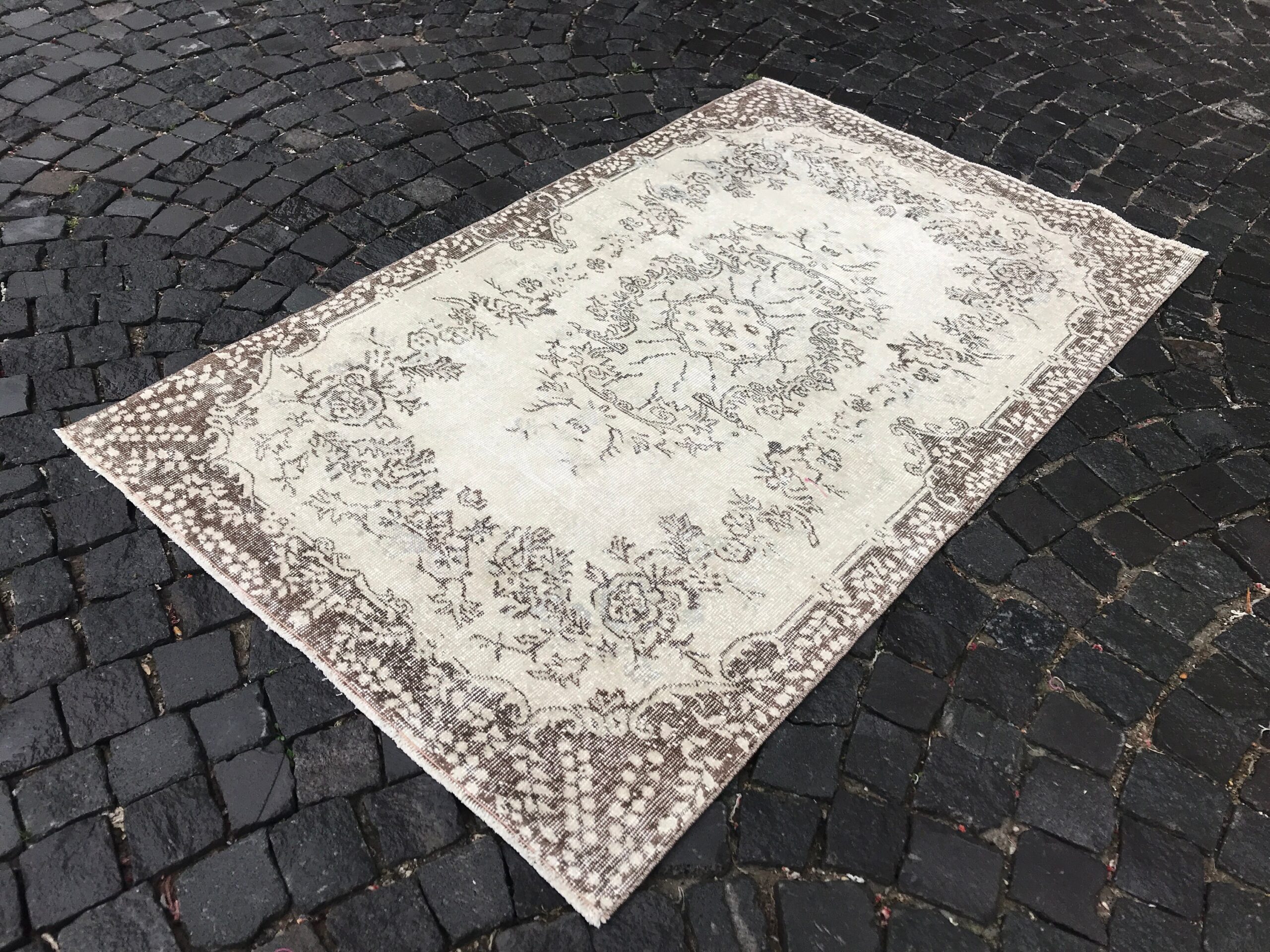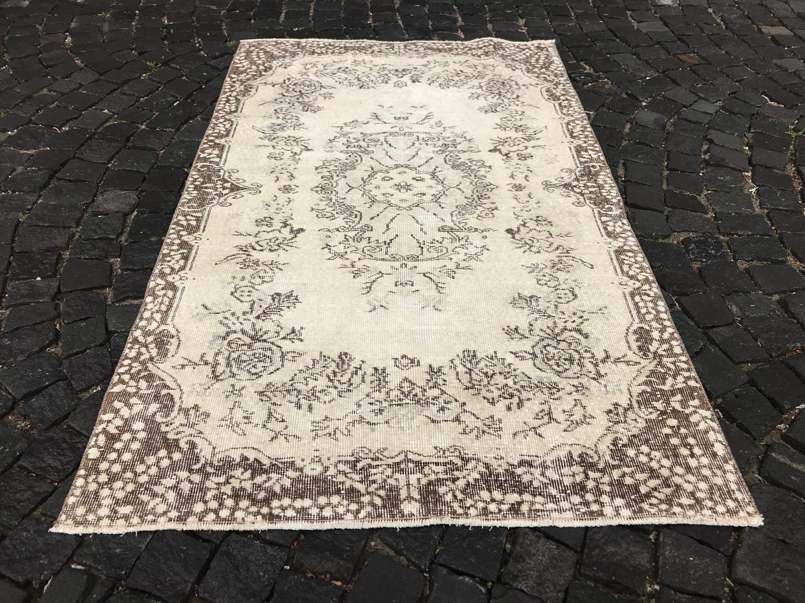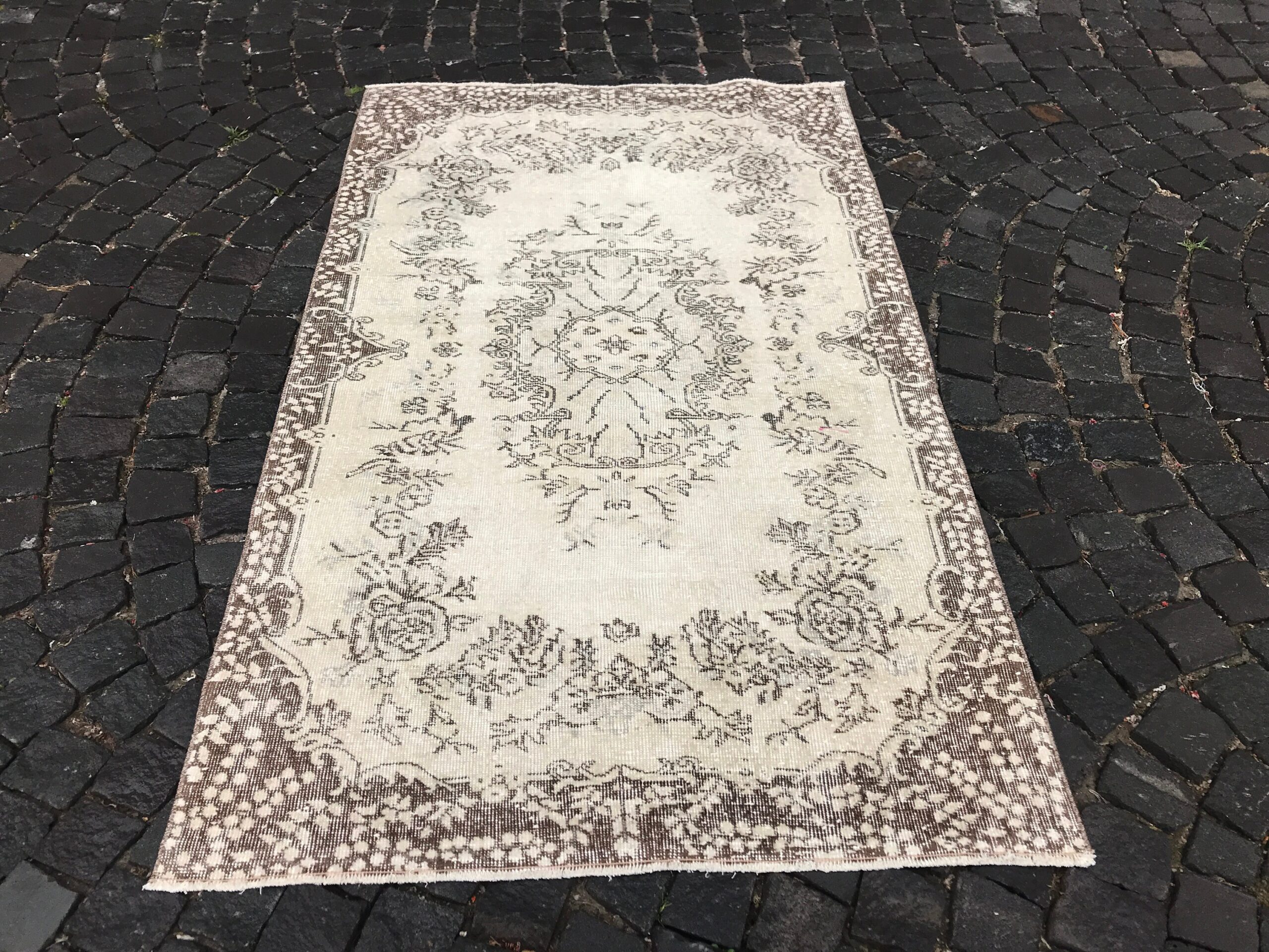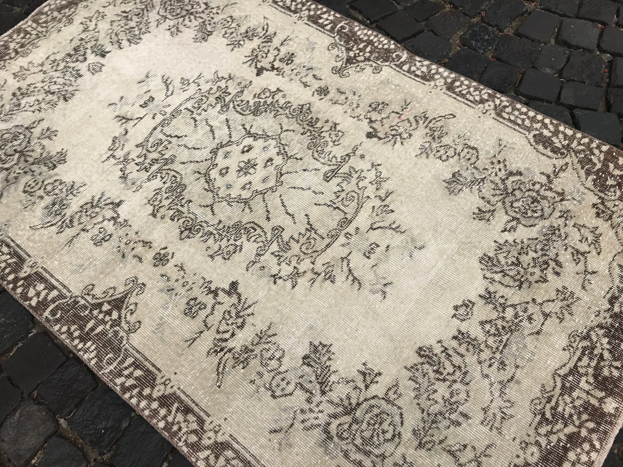This is a vintage Turkish rug hand-knotted in a small village in Turkey by skilled Anatolian women during around the 1990s. It is made from natural wool (sheep) and dyed using all-natural (vegetable) dyes. Natural materials are more durable than synthetic materials guaranteeing a rug that can last for years while natural dyes provide colors that gets more beautiful as years pass by especially when in direct sunlight.
