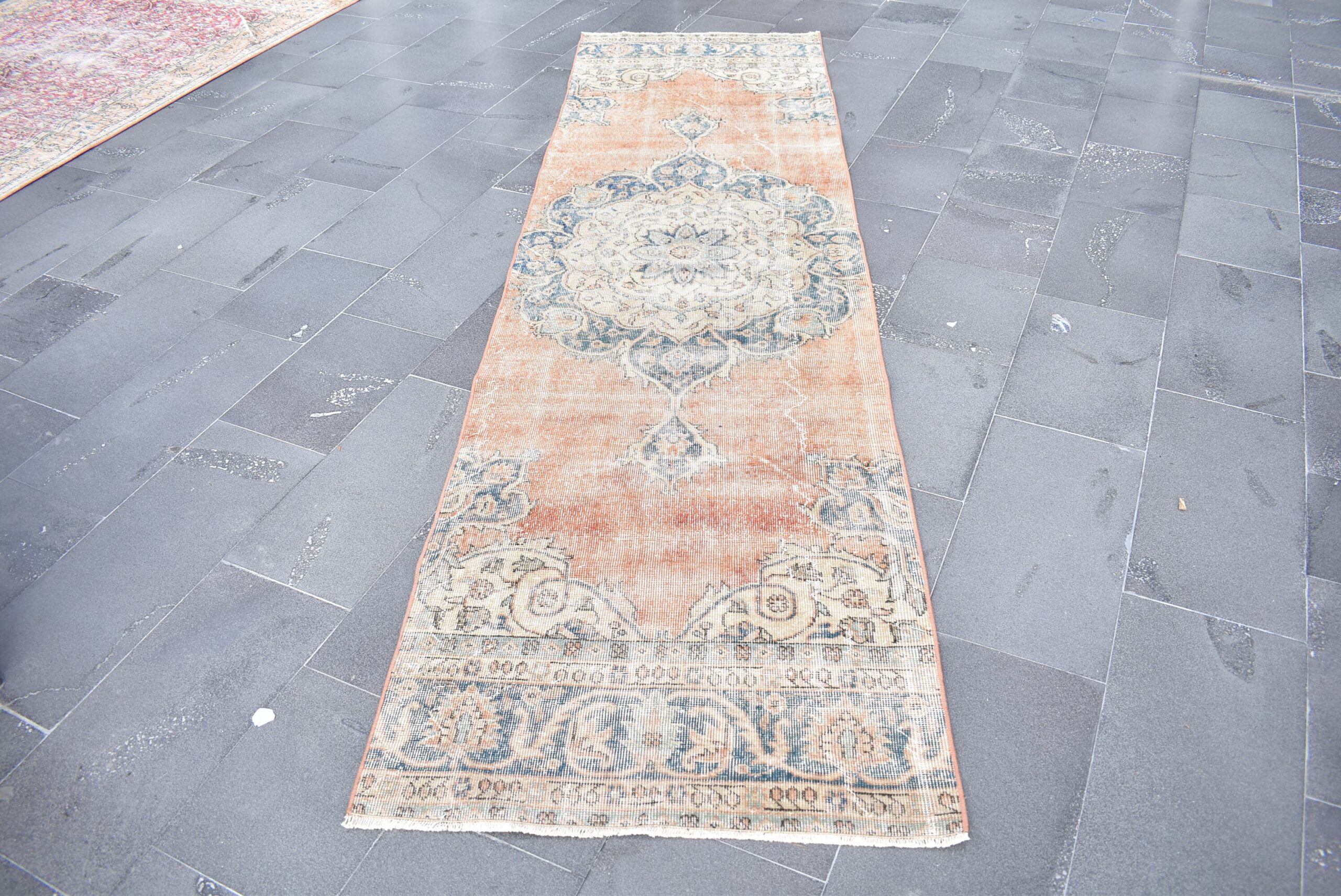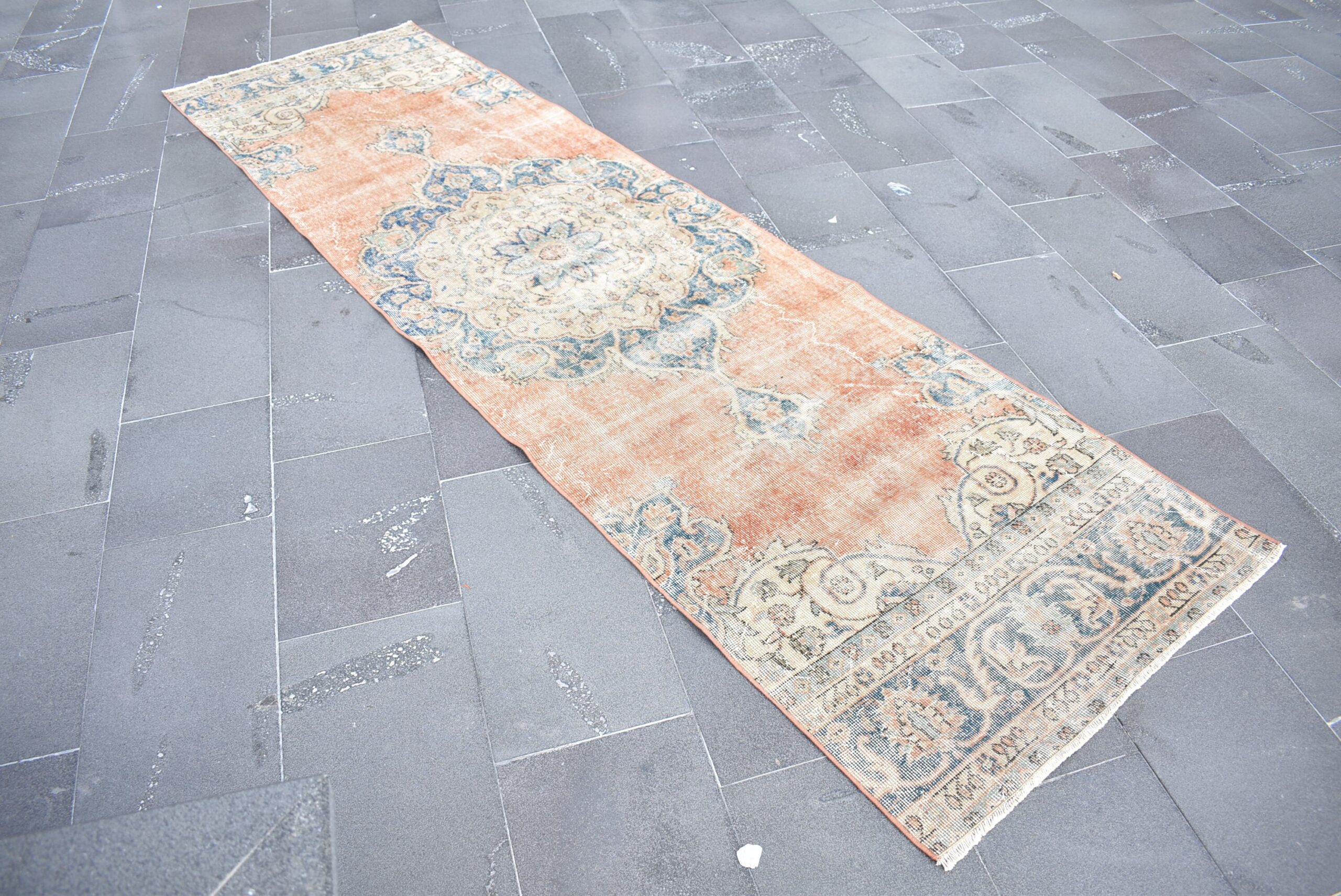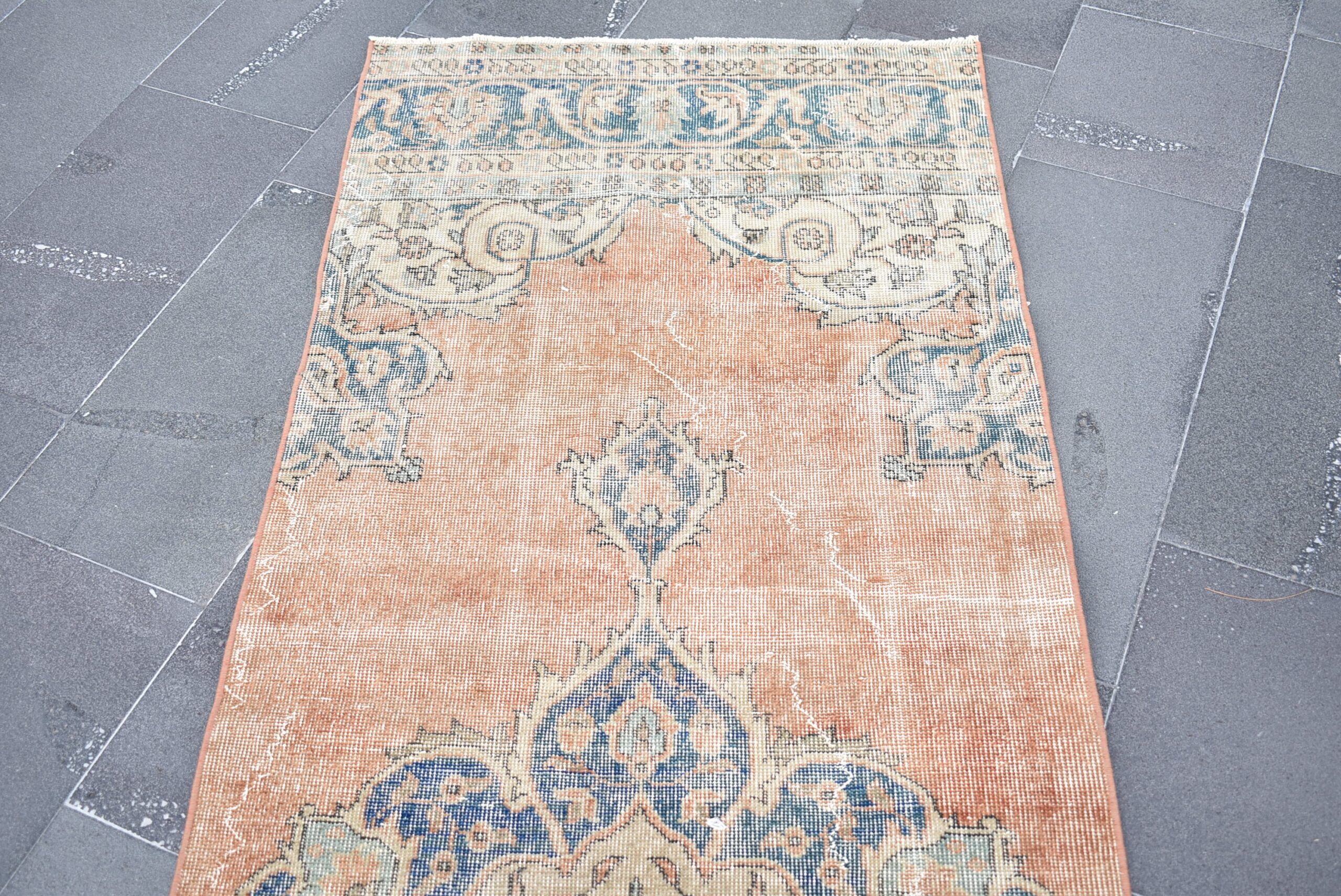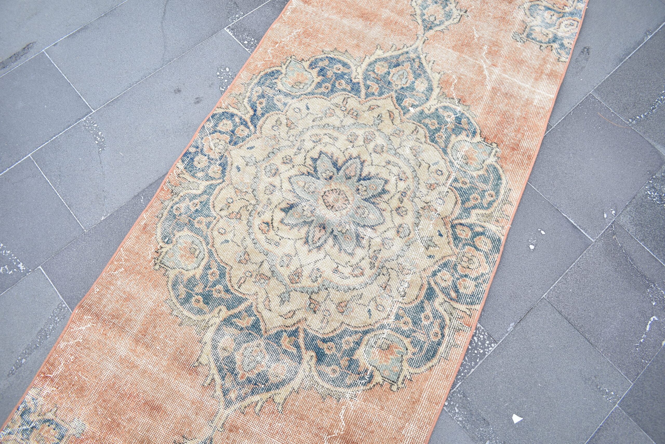 Pretty and one-of-a-kind 3 ft. x 10.3 ft. (90 cm x 315 cm) vintage Turkish rug hand-knotted in Turkey from organic wool. This is an authentic vintage Turkish rug from the 1970s that has worn splendidly to perfection.