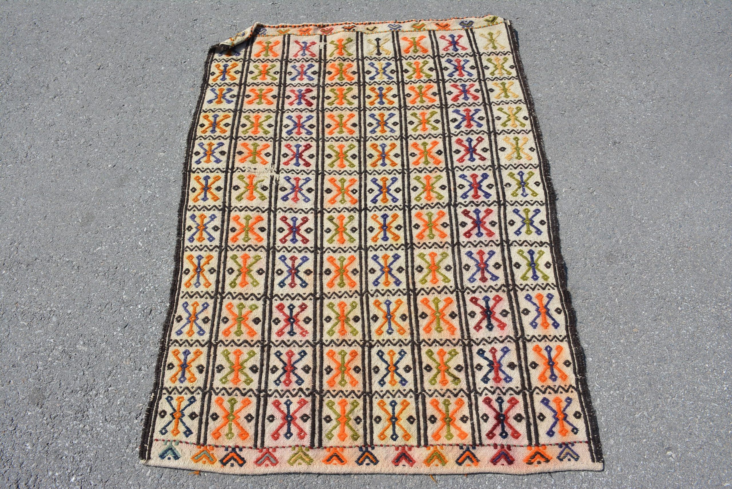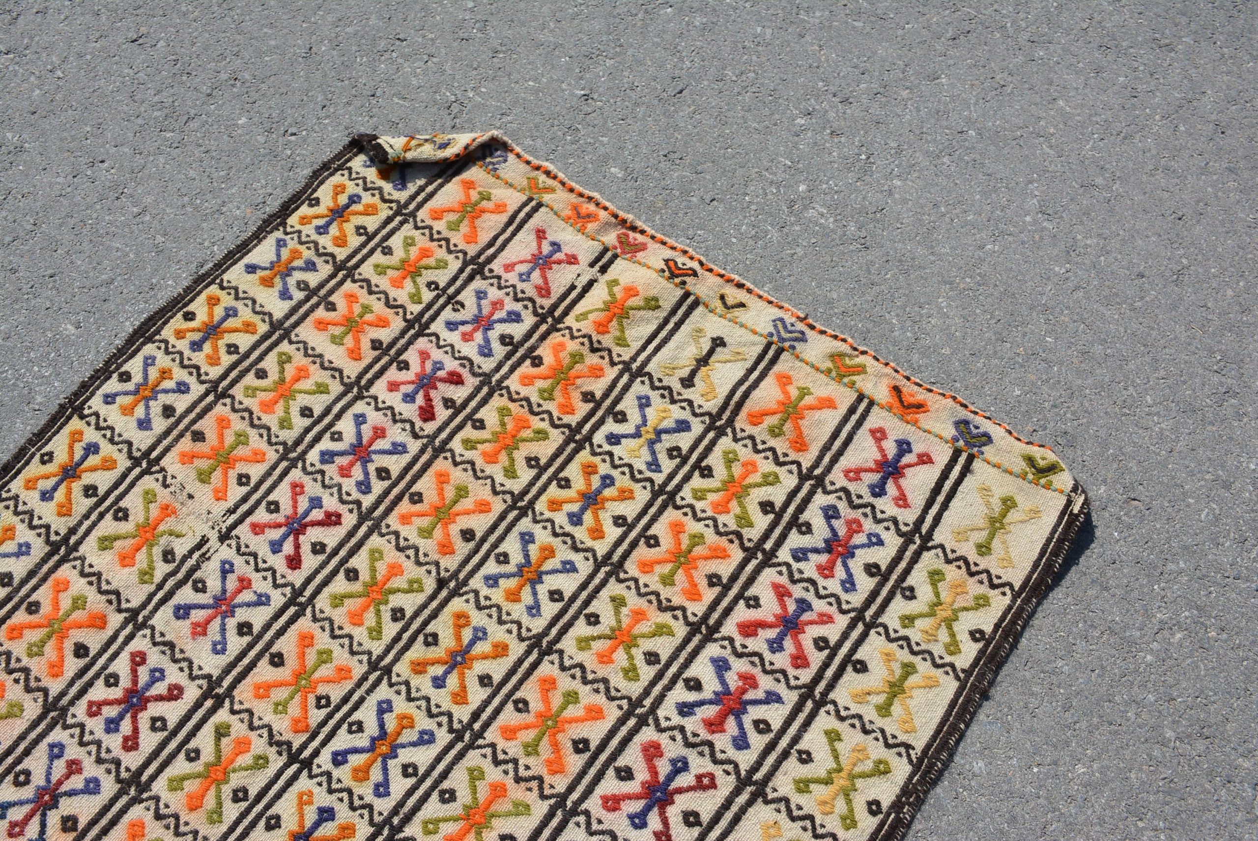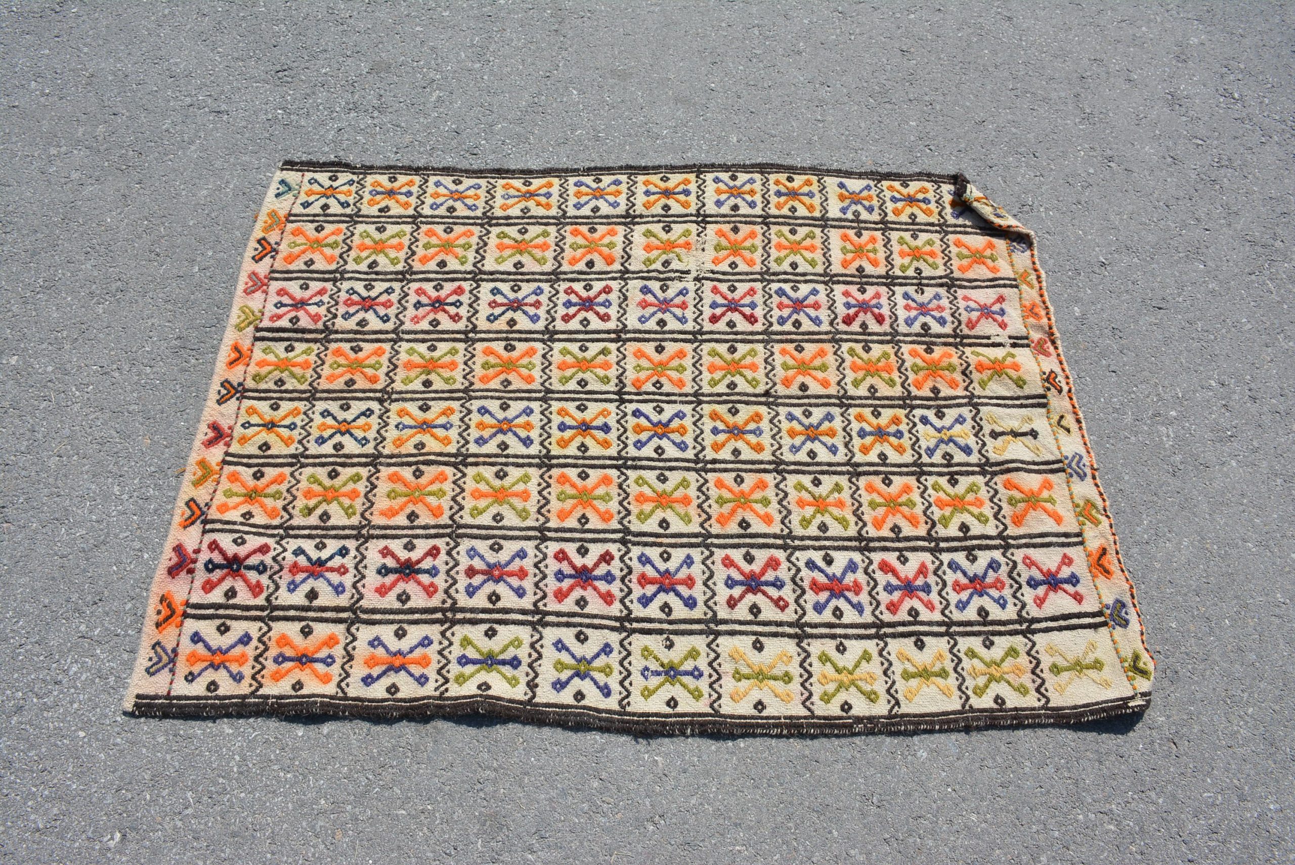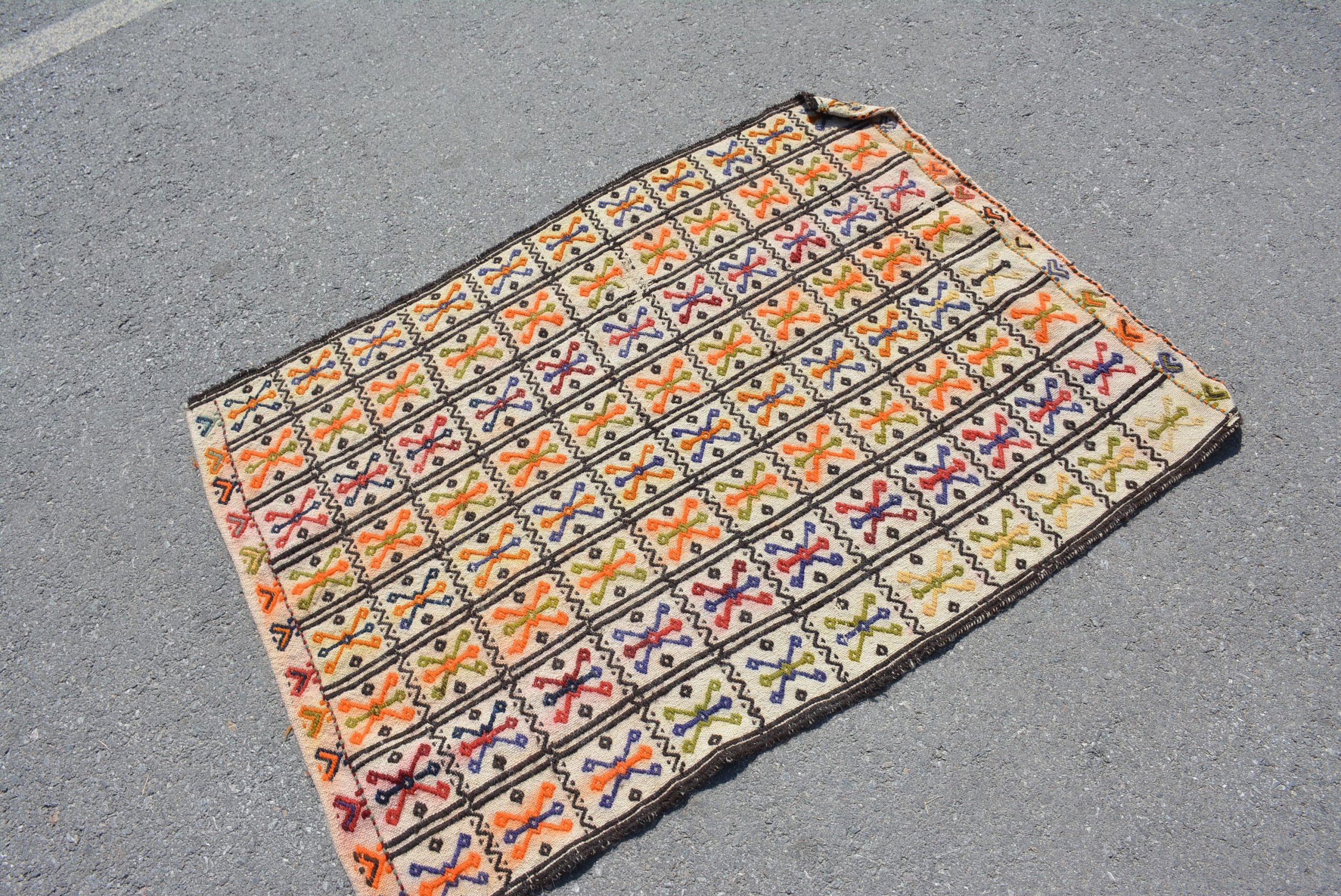 Pretty and one-of-a-kind 3 ft. x 4.2 ft. (91 cm x 127 cm) vintage kilim rug hand-woven in Turkey from organic wool. This is an authentic vintage kilim rug from the 1970s that has worn splendidly to perfection.