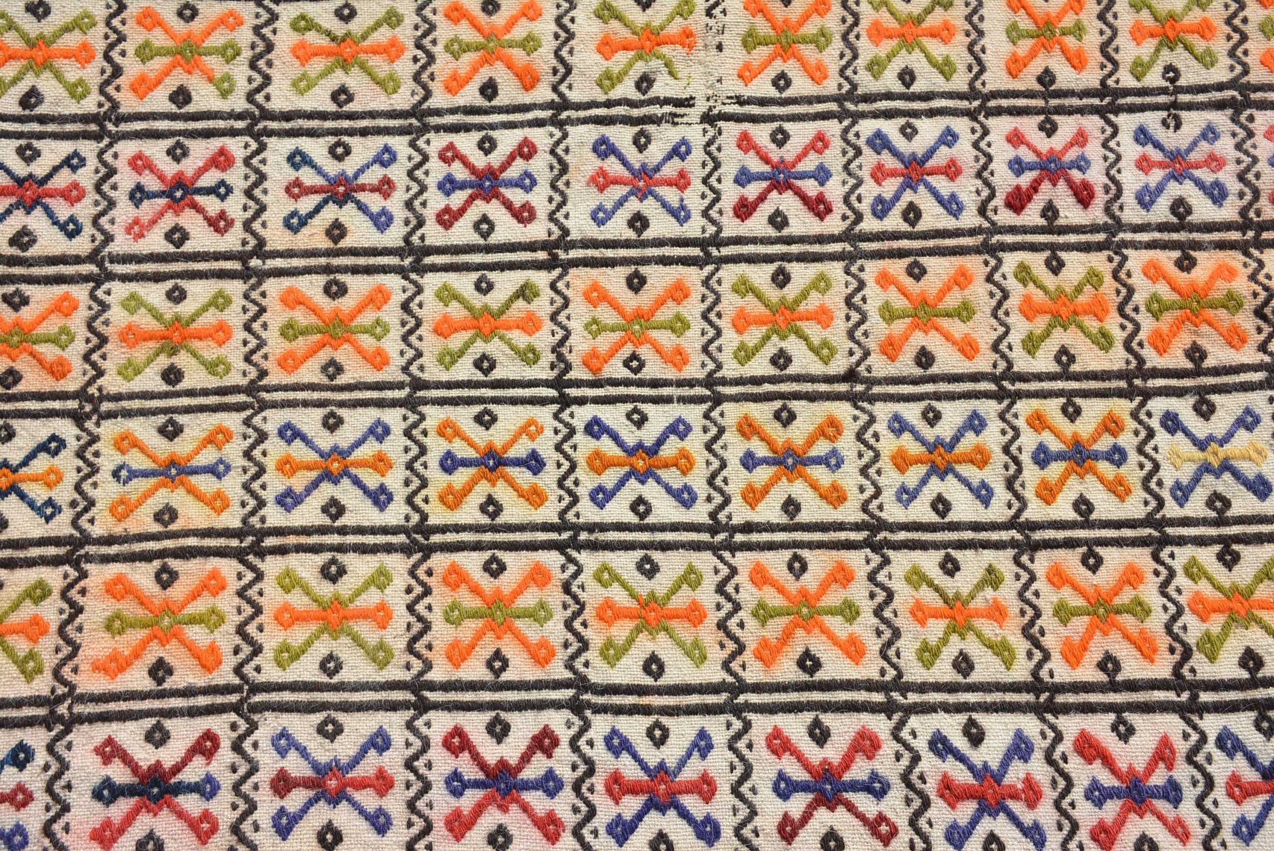 This is a vintage kilim rug hand-woven in a small village in Turkey by skilled Anatolian women during around the 1970s. It is made from natural wool (sheep) and dyed using all-natural (vegetable) dyes. Natural materials are more durable than synthetic materials guaranteeing a rug that can last for years while natural dyes provide colors that gets more beautiful as years pass by especially when in direct sunlight.