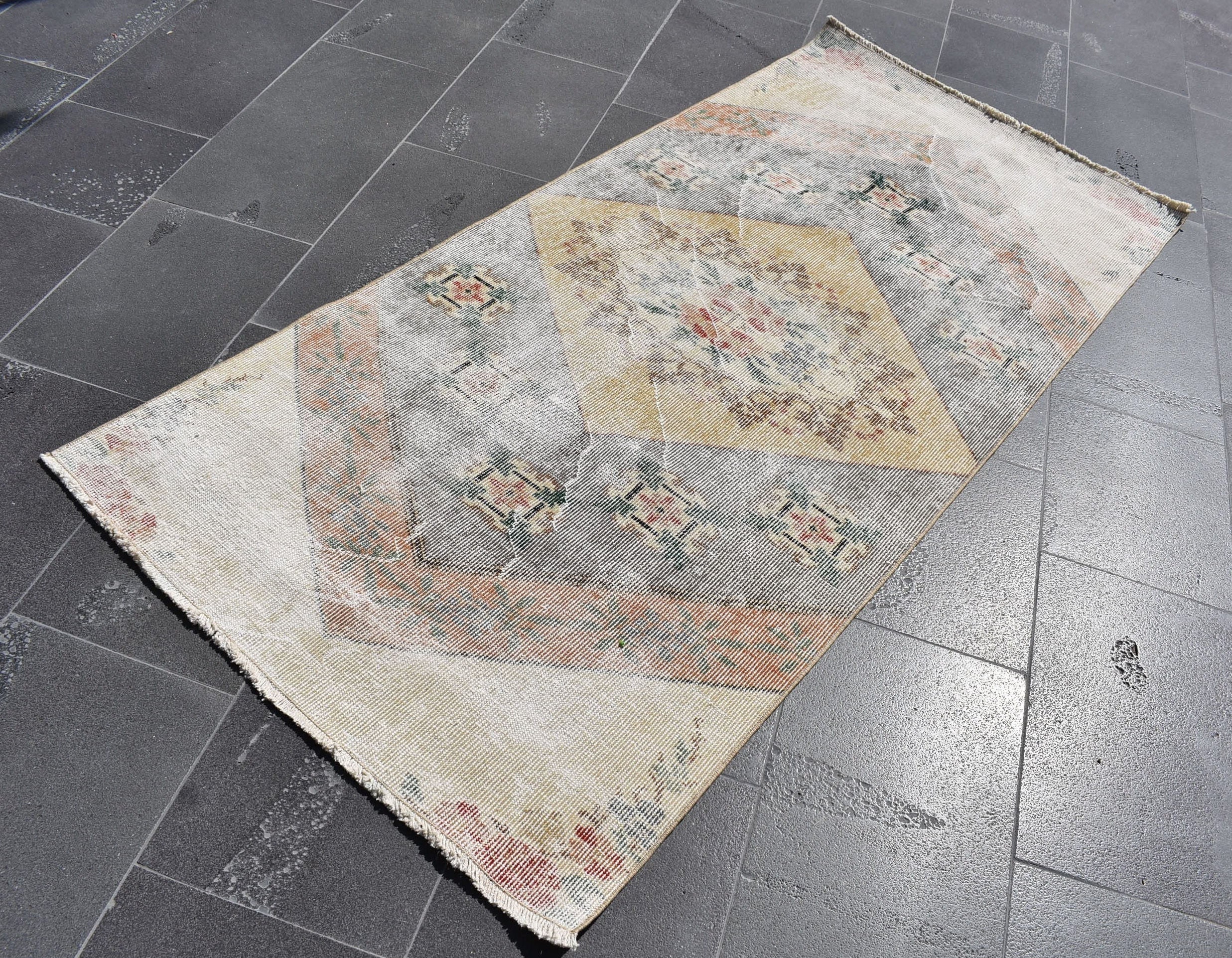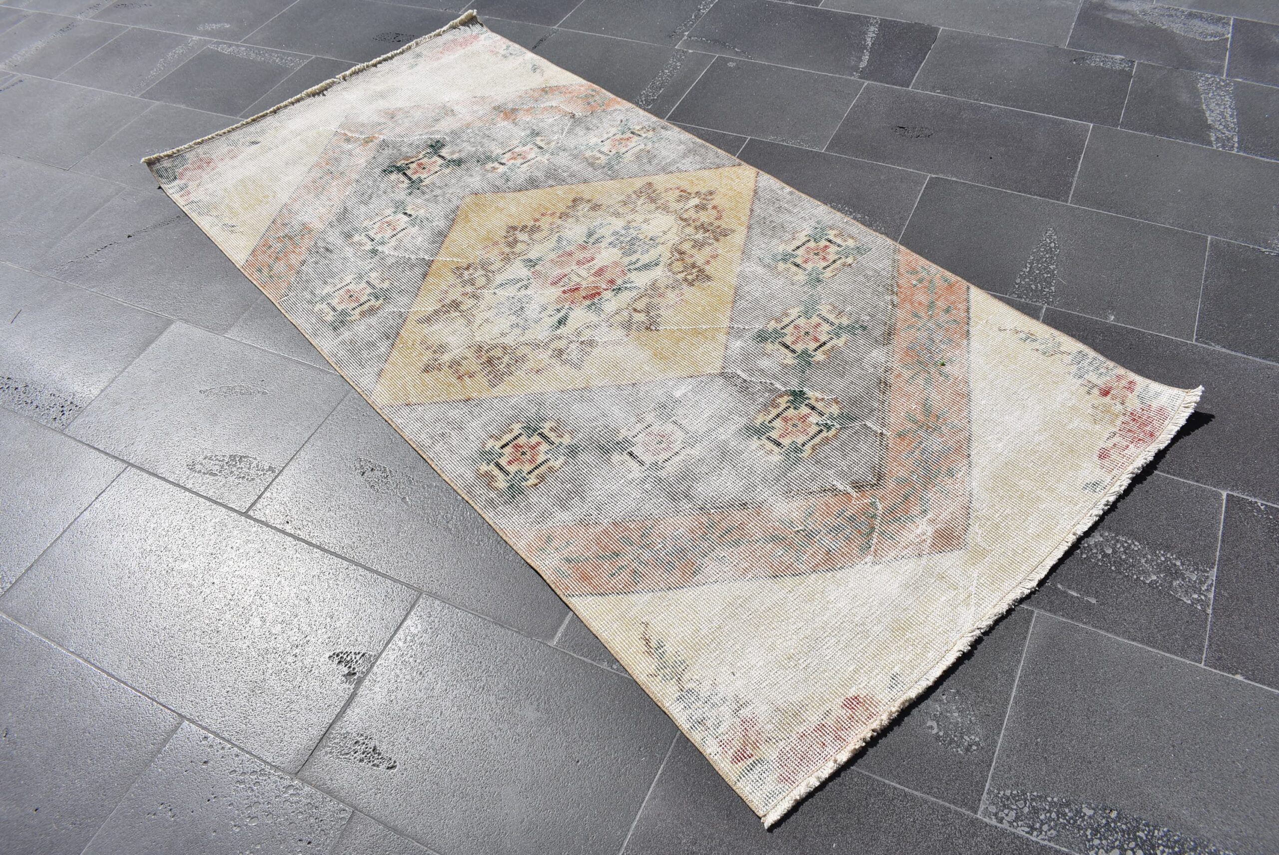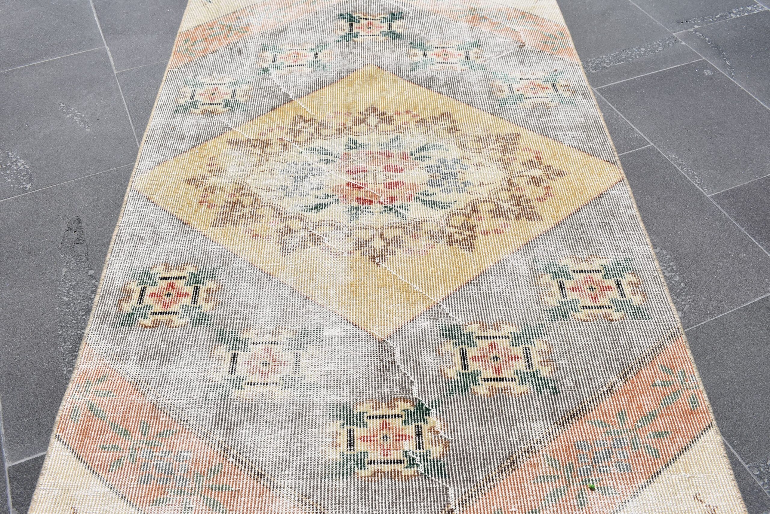 Lovely and unique 3 ft. x 6.3 ft. (90 cm x 192 cm) vintage Turkish rug hand-knotted in Turkey from organic wool. This is an authentic vintage Turkish rug from the 1970s that has worn beautifully to perfection.