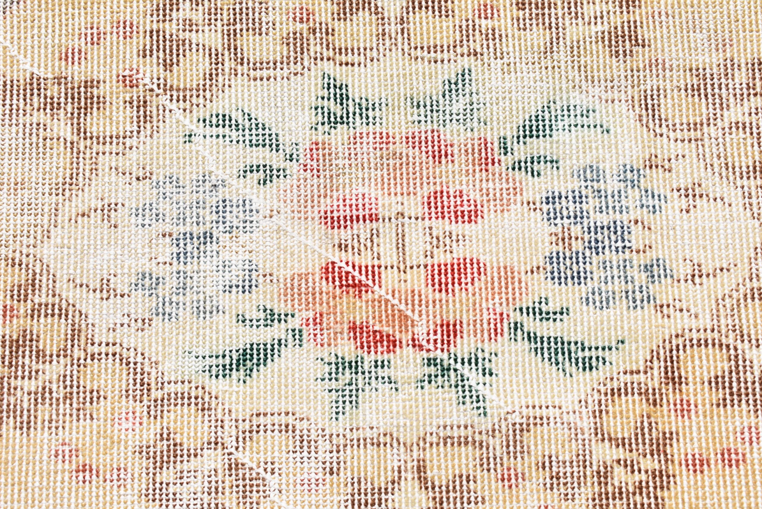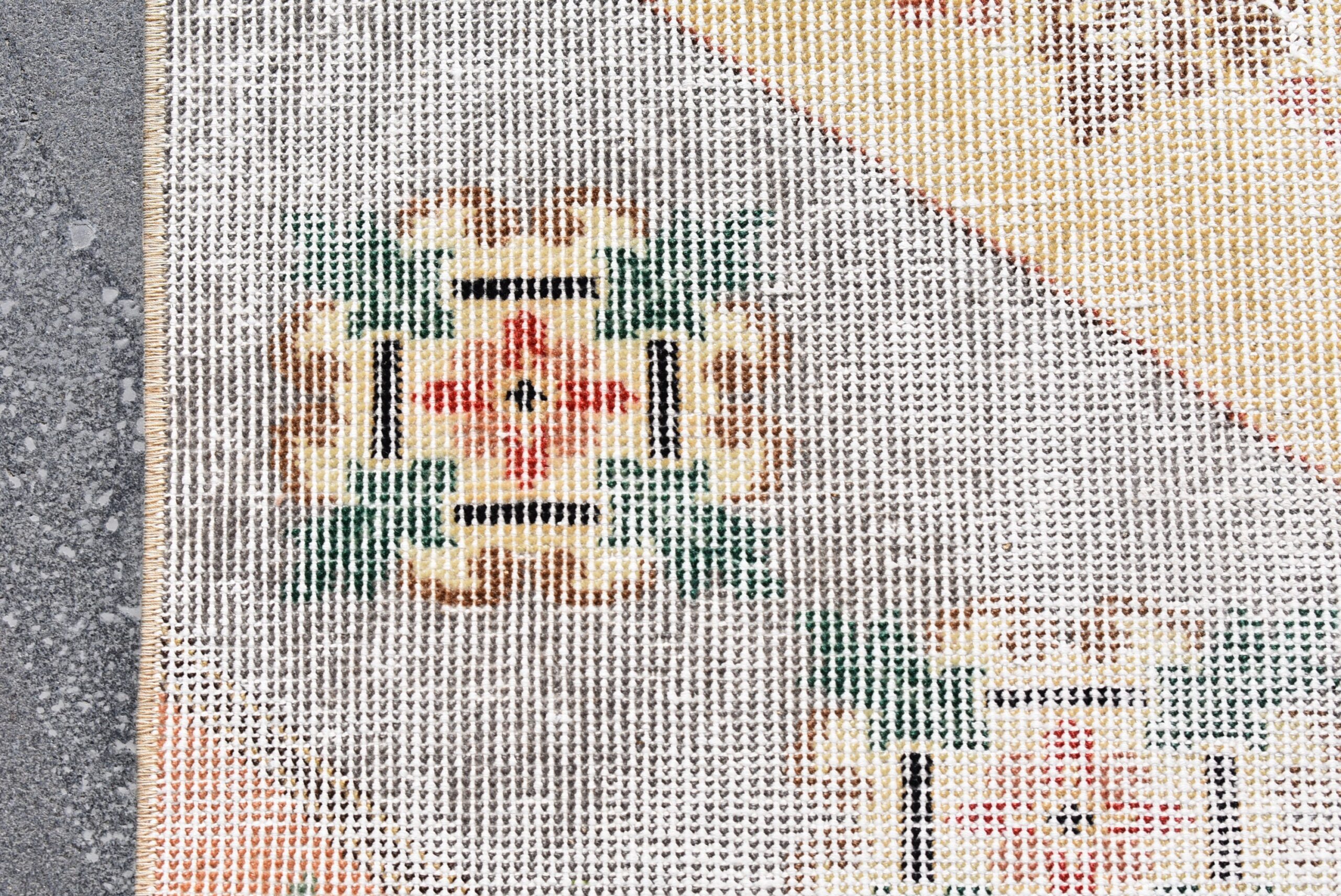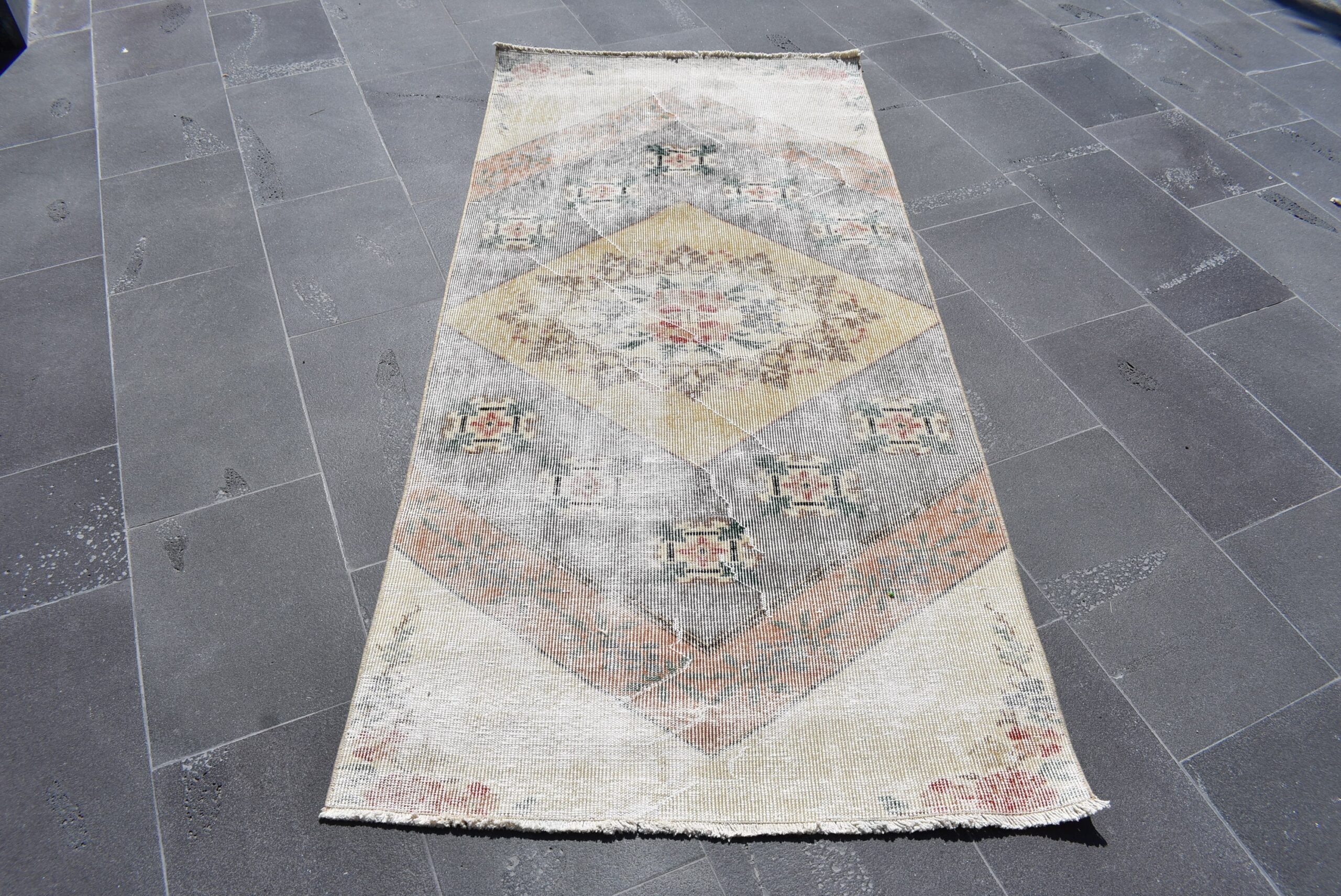 Lovely and unique 3 ft. x 6.3 ft. (90 cm x 192 cm) vintage Turkish rug hand-knotted in Turkey from organic wool. This is an authentic vintage Turkish rug from the 1970s that has worn beautifully to perfection.