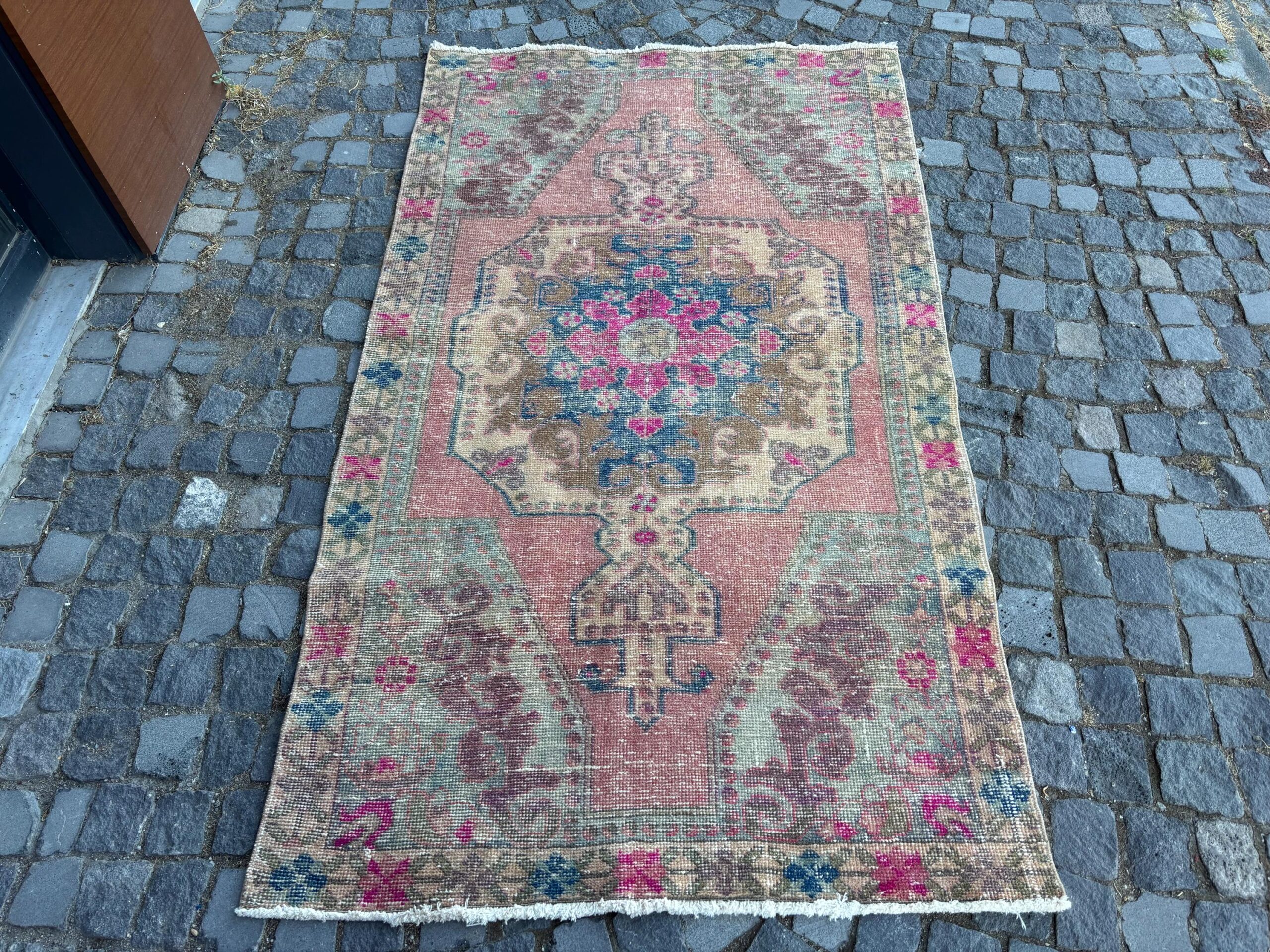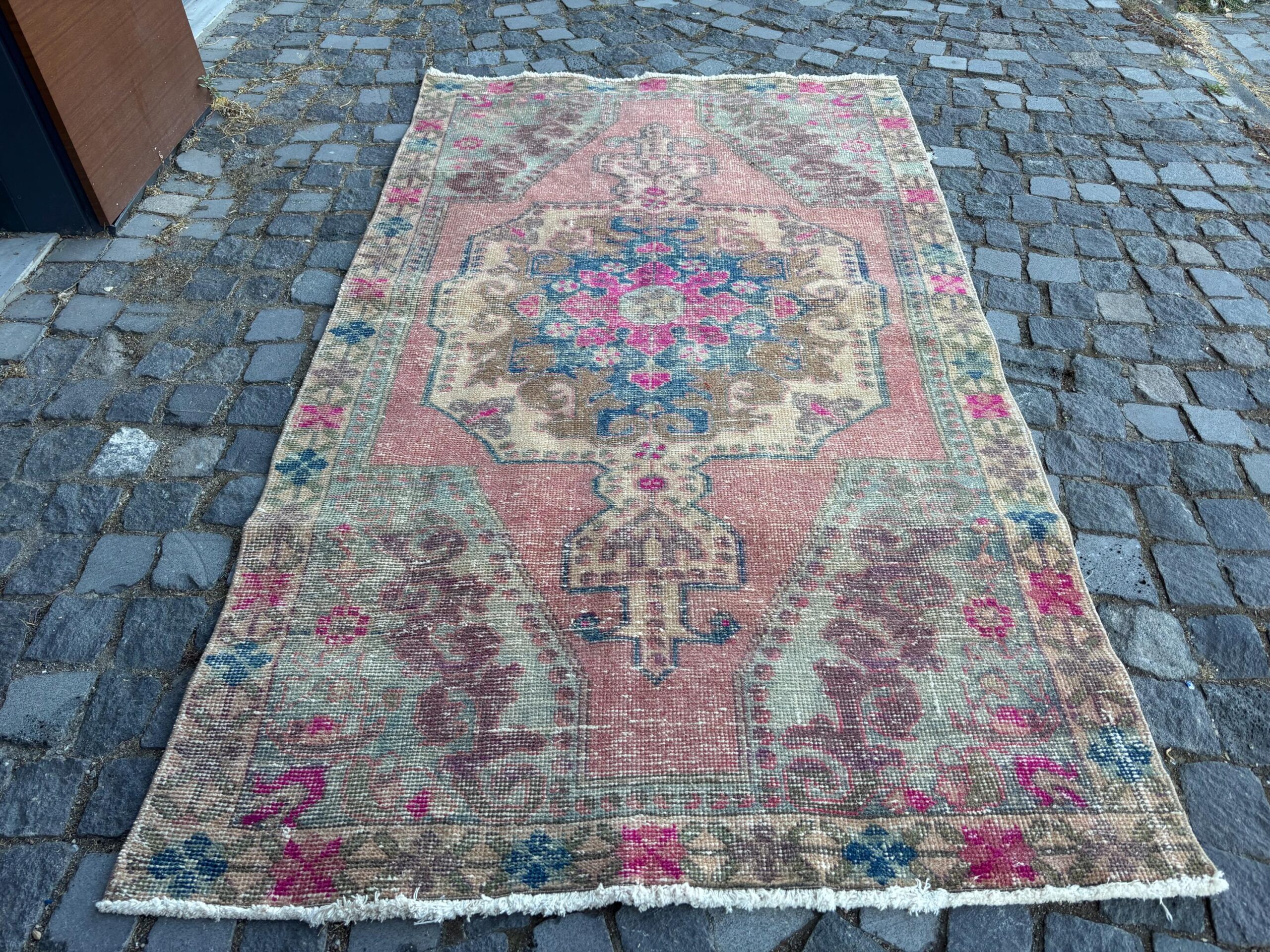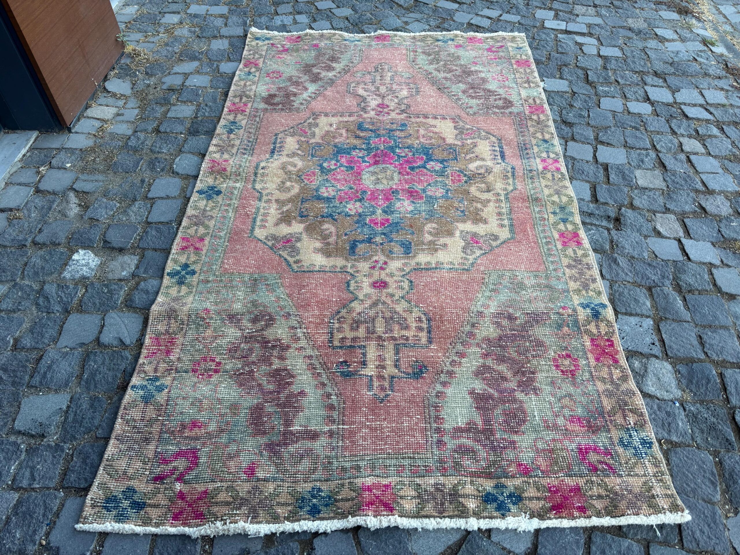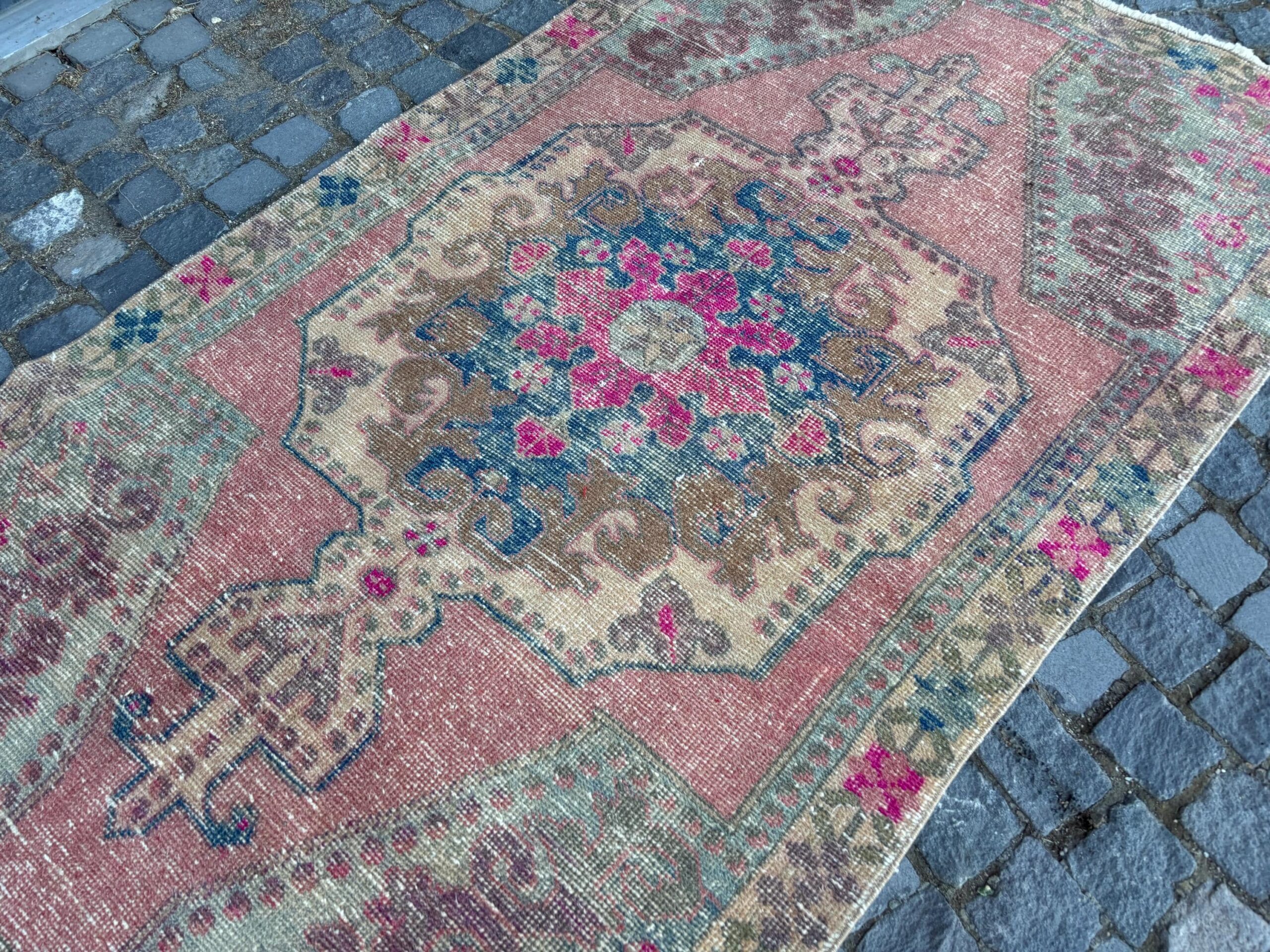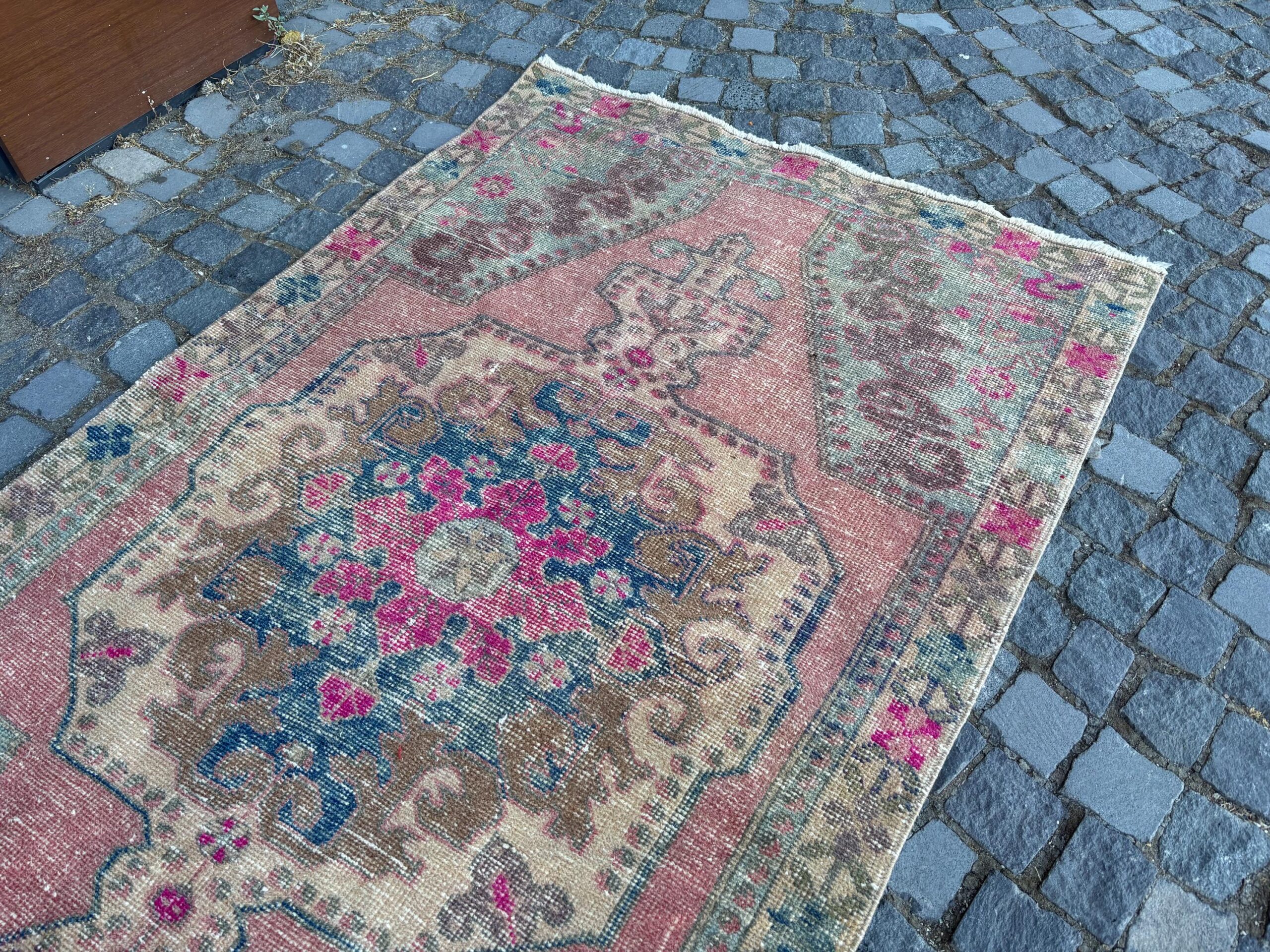 This is a vintage Turkish rug hand-knotted in a small village in Turkey by skilled Anatolian women during around the 1980s. It is made from natural wool (sheep) and dyed using all-natural (vegetable) dyes. Natural materials are more durable than synthetic materials guaranteeing a rug that can last for years while natural dyes provide colors that gets more beautiful as years pass by especially when in direct sunlight.