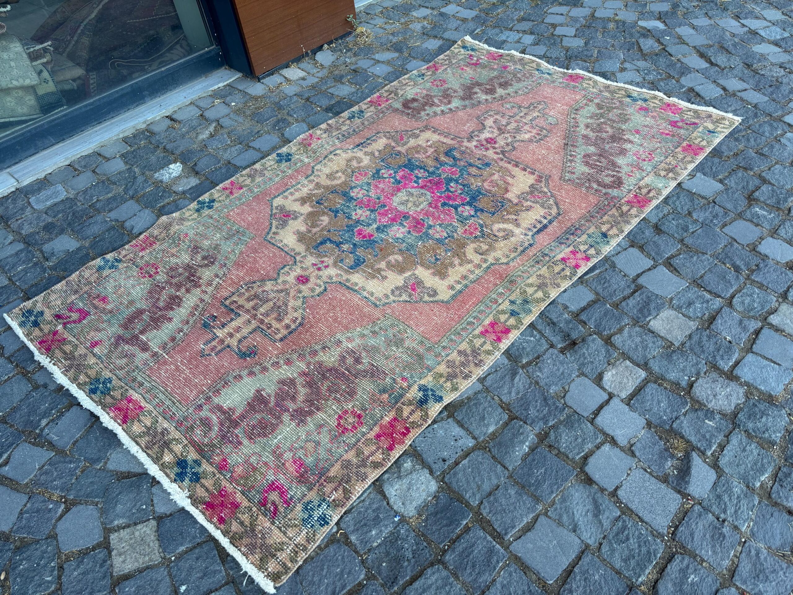 Pretty and one-of-a-kind 4.1 ft. x 7.3 ft. (124 cm x 224 cm) vintage Turkish rug hand-knotted in Turkey from organic wool. This is an authentic vintage Turkish rug from the 1980s that has worn splendidly to perfection.
