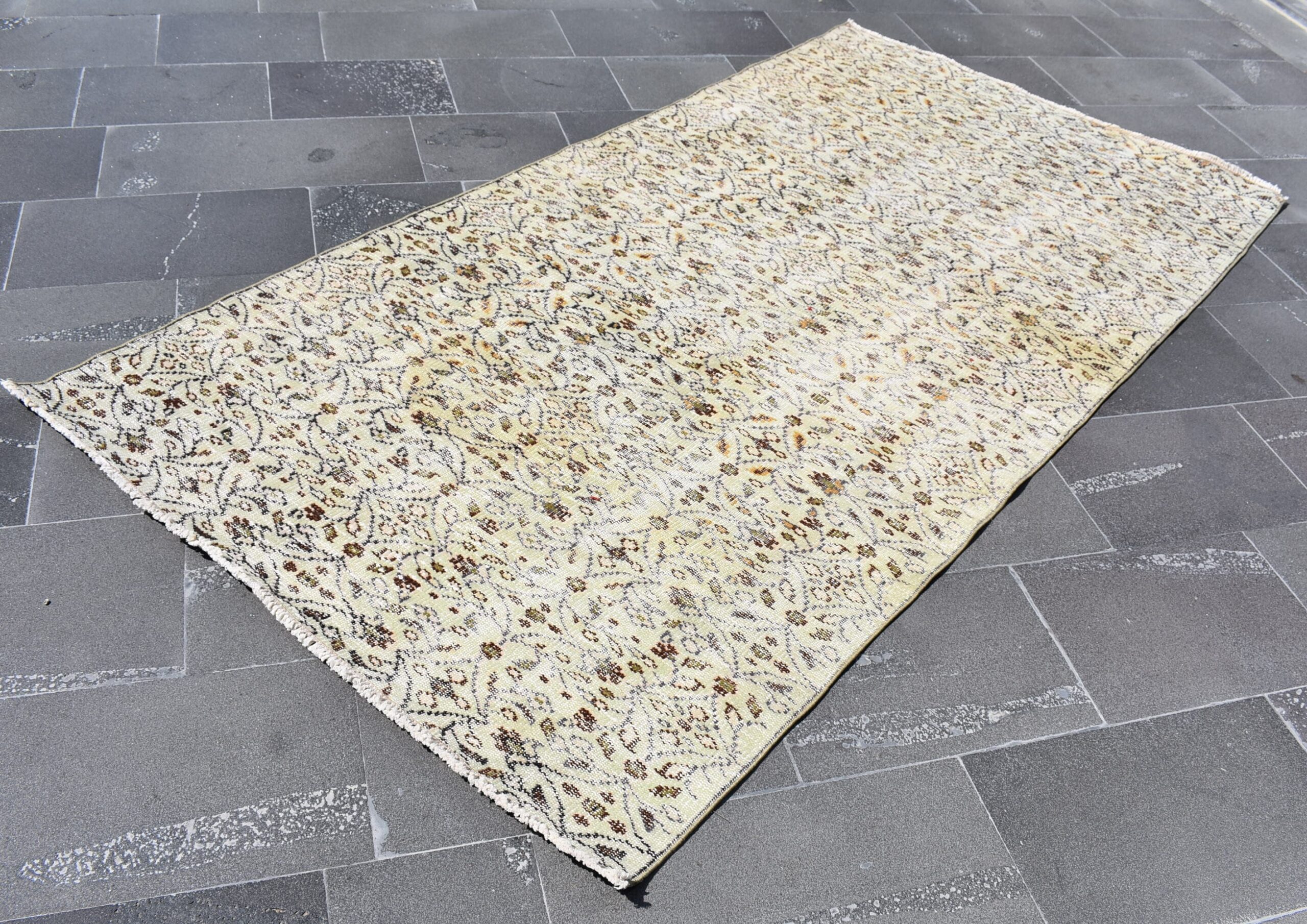 This is a vintage Turkish rug hand-knotted in a small village in Turkey by skilled Anatolian women during around the 1980s. It is made from natural wool (sheep) and dyed using all-natural (vegetable) dyes. Natural materials are more durable than synthetic materials guaranteeing a rug that can last for years while natural dyes provide colors that gets more beautiful as years pass by especially when in direct sunlight.