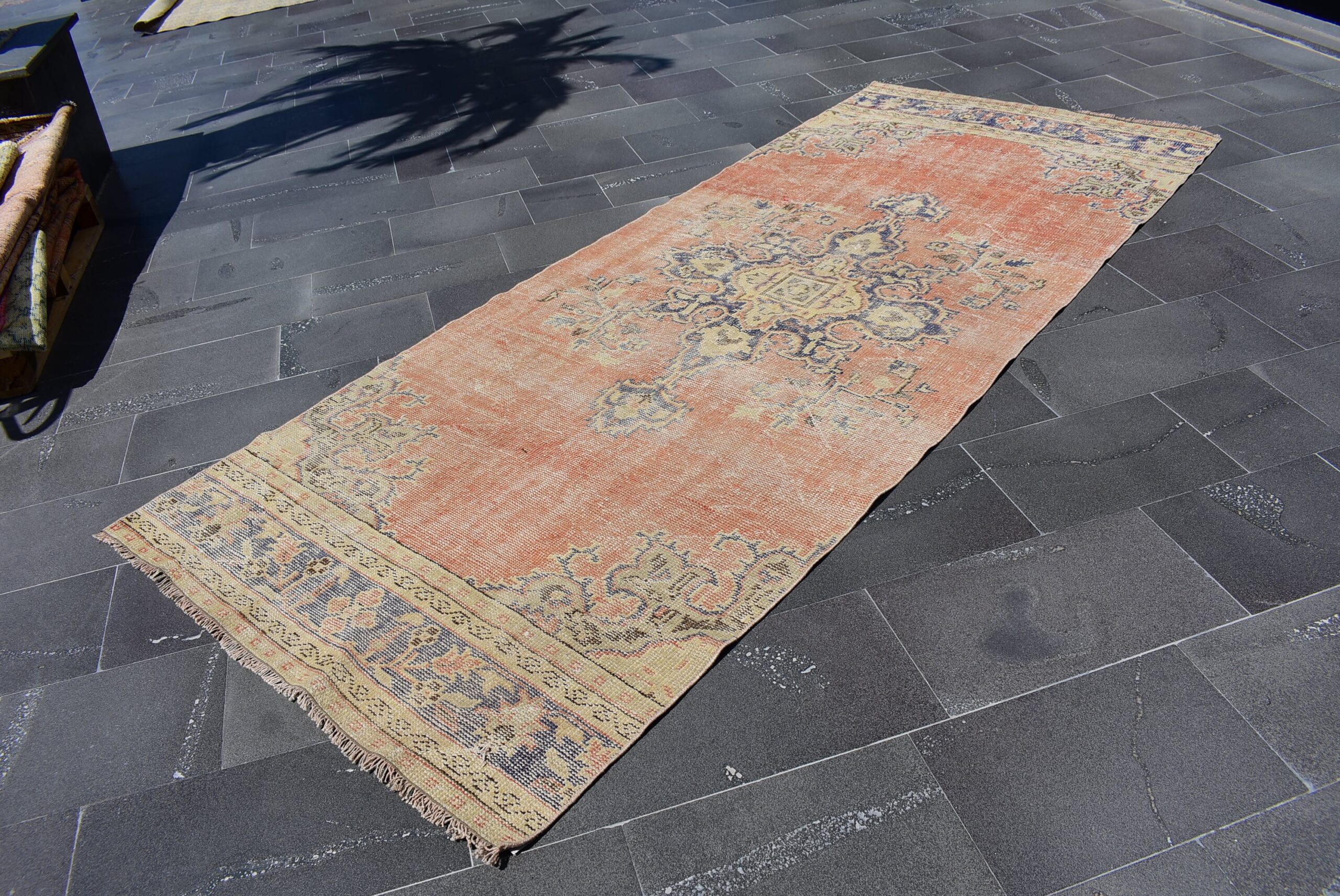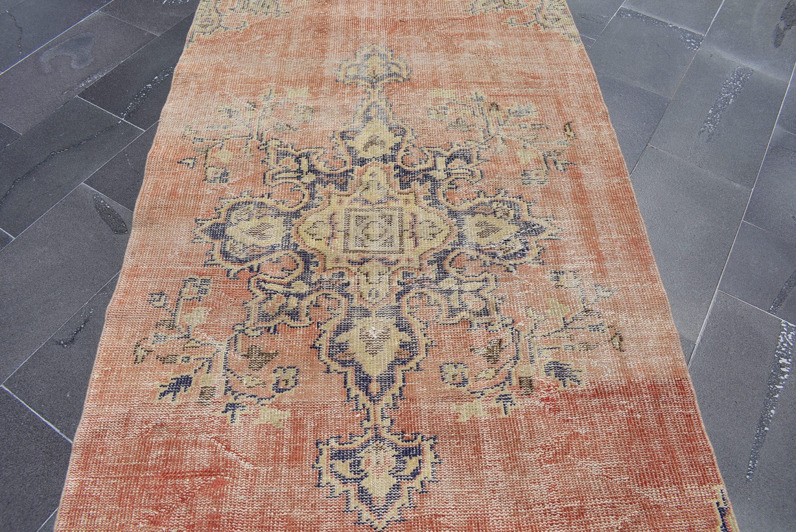 Pretty and one-of-a-kind 4.2 ft. x 10.3 ft. (128 cm x 314 cm) vintage Turkish rug hand-knotted in Turkey from organic wool. This is an authentic vintage Turkish rug from the 1970s that has worn splendidly to perfection.