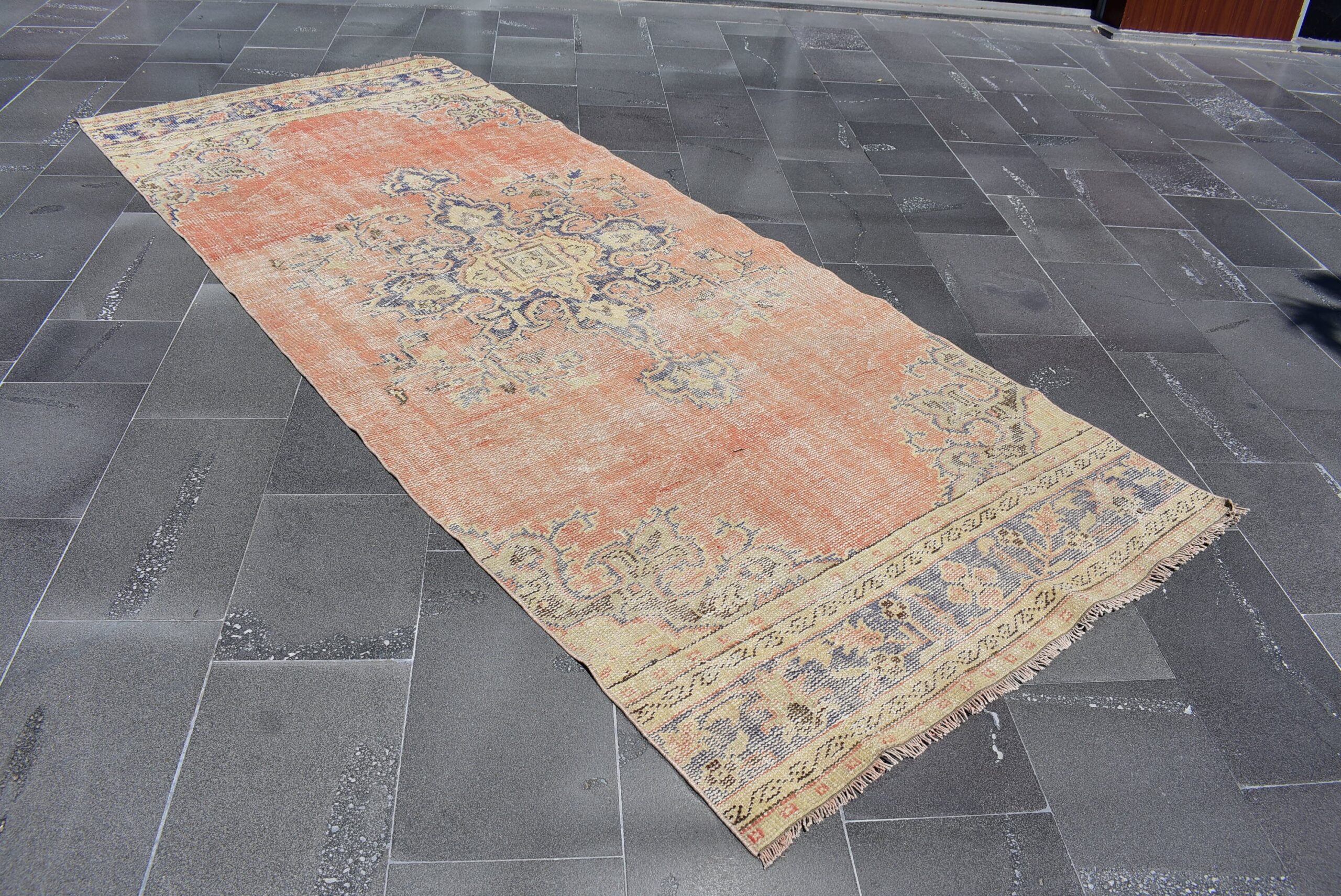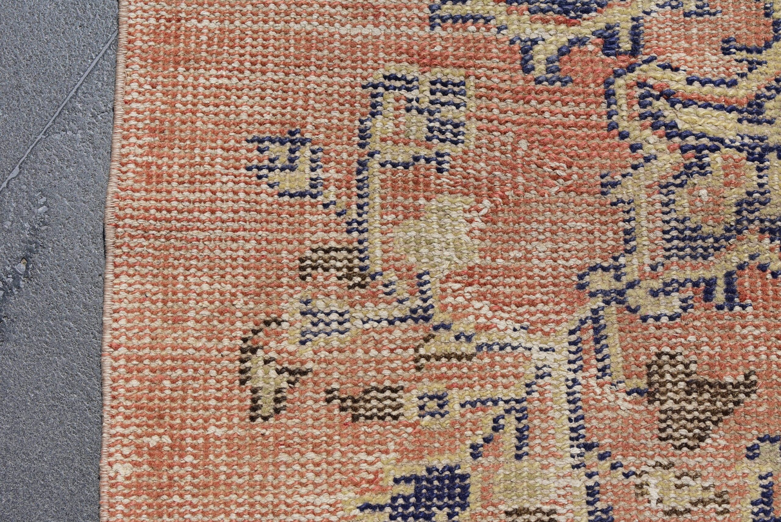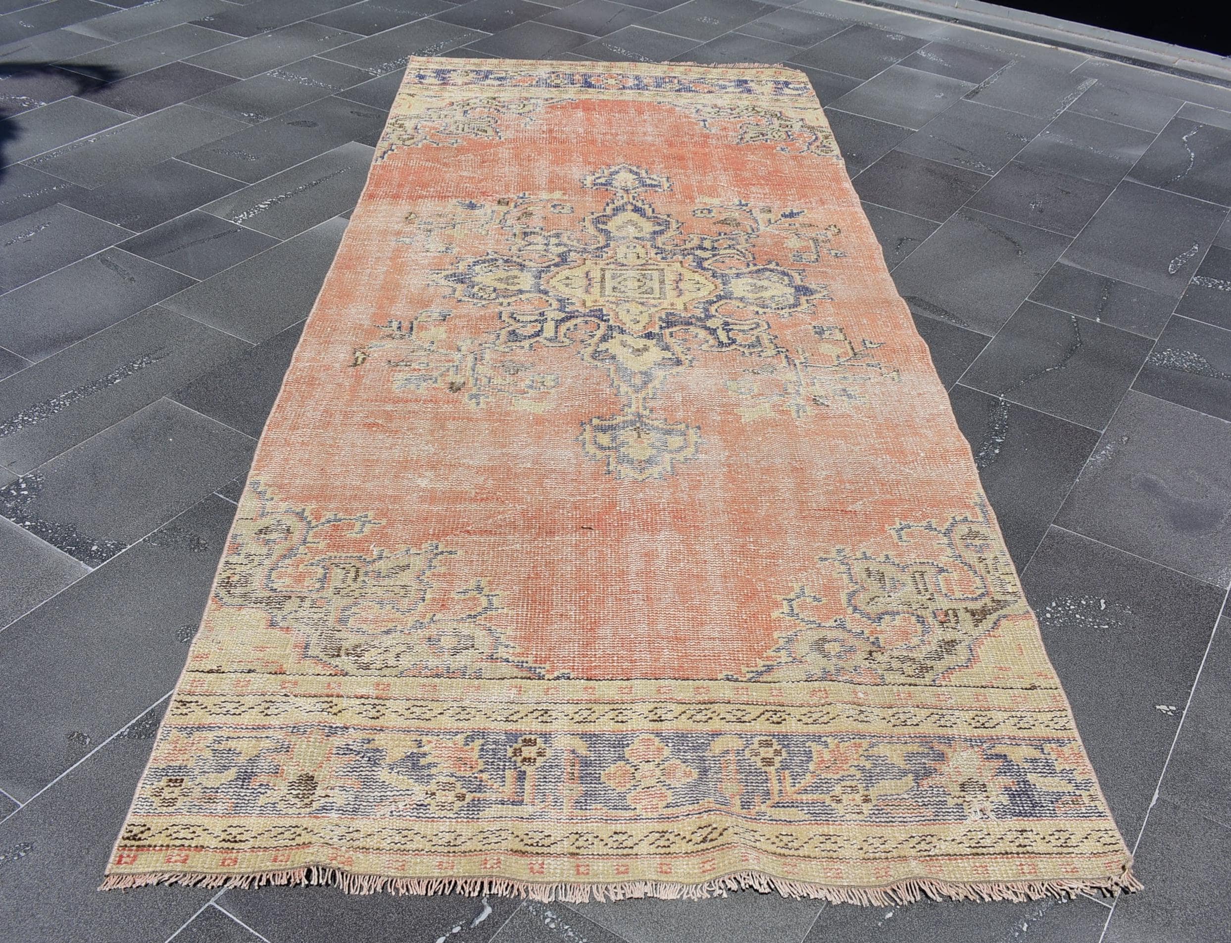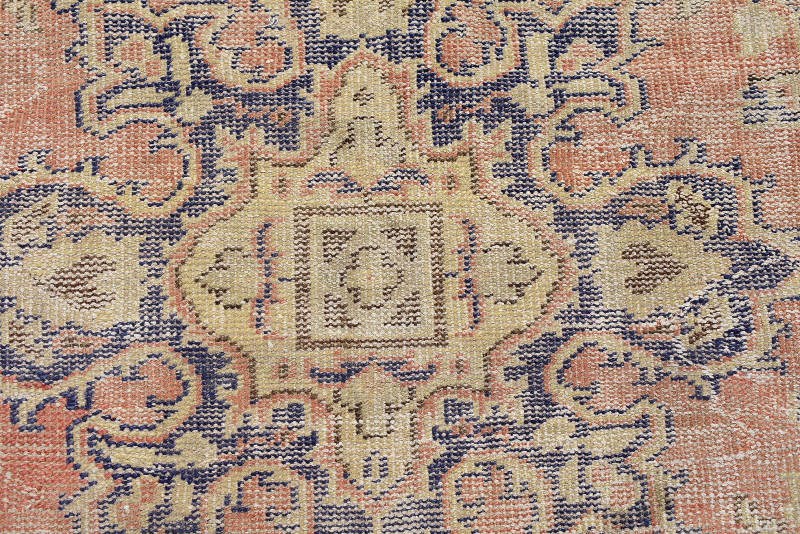 This is a vintage Turkish rug hand-knotted in a small village in Turkey by skilled Anatolian women during around the 1970s. It is made from natural wool (sheep) and dyed using all-natural (vegetable) dyes. Natural materials are more durable than synthetic materials guaranteeing a rug that can last for years while natural dyes provide colors that gets more beautiful as years pass by especially when in direct sunlight.