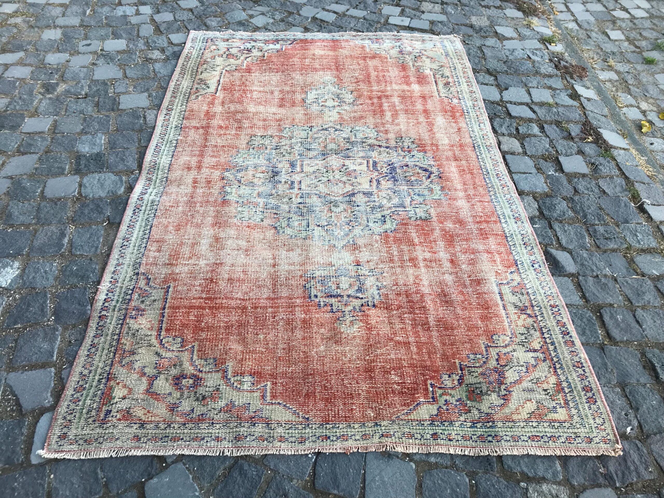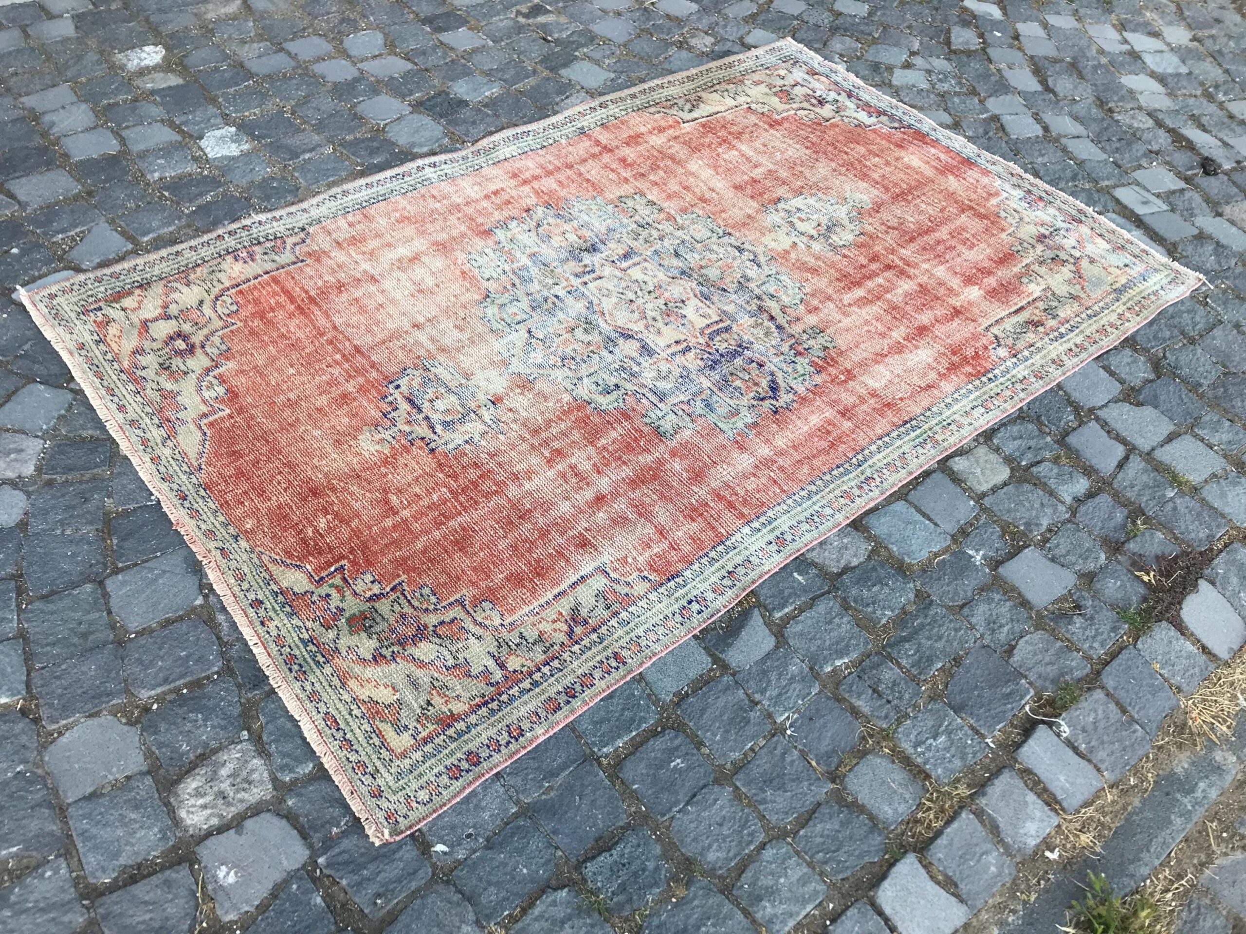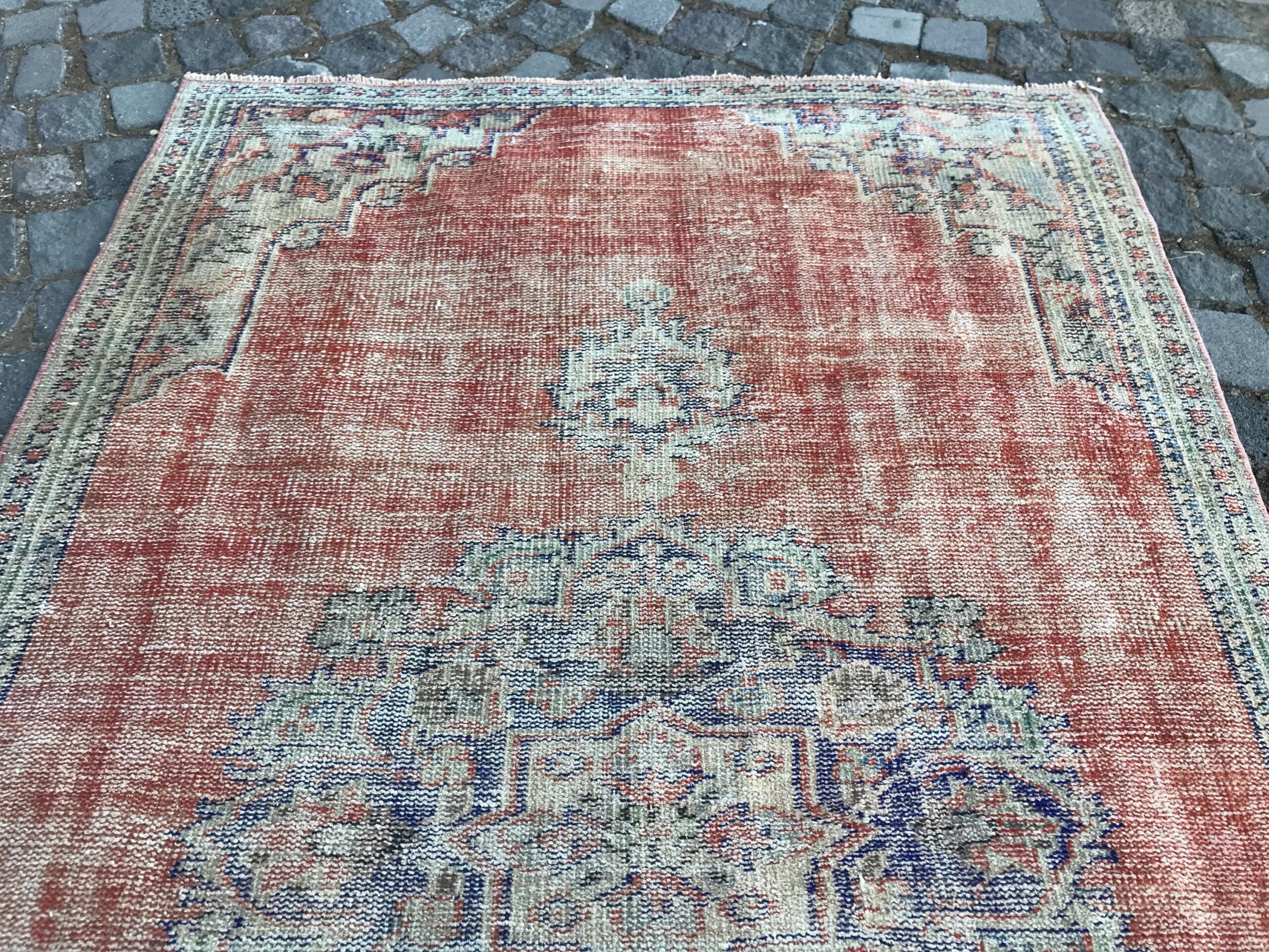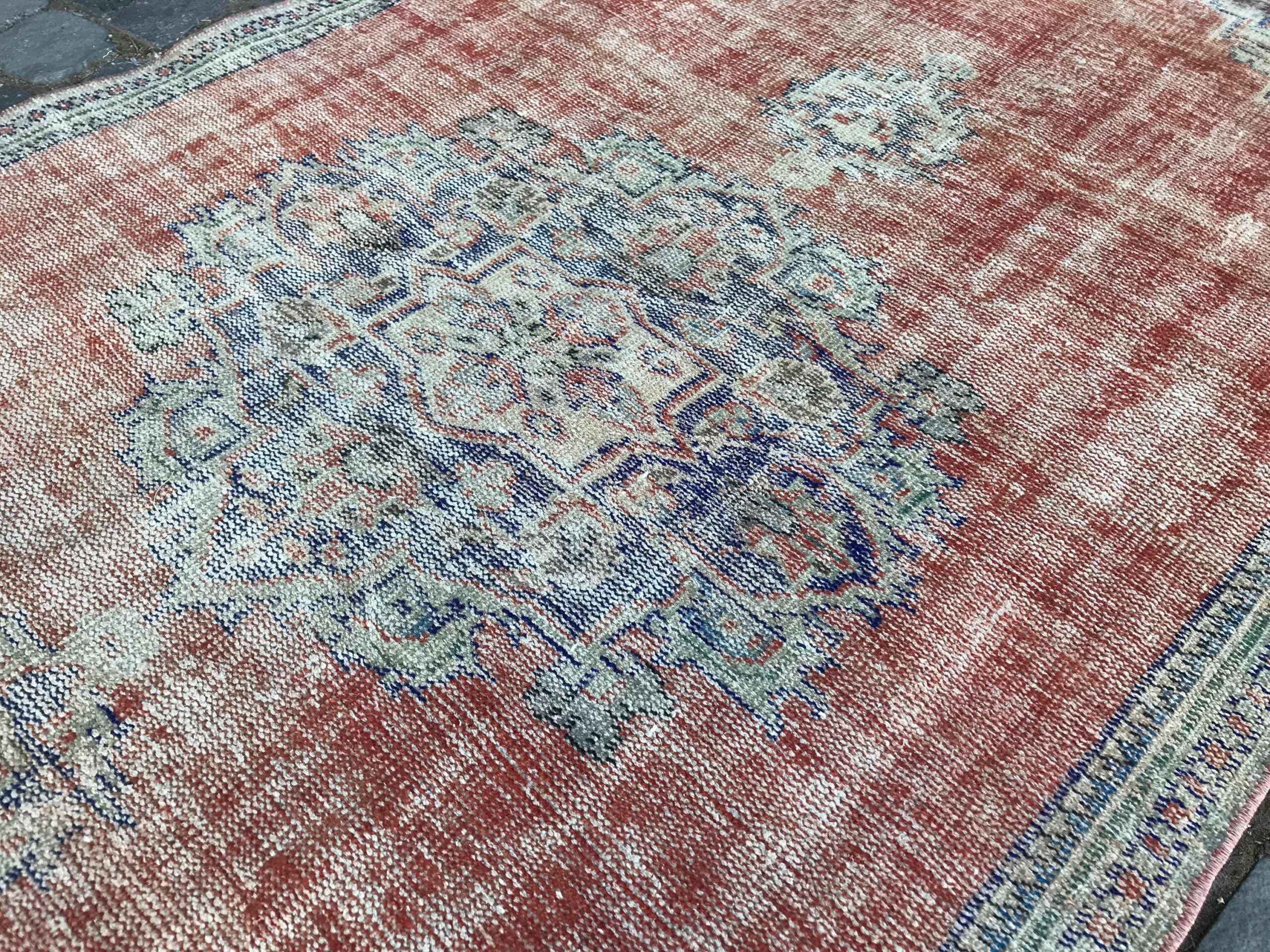 This is a vintage Turkish rug hand-knotted in a small village in Turkey by skilled Anatolian women during around the 1970s. It is made from natural wool (sheep) and dyed using all-natural (vegetable) dyes. Natural materials are more durable than synthetic materials guaranteeing a rug that can last for years while natural dyes provide colors that gets more beautiful as years pass by especially when in direct sunlight.