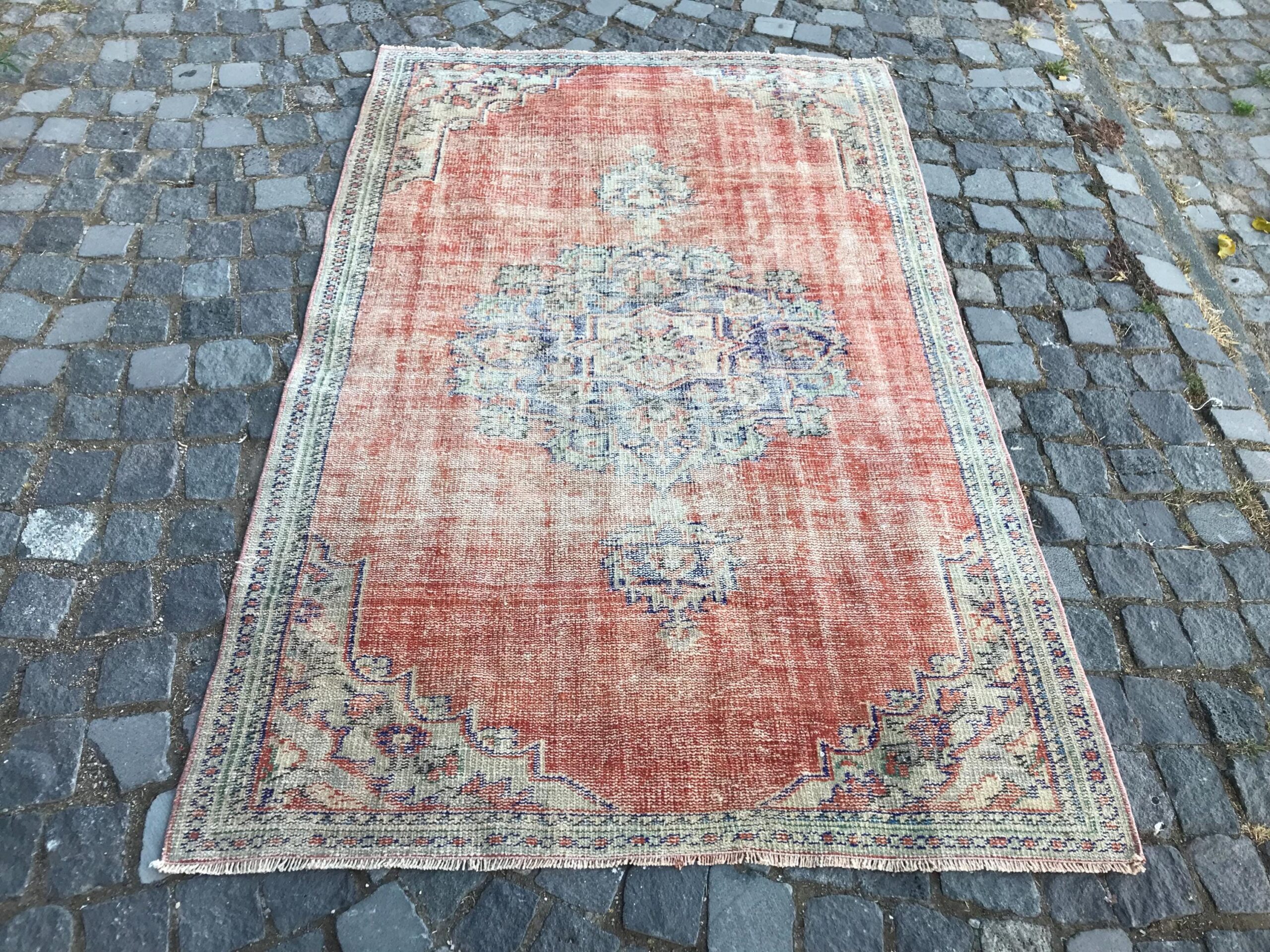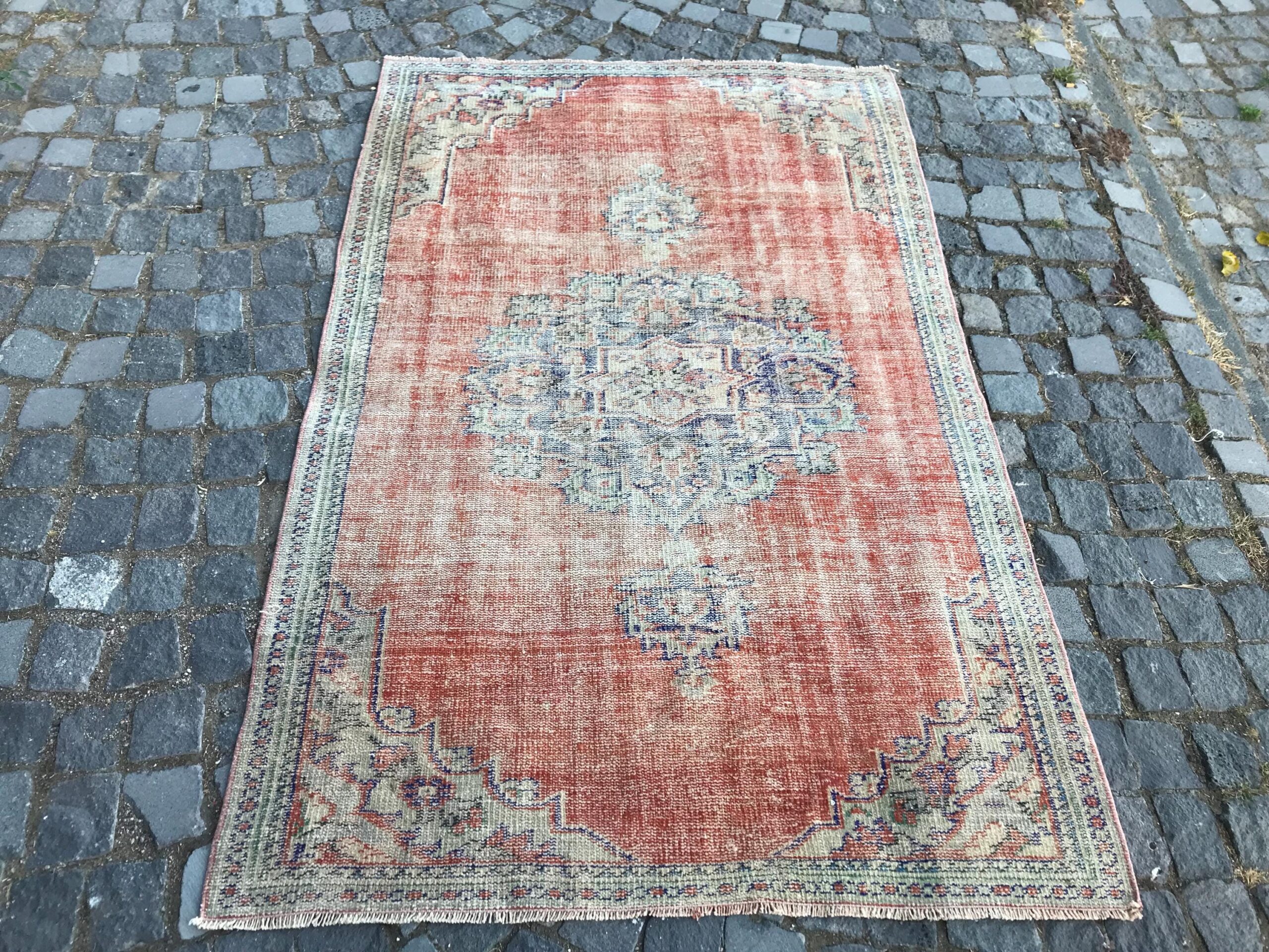 Pretty and one-of-a-kind 4.2 ft. x 6.5 ft. (127 cm x 199 cm) vintage Turkish rug hand-knotted in Turkey from organic wool. This is an authentic vintage Turkish rug from the 1970s that has worn splendidly to perfection.