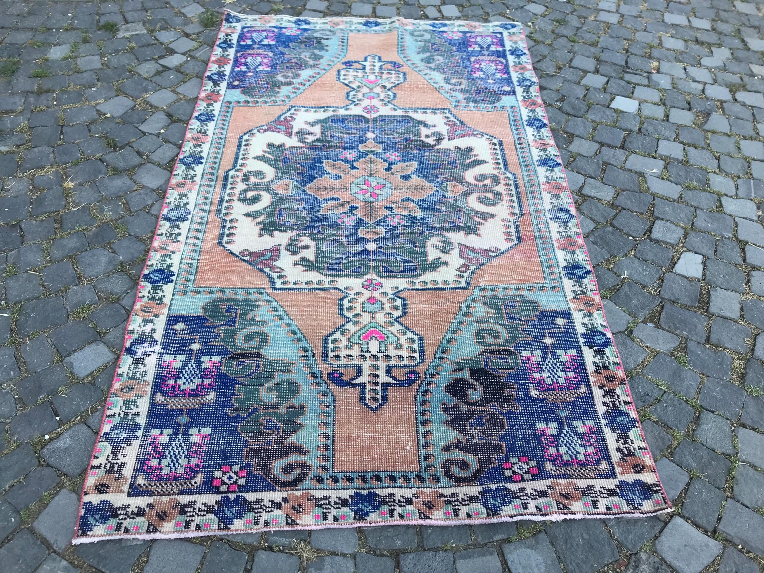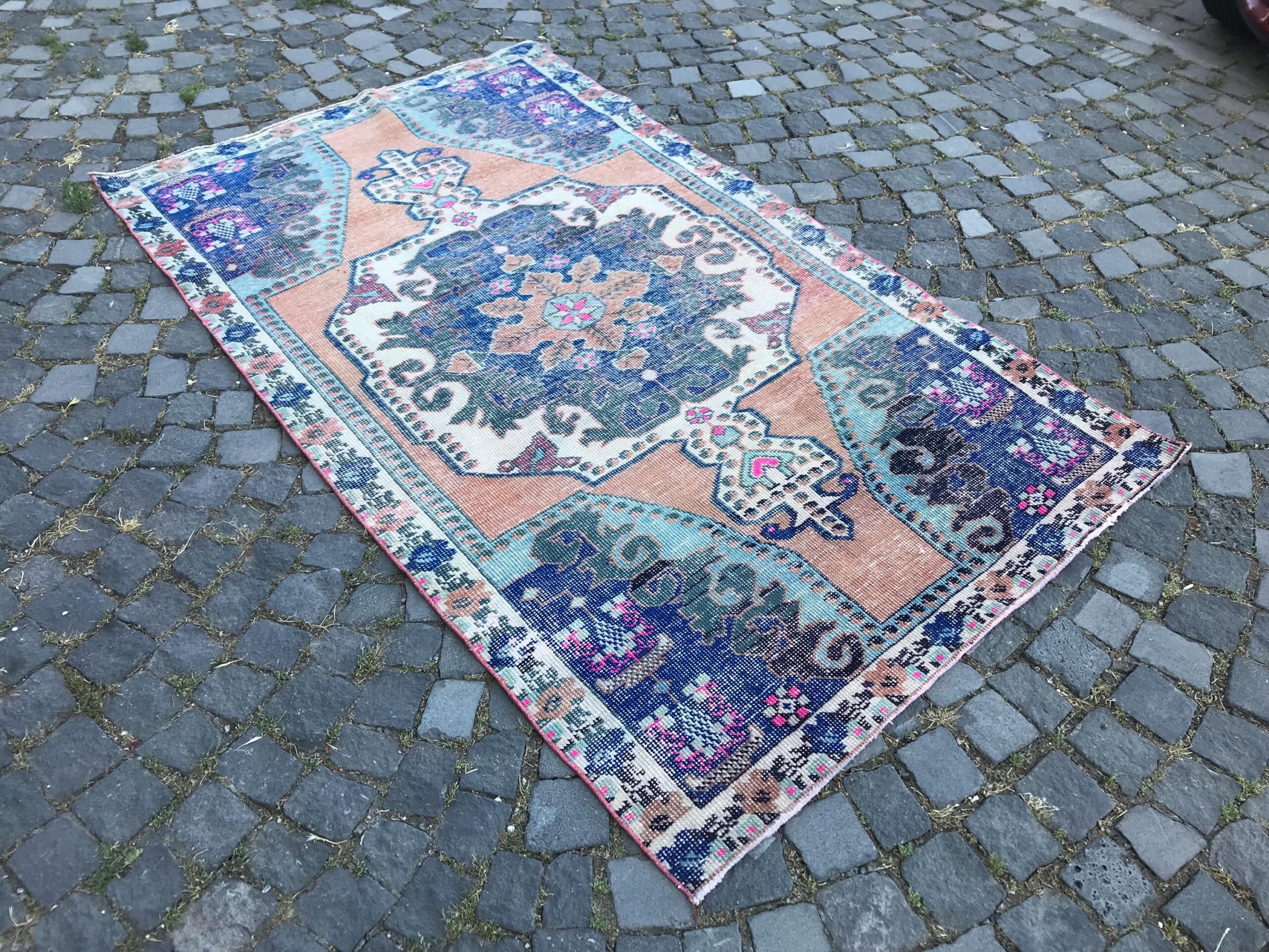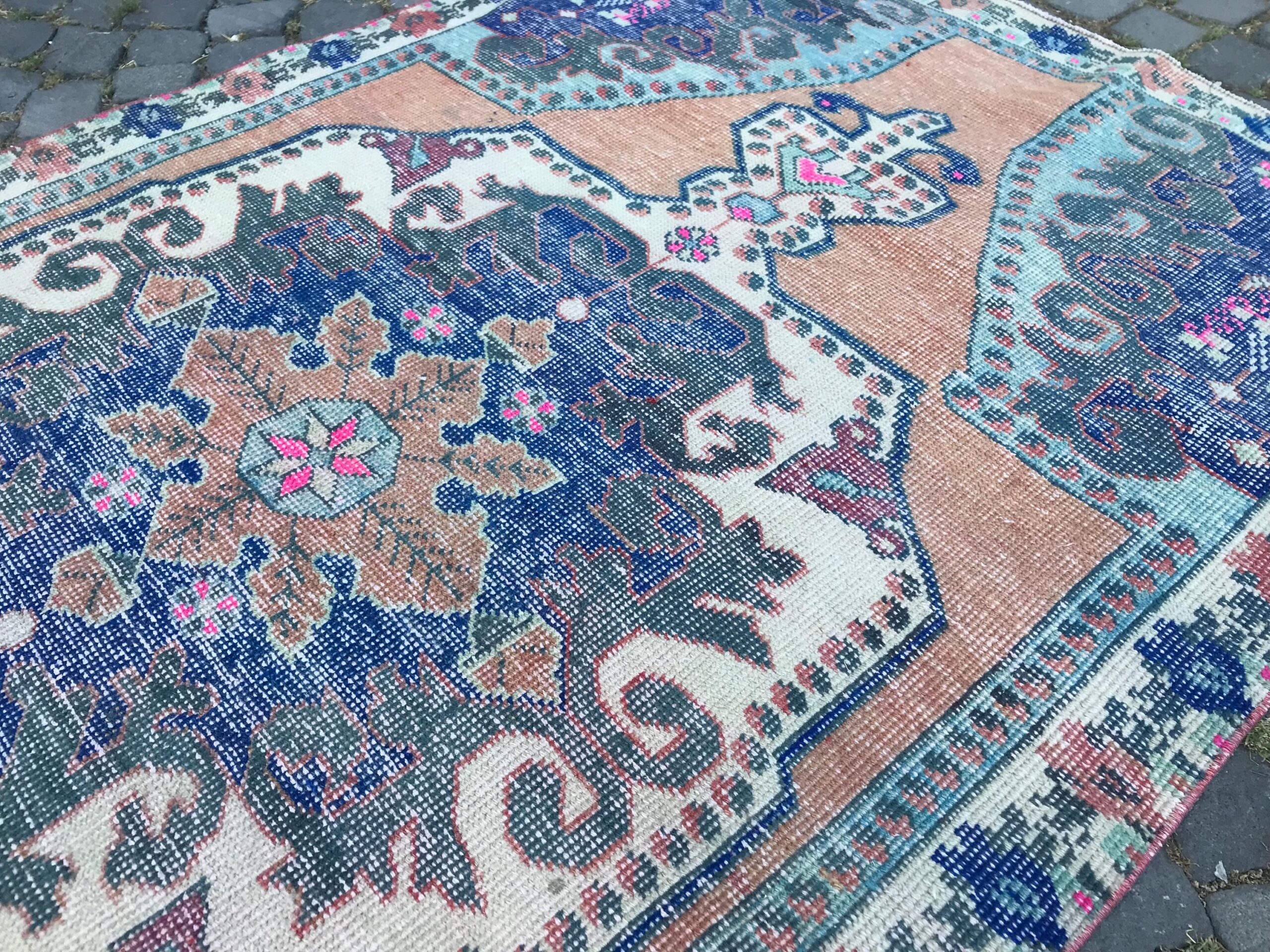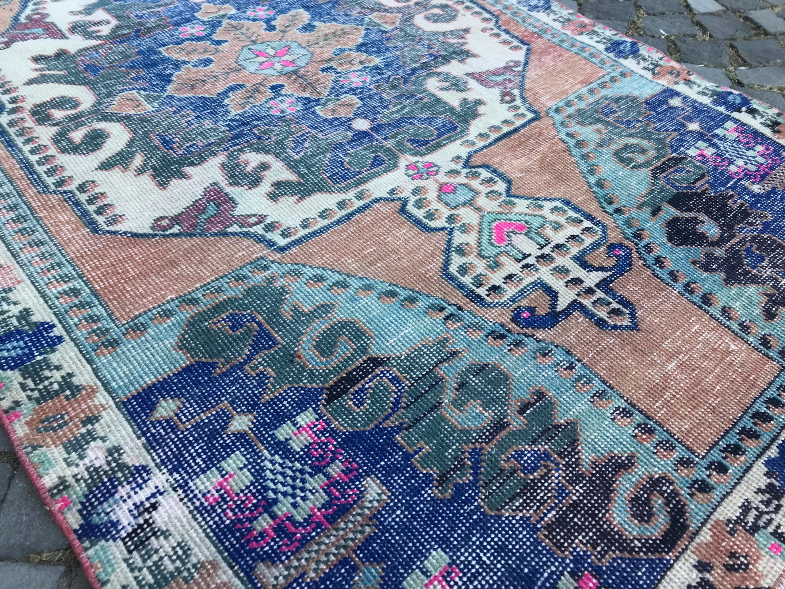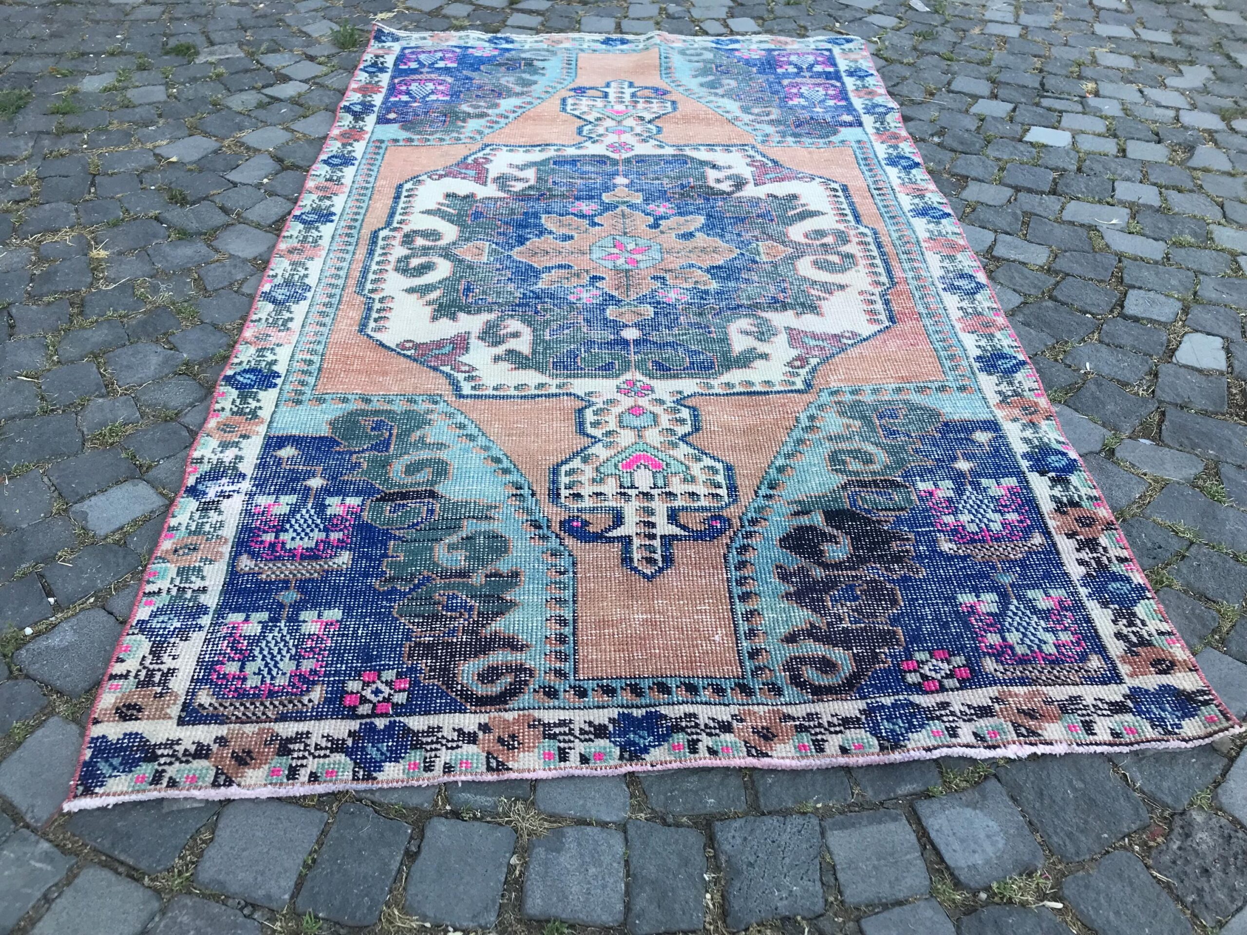 This is a vintage Turkish rug hand-knotted in a small village in Turkey by skilled Anatolian women during around the 1980s. It is made from natural wool (sheep) and dyed using all-natural (vegetable) dyes. Natural materials are more durable than synthetic materials guaranteeing a rug that can last for years while natural dyes provide colors that gets more beautiful as years pass by especially when in direct sunlight.