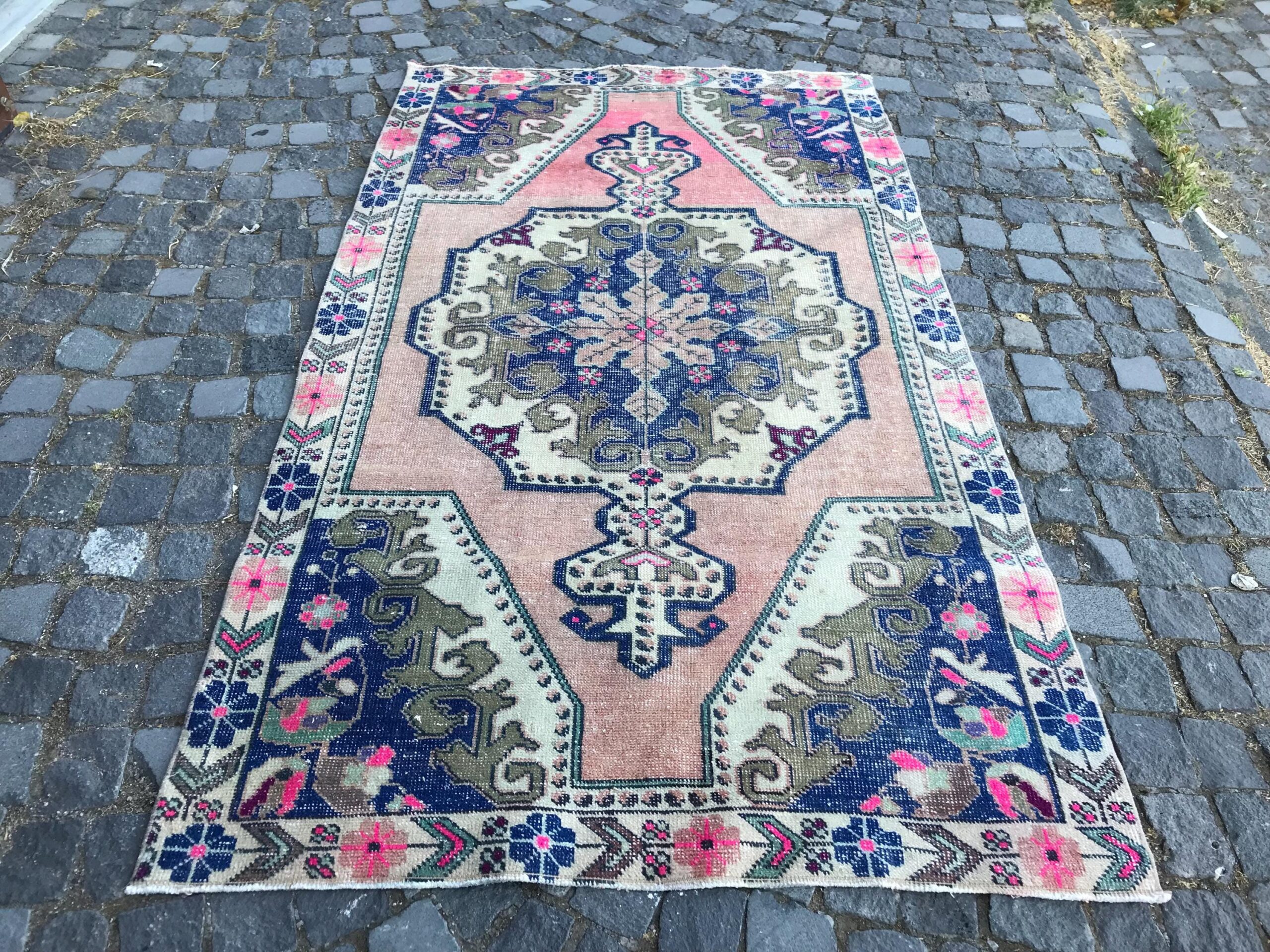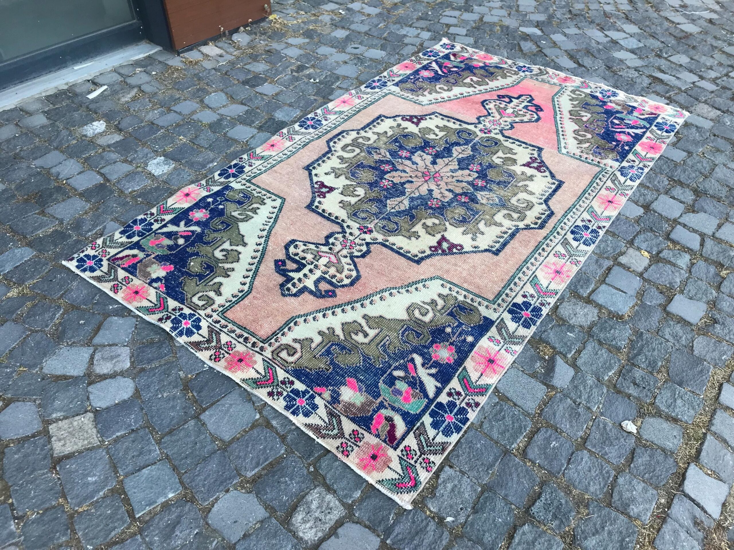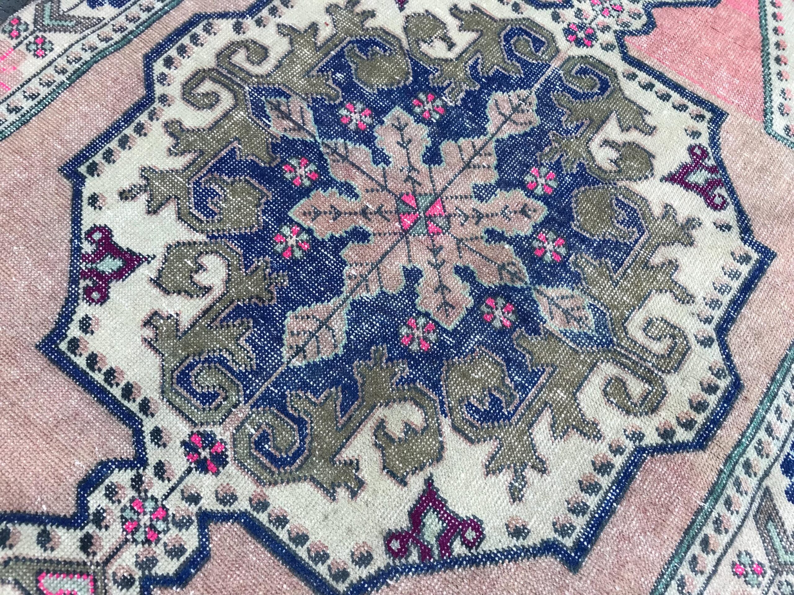 This is a vintage Turkish rug hand-knotted in a small village in Turkey by skilled Anatolian women during around the 1990s. It is made from natural wool (sheep) and dyed using all-natural (vegetable) dyes. Natural materials are more durable than synthetic materials guaranteeing a rug that can last for years while natural dyes provide colors that gets more beautiful as years pass by especially when in direct sunlight.