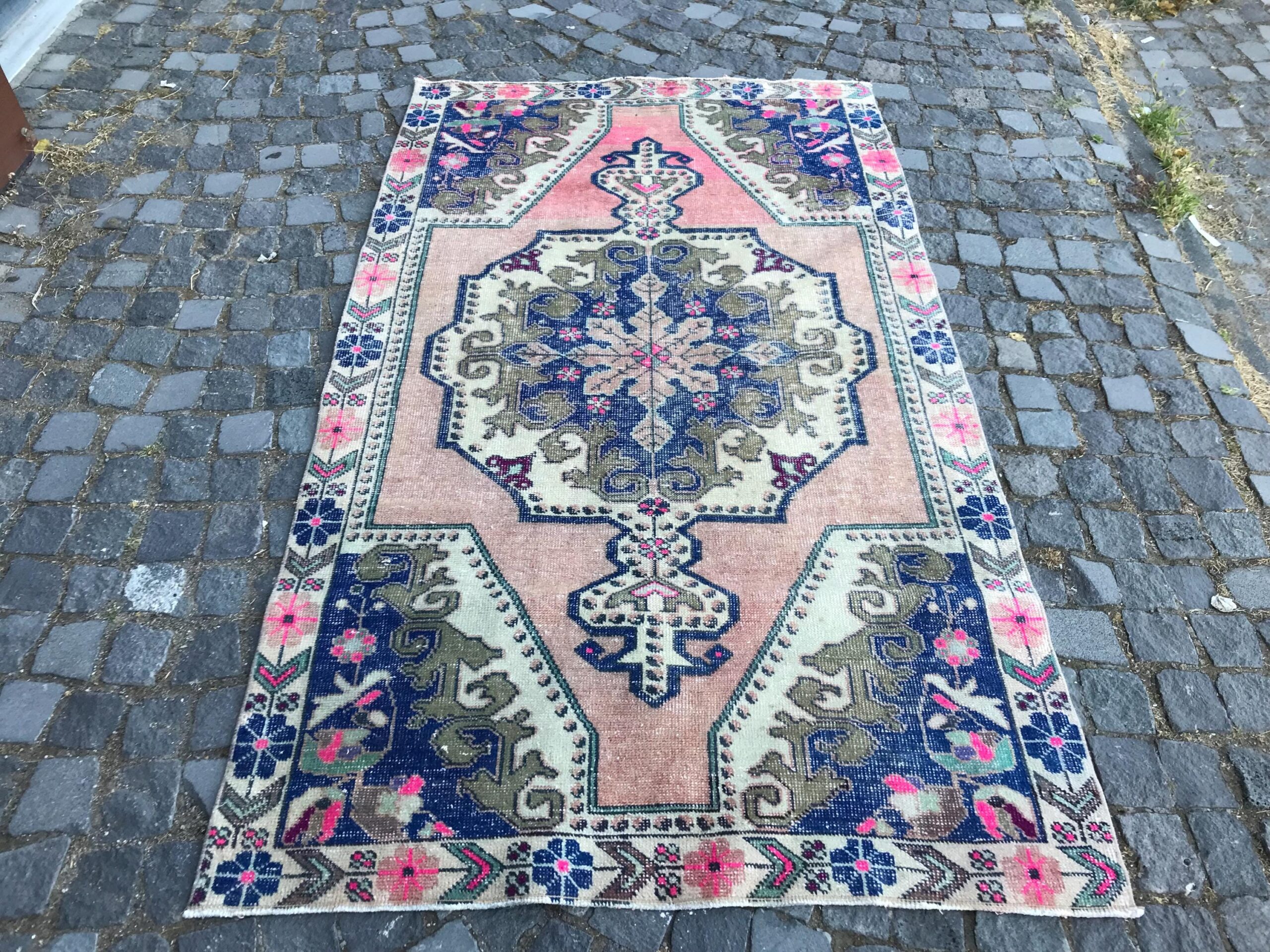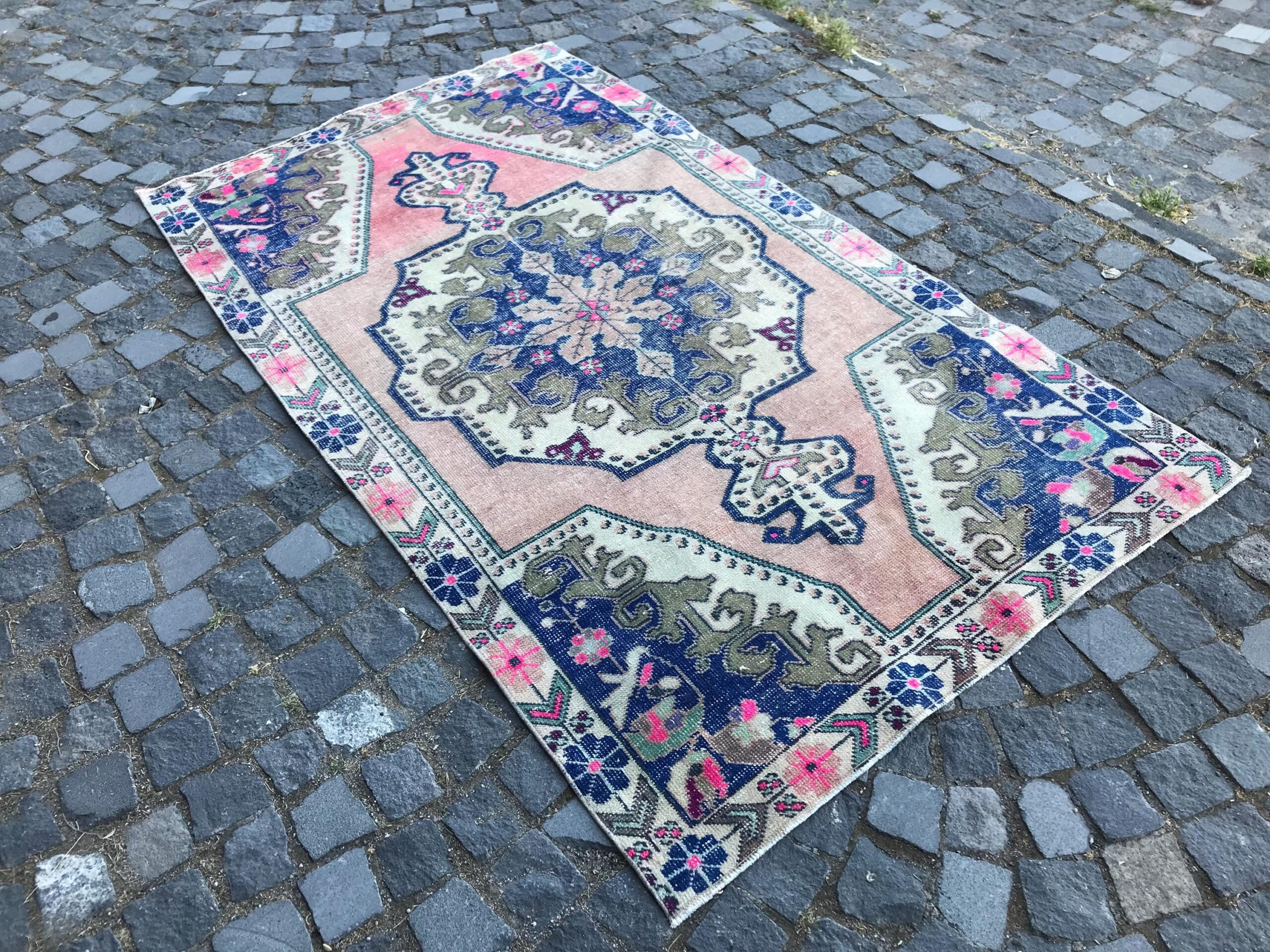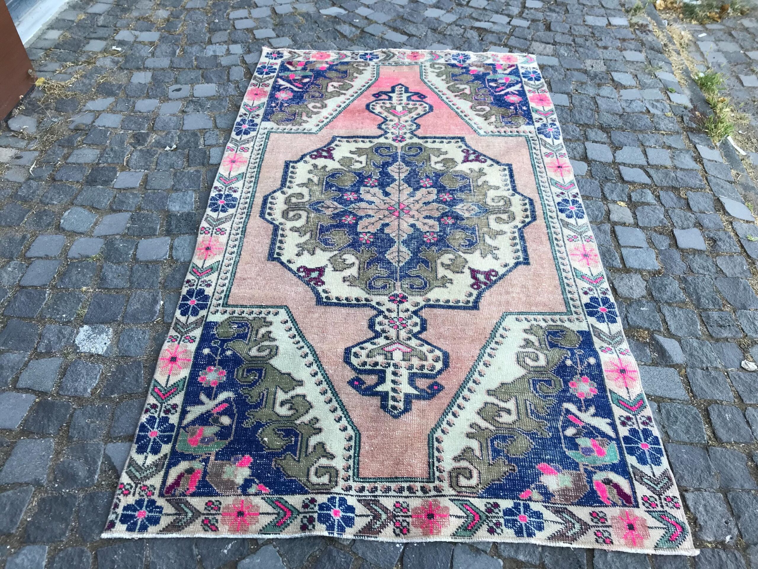 This is a vintage Turkish rug hand-knotted in a small village in Turkey by skilled Anatolian women during around the 1990s. It is made from natural wool (sheep) and dyed using all-natural (vegetable) dyes. Natural materials are more durable than synthetic materials guaranteeing a rug that can last for years while natural dyes provide colors that gets more beautiful as years pass by especially when in direct sunlight.