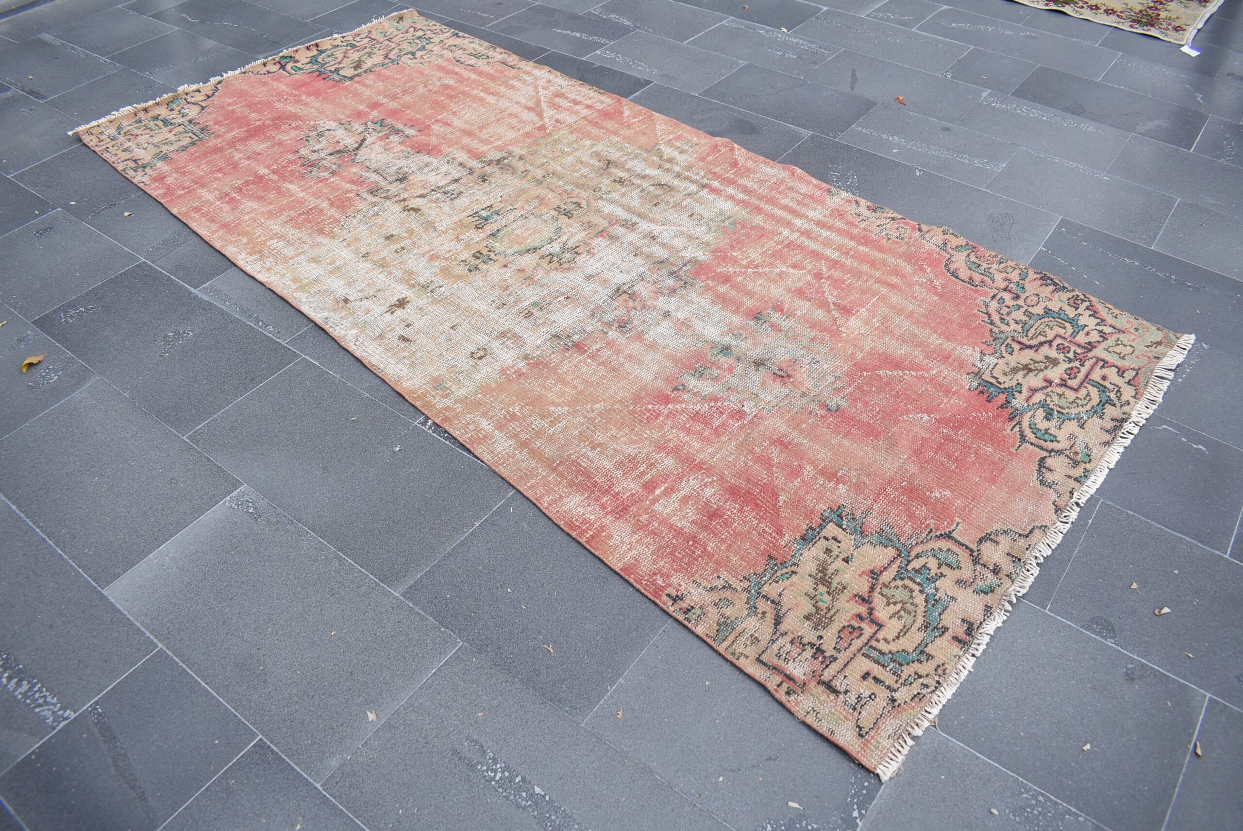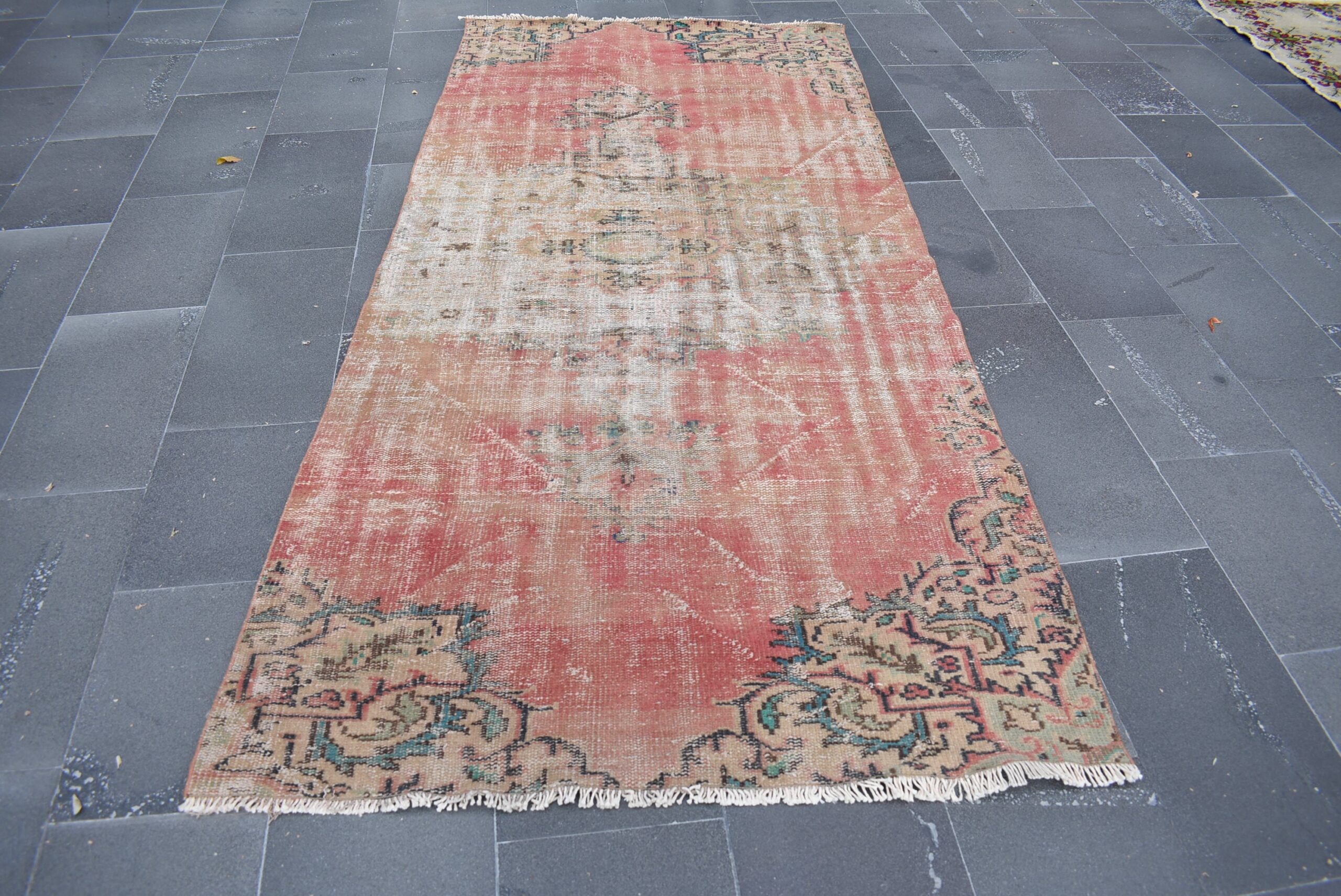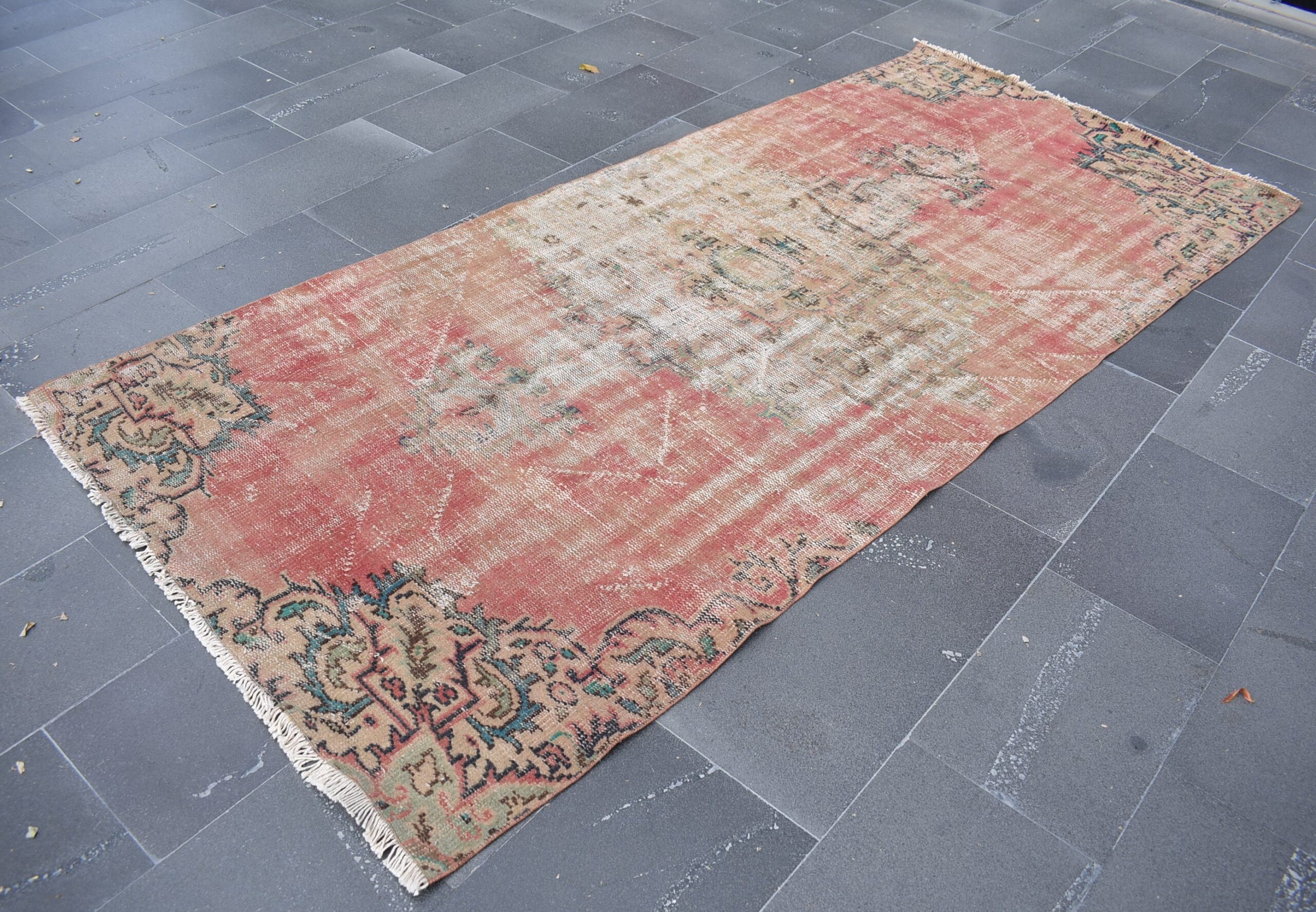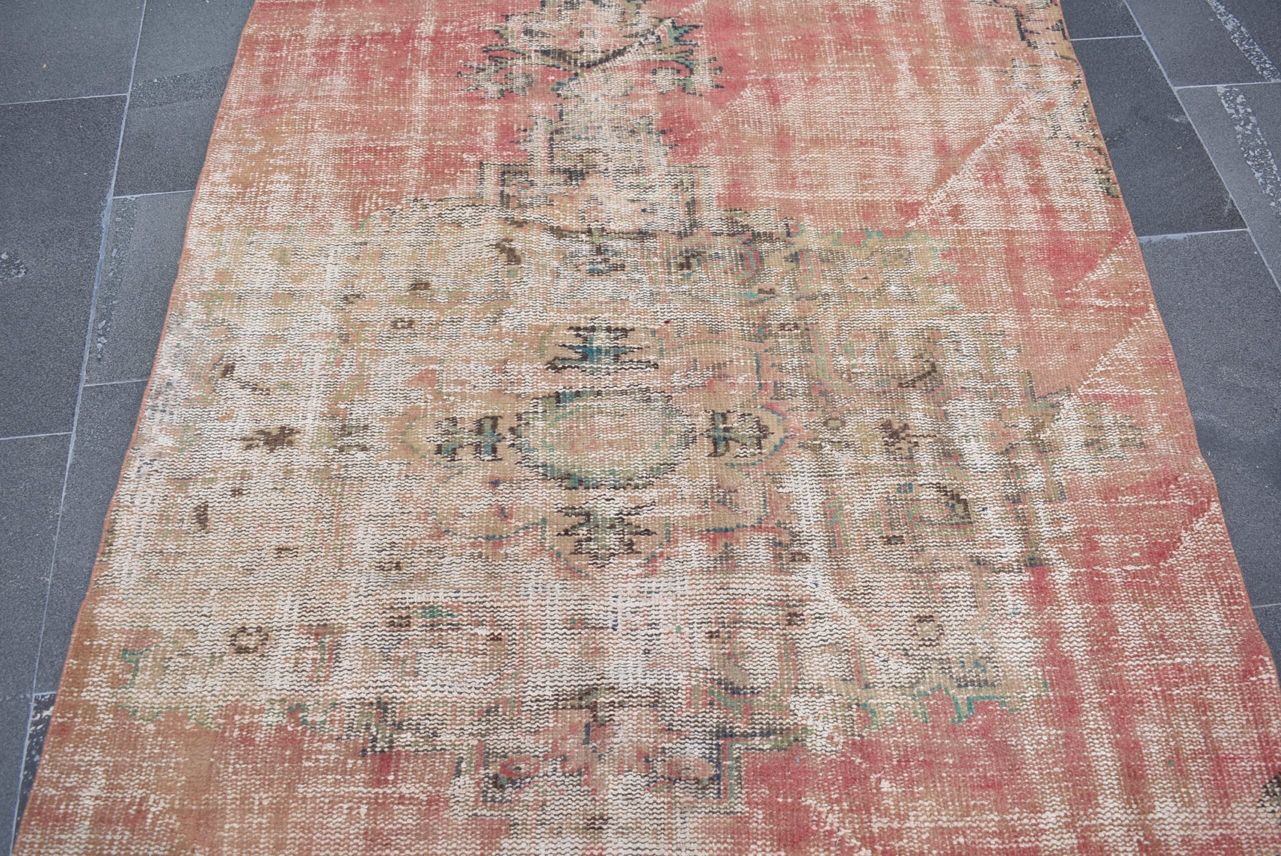 This is a vintage Turkish rug hand-knotted in a small village in Turkey by skilled Anatolian women during around the 1970s. It is made from natural wool (sheep) and dyed using all-natural (vegetable) dyes. Natural materials are more durable than synthetic materials guaranteeing a rug that can last for years while natural dyes provide colors that gets more beautiful as years pass by especially when in direct sunlight.