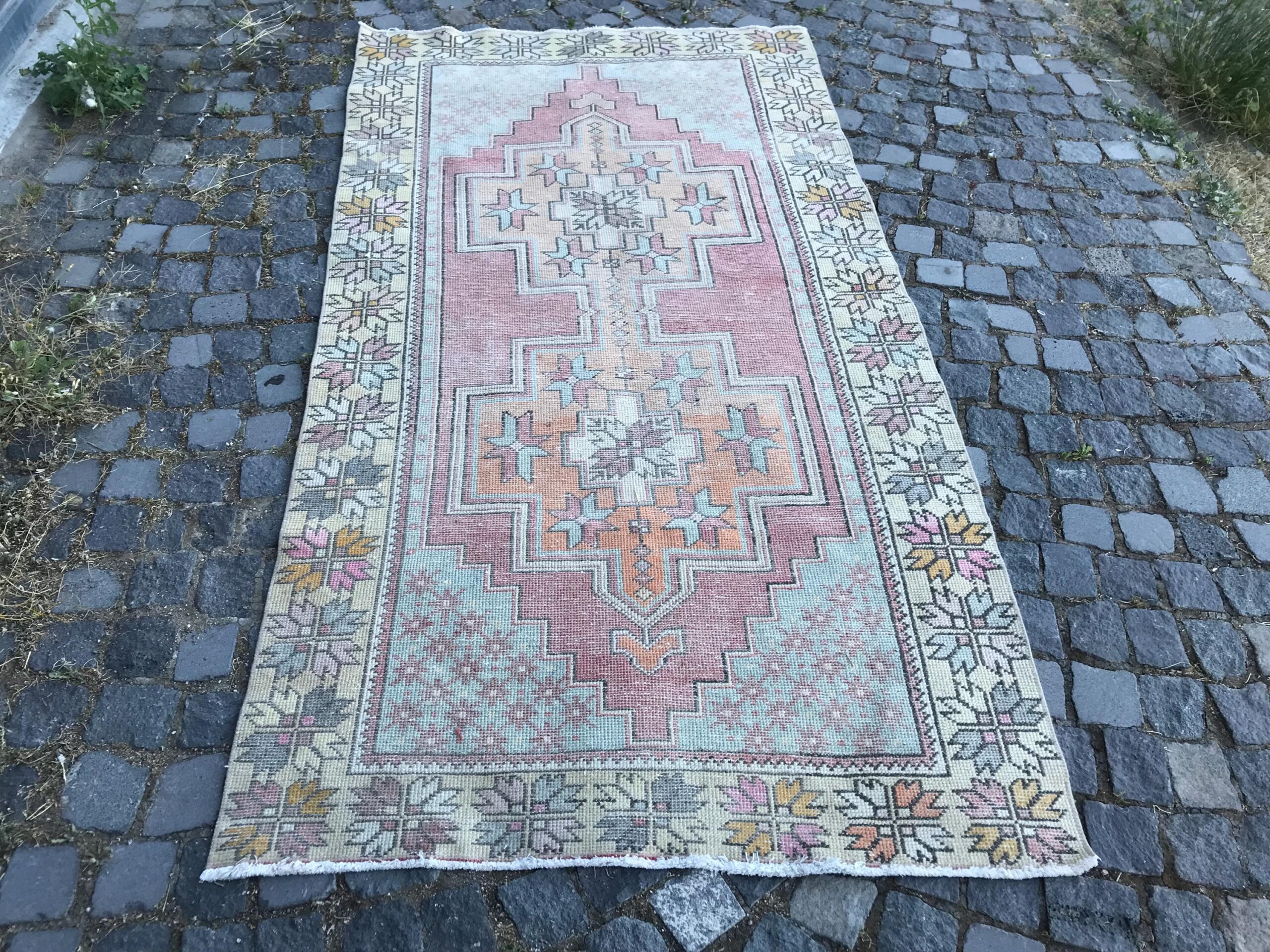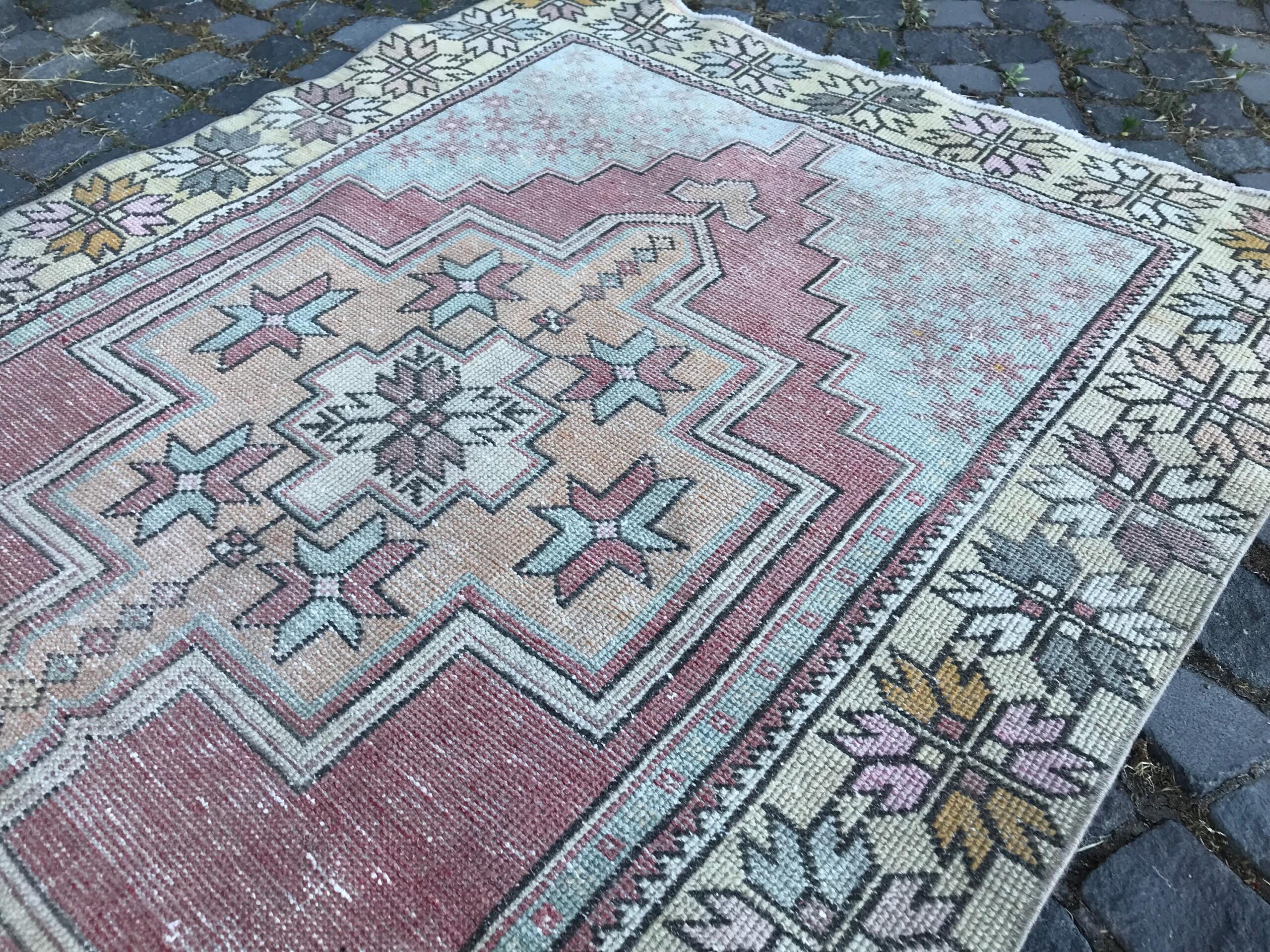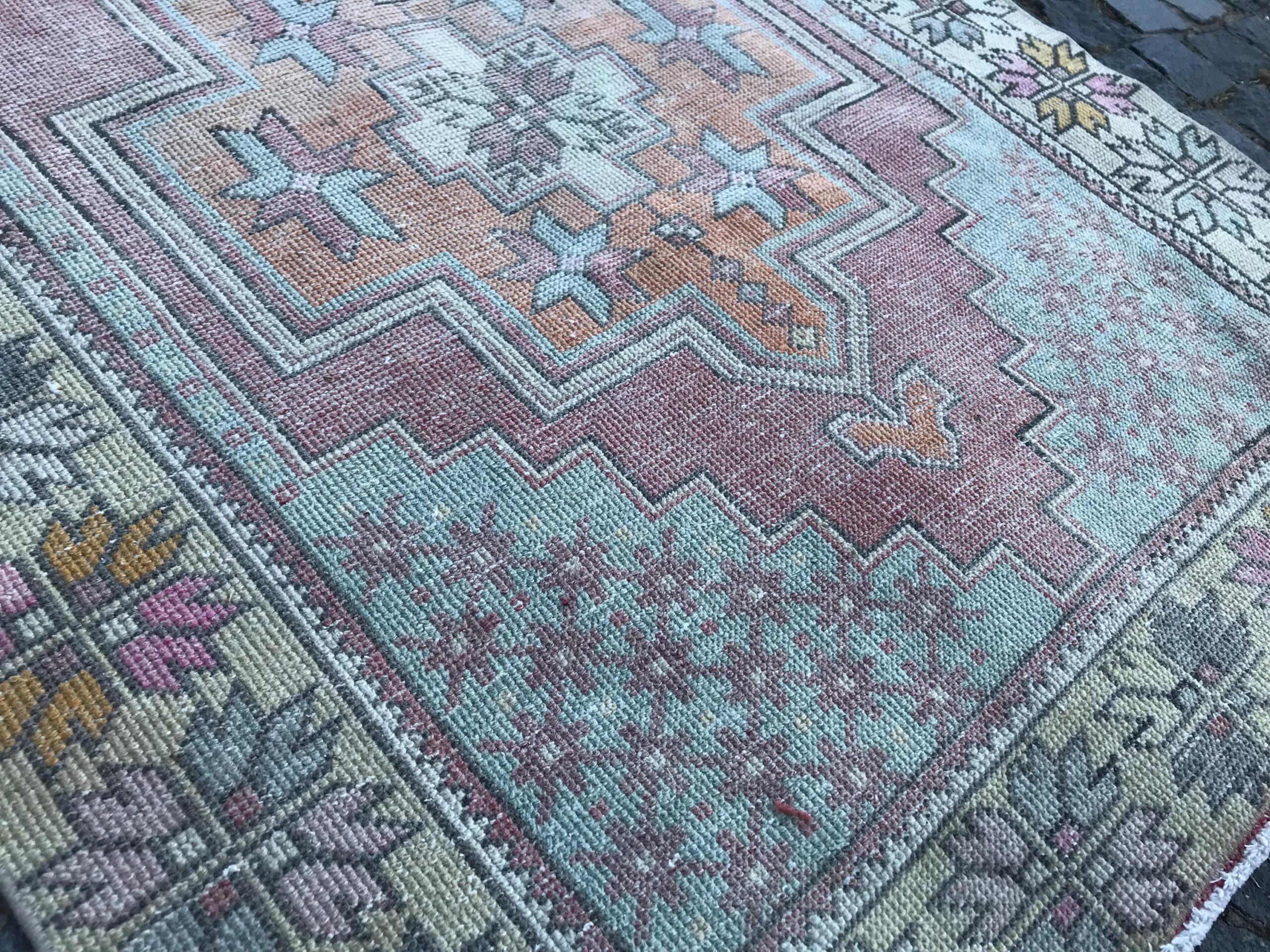 This is a vintage Turkish rug hand-knotted in a small village in Turkey by skilled Anatolian women during around the 1980s. It is made from natural wool (sheep) and dyed using all-natural (vegetable) dyes. Natural materials are more durable than synthetic materials guaranteeing a rug that can last for years while natural dyes provide colors that gets more beautiful as years pass by especially when in direct sunlight.