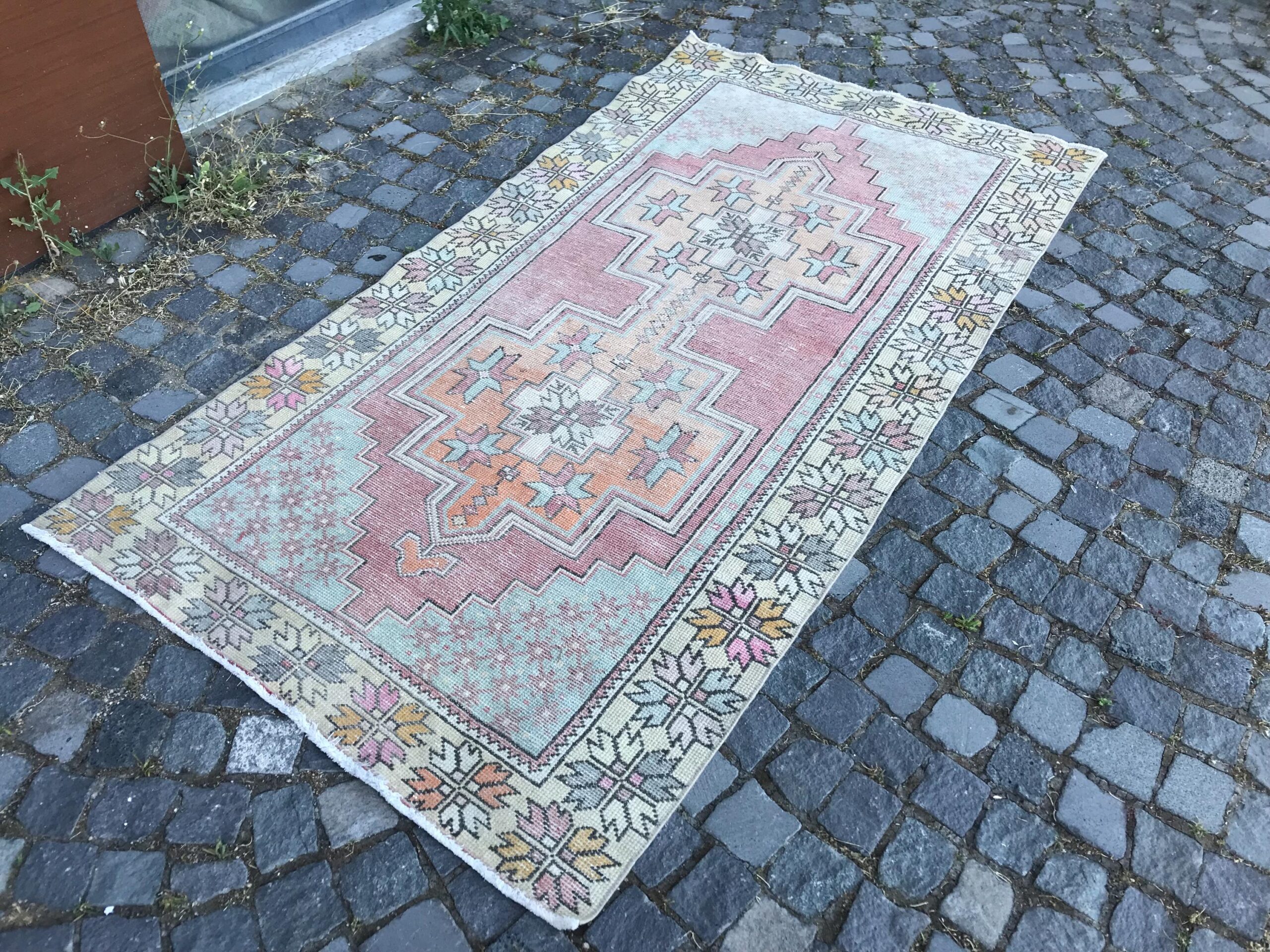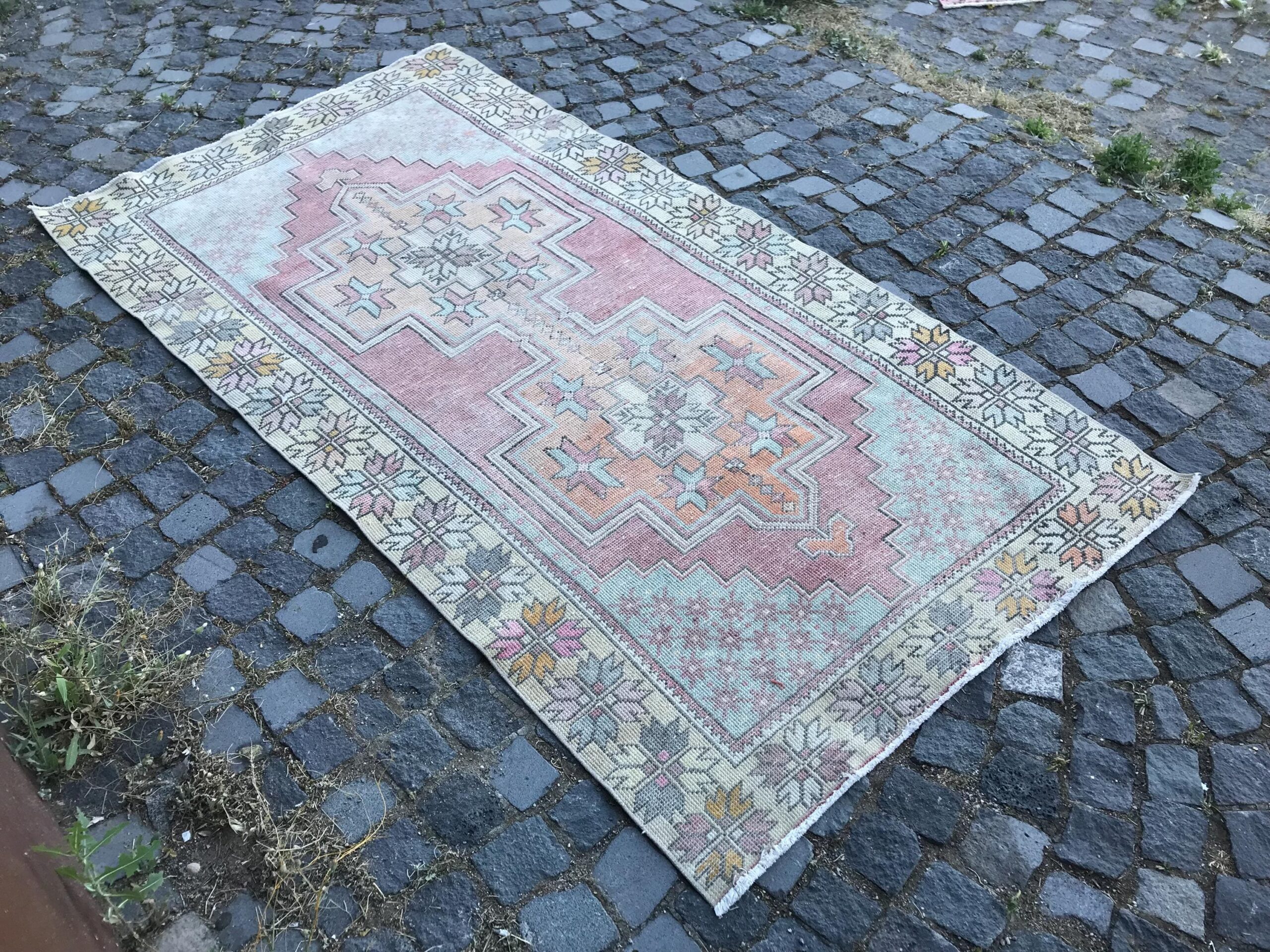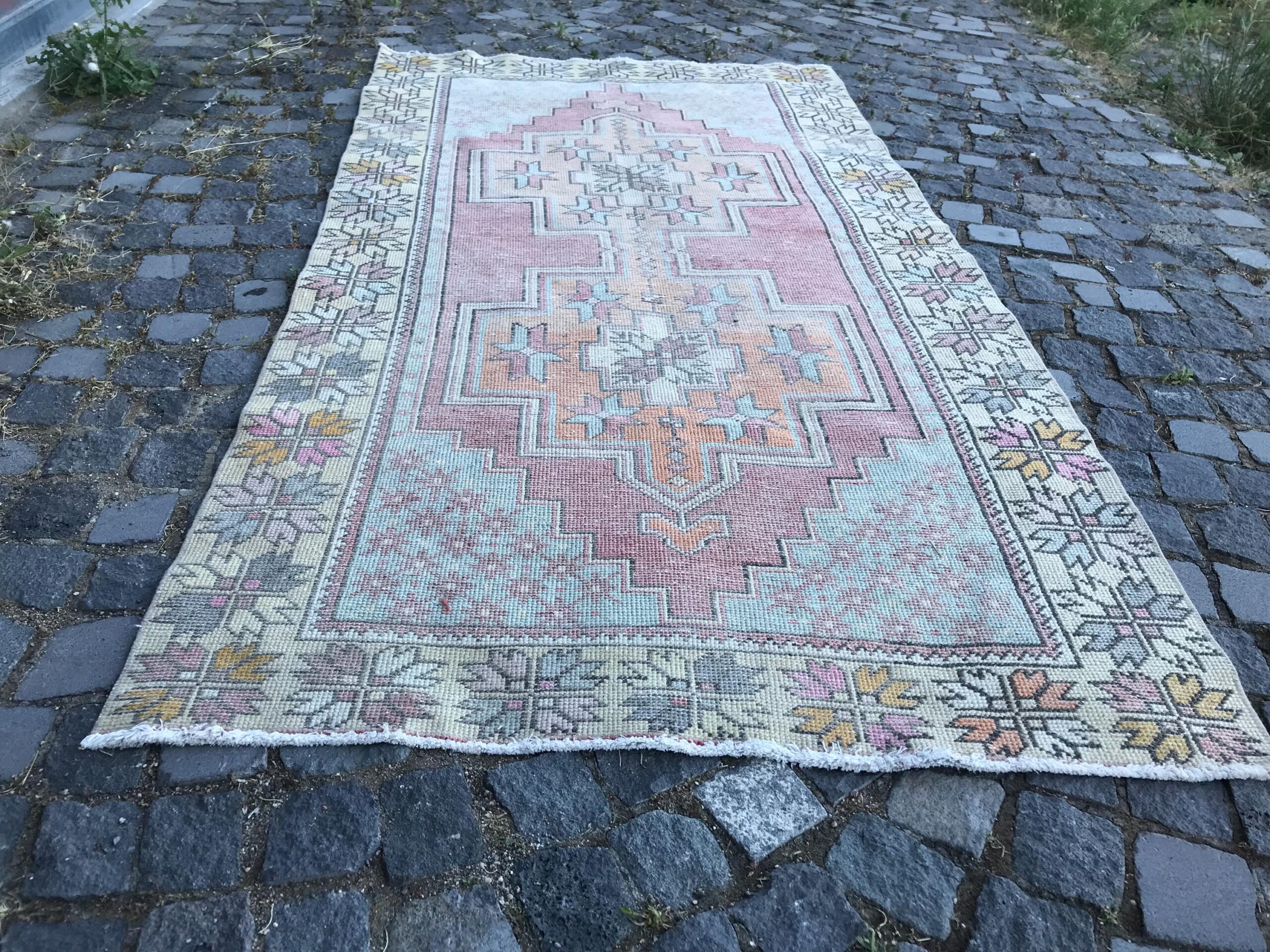 This is a vintage Turkish rug hand-knotted in a small village in Turkey by skilled Anatolian women during around the 1980s. It is made from natural wool (sheep) and dyed using all-natural (vegetable) dyes. Natural materials are more durable than synthetic materials guaranteeing a rug that can last for years while natural dyes provide colors that gets more beautiful as years pass by especially when in direct sunlight.