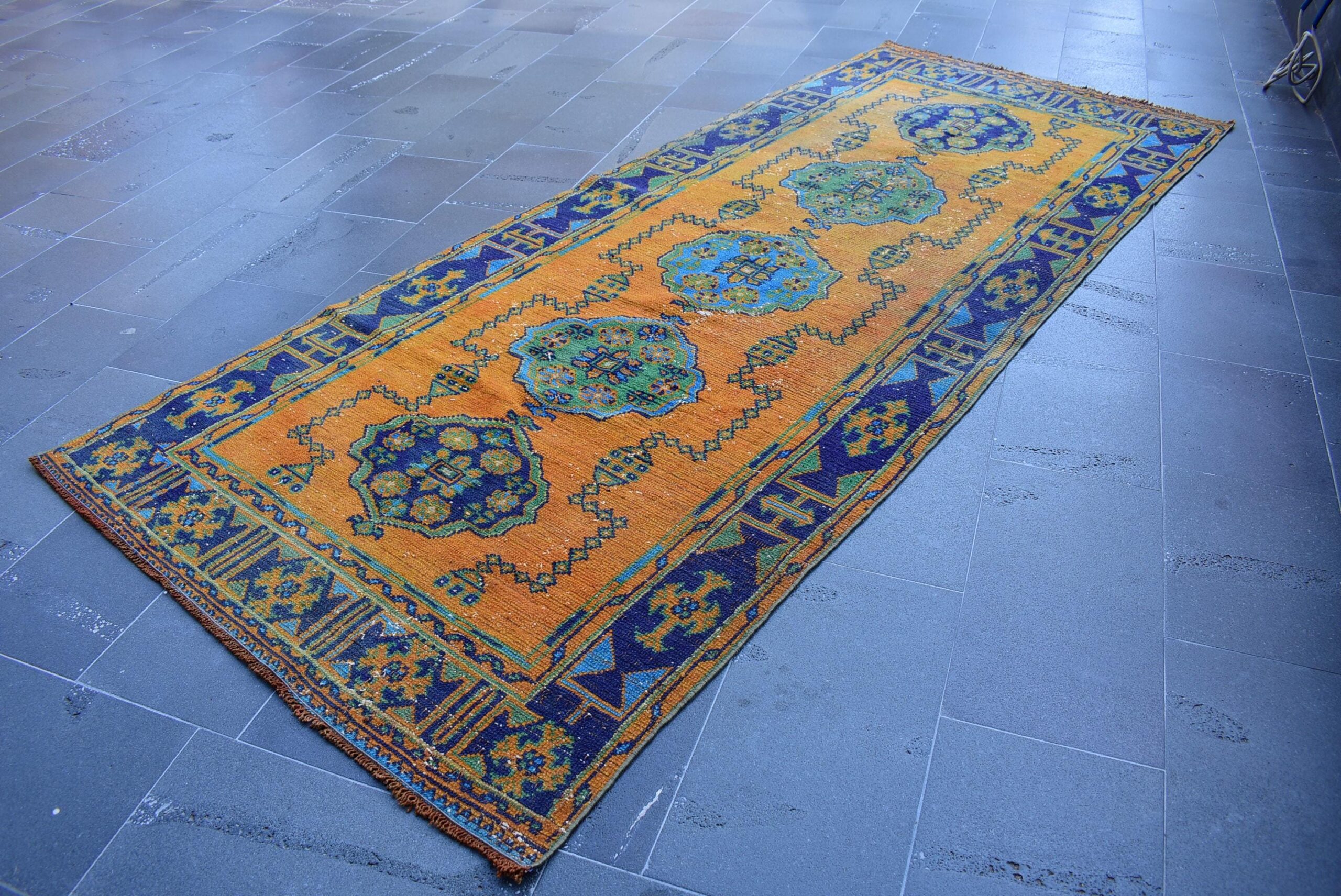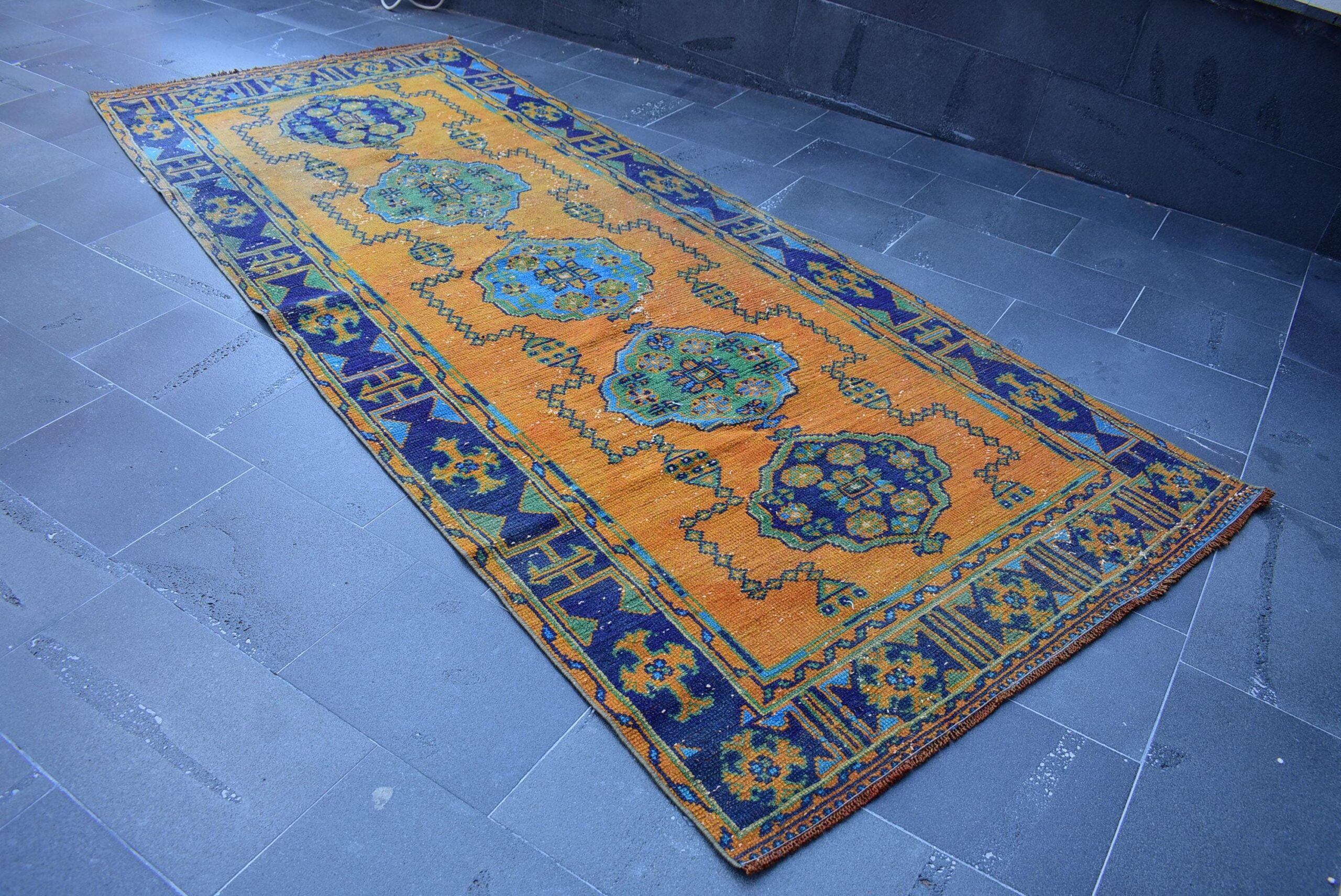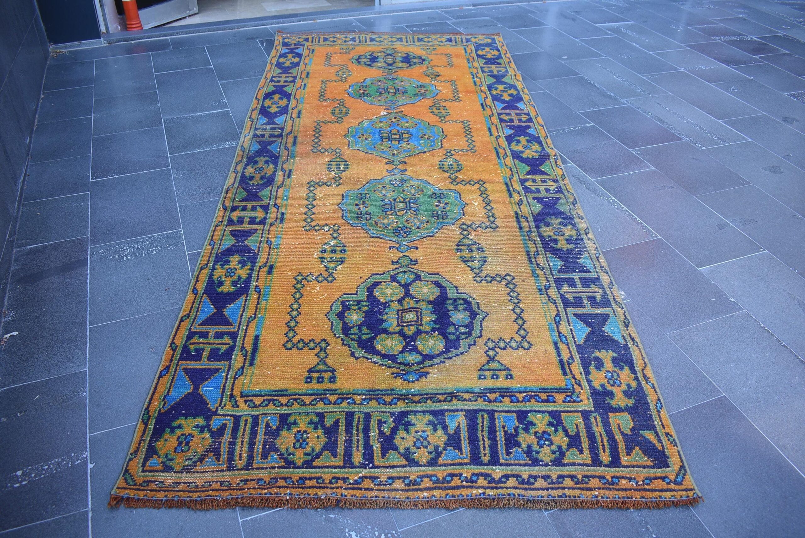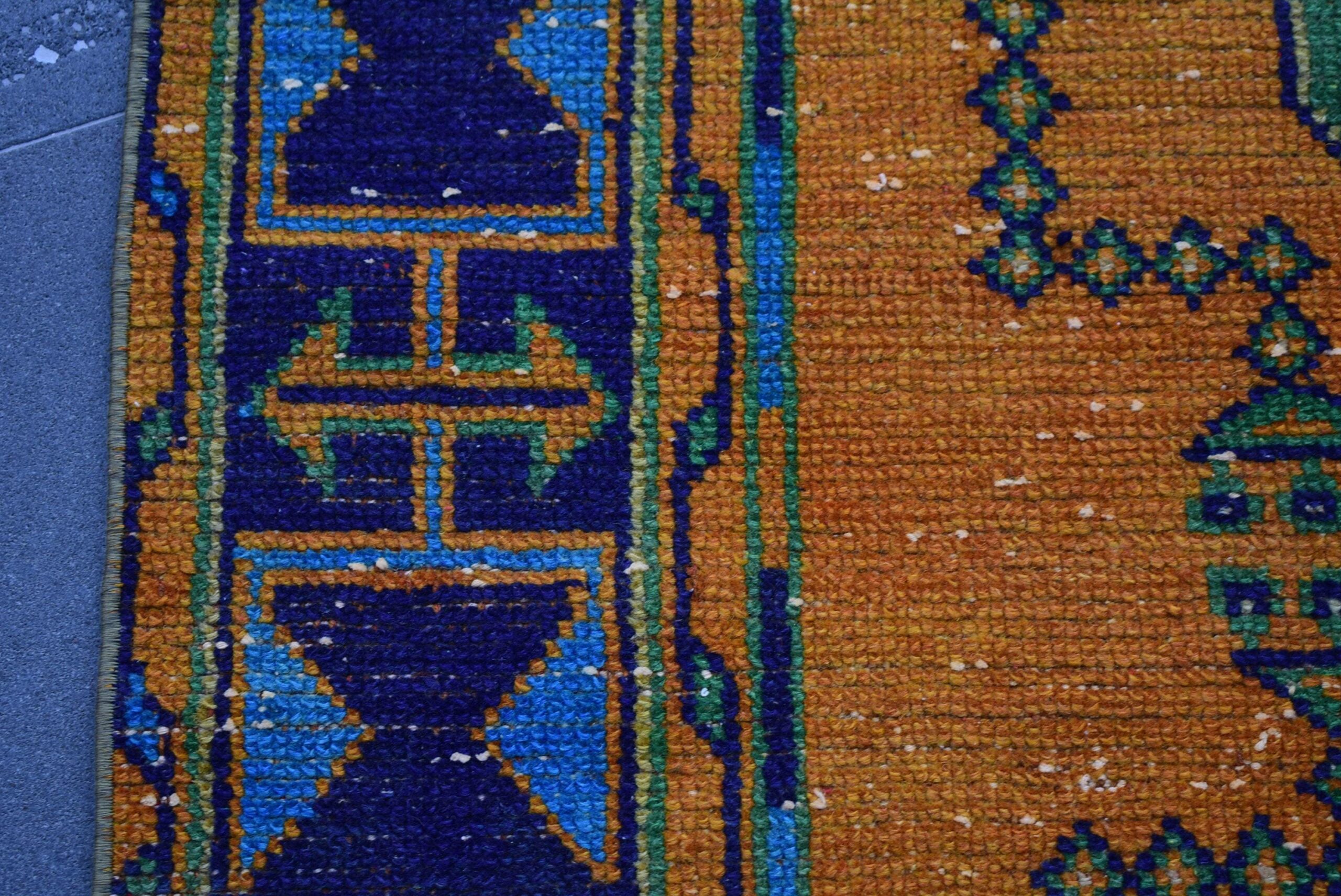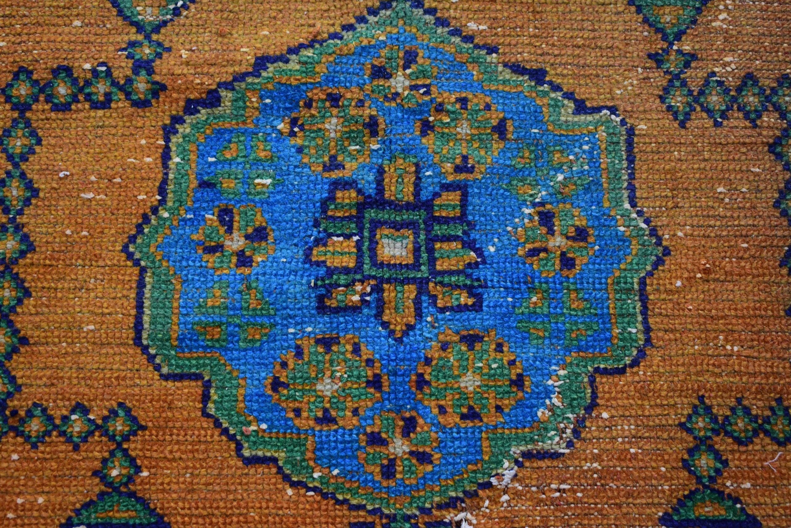 This is a vintage Turkish rug hand-knotted in a small village in Turkey by skilled Anatolian women during around the 1980s. It is made from natural wool (sheep) and dyed using all-natural (vegetable) dyes. Natural materials are more durable than synthetic materials guaranteeing a rug that can last for years while natural dyes provide colors that gets more beautiful as years pass by especially when in direct sunlight.