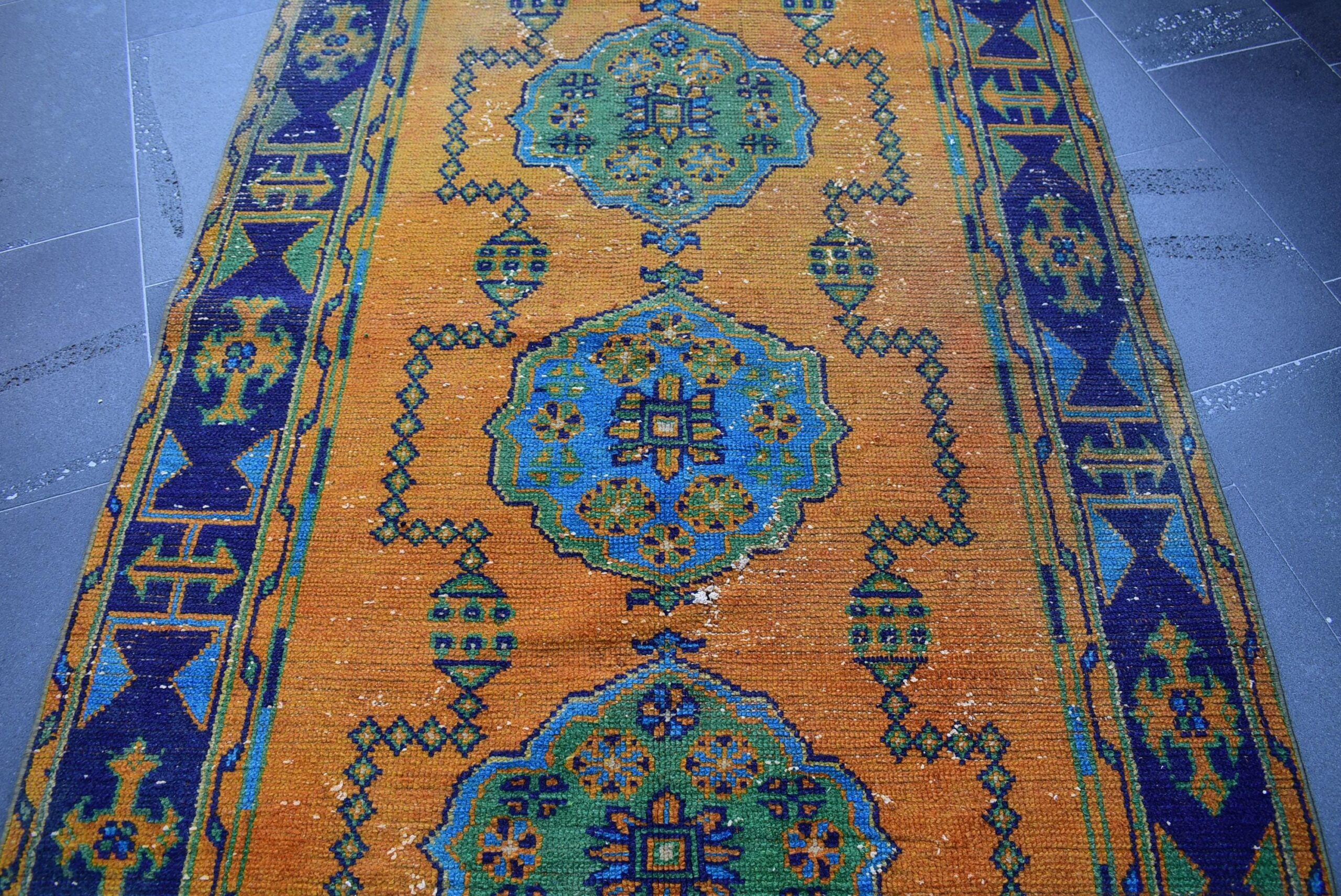 Lovely and unique 4.3 ft. x 10.5 ft. (130 cm x 319 cm) vintage Turkish rug hand-knotted in Turkey from organic wool. This is an authentic vintage Turkish rug from the 1980s that has worn beautifully to perfection.