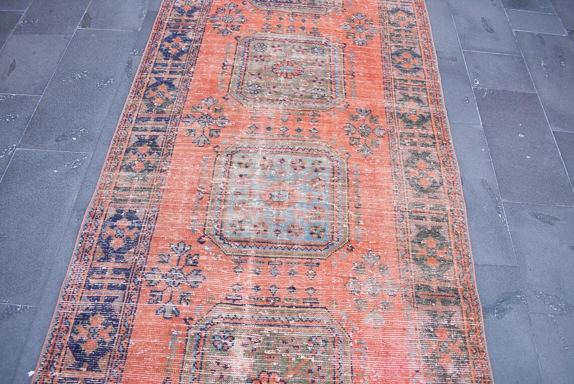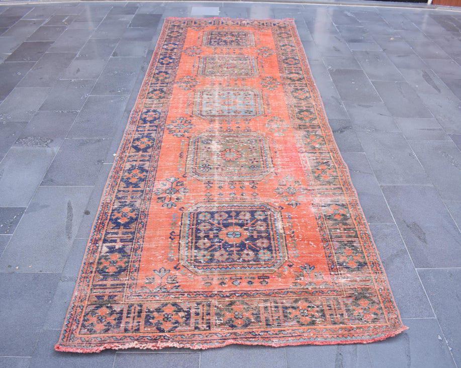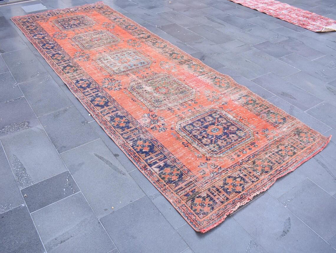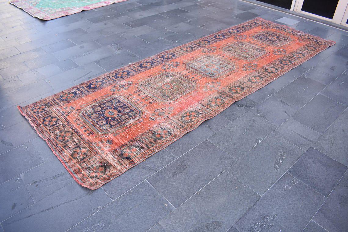Pretty and one-of-a-kind 4.3 ft. x 12.7 ft. (131 cm x 388 cm) vintage Turkish rug hand-knotted in Turkey from organic wool. This is an authentic vintage Turkish rug from the 1980s that has worn splendidly to perfection.