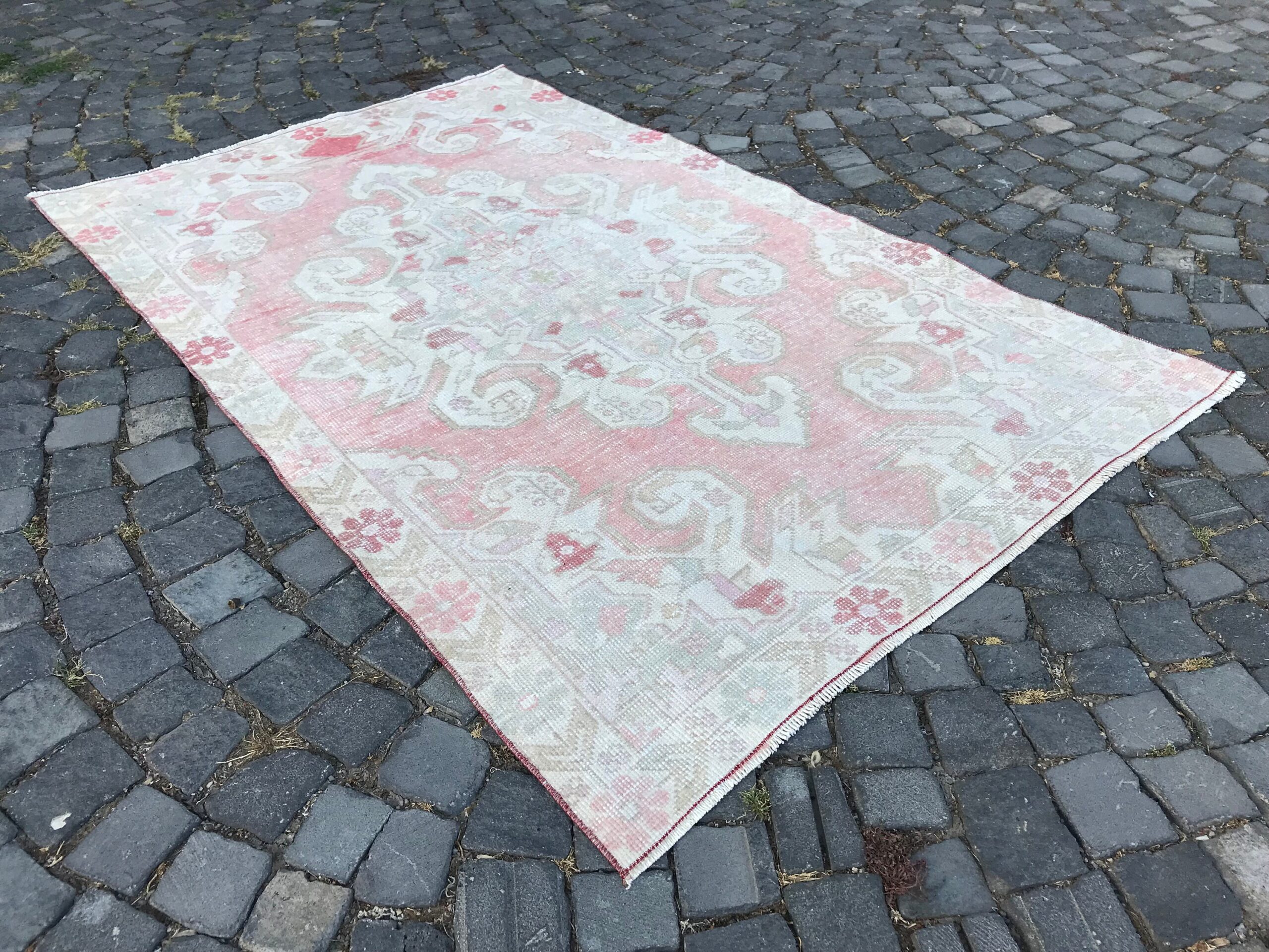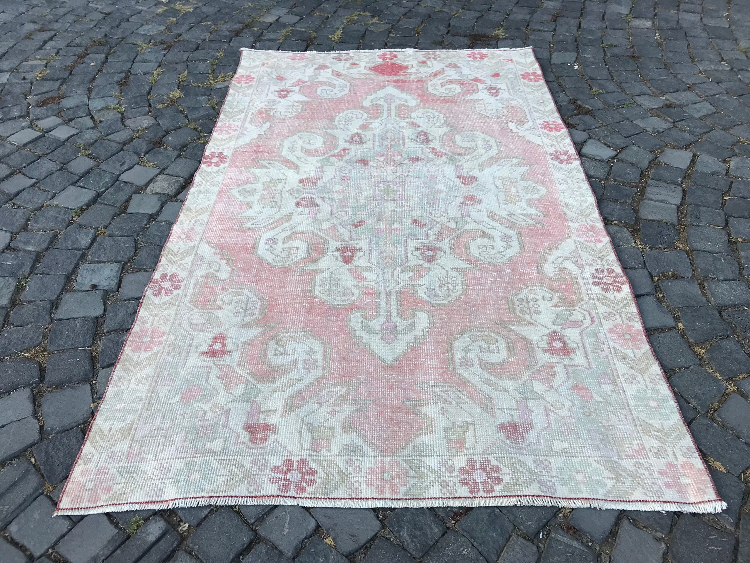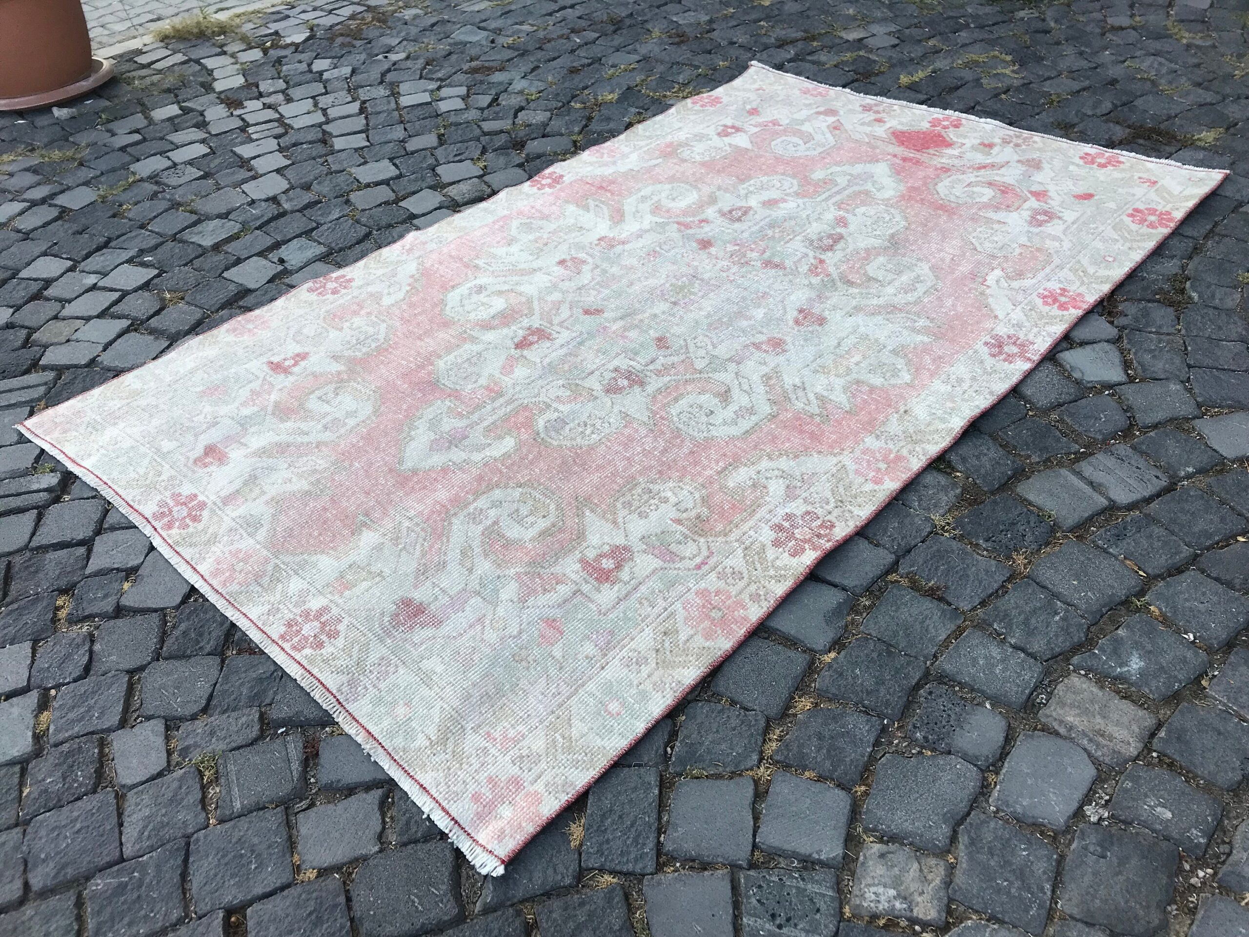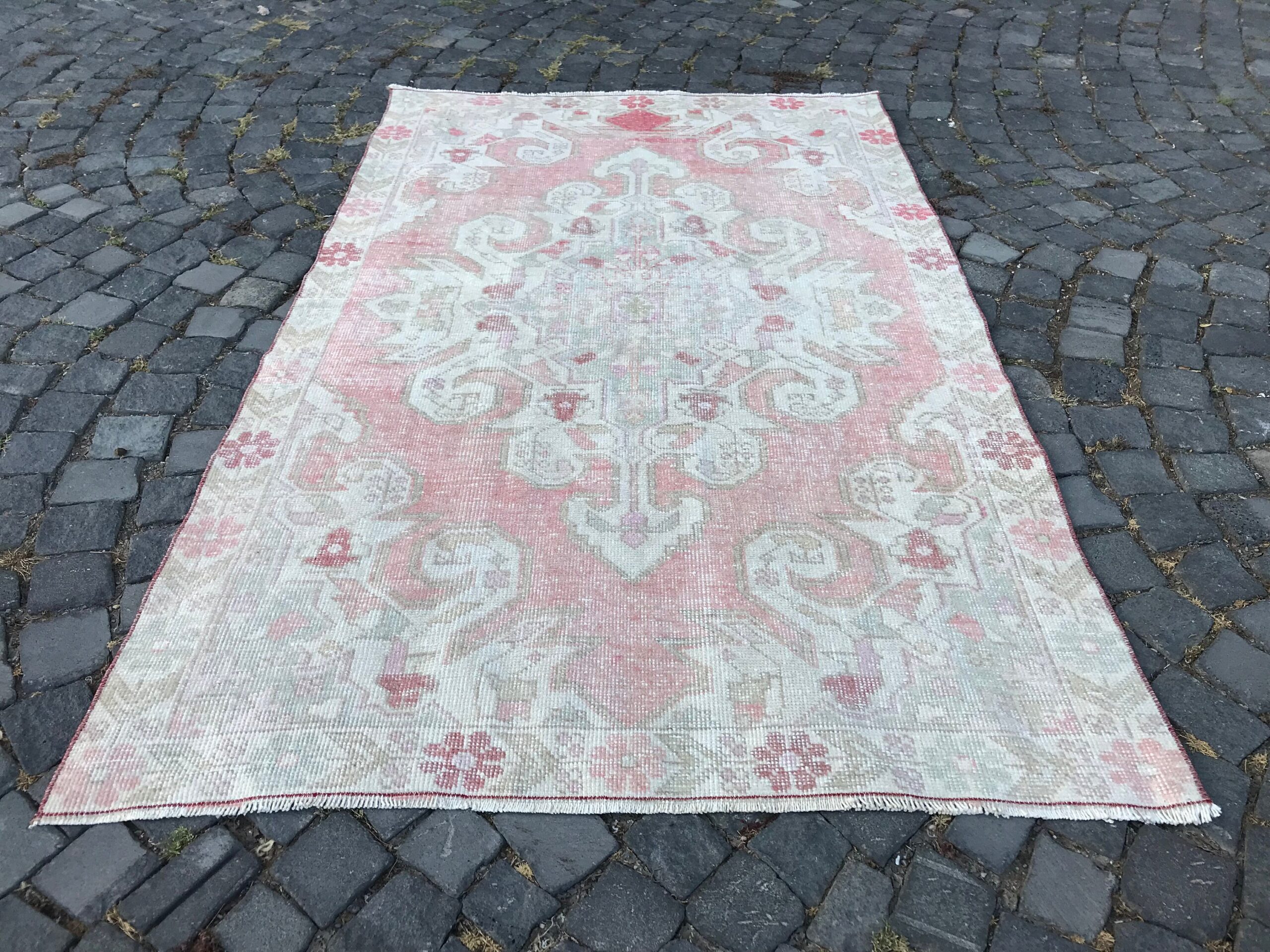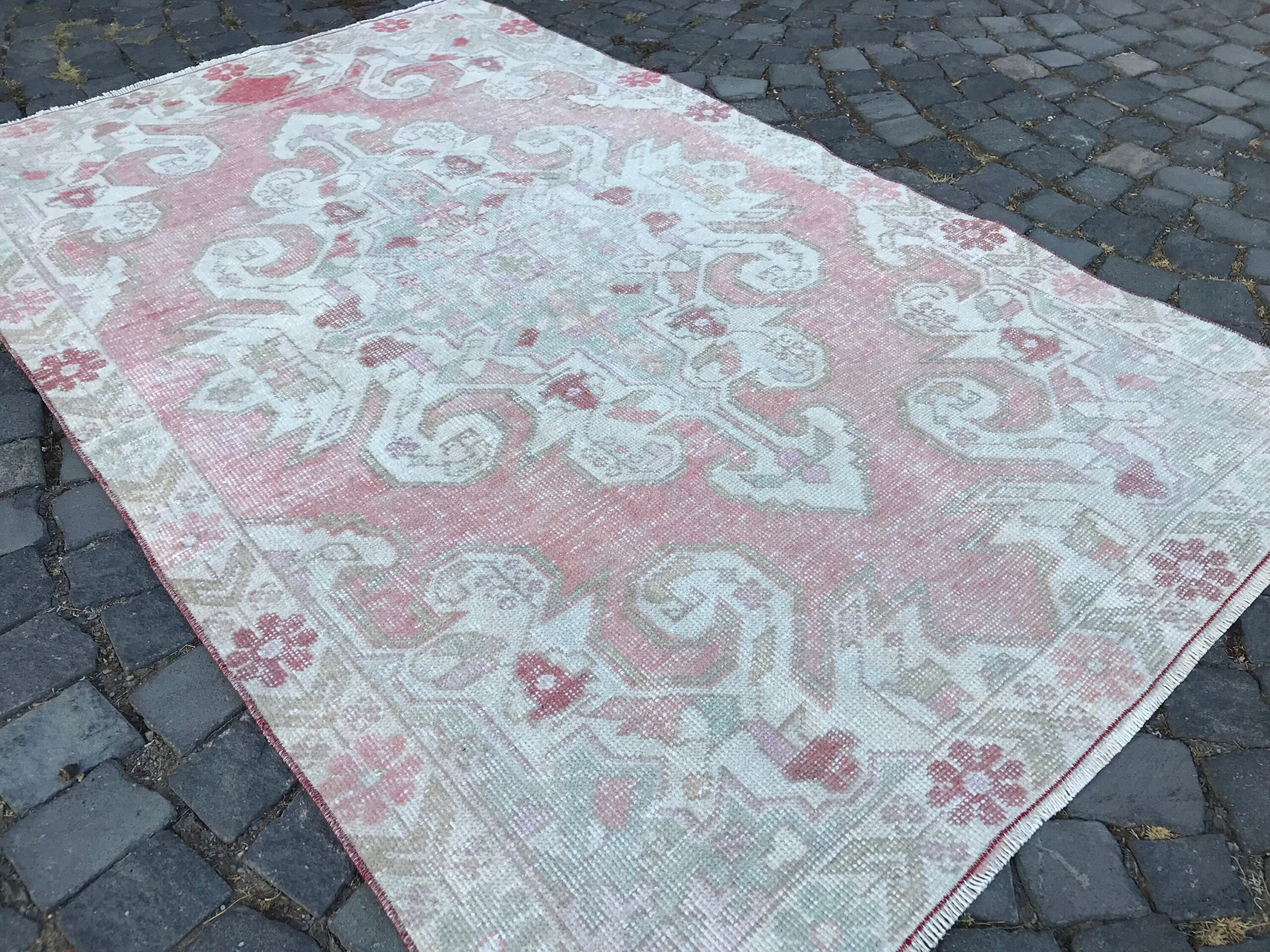 Lovely and unique 4.3 ft. x 6.8 ft. (130 cm x 207 cm) vintage Turkish rug hand-knotted in Turkey from organic wool. This is an authentic vintage Turkish rug from the 1980s that has worn beautifully to perfection.