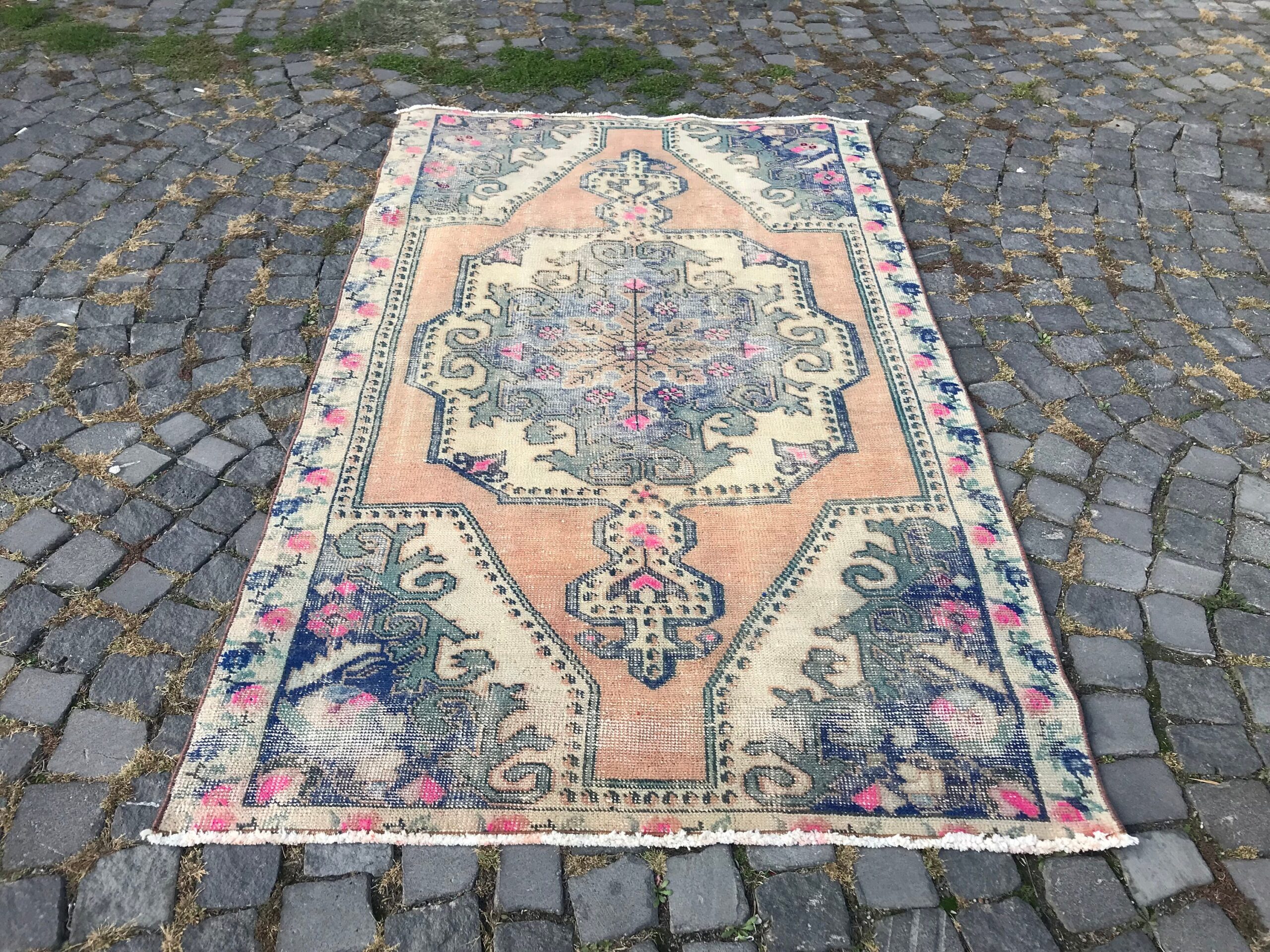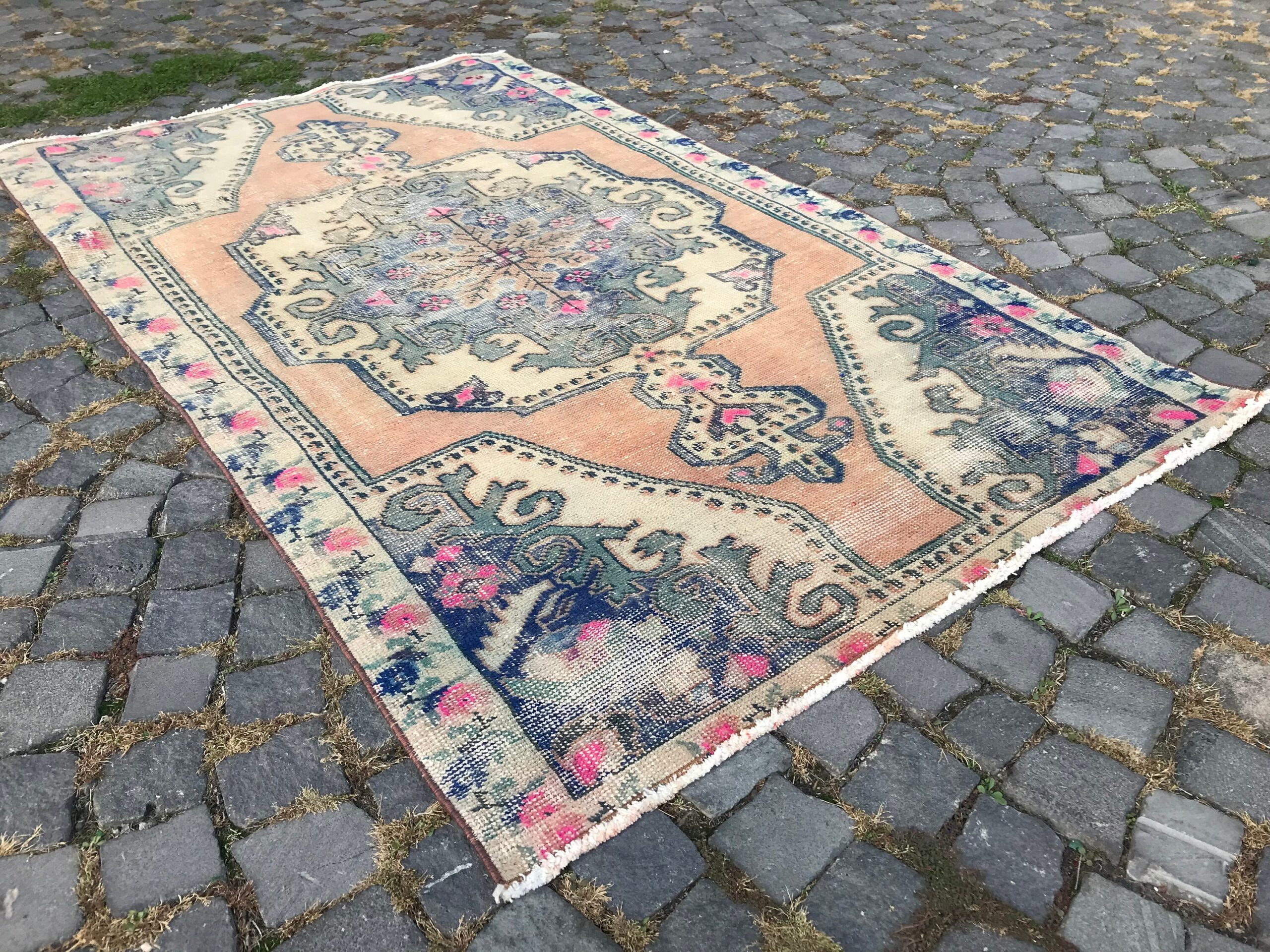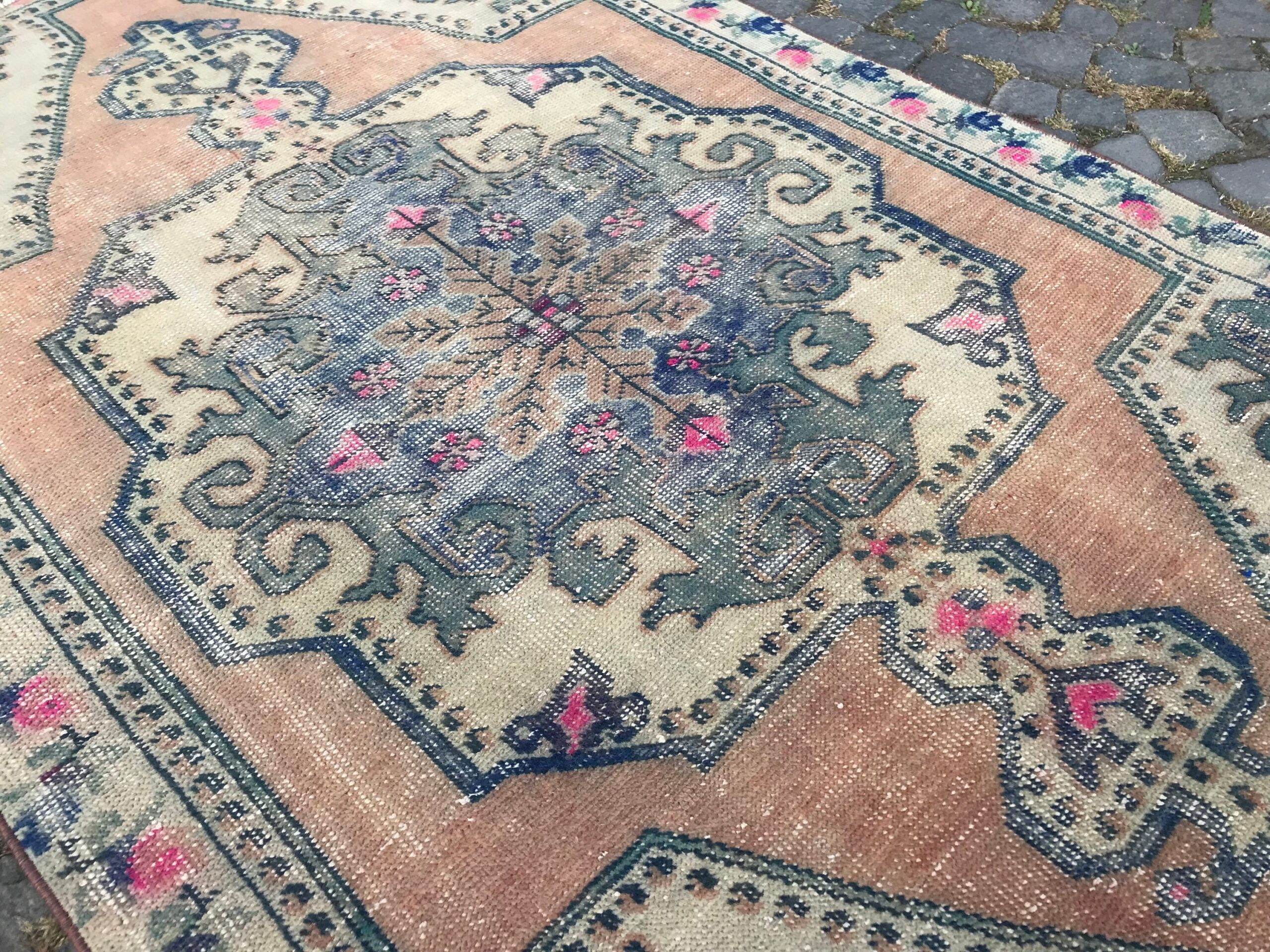 Beautiful and one-of-a-kind 4.3 ft. x 7.2 ft. (132 cm x 220 cm) vintage Turkish rug hand-knotted in Turkey from organic wool. This is an authentic vintage Turkish rug from the 1980s that has worn admirably to perfection.