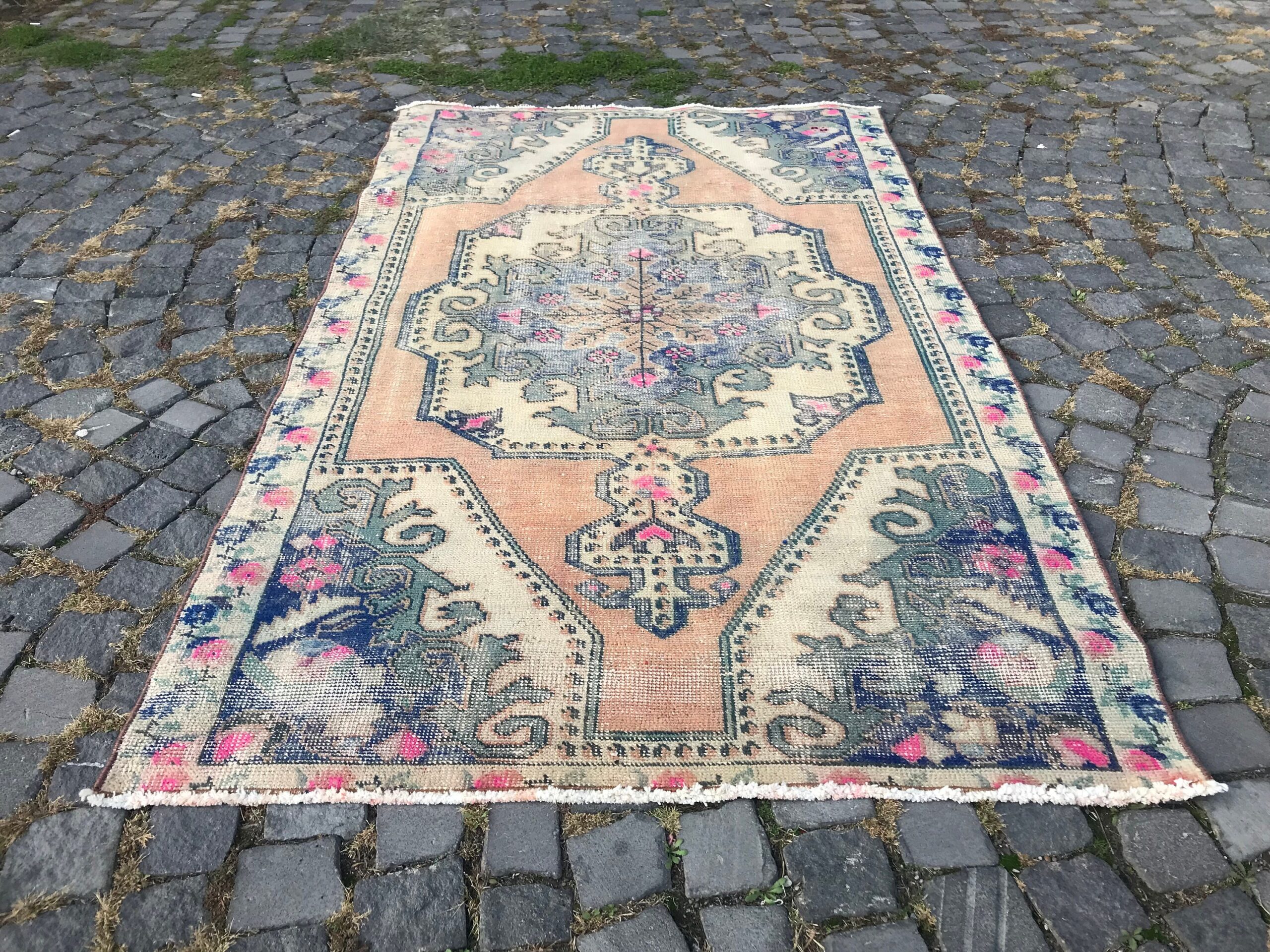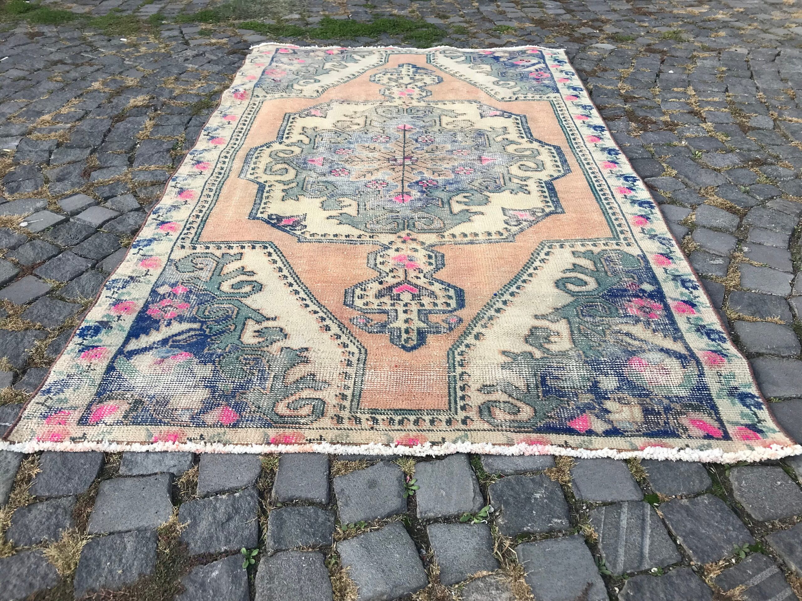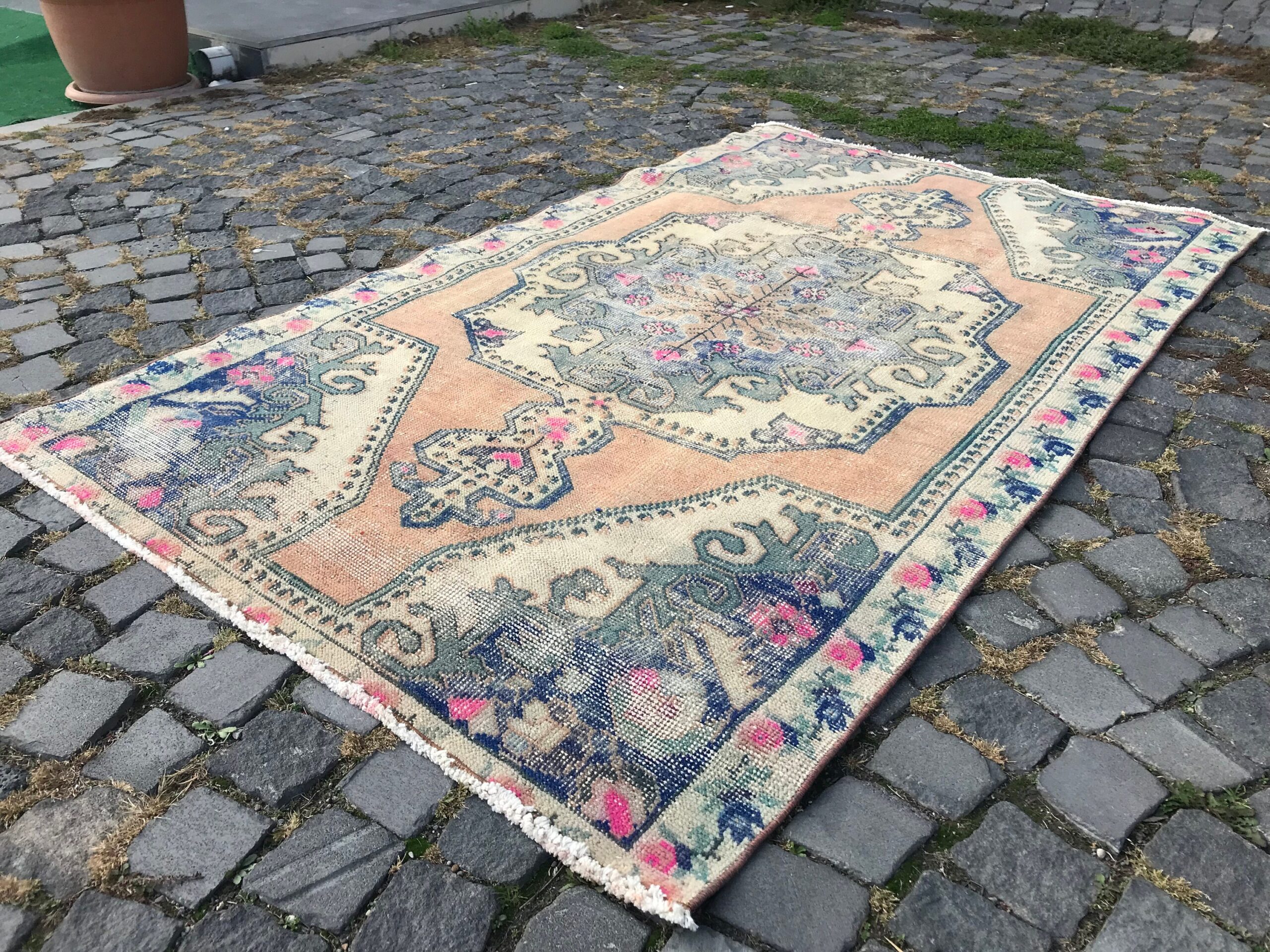 This is a vintage Turkish rug hand-knotted in a small village in Turkey by skilled Anatolian women during around the 1980s. It is made from natural wool (sheep) and dyed using all-natural (vegetable) dyes. Natural materials are more durable than synthetic materials guaranteeing a rug that can last for years while natural dyes provide colors that gets more beautiful as years pass by especially when in direct sunlight.