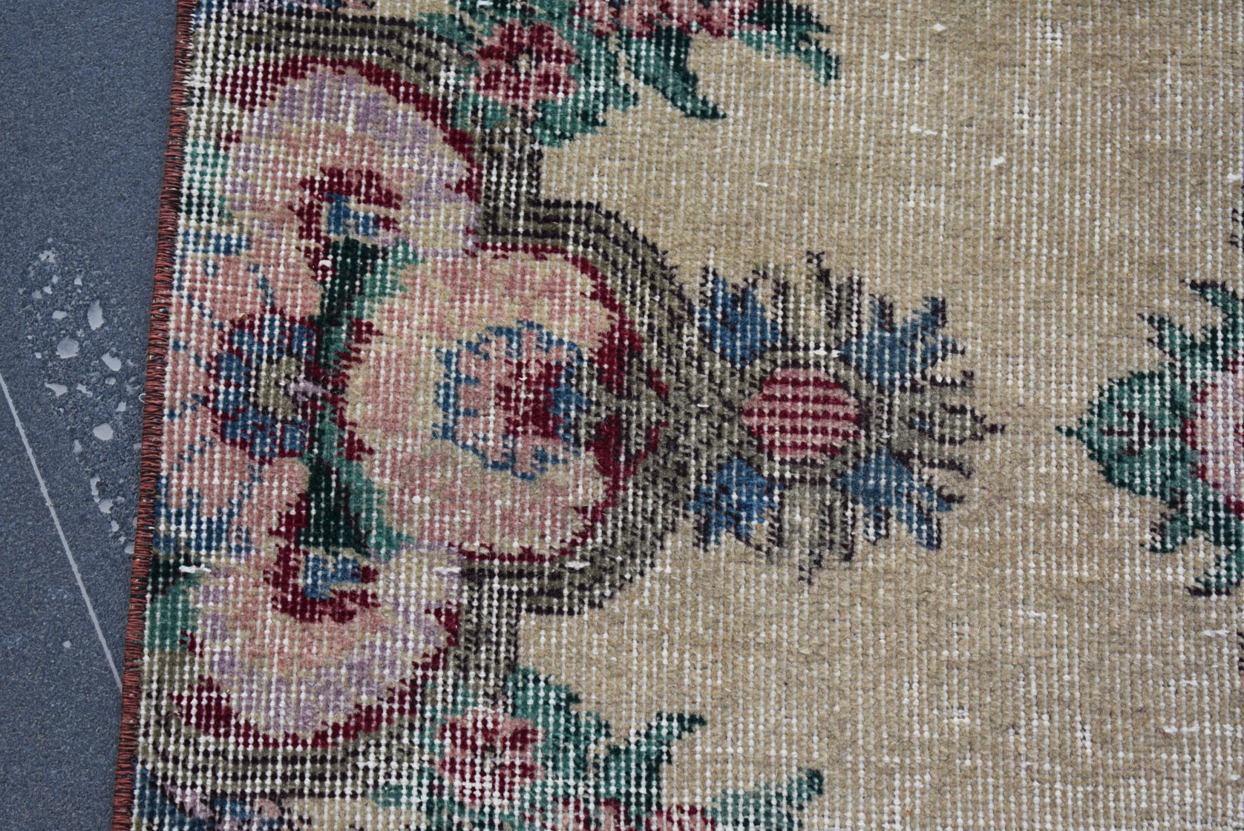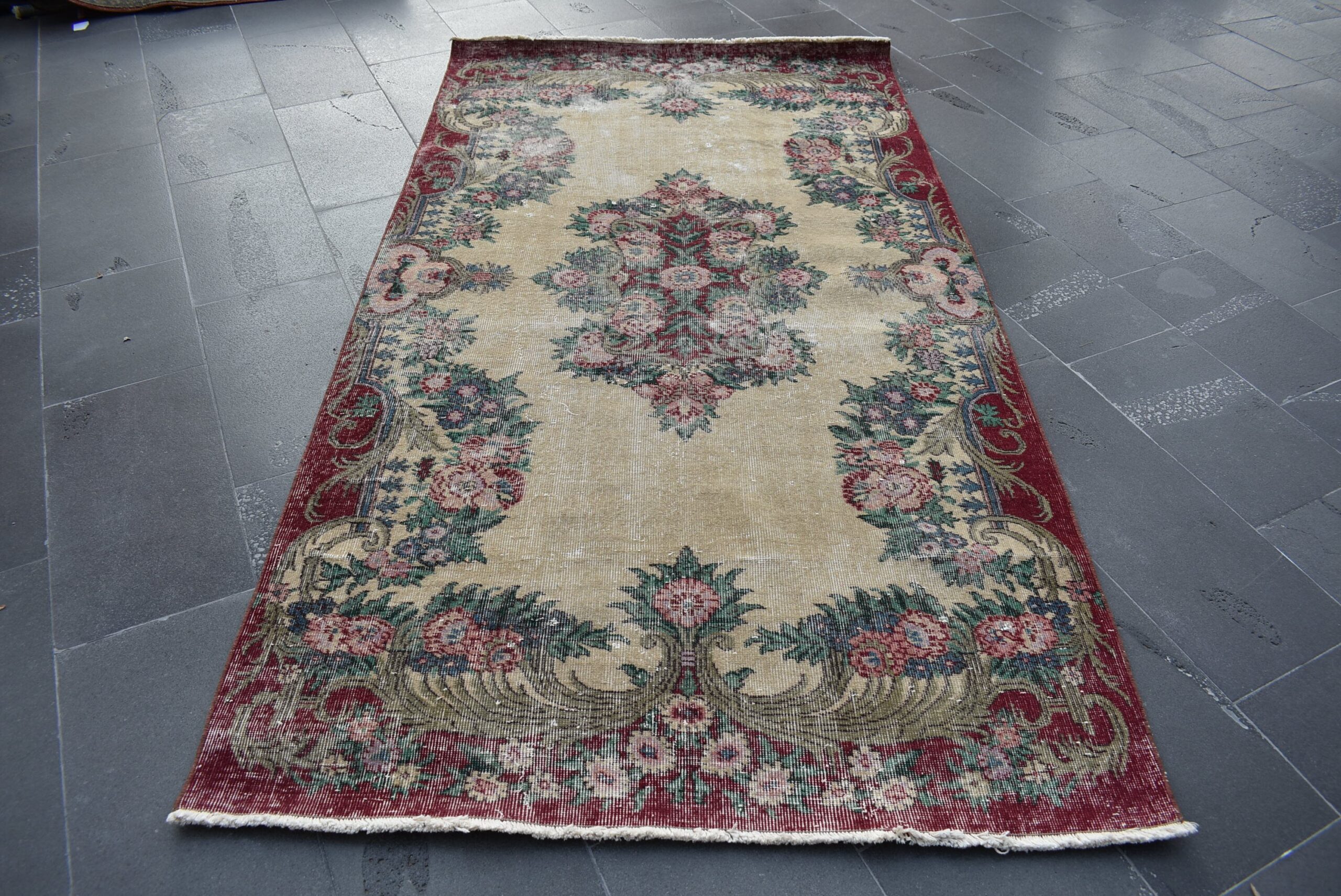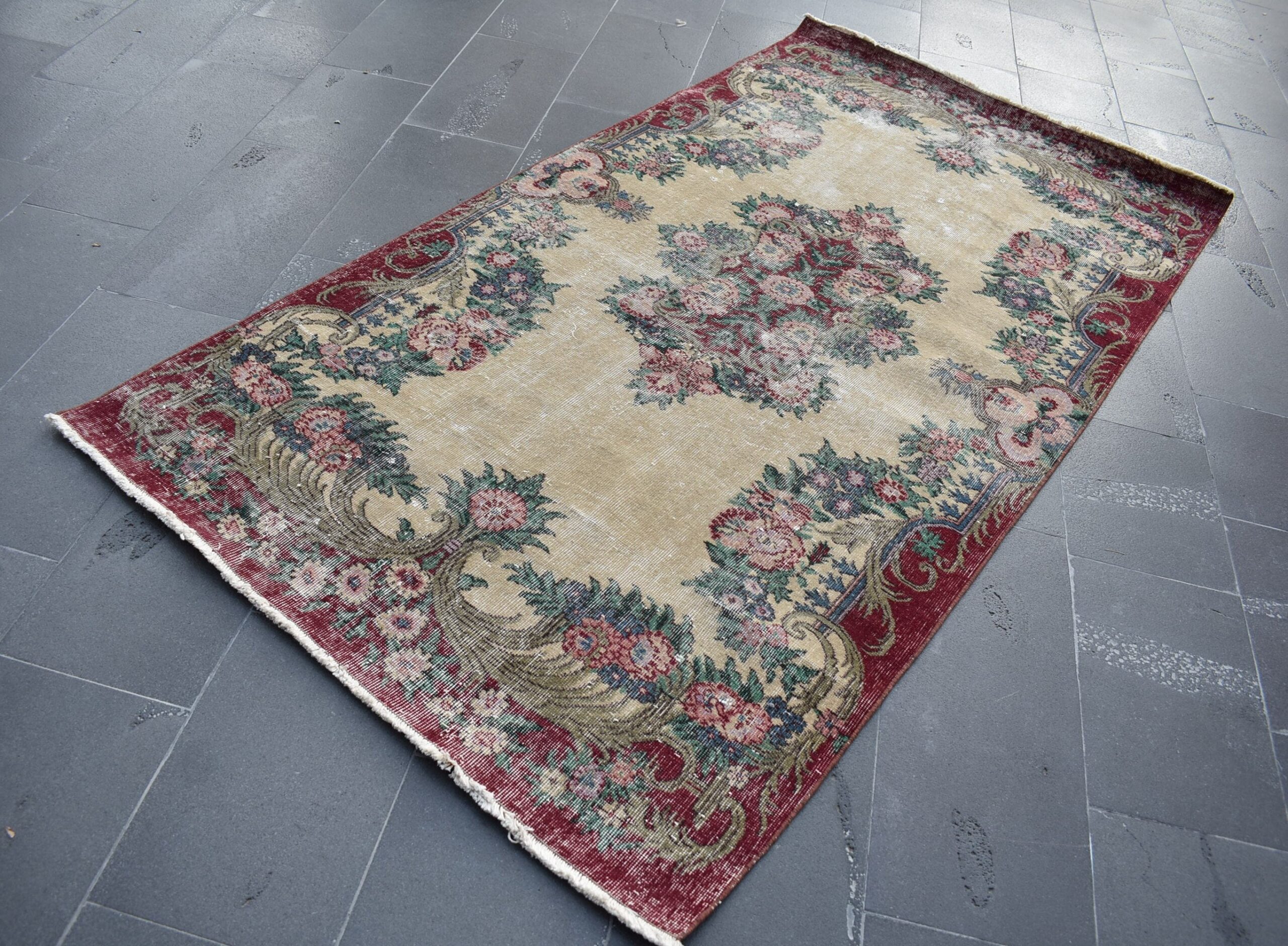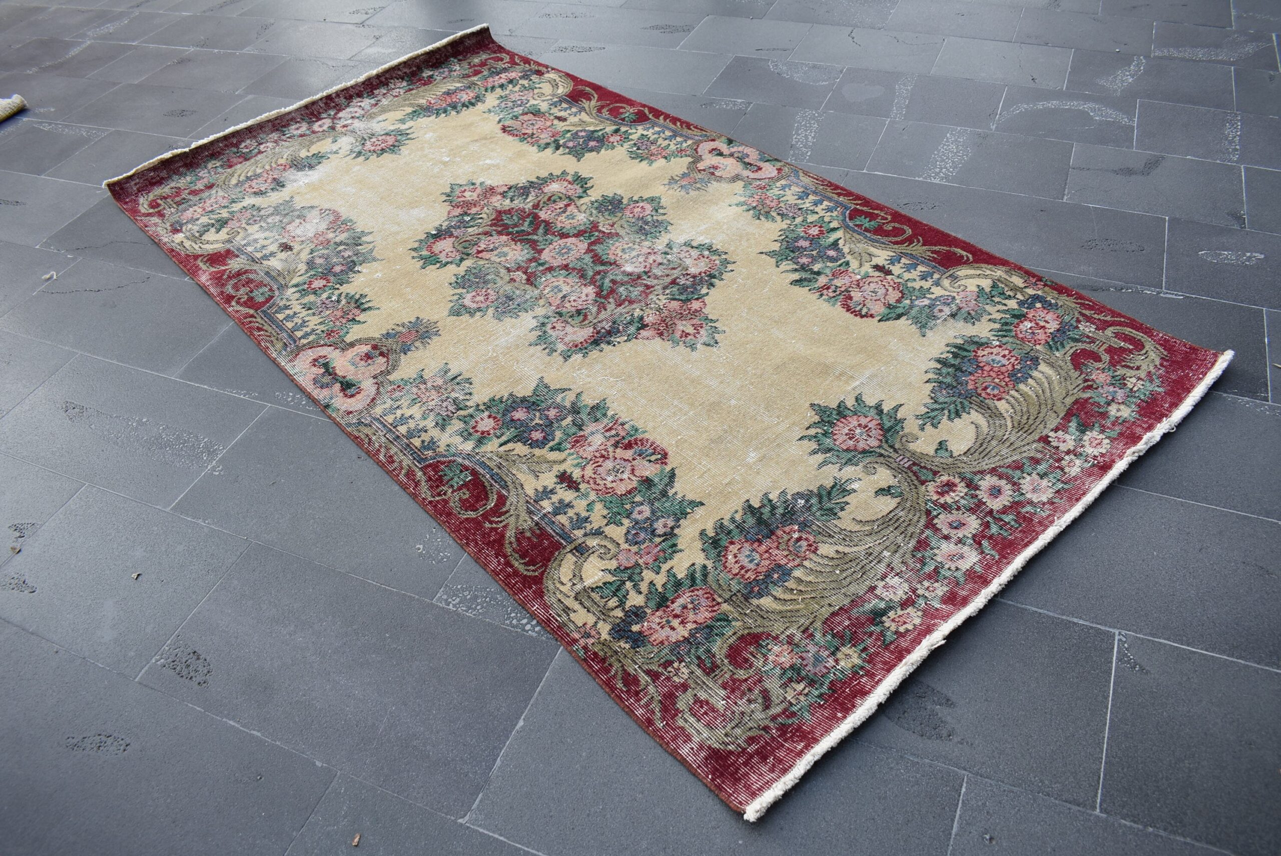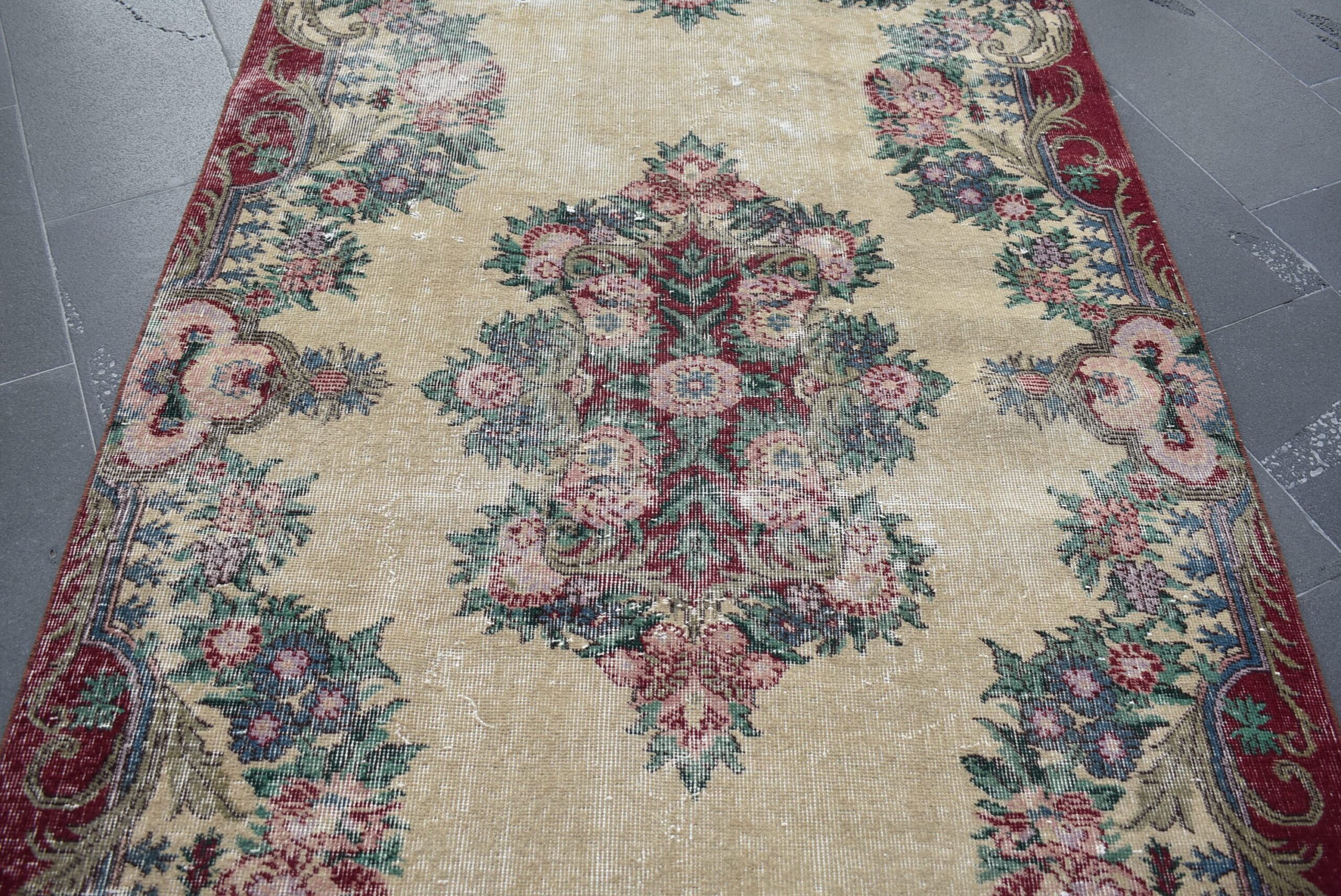 This is a vintage Turkish rug hand-knotted in a small village in Turkey by skilled Anatolian women during around the 1990s. It is made from natural wool (sheep) and dyed using all-natural (vegetable) dyes. Natural materials are more durable than synthetic materials guaranteeing a rug that can last for years while natural dyes provide colors that gets more beautiful as years pass by especially when in direct sunlight.