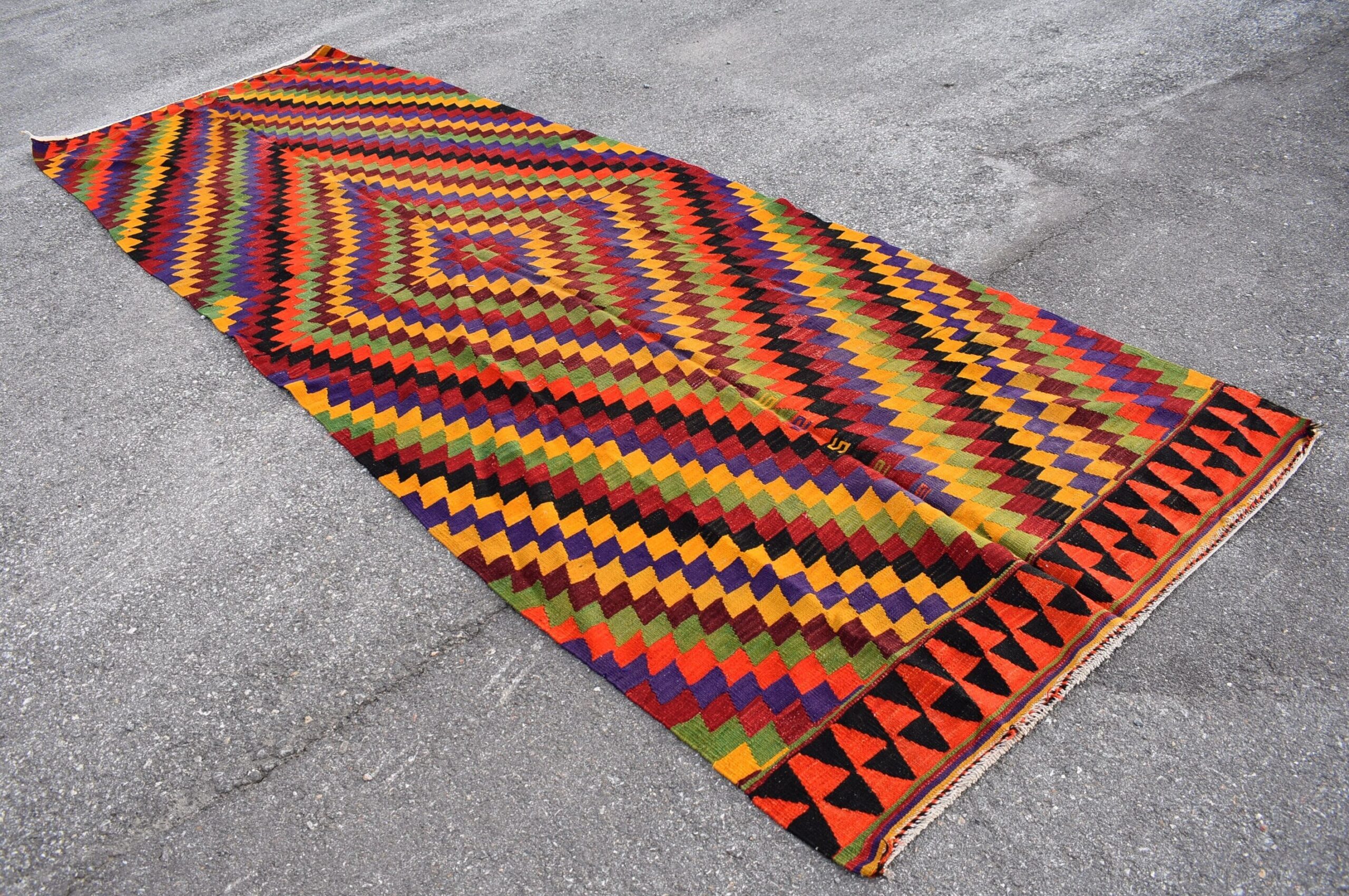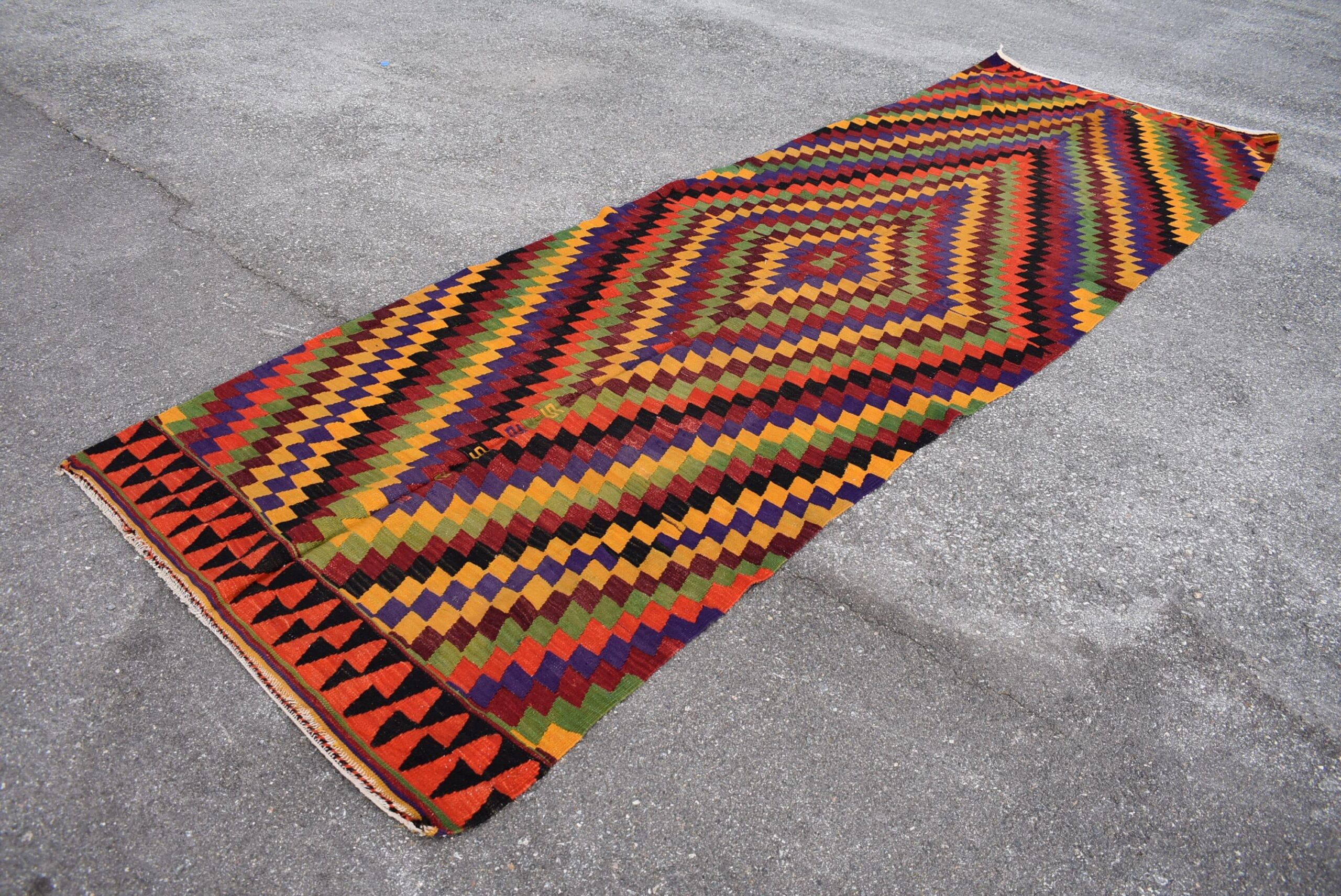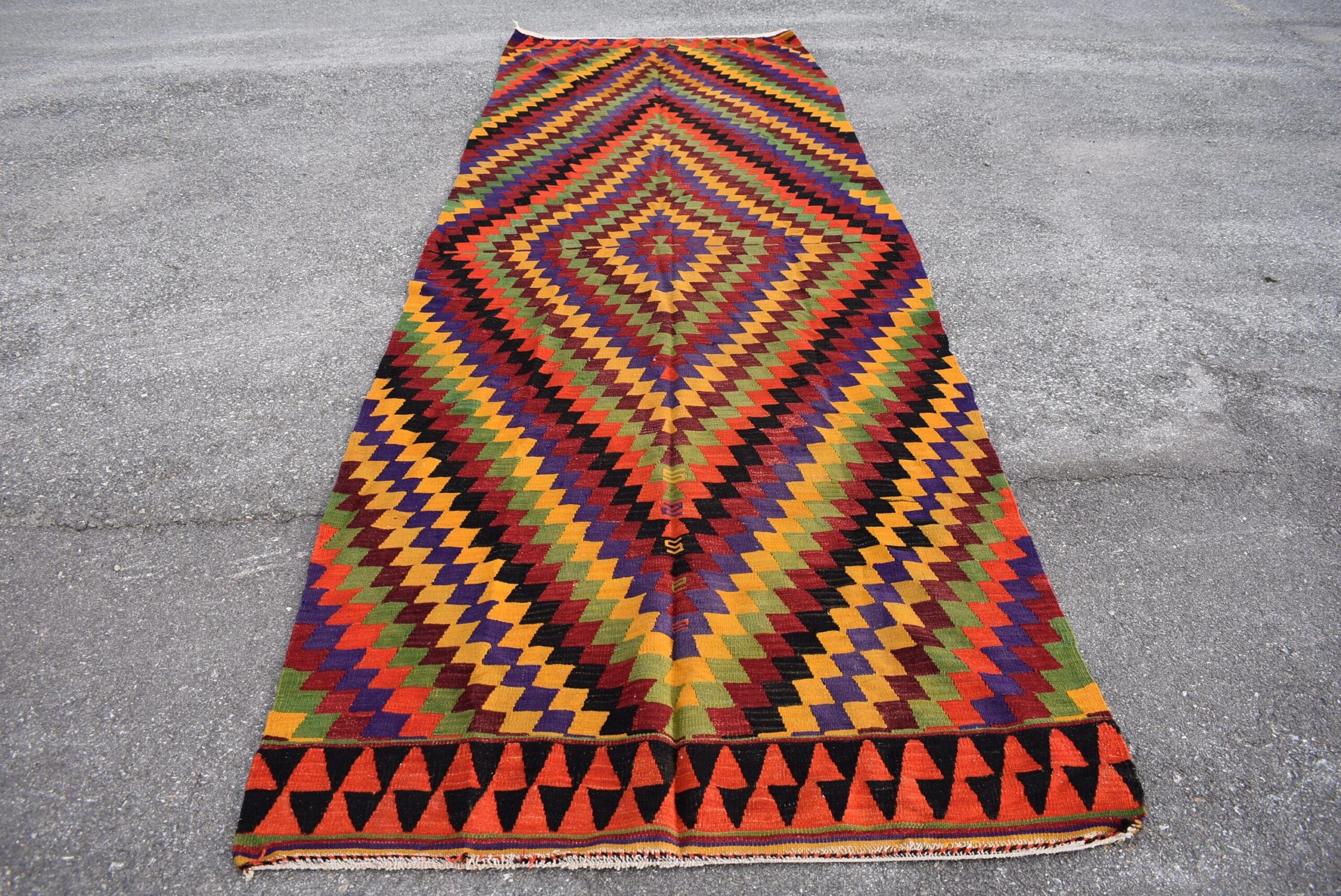 Lovely and unique 4.4 ft. x 13.2 ft. (134 cm x 403 cm) vintage kilim rug hand-woven in Turkey from organic wool. This is an authentic vintage kilim rug from the 1980s that has worn beautifully to perfection.