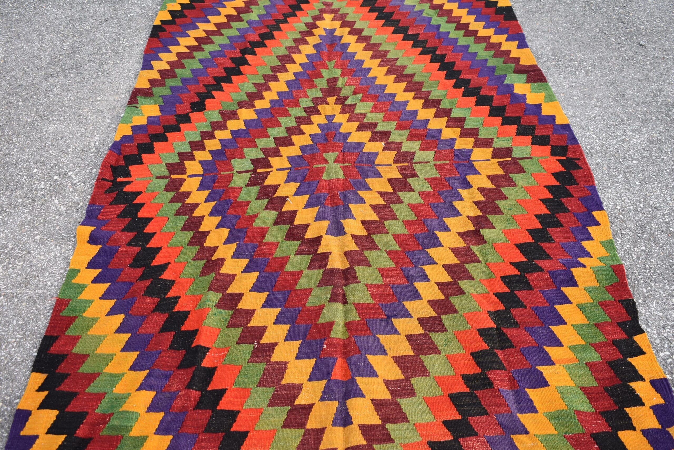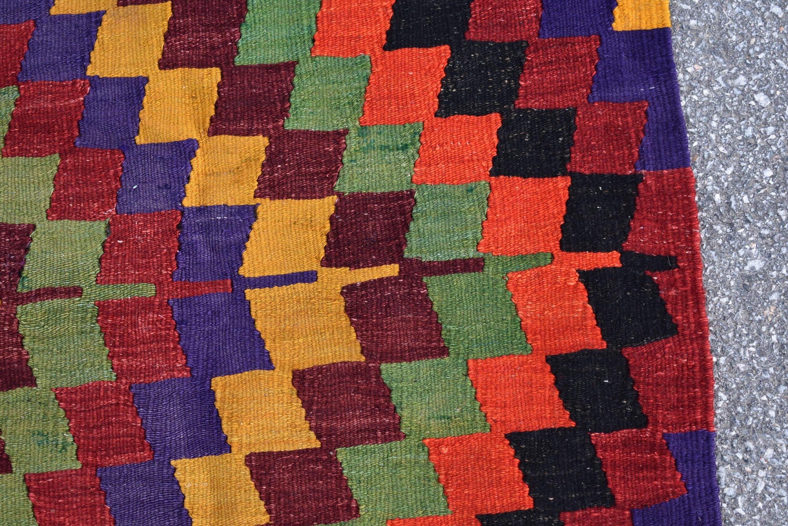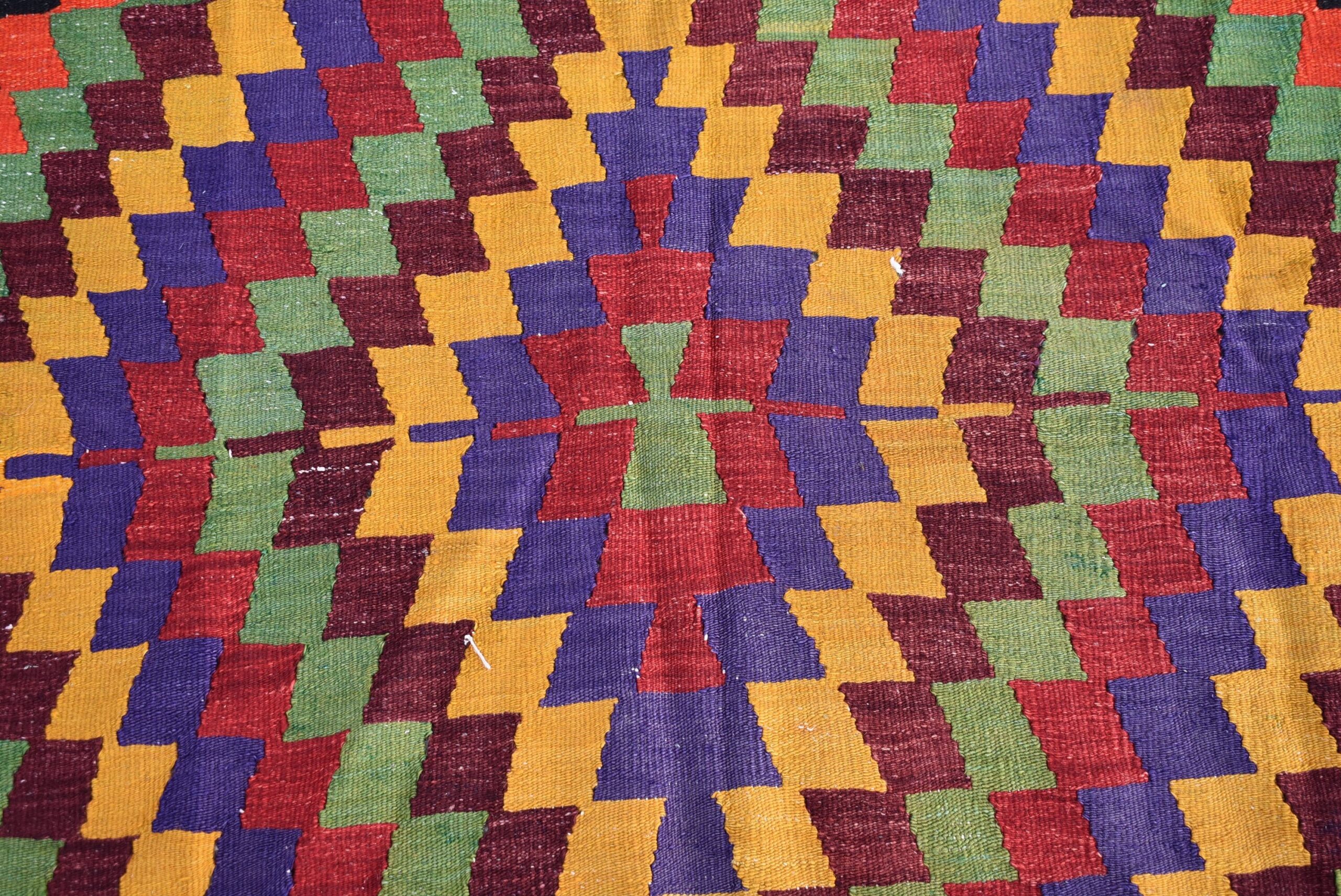 This is a vintage kilim rug hand-woven in a small village in Turkey by skilled Anatolian women during around the 1980s. It is made from natural wool (sheep) and dyed using all-natural (vegetable) dyes. Natural materials are more durable than synthetic materials guaranteeing a rug that can last for years while natural dyes provide colors that gets more beautiful as years pass by especially when in direct sunlight.