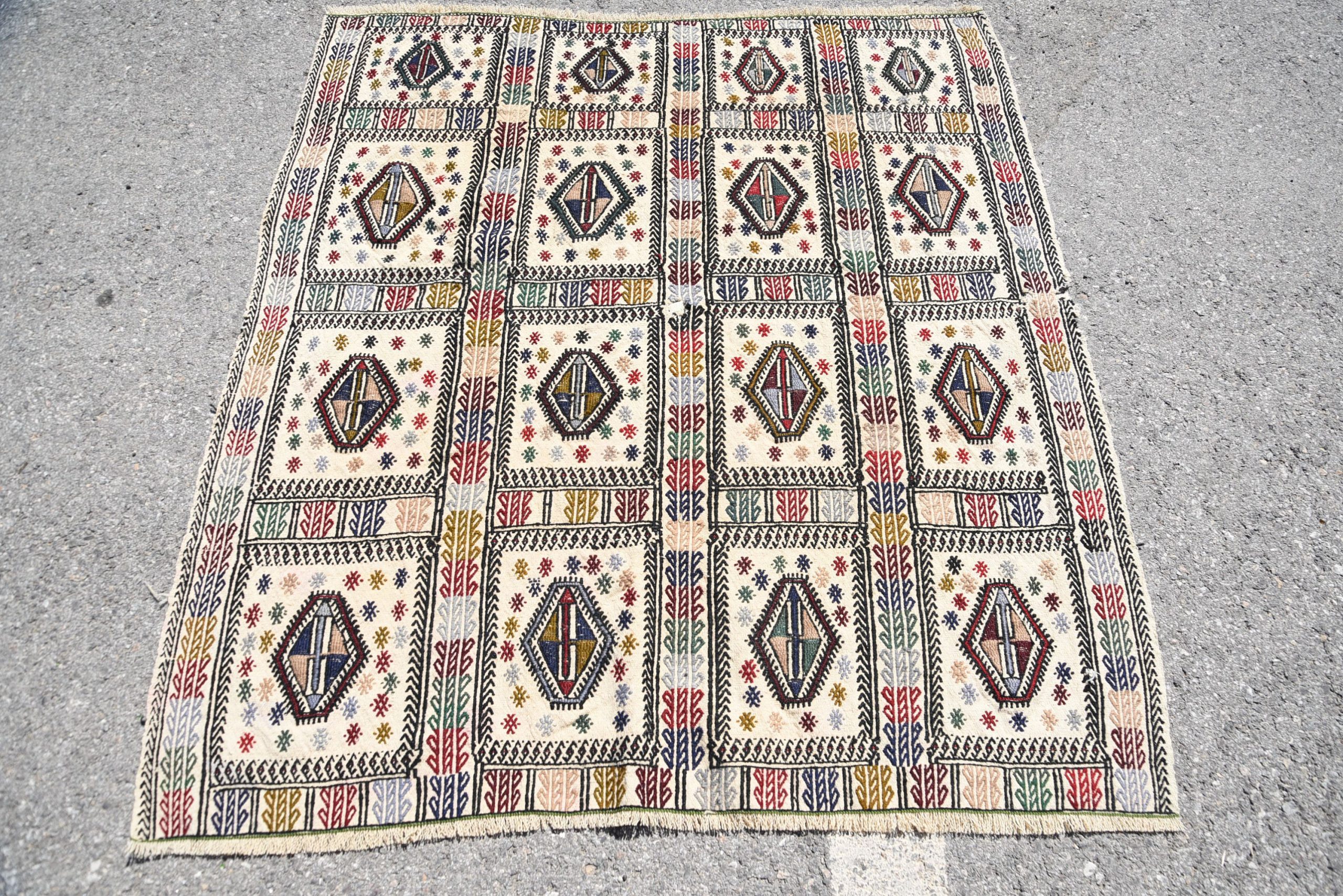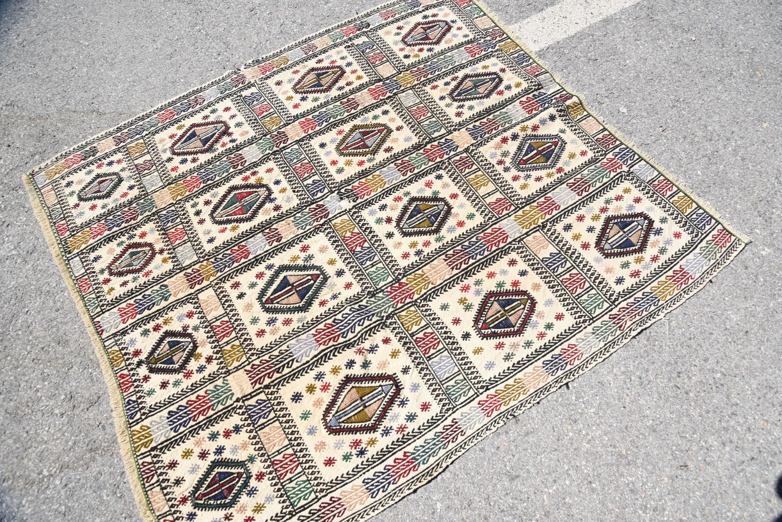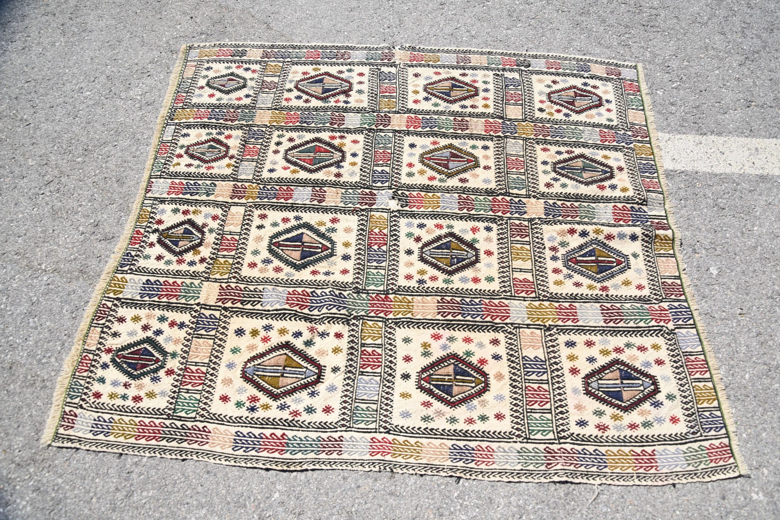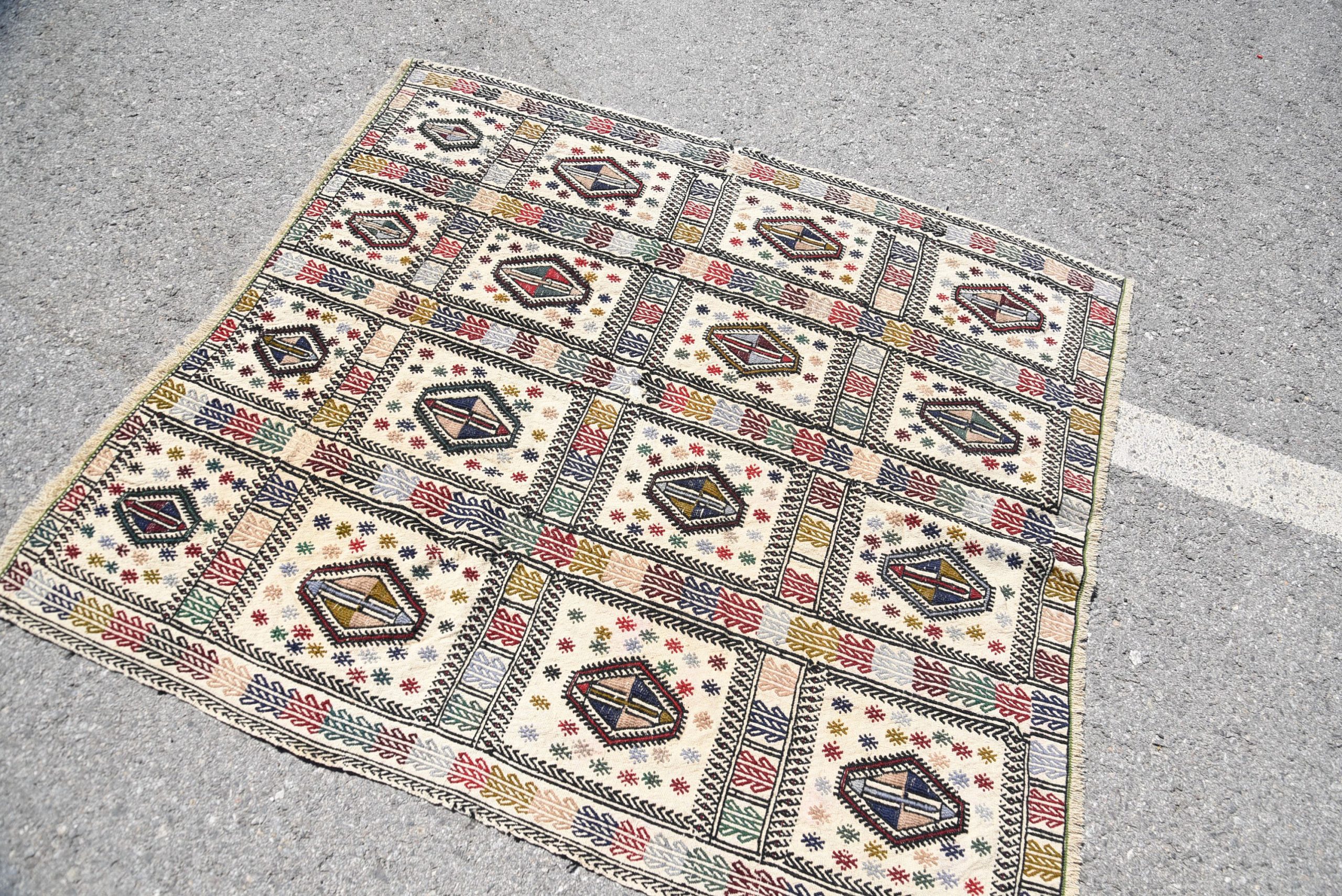 Lovely and unique 4.4 ft. x 4.8 ft. (133 cm x 146 cm) vintage kilim rug hand-woven in Turkey from organic wool. This is an authentic vintage kilim rug from the 1970s that has worn beautifully to perfection.