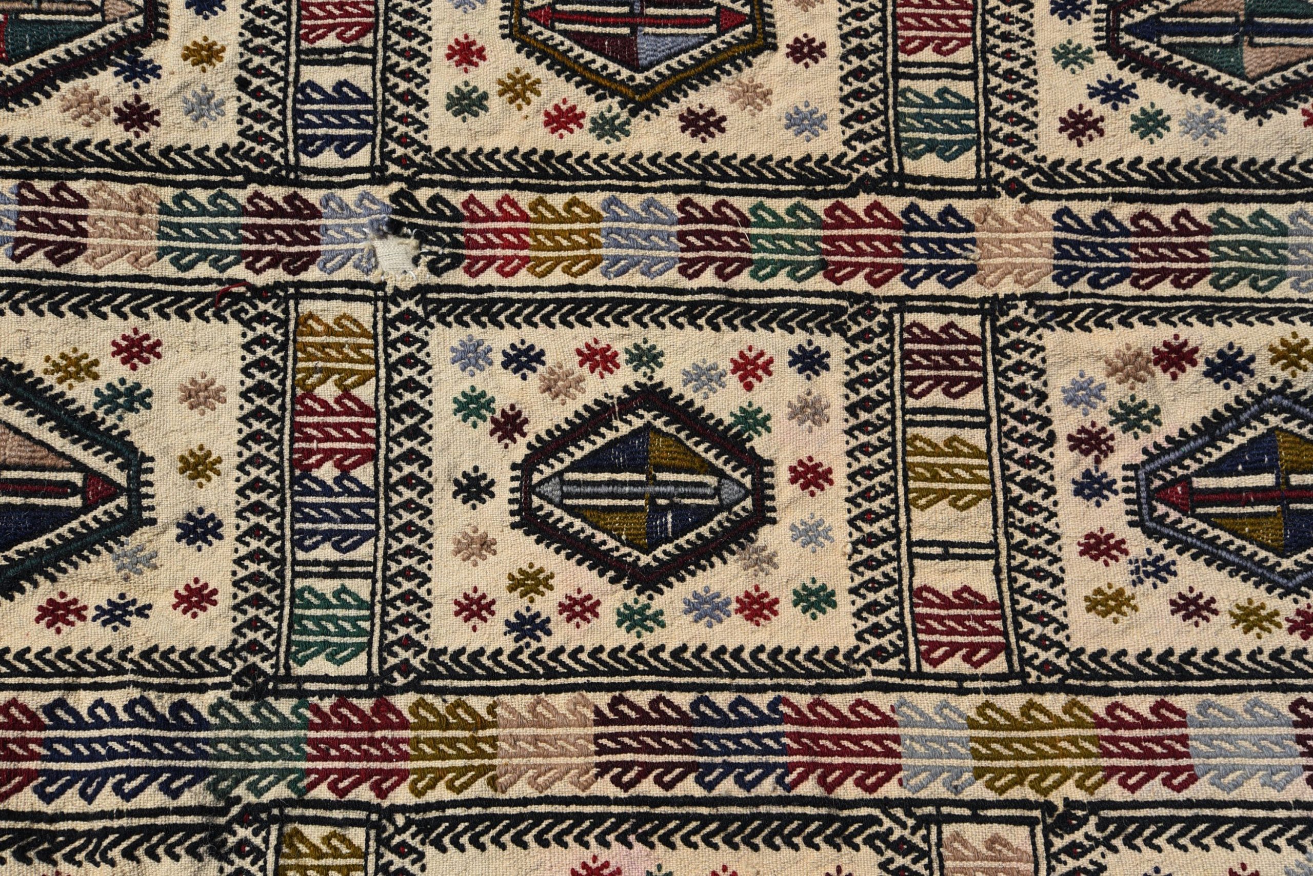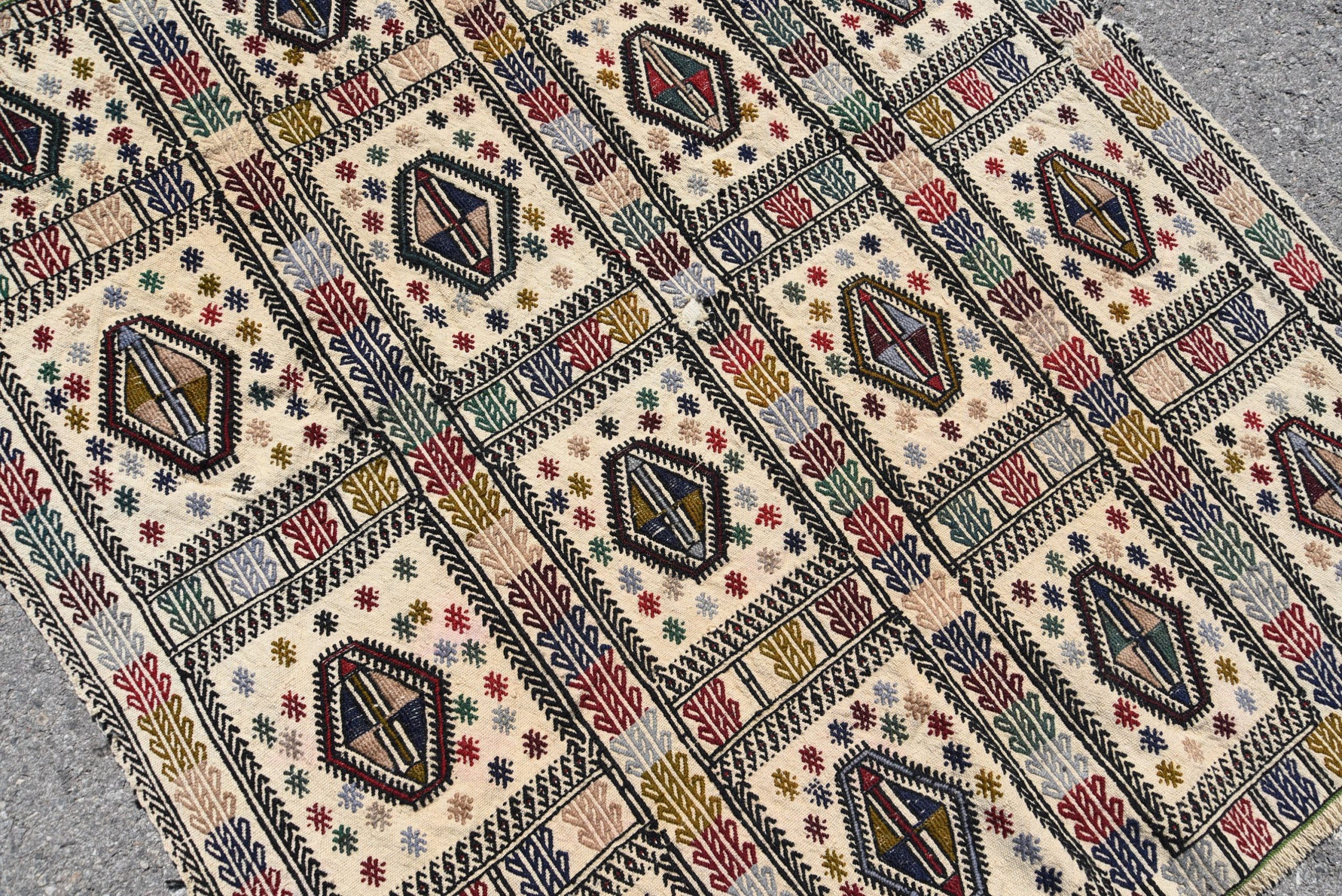 This is a vintage kilim rug hand-woven in a small village in Turkey by skilled Anatolian women during around the 1970s. It is made from natural wool (sheep) and dyed using all-natural (vegetable) dyes. Natural materials are more durable than synthetic materials guaranteeing a rug that can last for years while natural dyes provide colors that gets more beautiful as years pass by especially when in direct sunlight.
