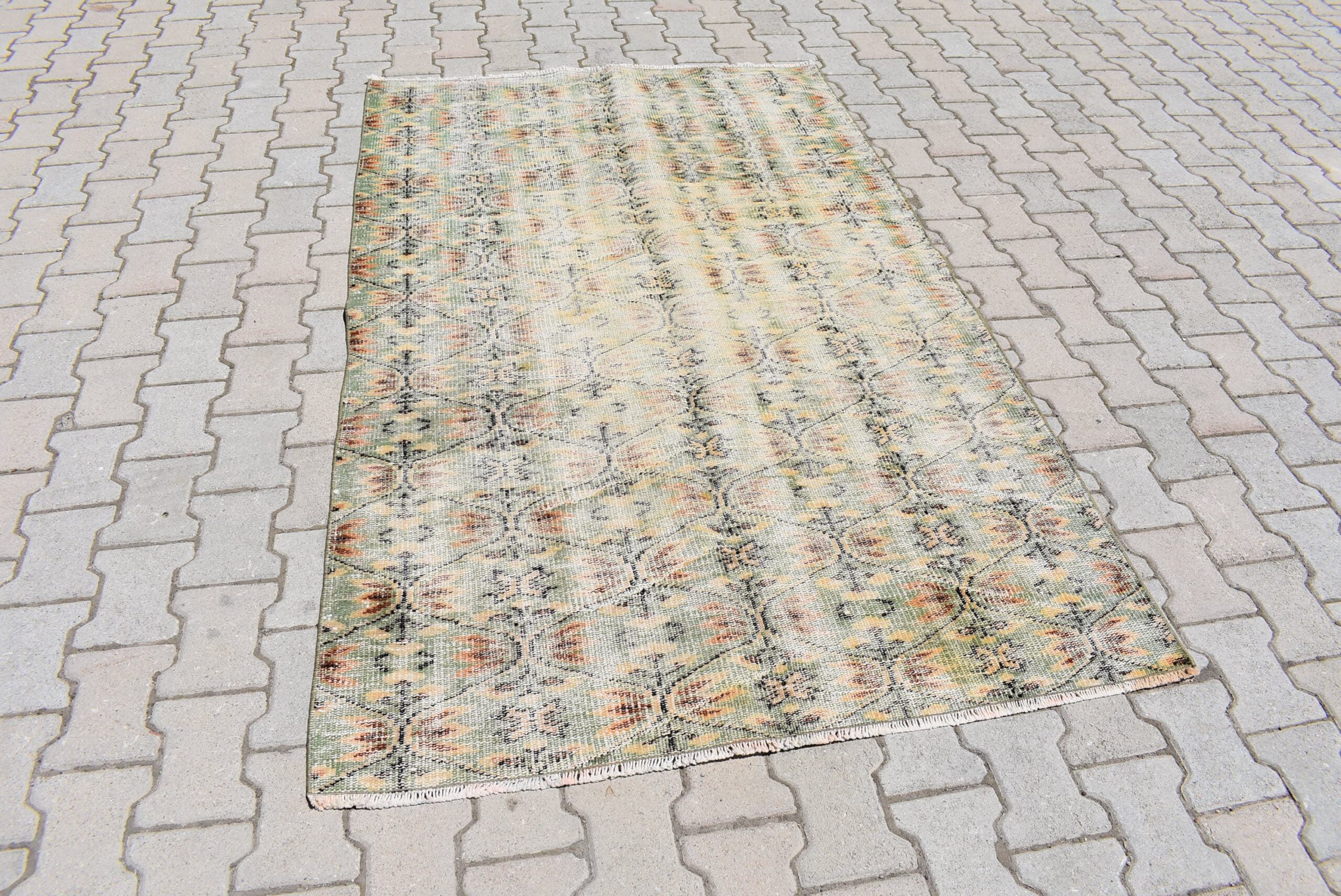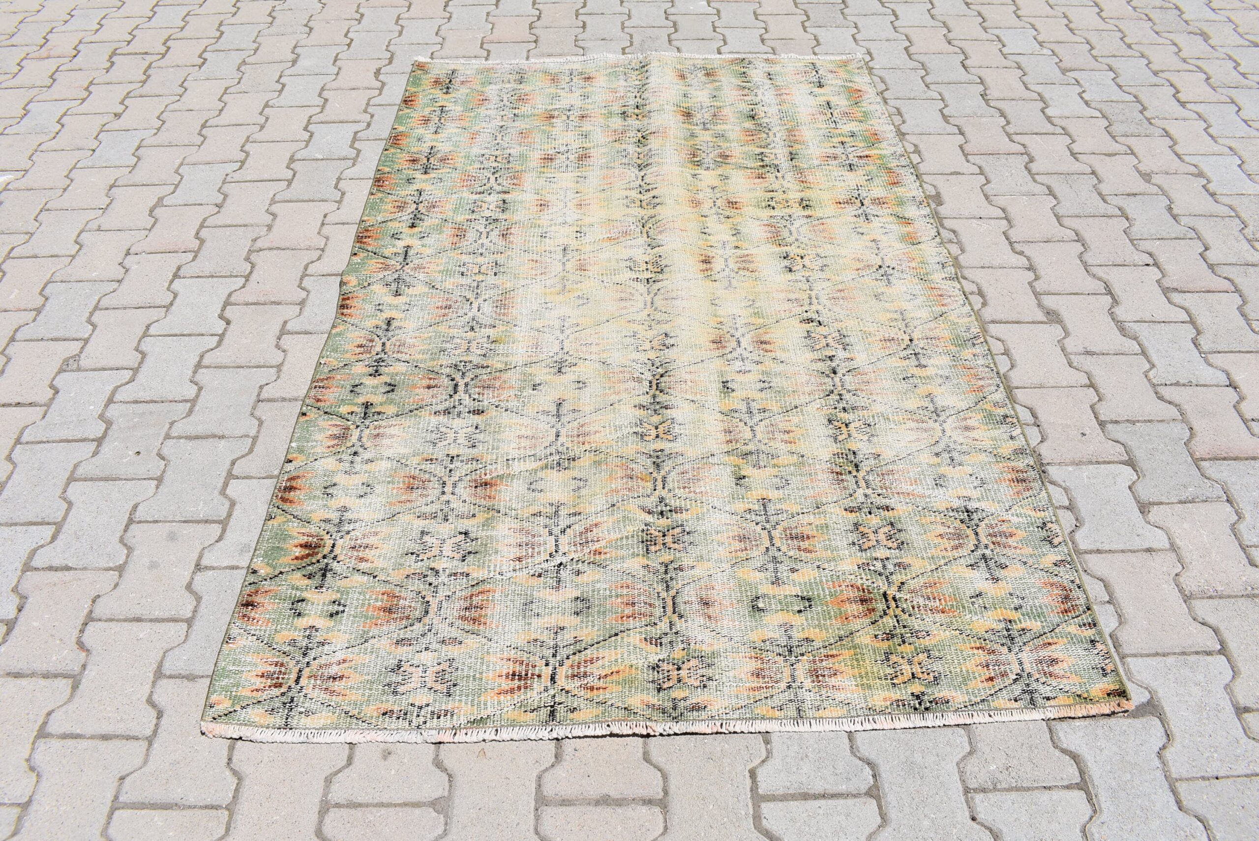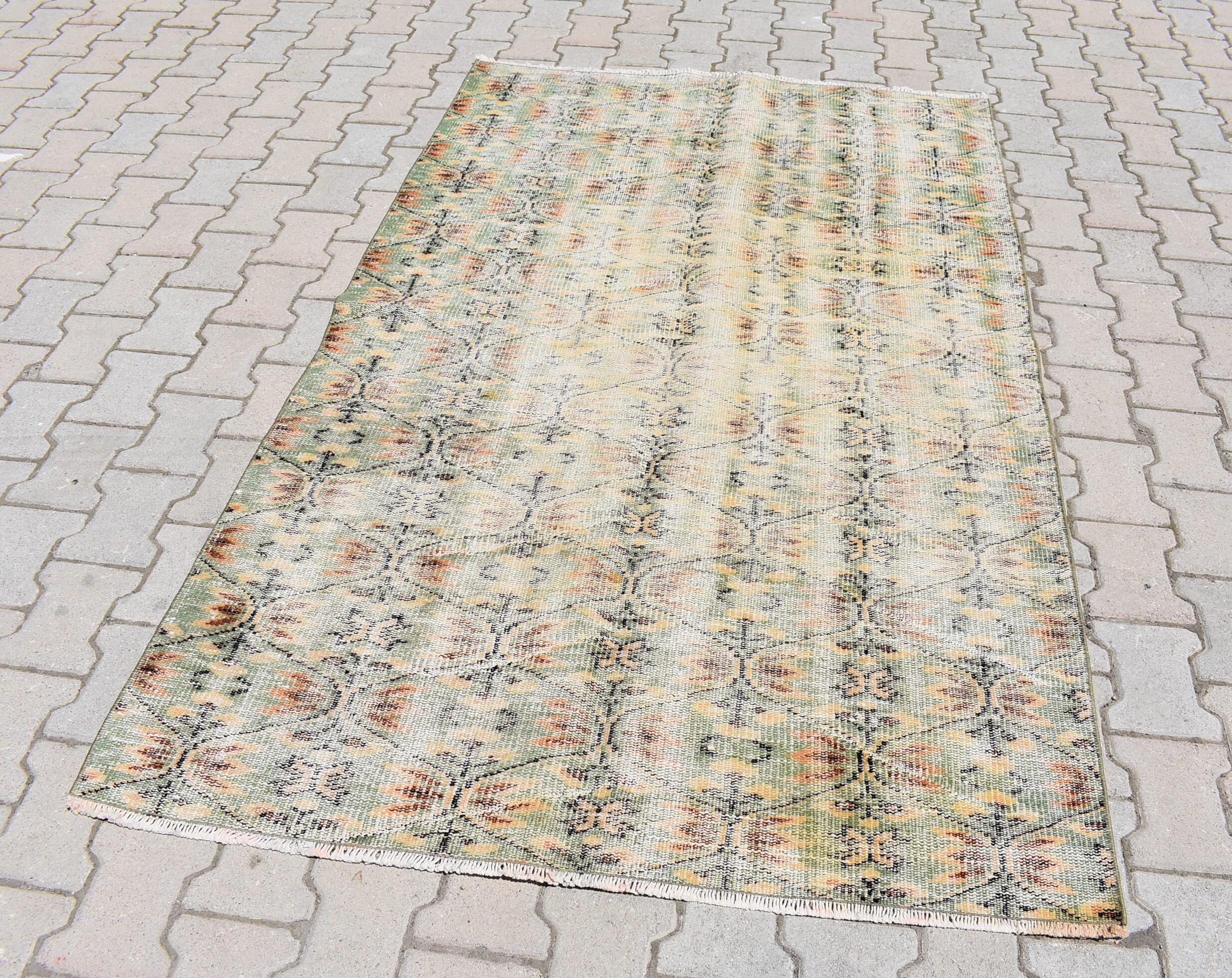 This is a vintage Turkish rug hand-knotted in a small village in Turkey by skilled Anatolian women during around the 1970s. It is made from natural wool (sheep) and dyed using all-natural (vegetable) dyes. Natural materials are more durable than synthetic materials guaranteeing a rug that can last for years while natural dyes provide colors that gets more beautiful as years pass by especially when in direct sunlight.