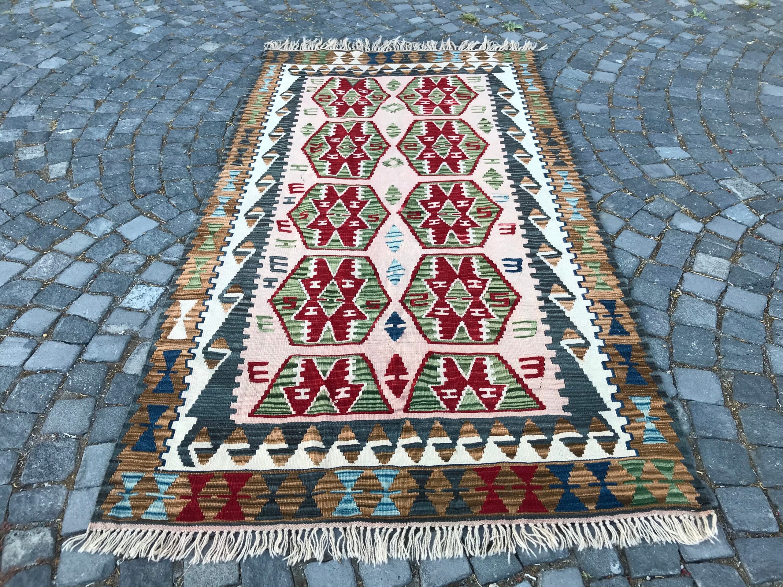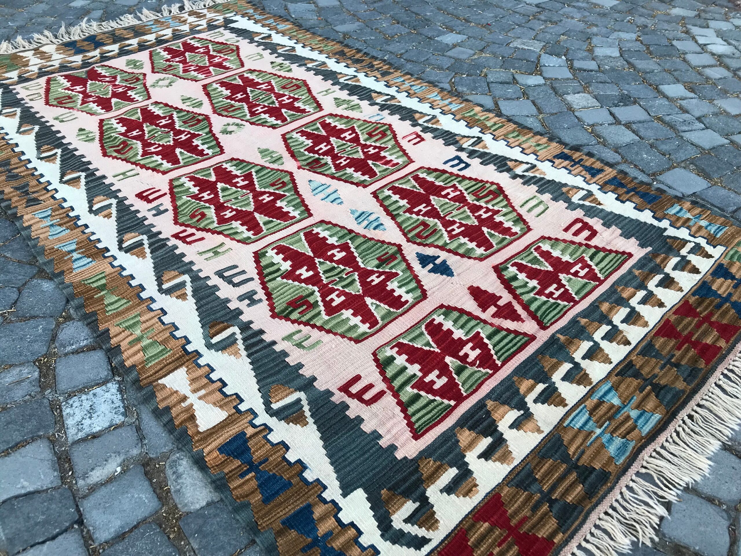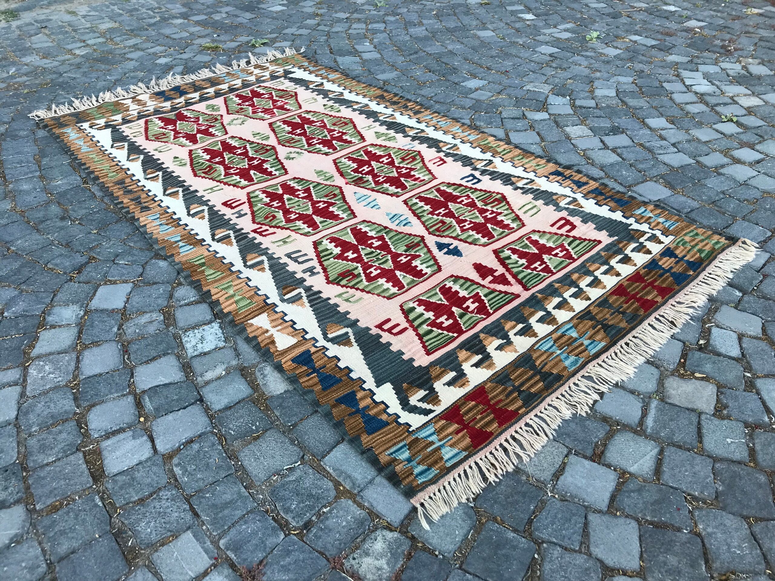 This is a vintage kilim rug hand-woven in a small village in Turkey by skilled Anatolian women during around the 1980s. It is made from natural wool (sheep) and dyed using all-natural (vegetable) dyes. Natural materials are more durable than synthetic materials guaranteeing a rug that can last for years while natural dyes provide colors that gets more beautiful as years pass by especially when in direct sunlight.