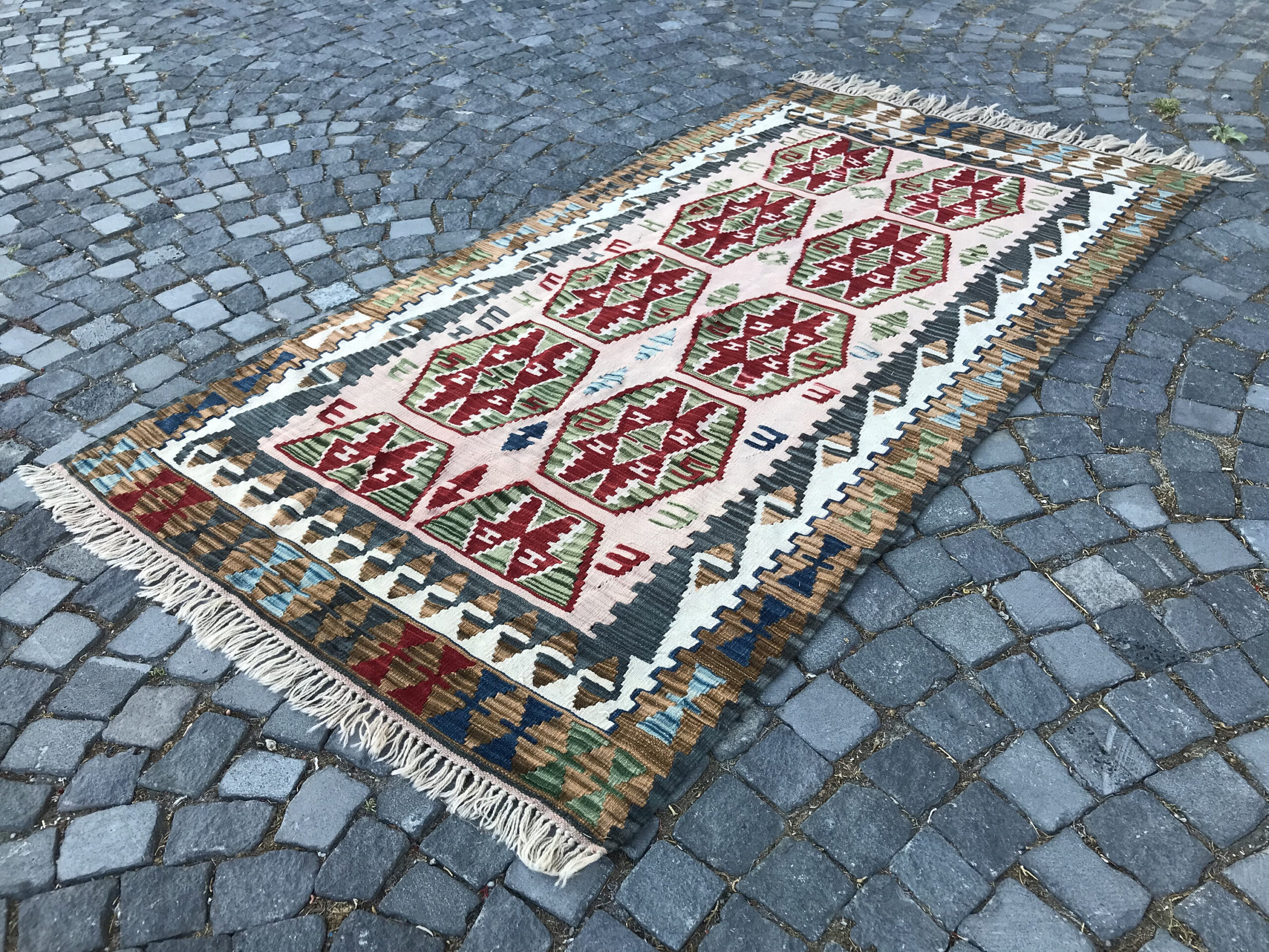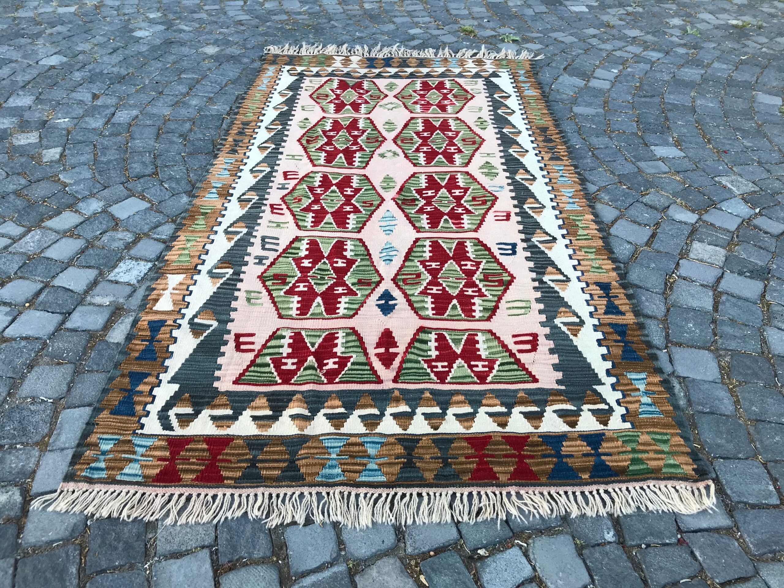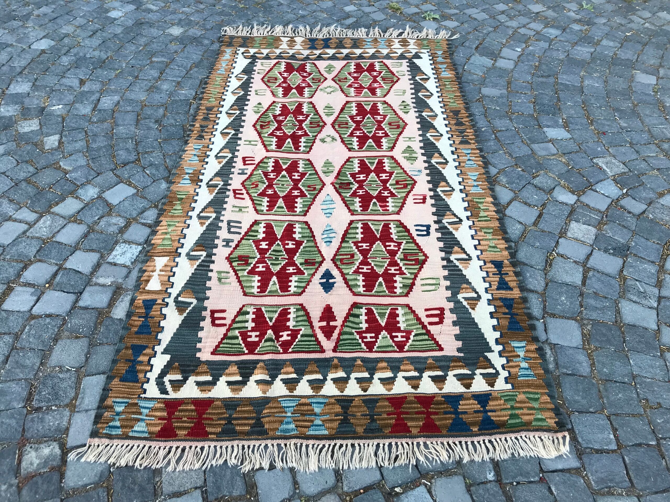 This is a vintage kilim rug hand-woven in a small village in Turkey by skilled Anatolian women during around the 1980s. It is made from natural wool (sheep) and dyed using all-natural (vegetable) dyes. Natural materials are more durable than synthetic materials guaranteeing a rug that can last for years while natural dyes provide colors that gets more beautiful as years pass by especially when in direct sunlight.
