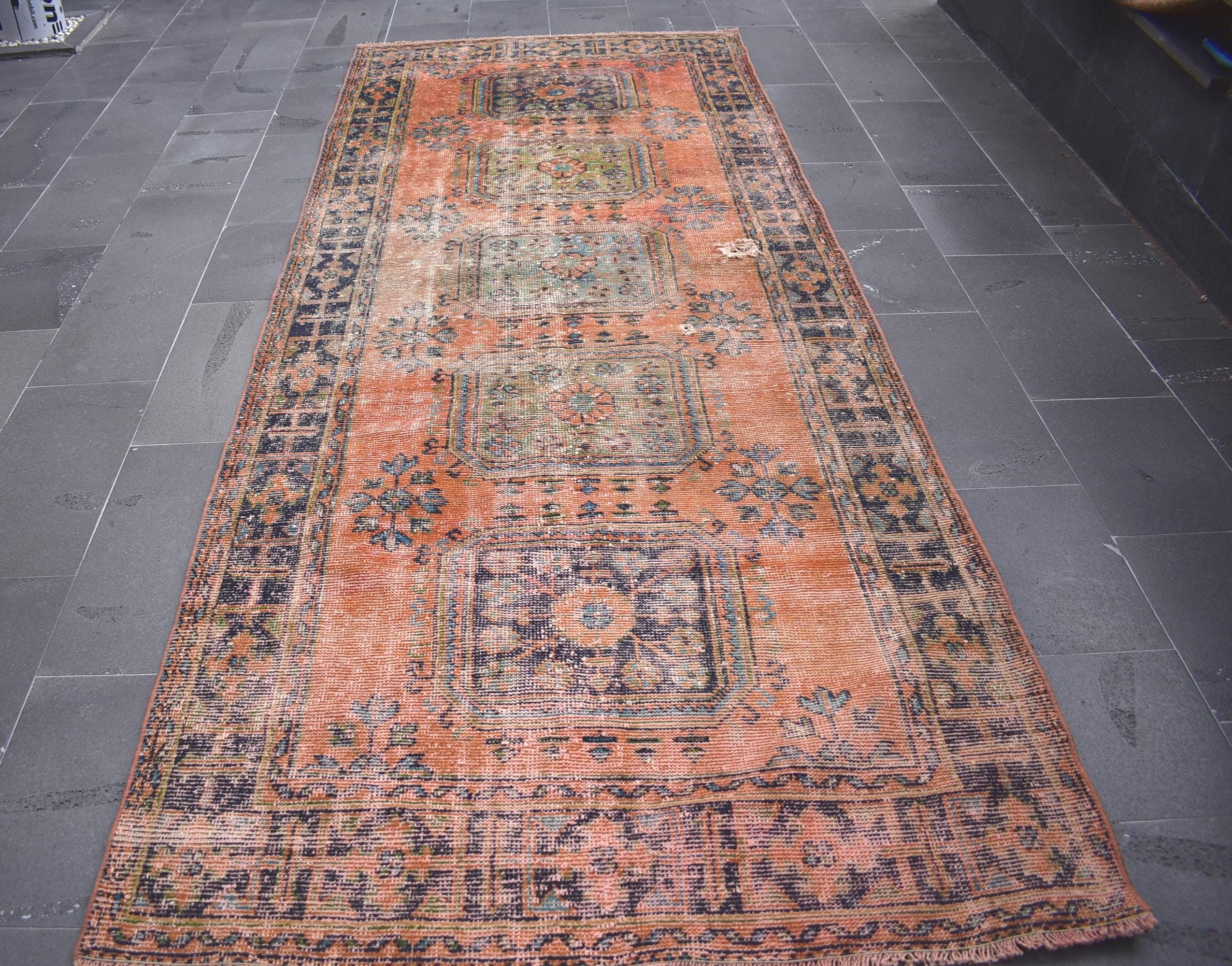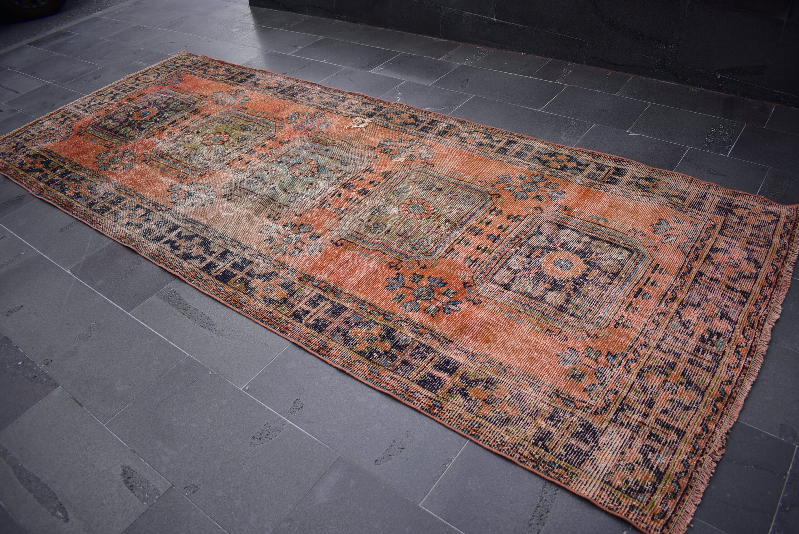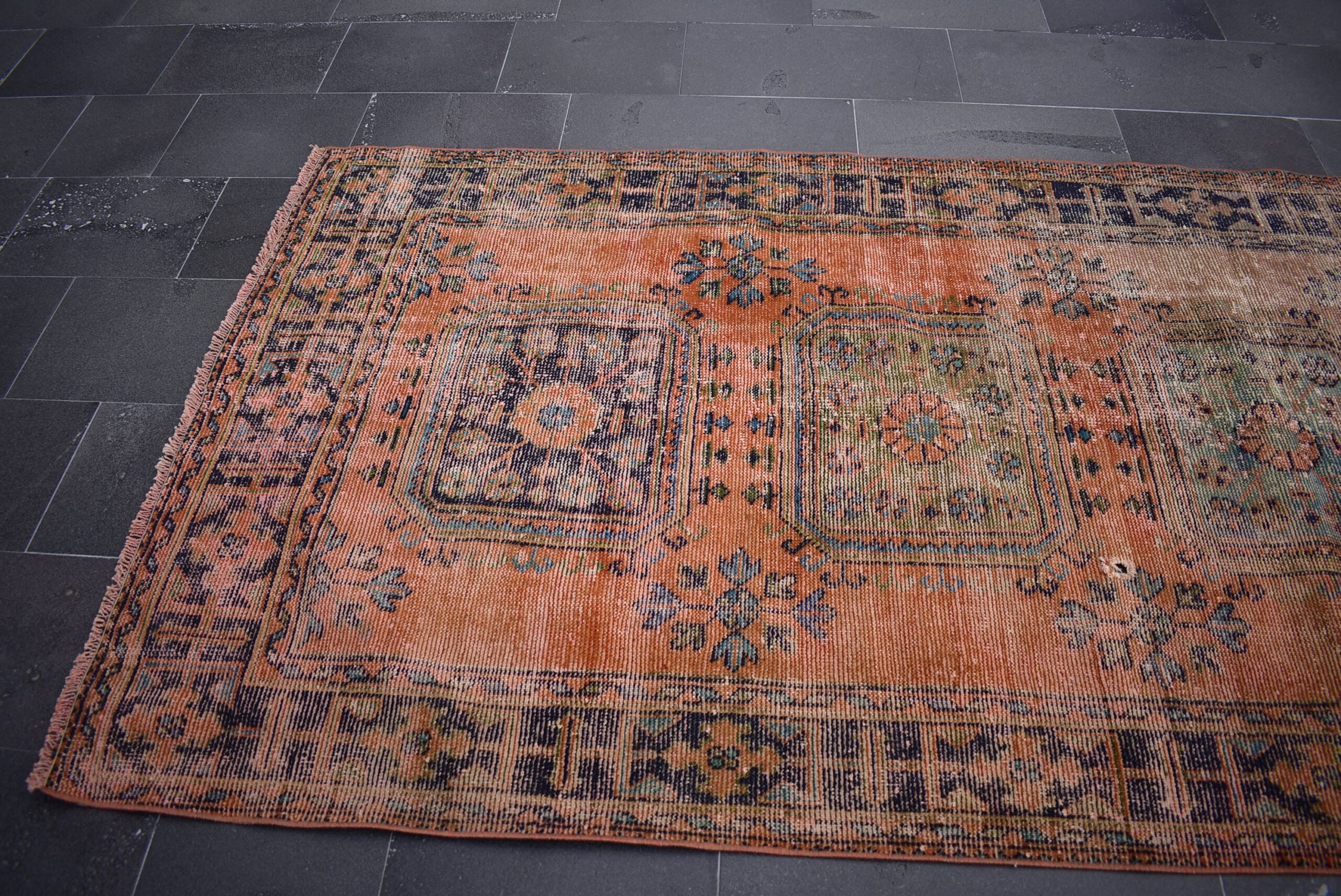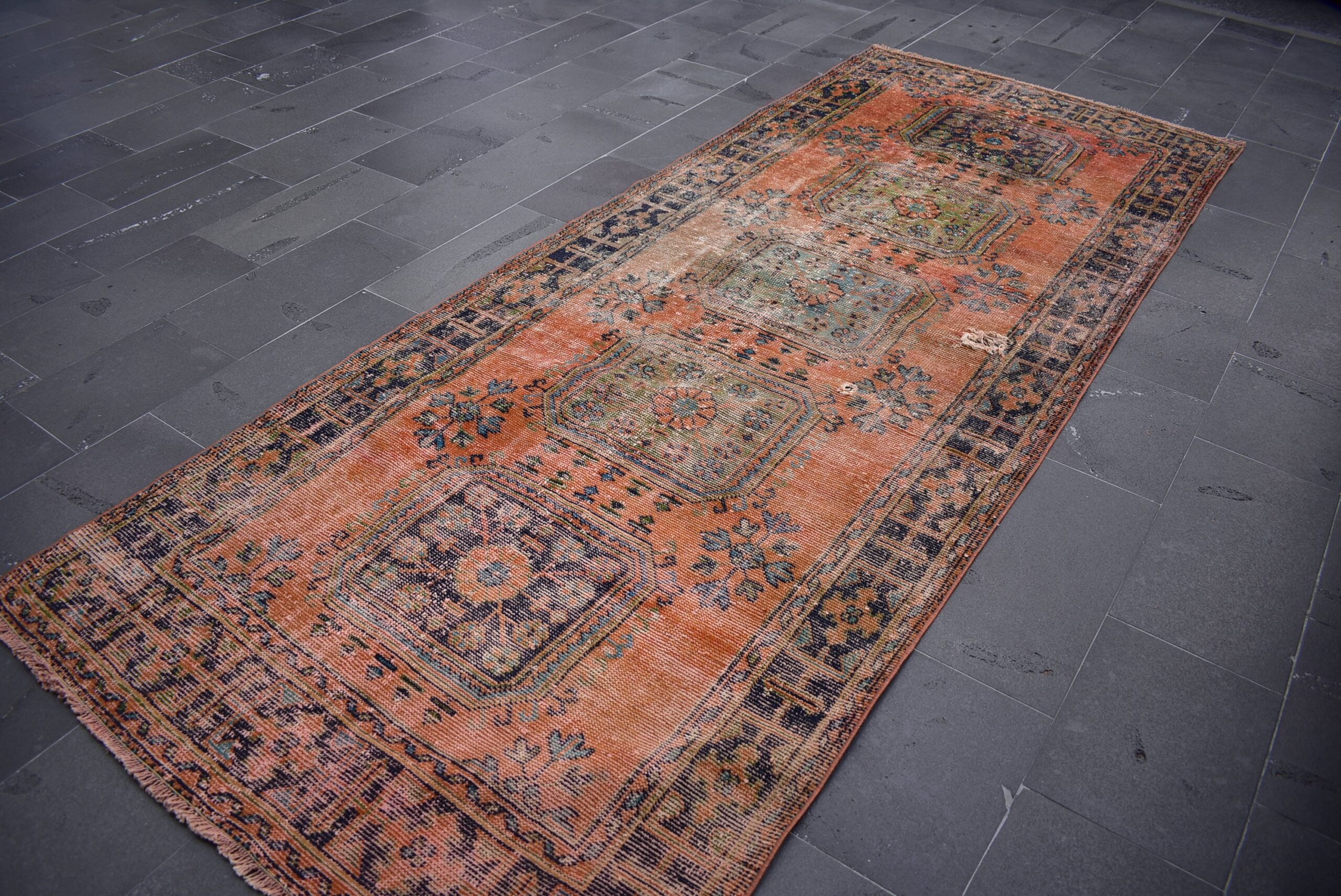 Lovely and unique 4.5 ft. x 11.3 ft. (137 cm x 344 cm) vintage Turkish rug hand-knotted in Turkey from organic wool. This is an authentic vintage Turkish rug from the 1970s that has worn beautifully to perfection.