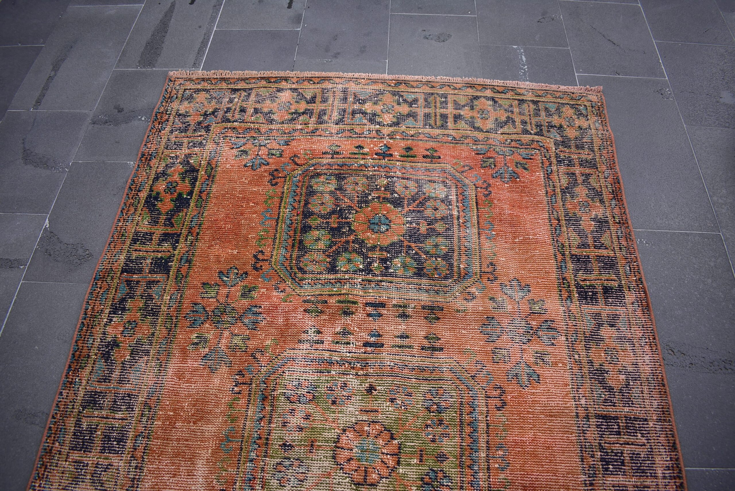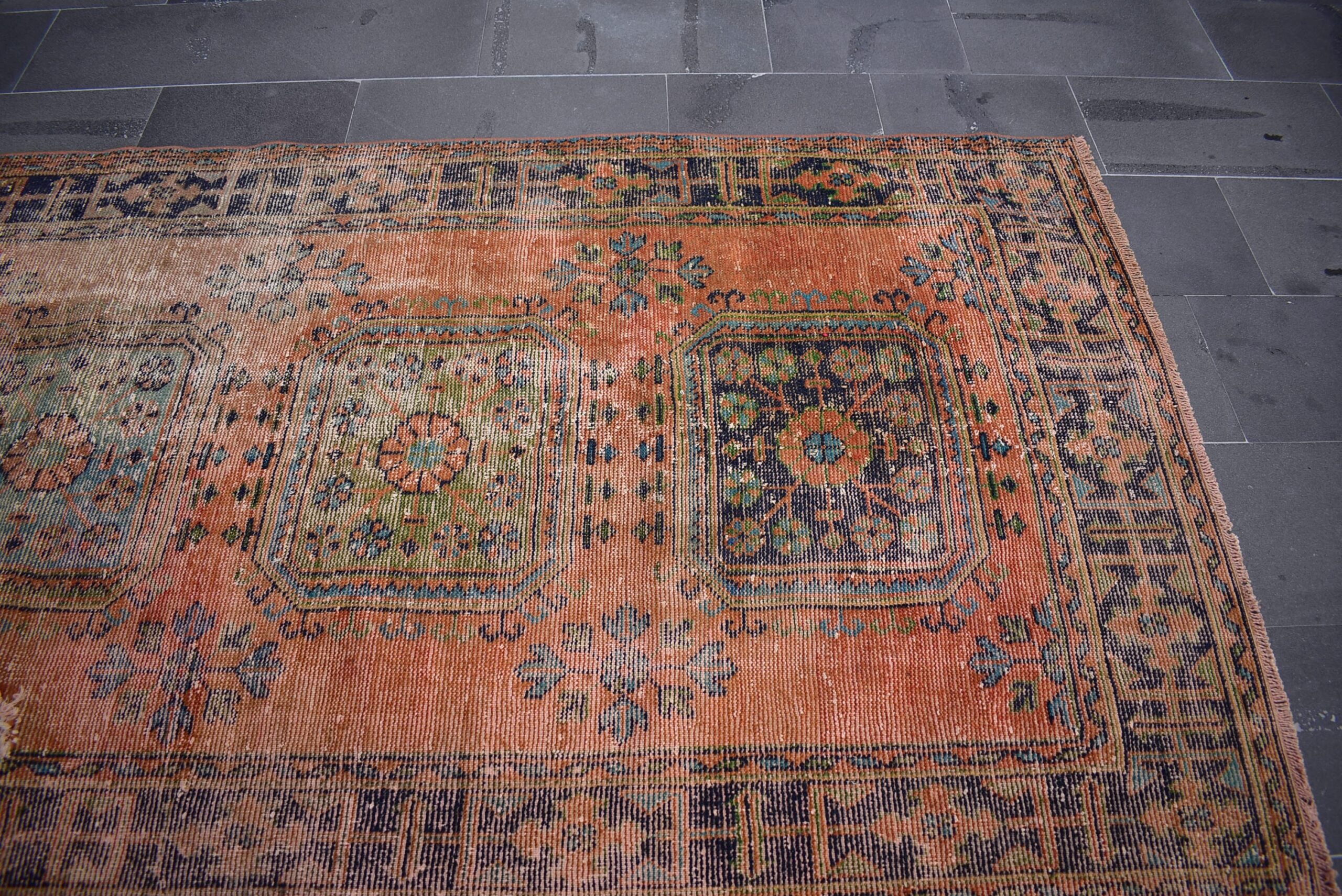 This is a vintage Turkish rug hand-knotted in a small village in Turkey by skilled Anatolian women during around the 1970s. It is made from natural wool (sheep) and dyed using all-natural (vegetable) dyes. Natural materials are more durable than synthetic materials guaranteeing a rug that can last for years while natural dyes provide colors that gets more beautiful as years pass by especially when in direct sunlight.