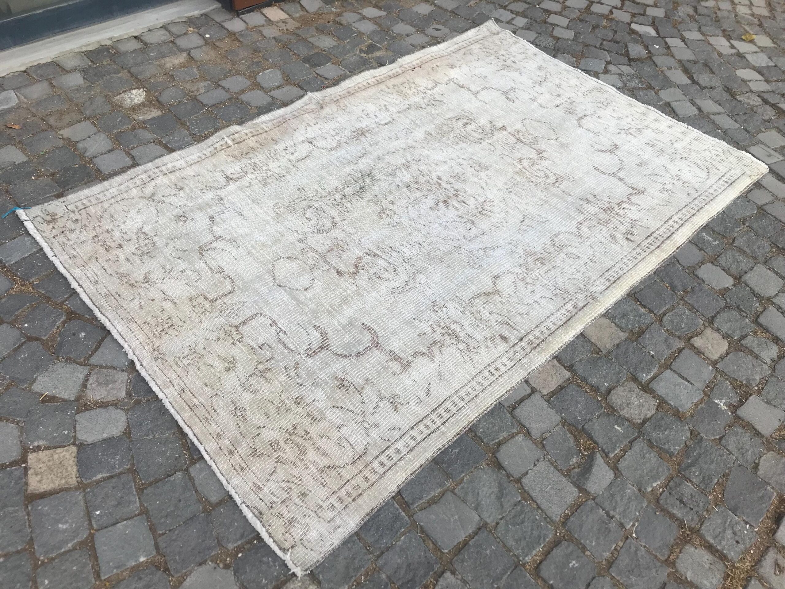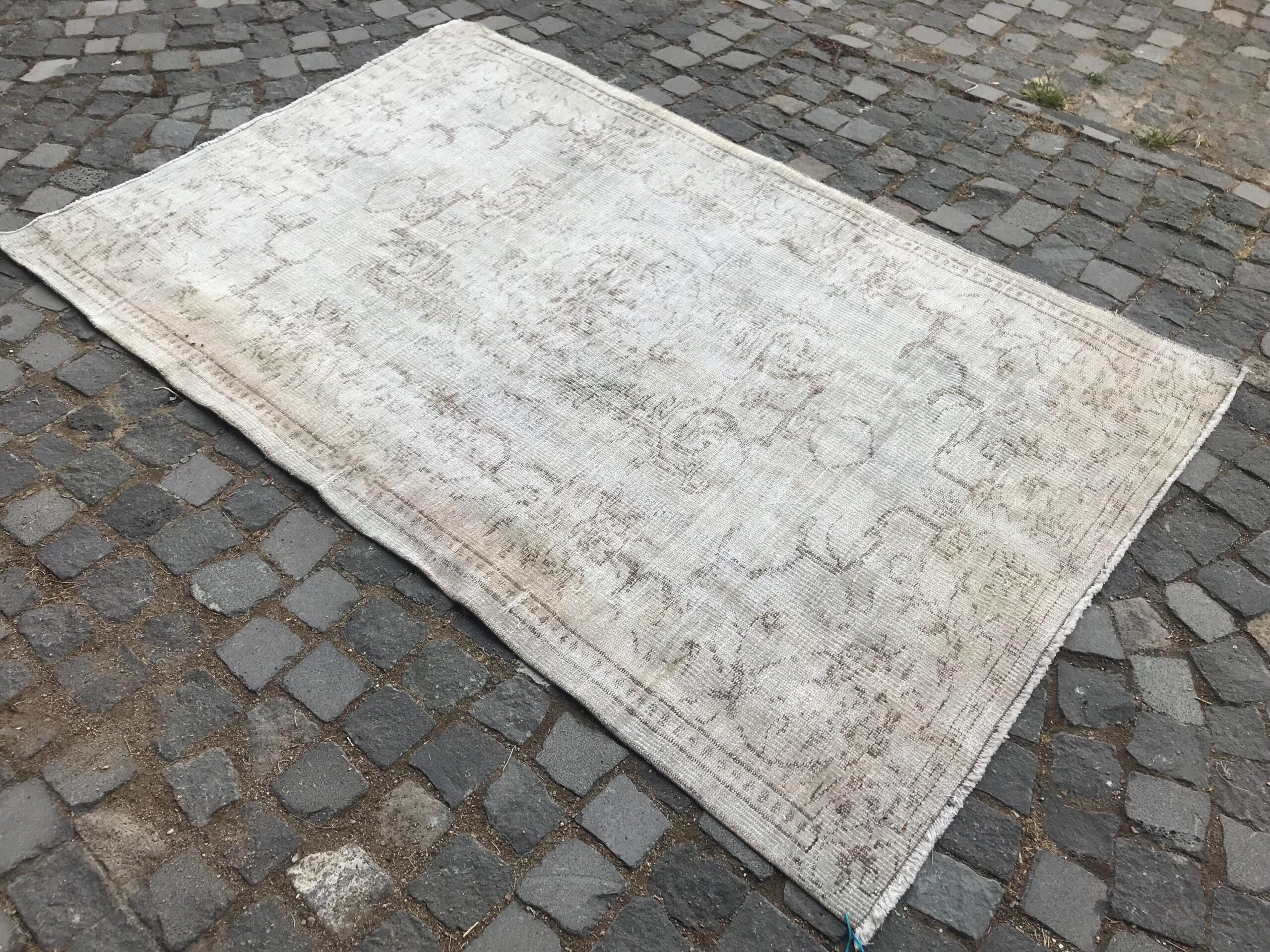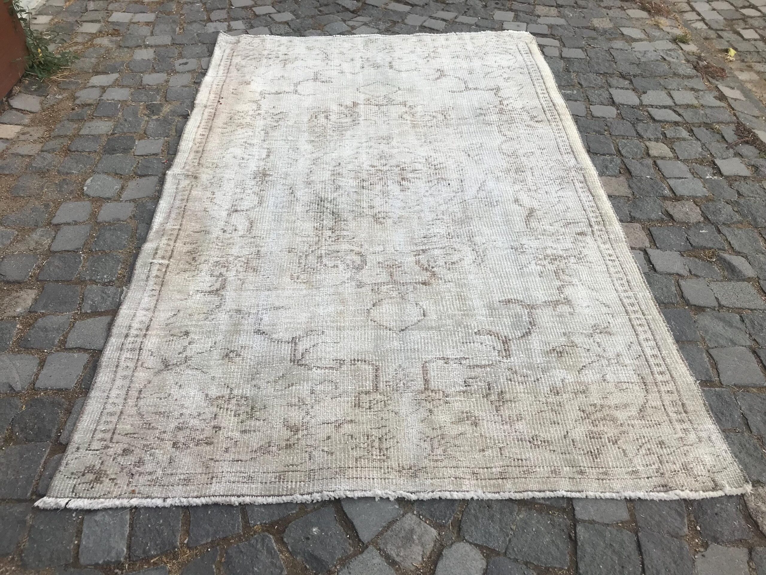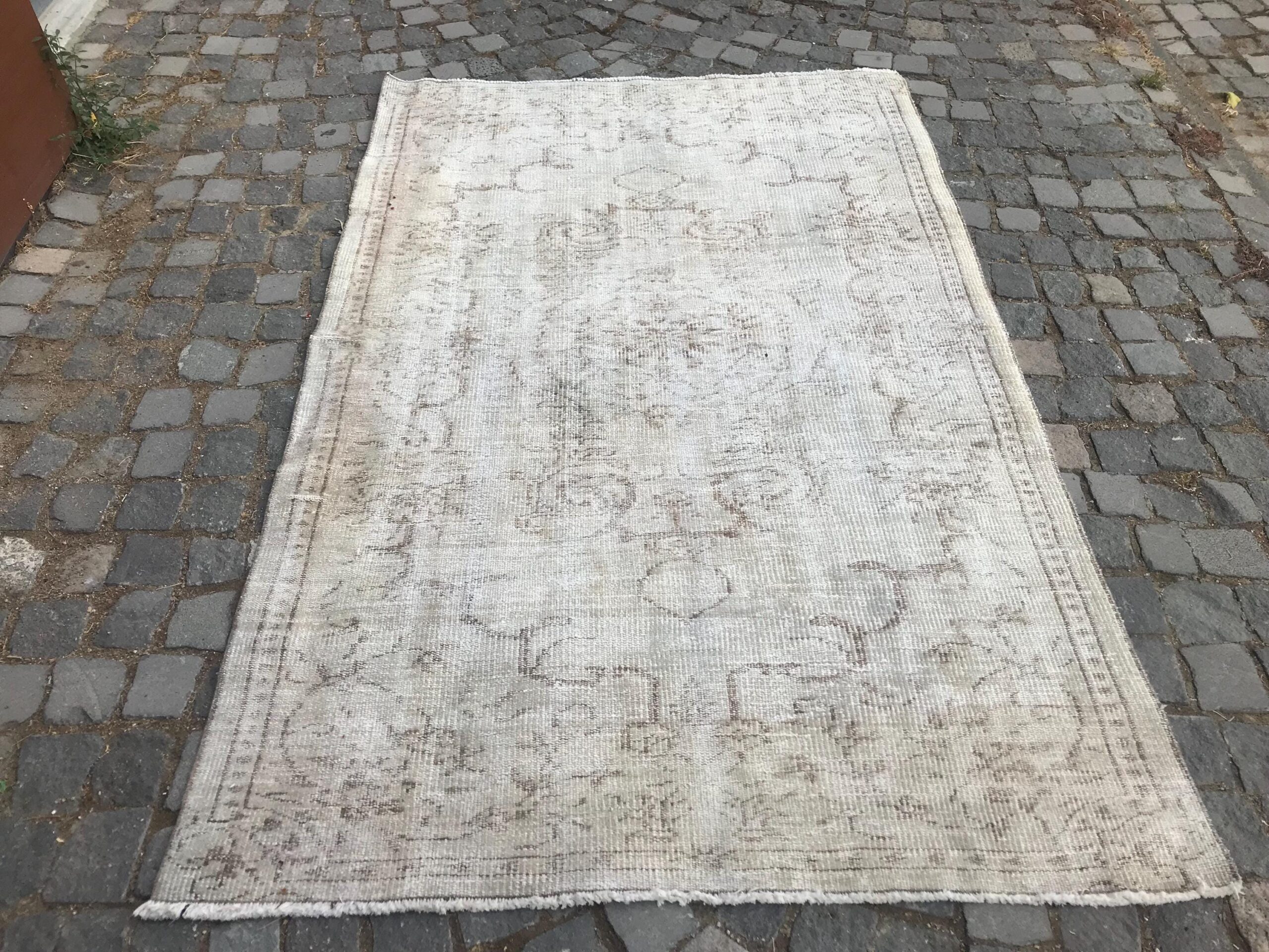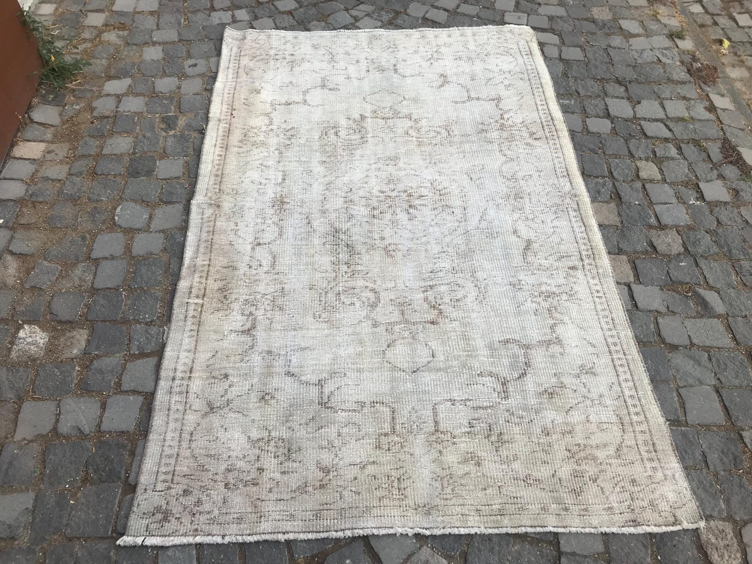 Lovely and unique 4.5 ft. x 7 ft. (136 cm x 214 cm) vintage Turkish rug hand-knotted in Turkey from organic wool. This is an authentic vintage Turkish rug from the 1980s that has worn beautifully to perfection.