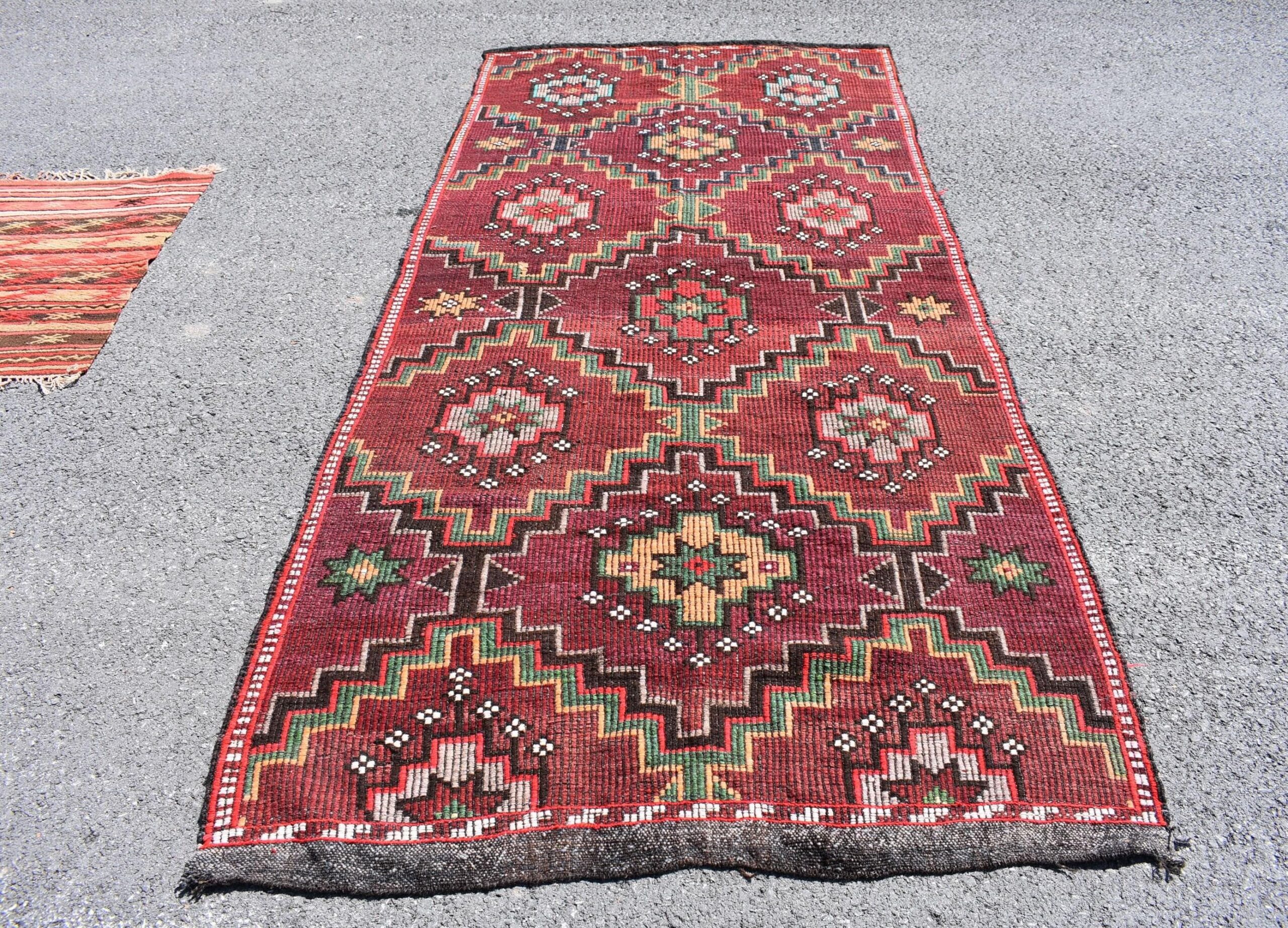This is a vintage kilim rug hand-woven in a small village in Turkey by skilled Anatolian women during around the 1990s. It is made from natural wool (sheep) and dyed using all-natural (vegetable) dyes. Natural materials are more durable than synthetic materials guaranteeing a rug that can last for years while natural dyes provide colors that gets more beautiful as years pass by especially when in direct sunlight.