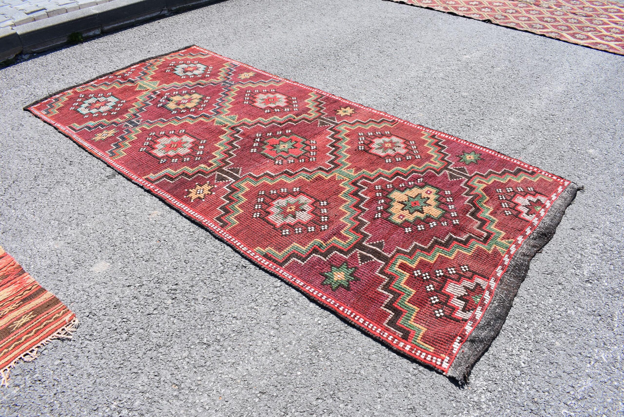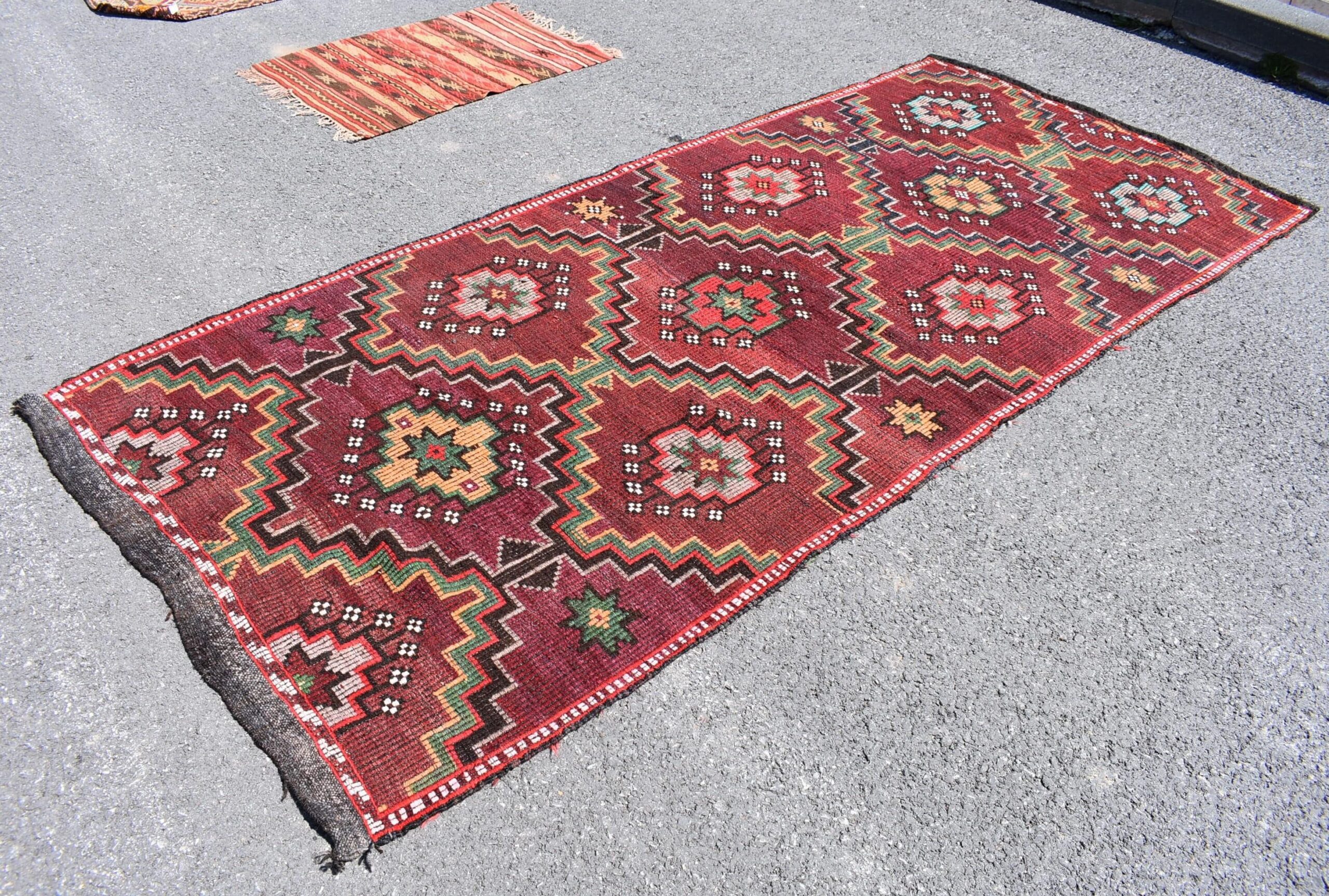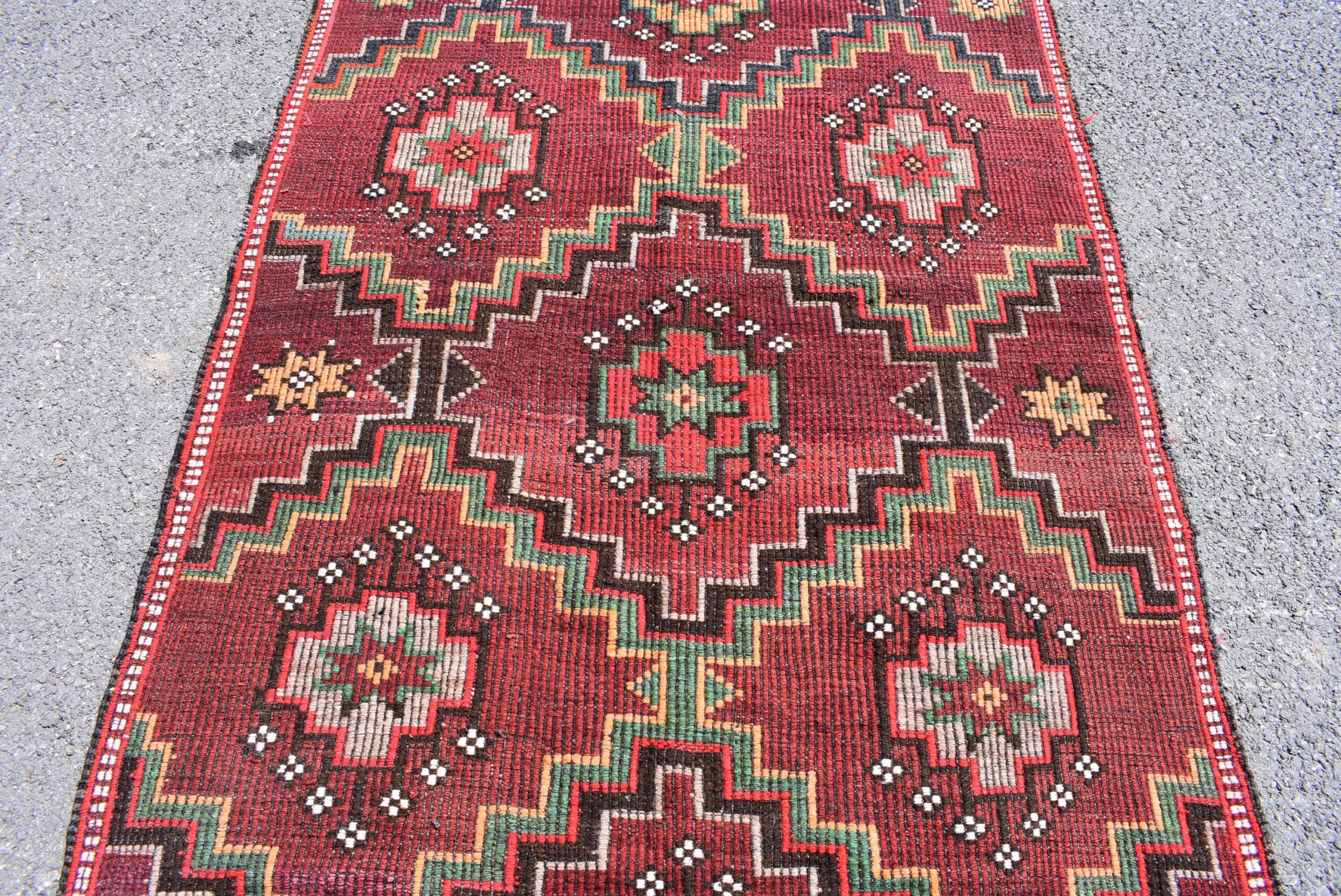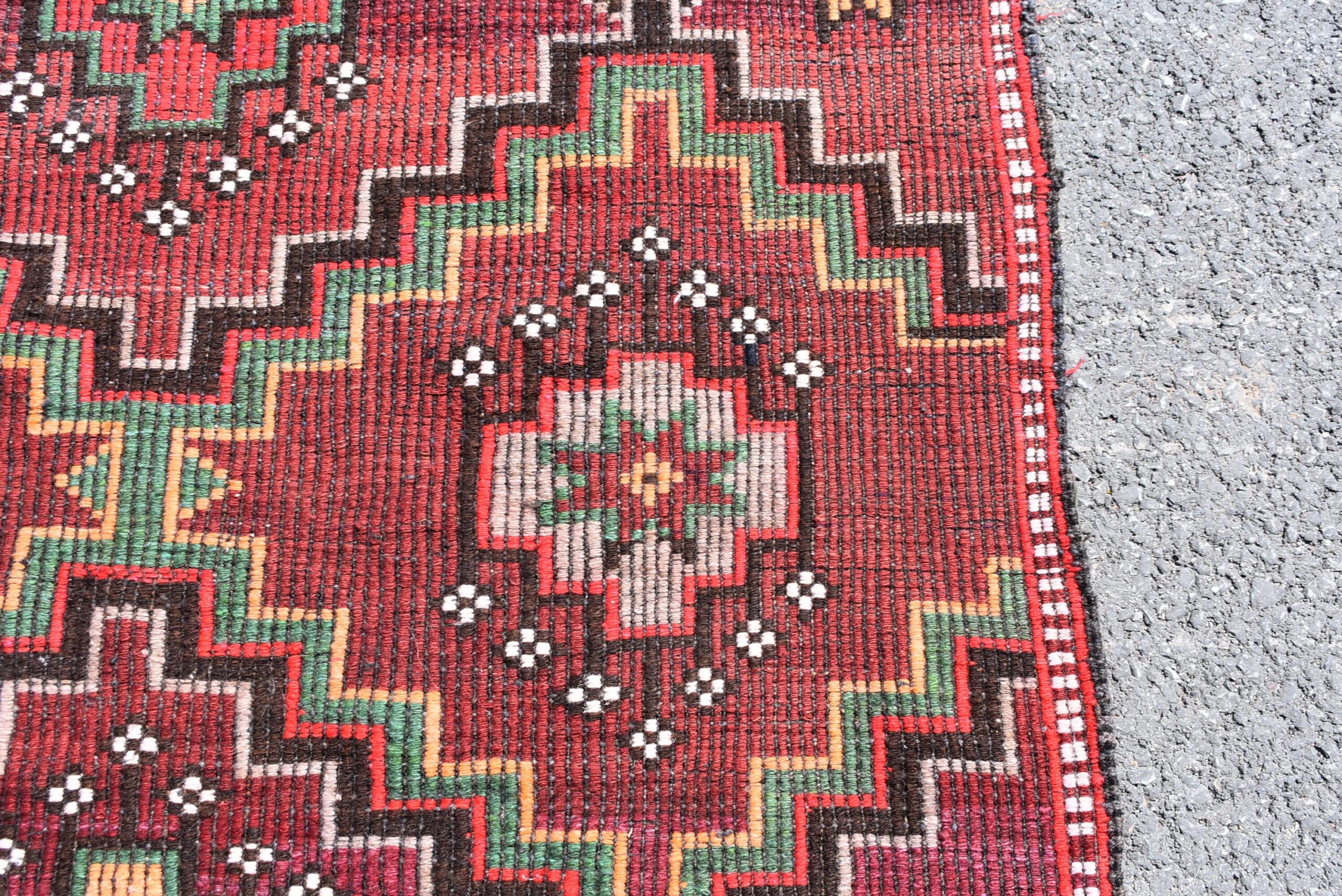 Pretty and one-of-a-kind 4.6 ft. x 10.2 ft. (139 cm x 312 cm) vintage kilim rug hand-woven in Turkey from organic wool. This is an authentic vintage kilim rug from the 1990s that has worn splendidly to perfection.