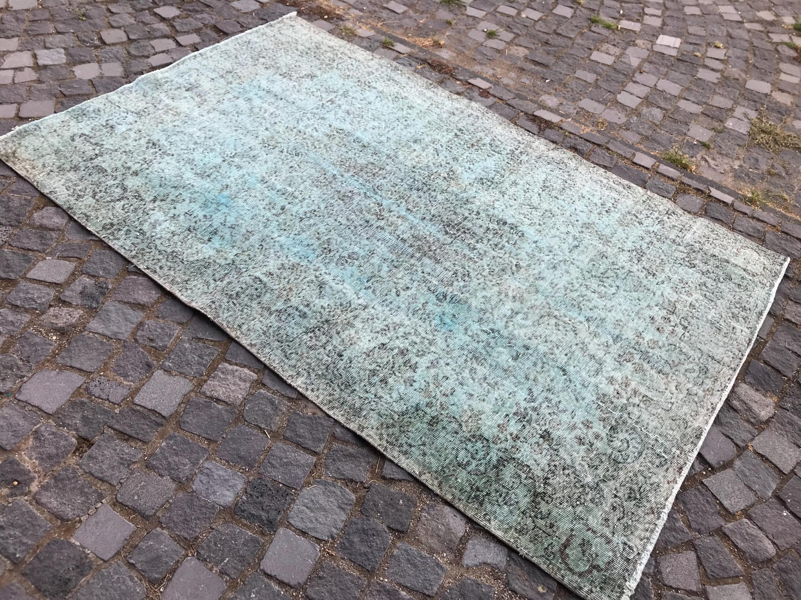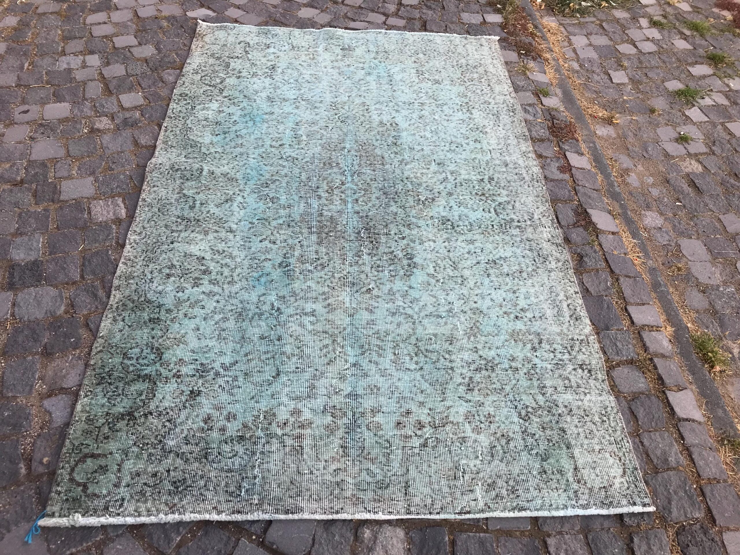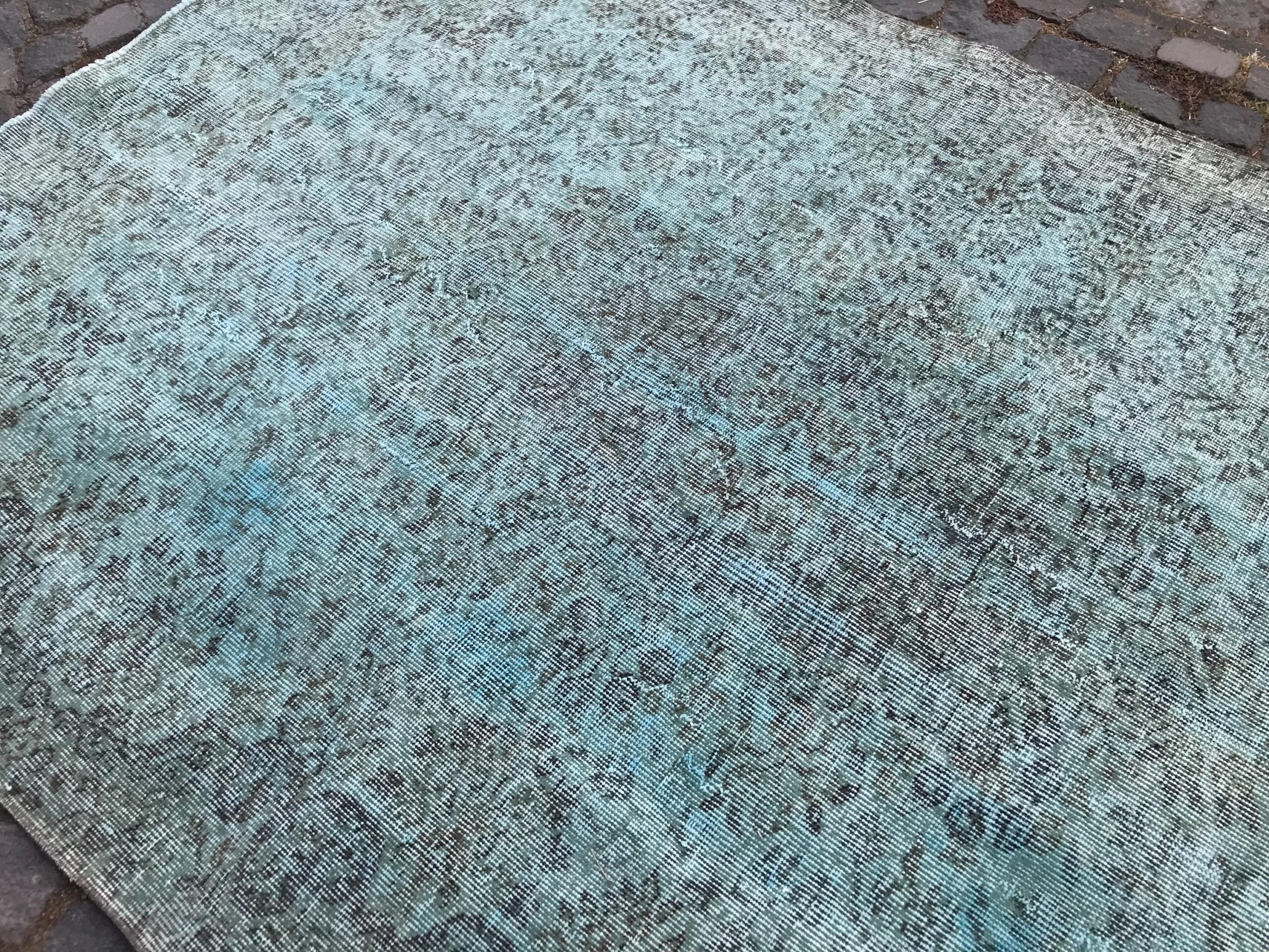 This is a vintage overdyed rug made through over-dyeing an authentic vintage Turkish rug using natural (vegetable) dyes. This rug originated in a small village in Turkey where it was hand-knotted from natural wool (sheep) by skilled Anatolian women during around the 1980s. Natural materials are more durable than synthetic materials guaranteeing a rug that can last for years while natural dyes provide colors that gets more beautiful as years pass by especially when in direct sunlight.