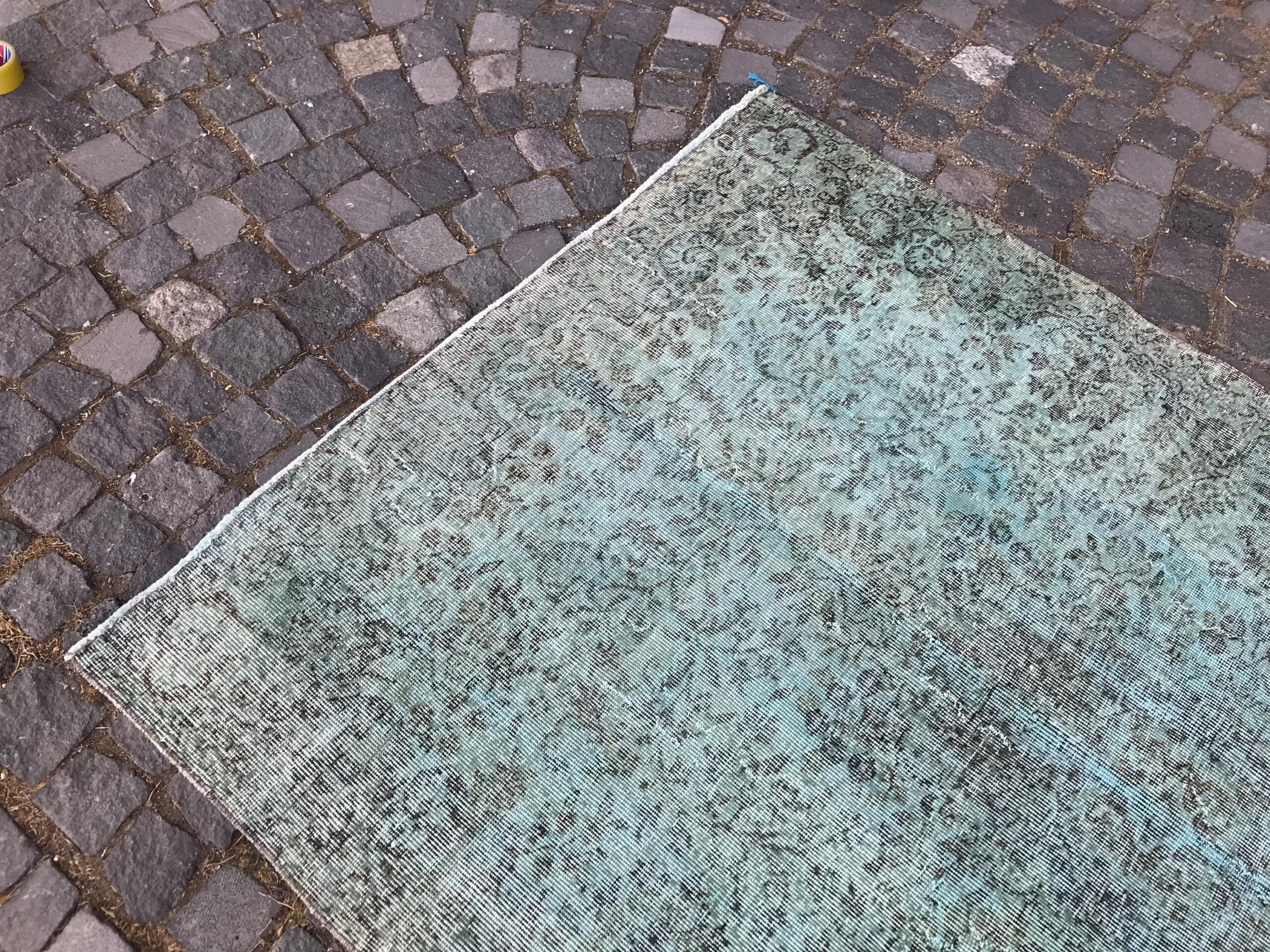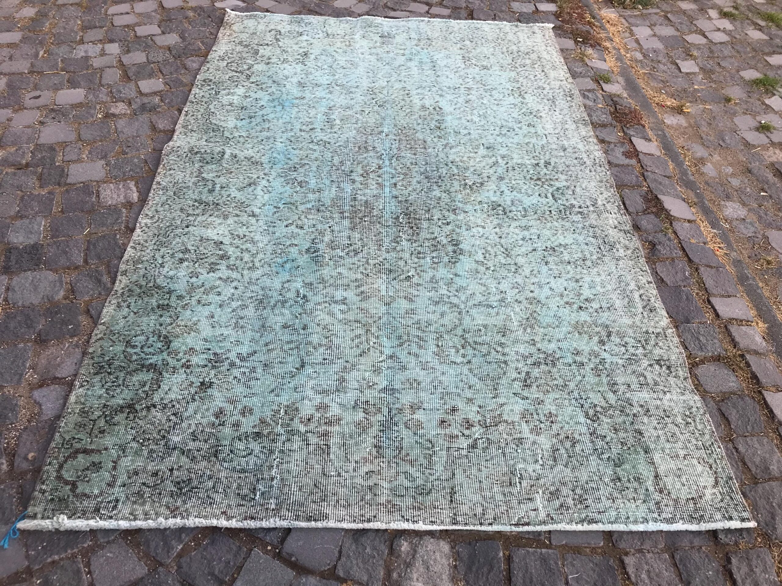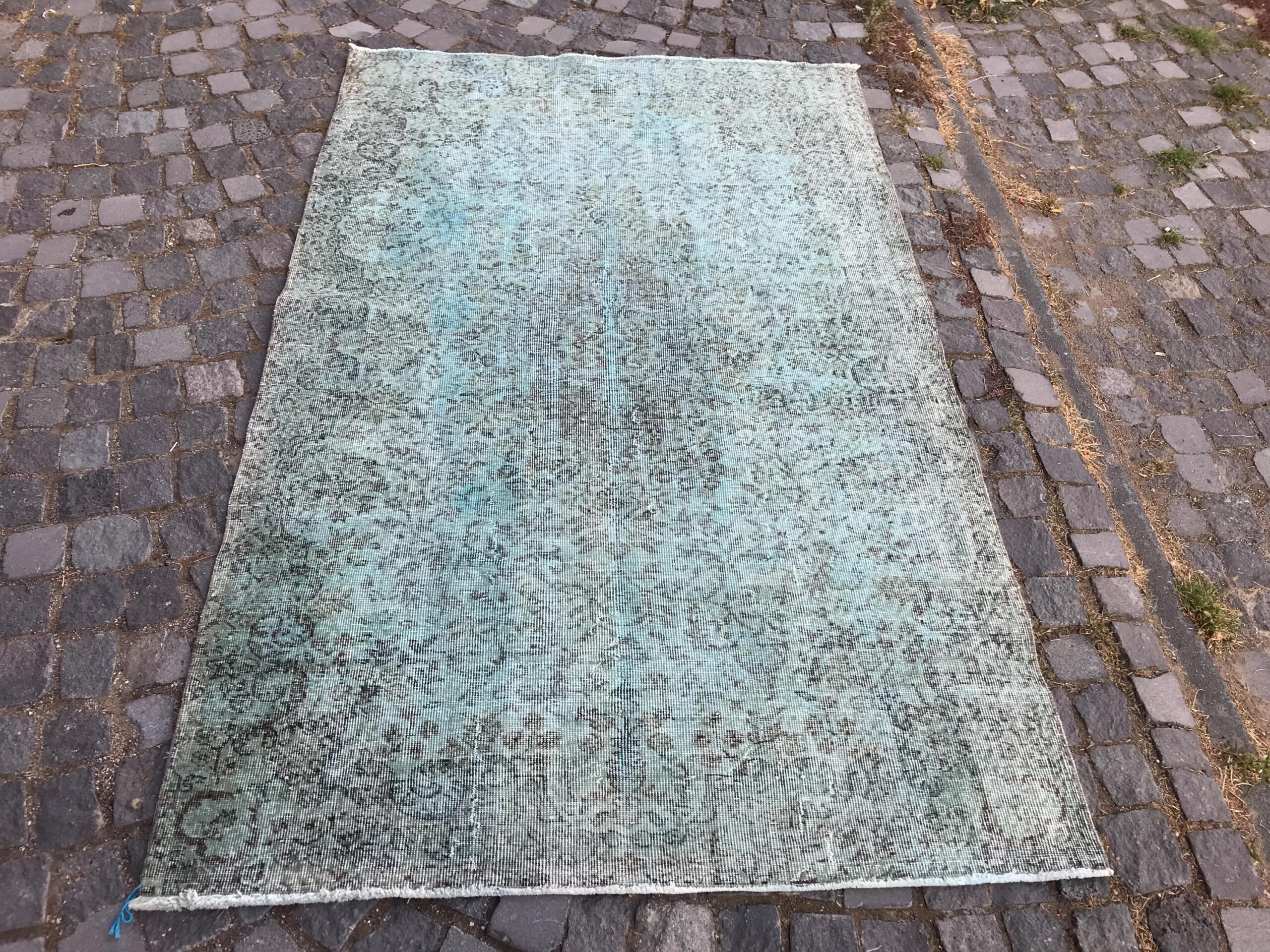 This is a vintage overdyed rug made through over-dyeing an authentic vintage Turkish rug using natural (vegetable) dyes. This rug originated in a small village in Turkey where it was hand-knotted from natural wool (sheep) by skilled Anatolian women during around the 1980s. Natural materials are more durable than synthetic materials guaranteeing a rug that can last for years while natural dyes provide colors that gets more beautiful as years pass by especially when in direct sunlight.