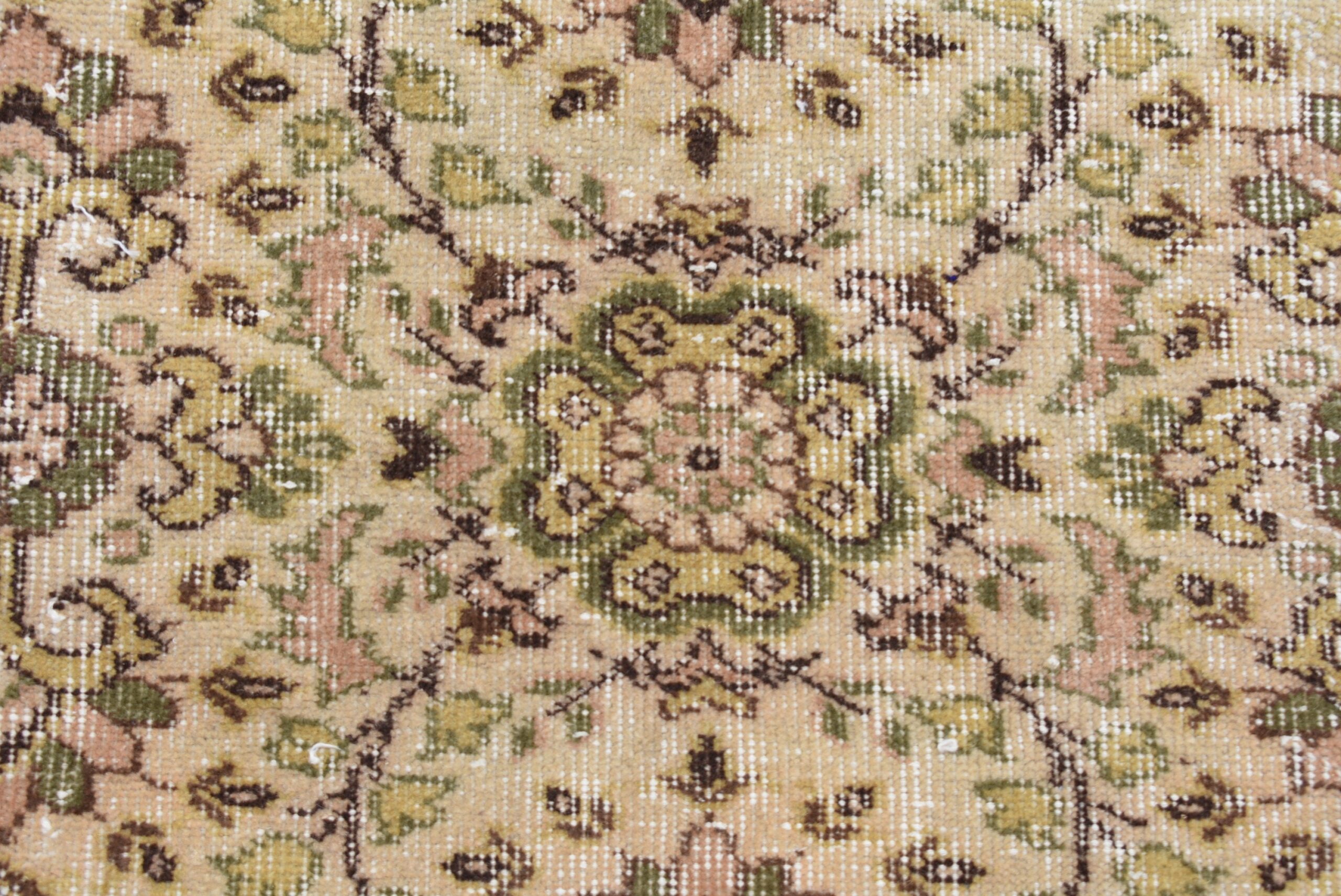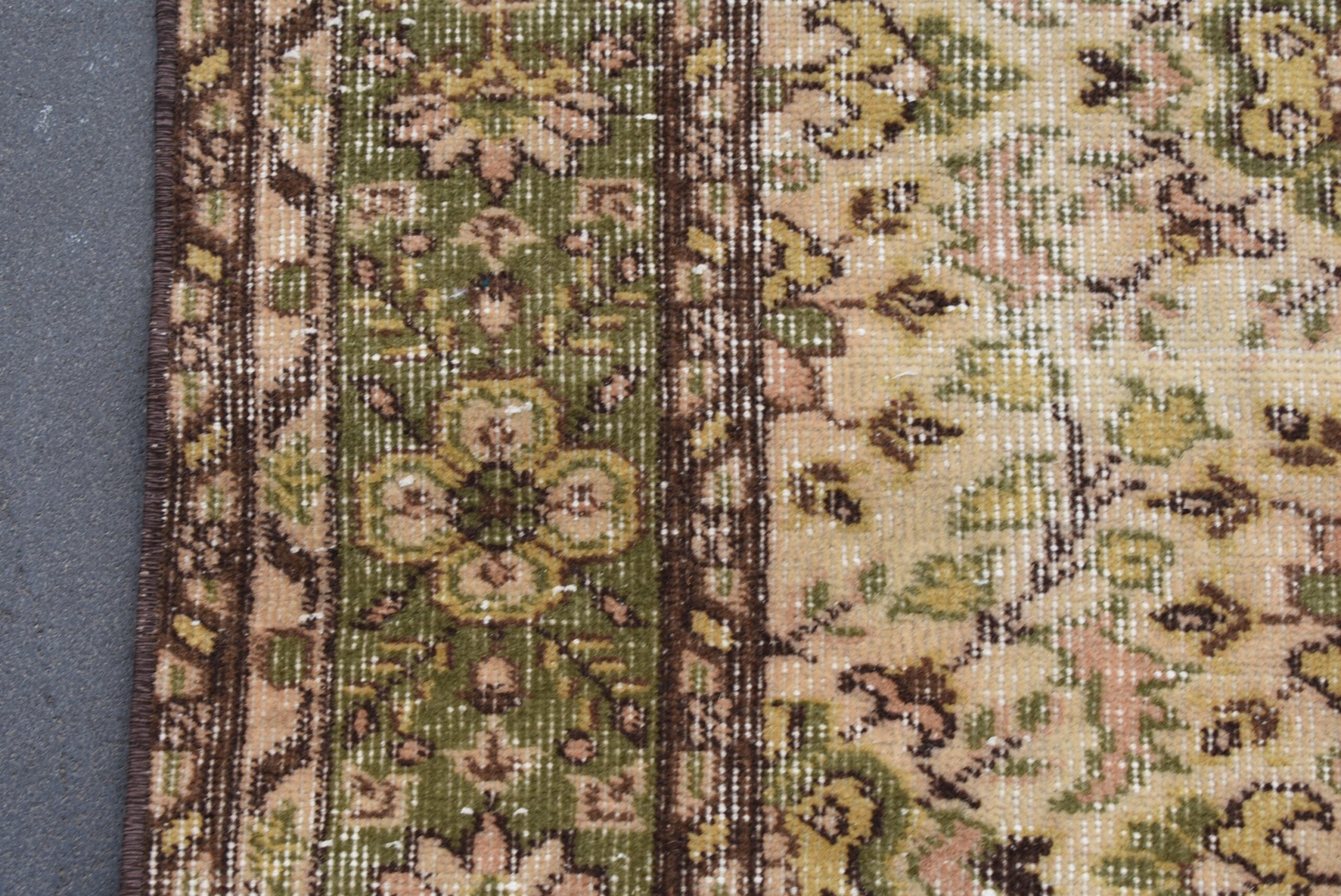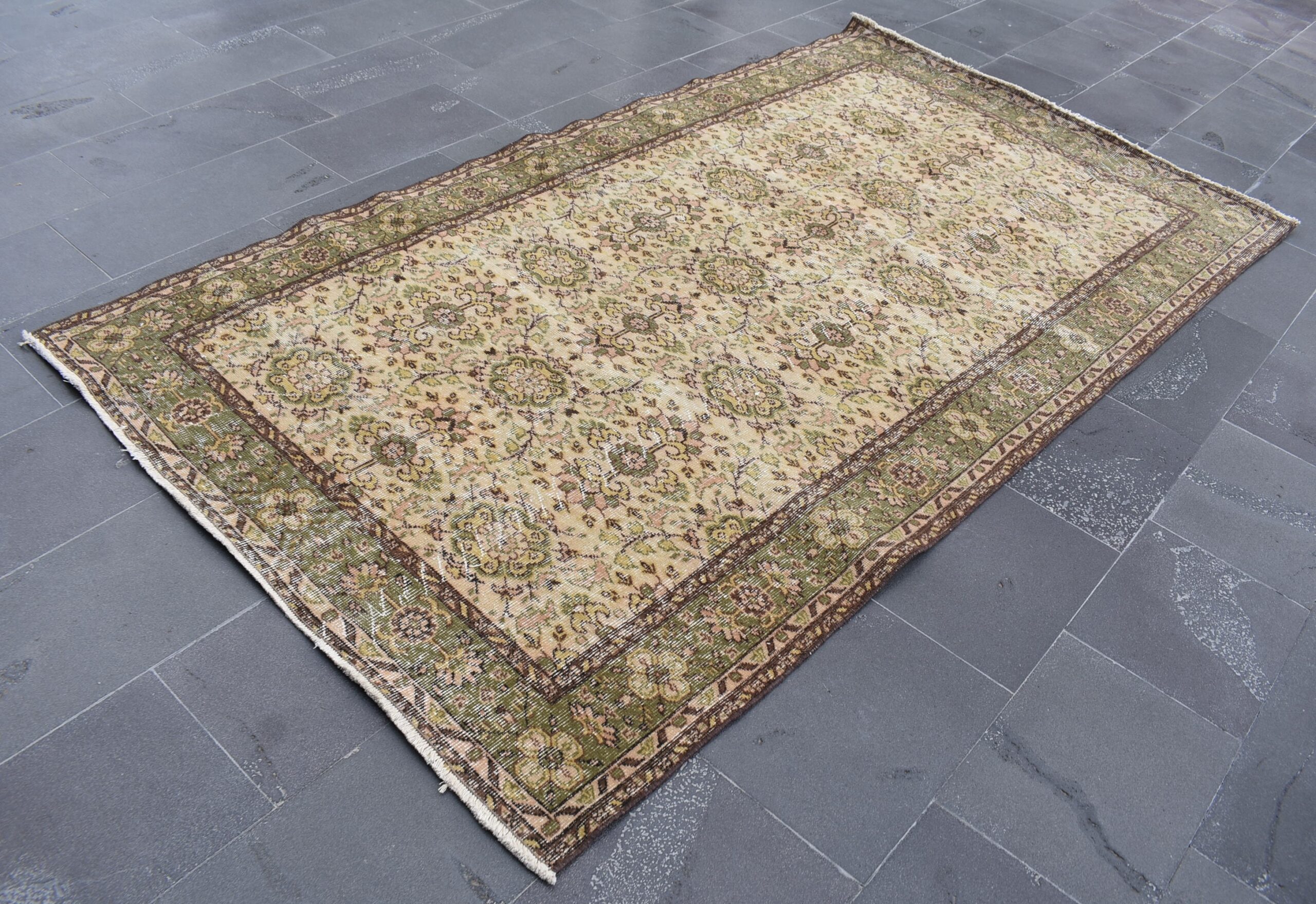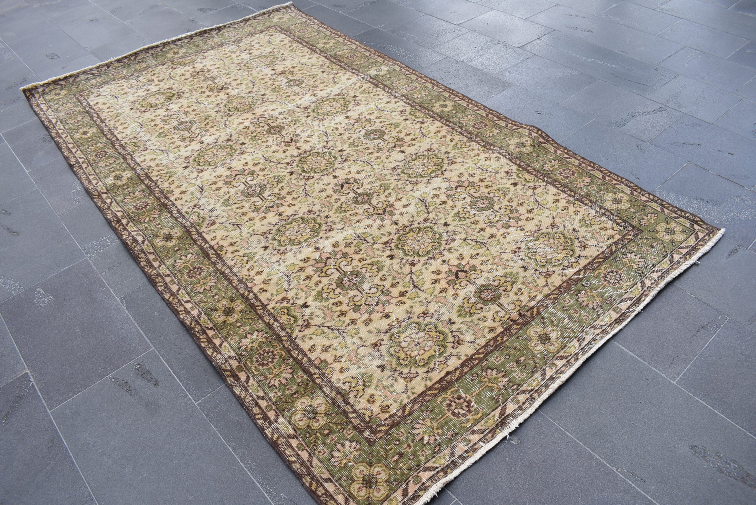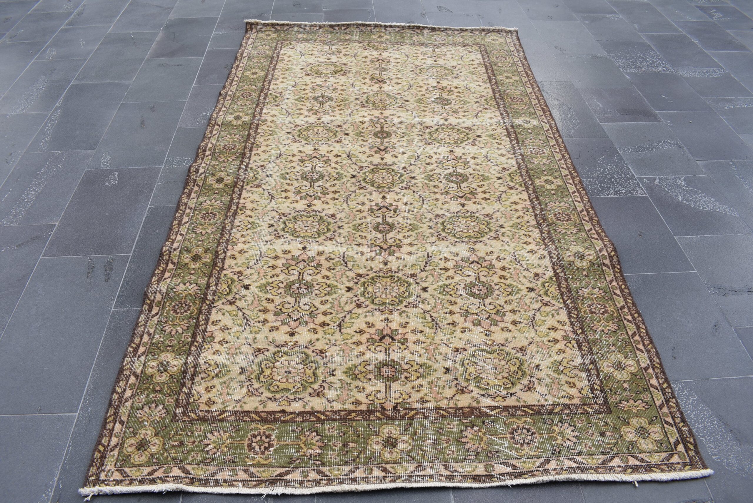 This is a vintage Turkish rug hand-knotted in a small village in Turkey by skilled Anatolian women during around the 1990s. It is made from natural wool (sheep) and dyed using all-natural (vegetable) dyes. Natural materials are more durable than synthetic materials guaranteeing a rug that can last for years while natural dyes provide colors that gets more beautiful as years pass by especially when in direct sunlight.