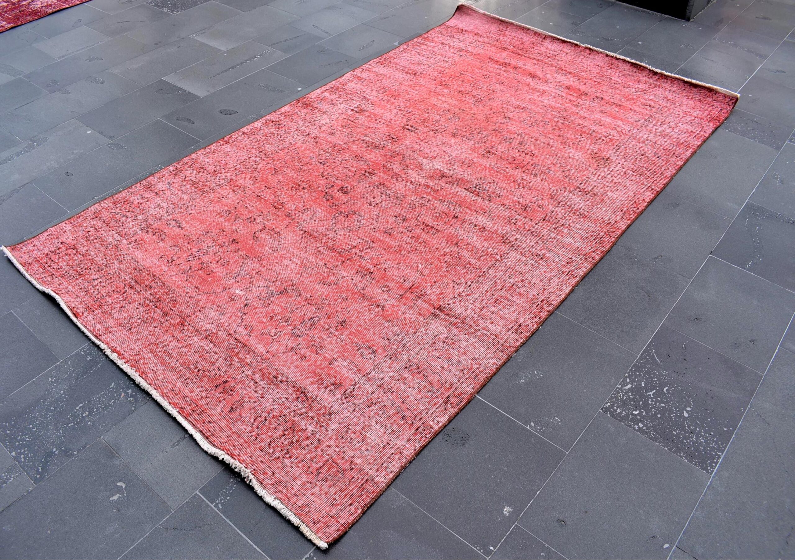 This is a vintage overdyed rug made through over-dyeing an authentic vintage Turkish rug using natural (vegetable) dyes. This rug originated in a small village in Turkey where it was hand-knotted from natural wool (sheep) by skilled Anatolian women during around the 1980s. Natural materials are more durable than synthetic materials guaranteeing a rug that can last for years while natural dyes provide colors that gets more beautiful as years pass by especially when in direct sunlight.