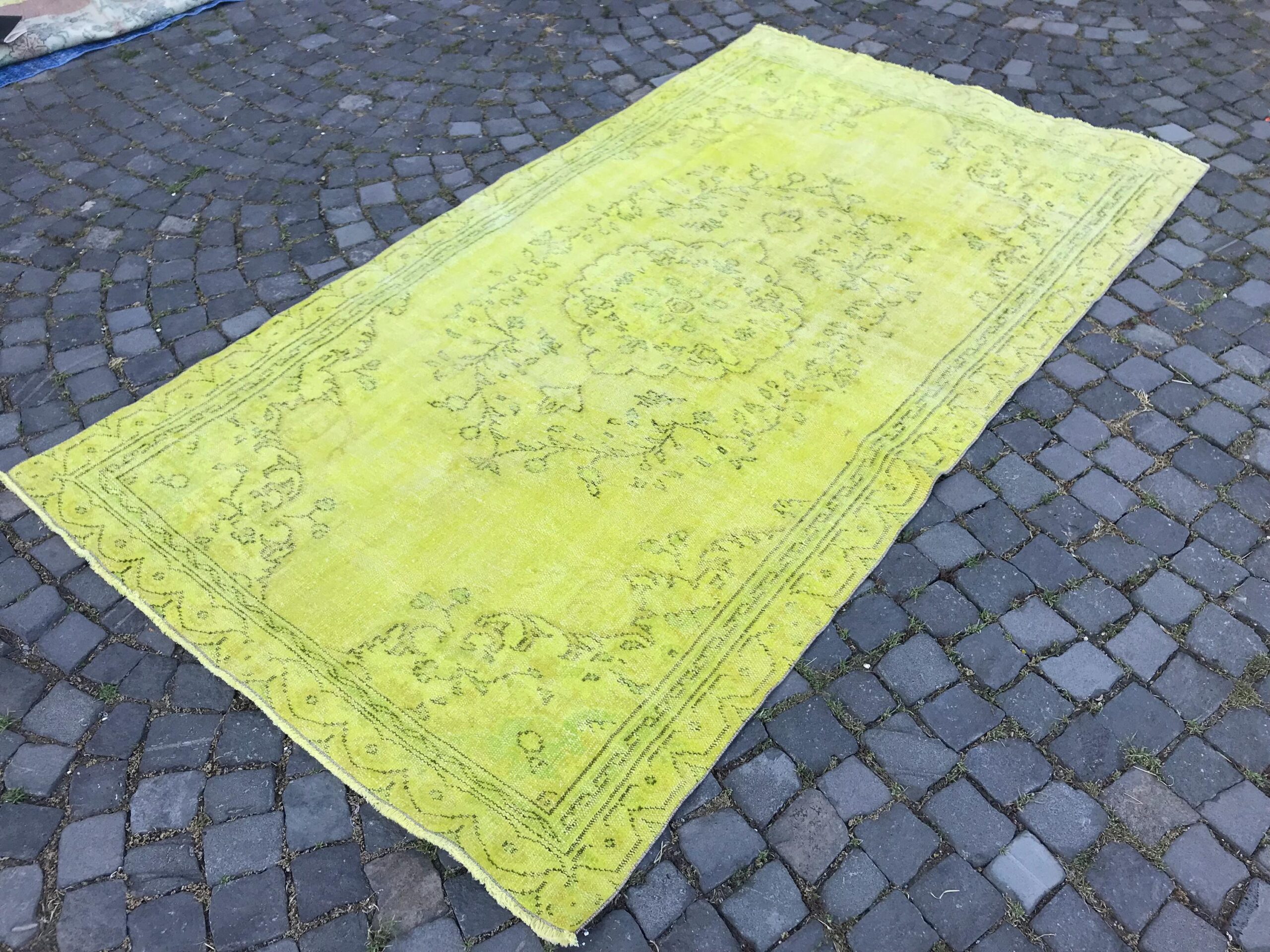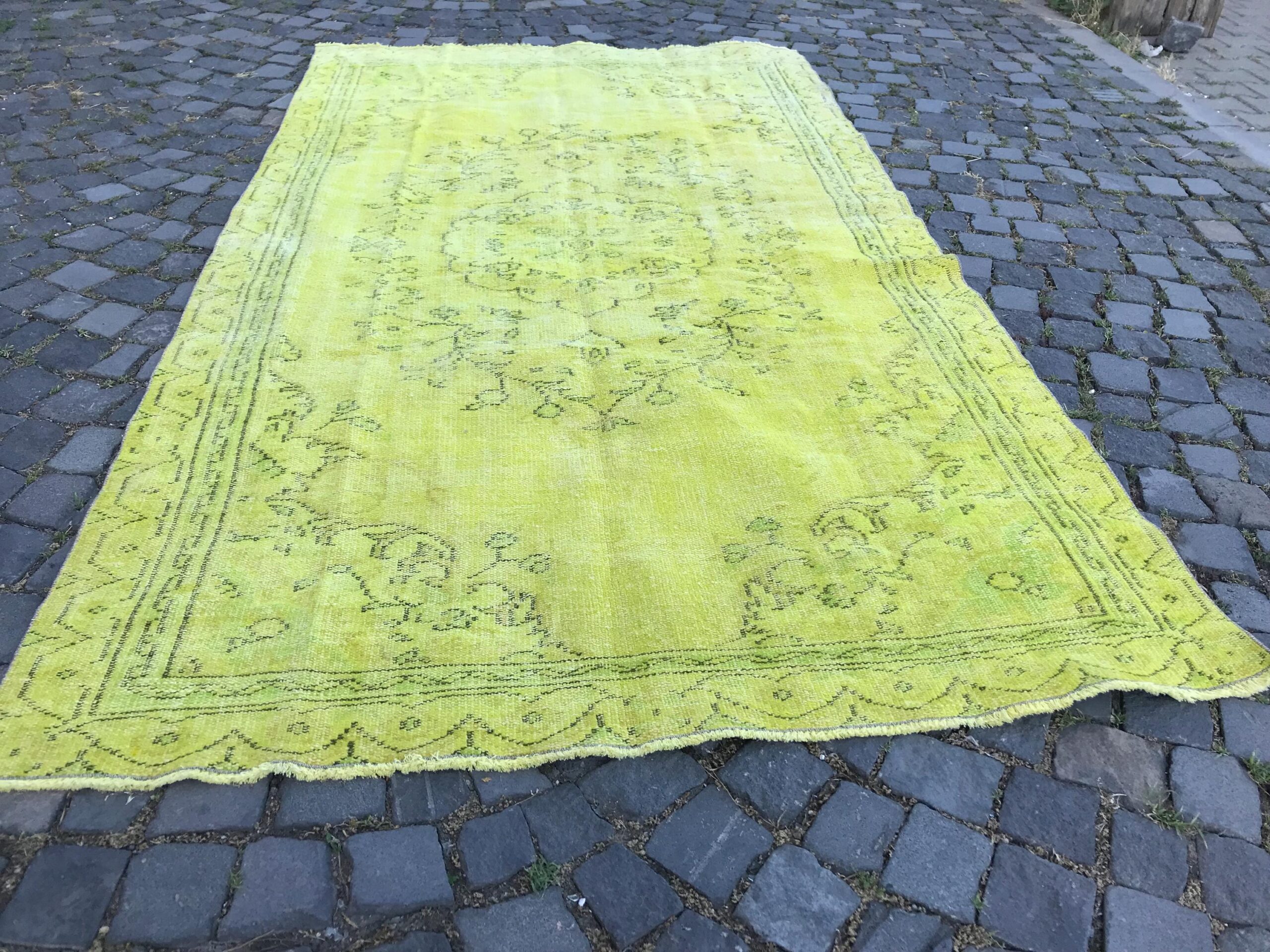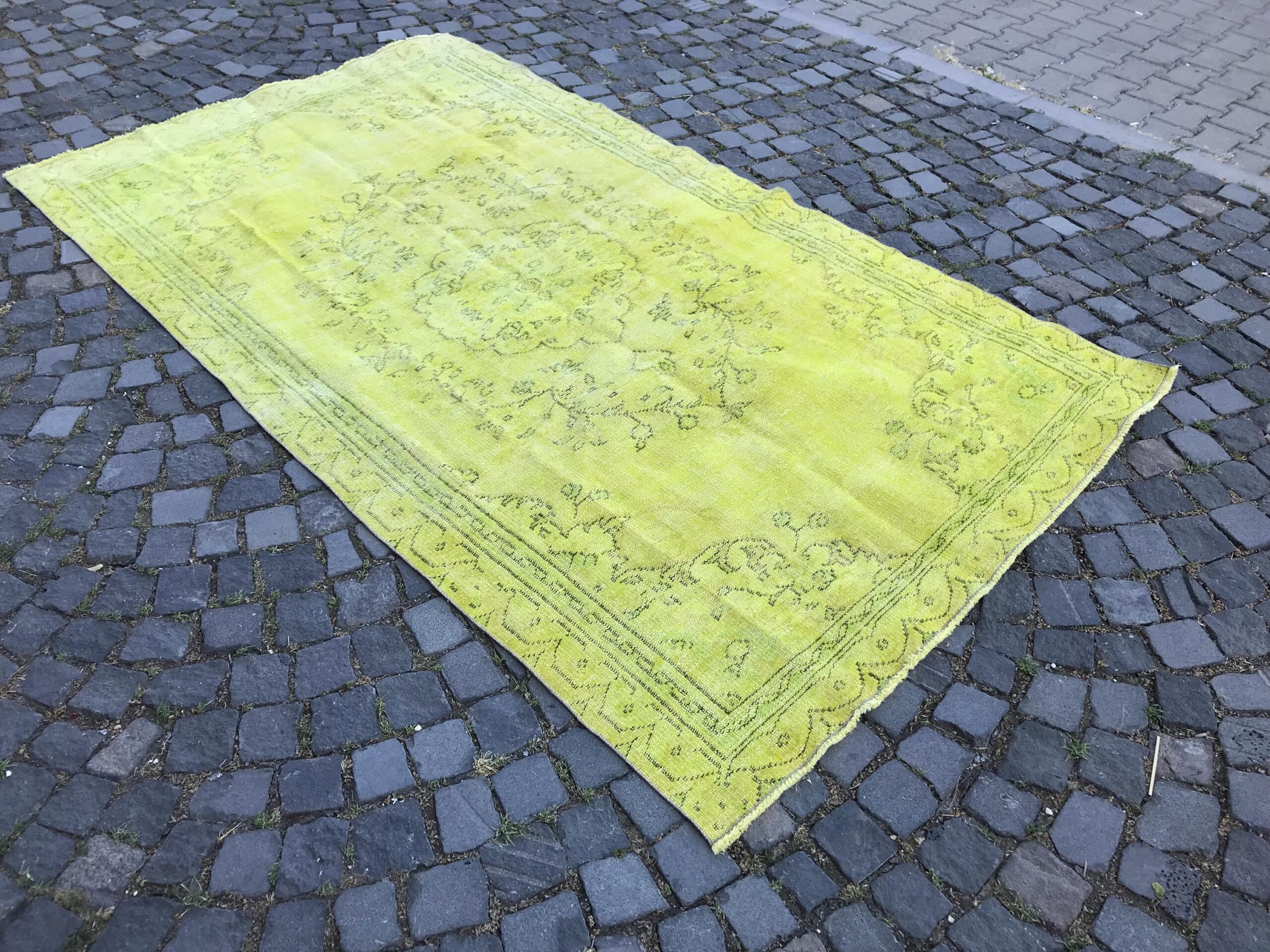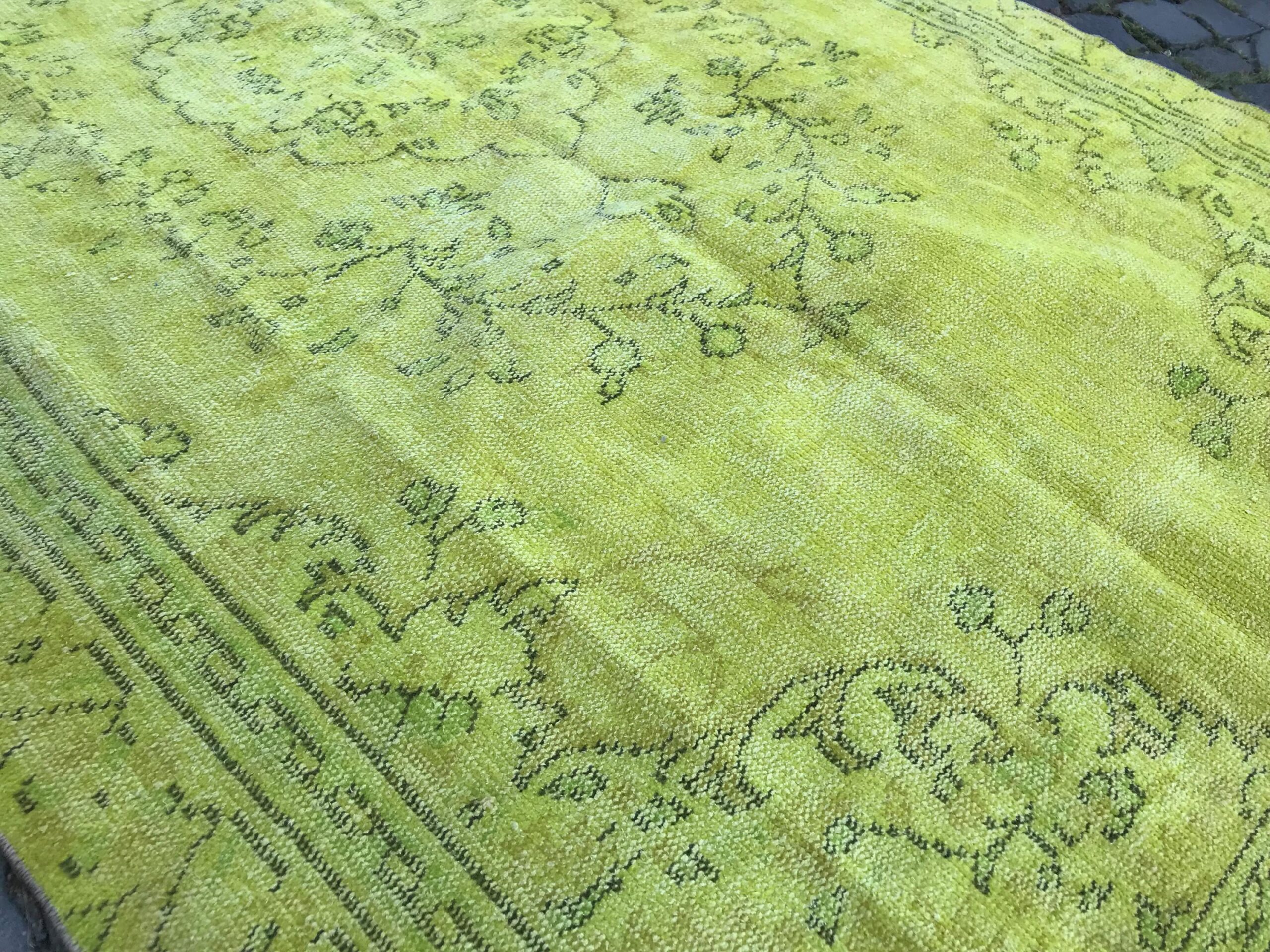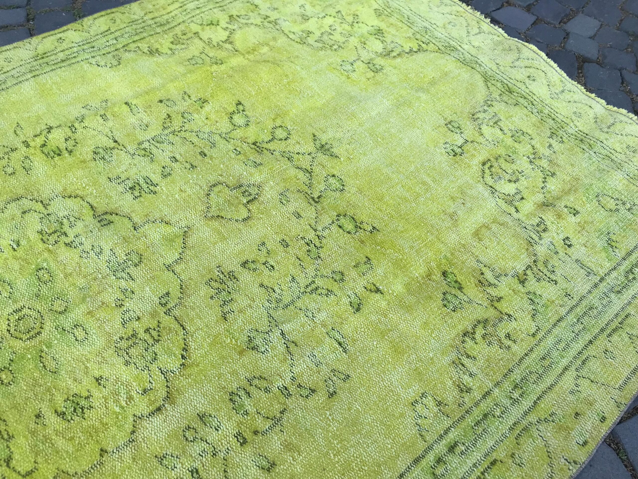 This is a vintage overdyed rug made through over-dyeing an authentic vintage Turkish rug using natural (vegetable) dyes. This rug originated in a small village in Turkey where it was hand-knotted from natural wool (sheep) by skilled Anatolian women during around the 1980s. Natural materials are more durable than synthetic materials guaranteeing a rug that can last for years while natural dyes provide colors that gets more beautiful as years pass by especially when in direct sunlight.