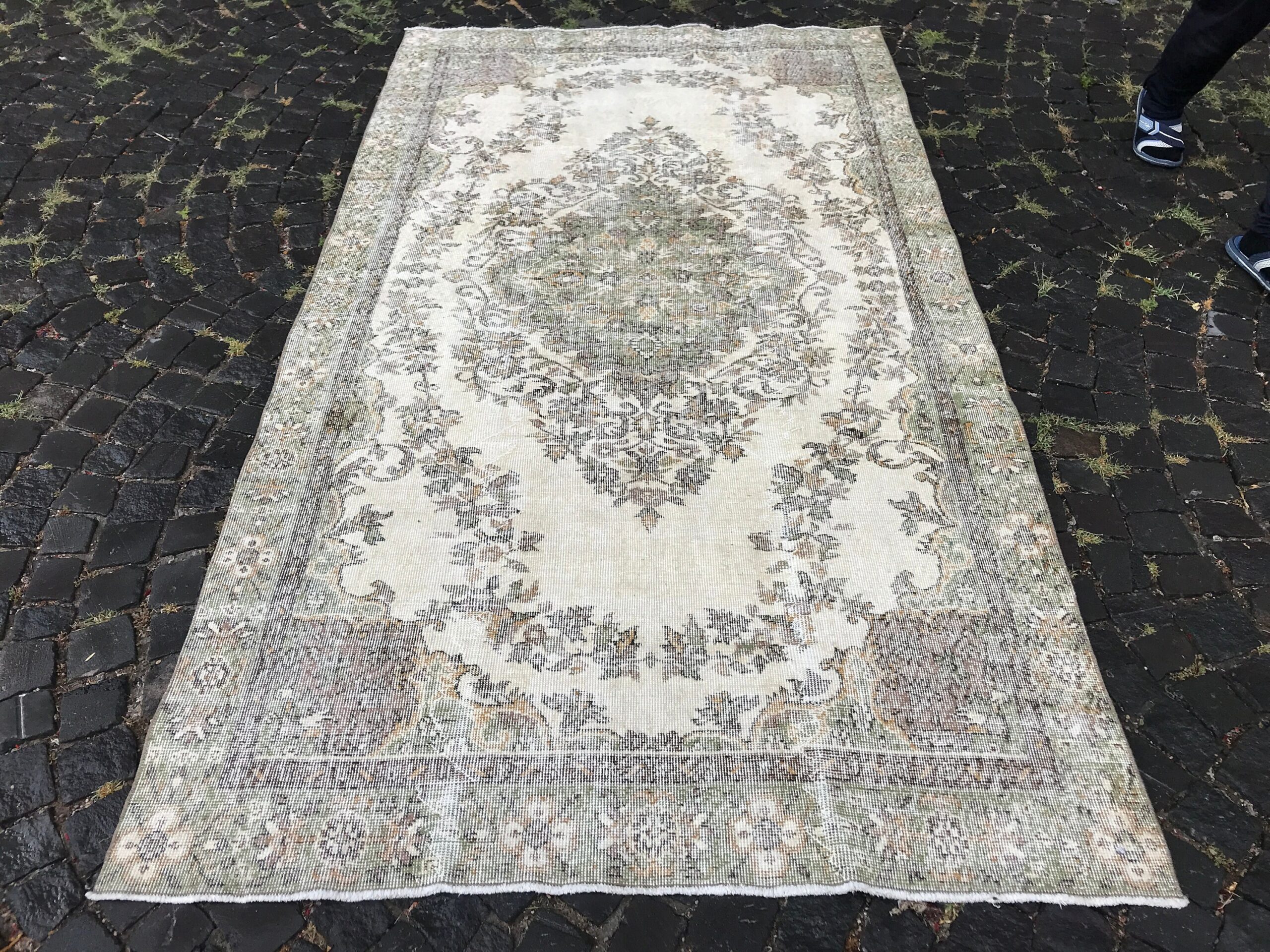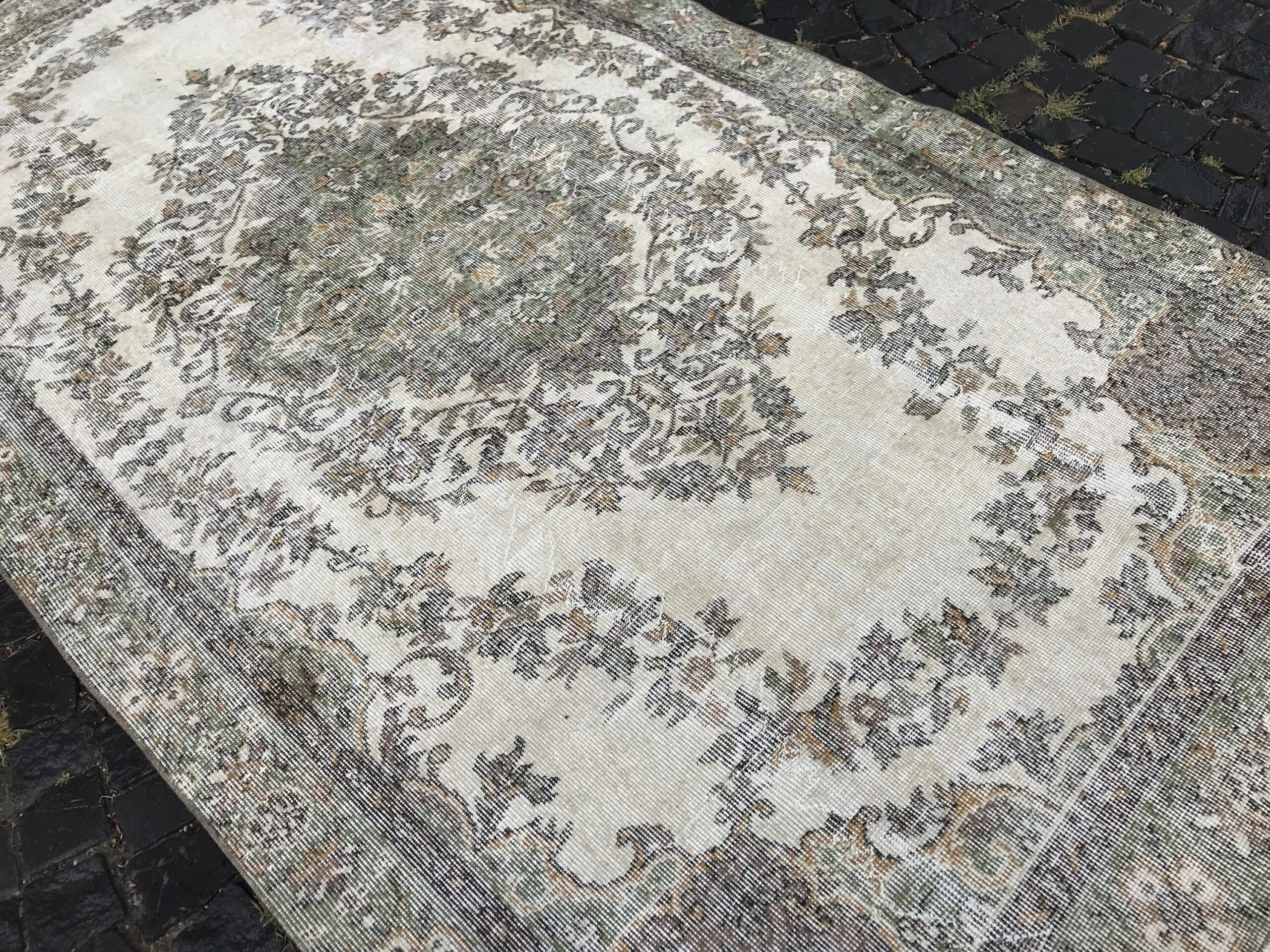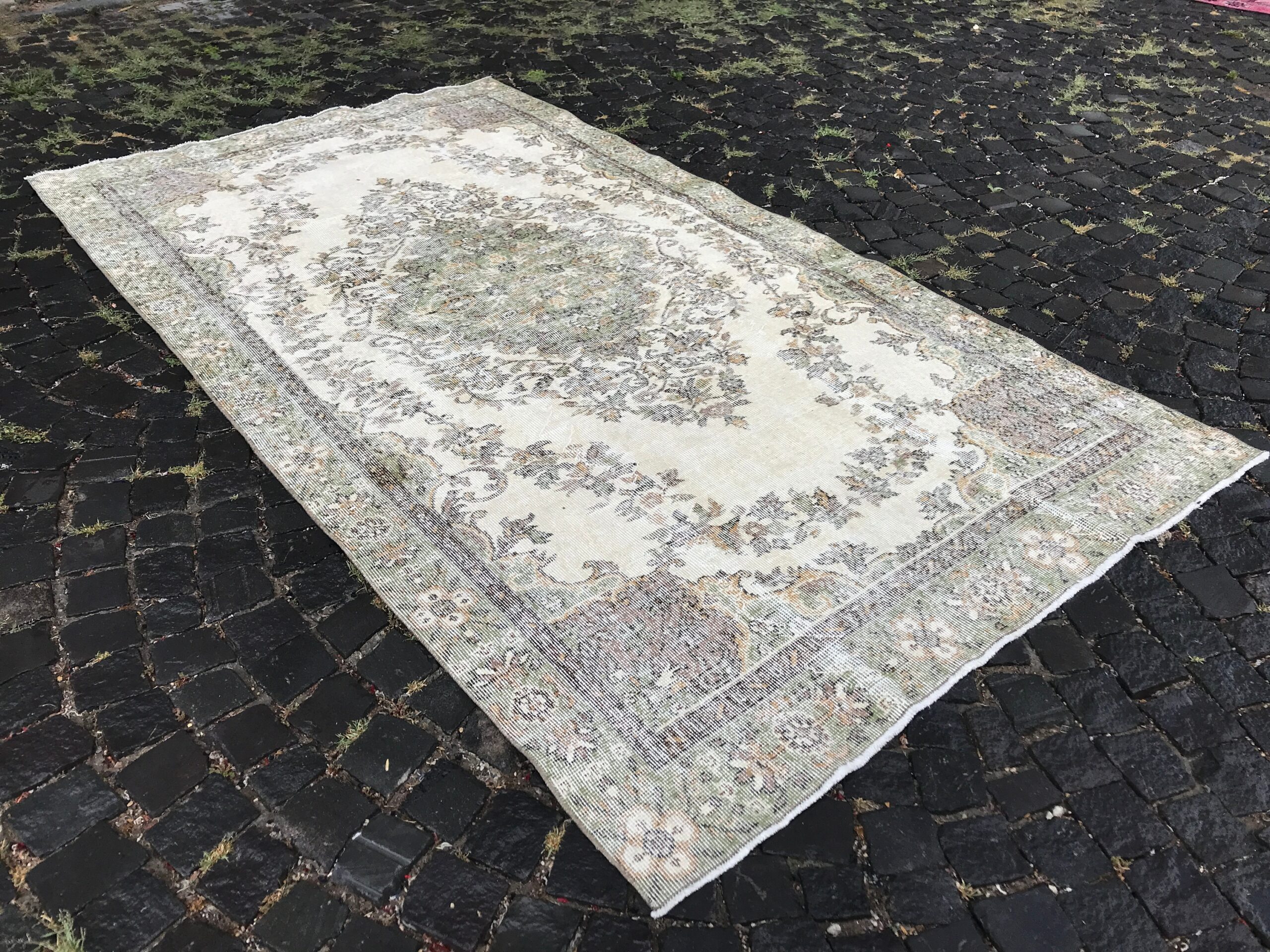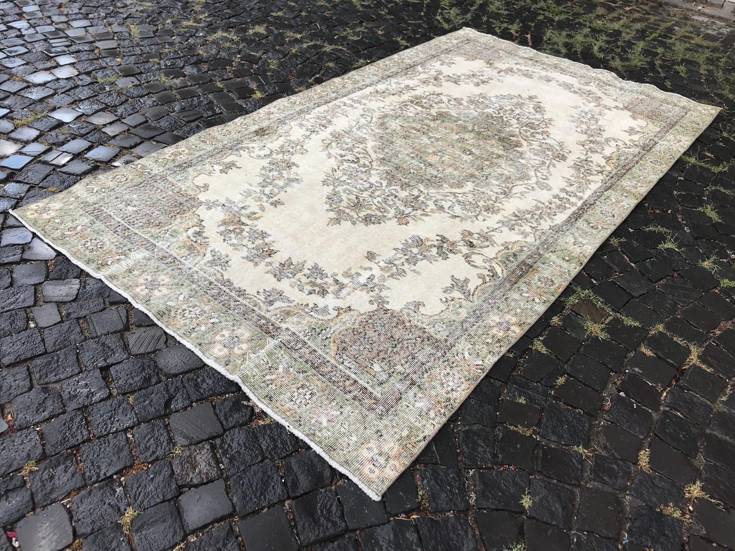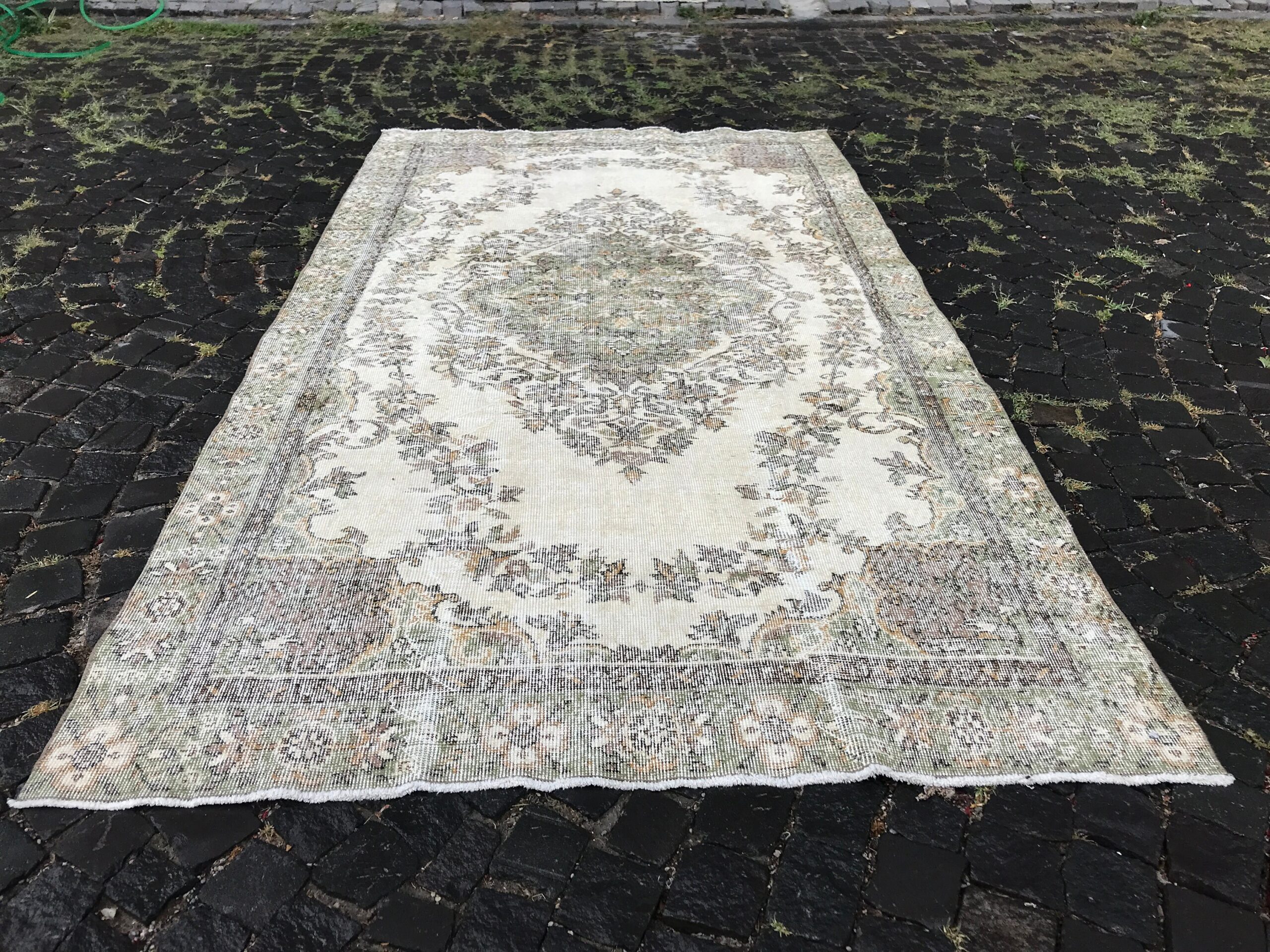 Pretty and one-of-a-kind 5.2 ft. x 8.4 ft. (158 cm x 256 cm) vintage Turkish rug hand-knotted in Turkey from organic wool. This is an authentic vintage Turkish rug from the 1980s that has worn splendidly to perfection.