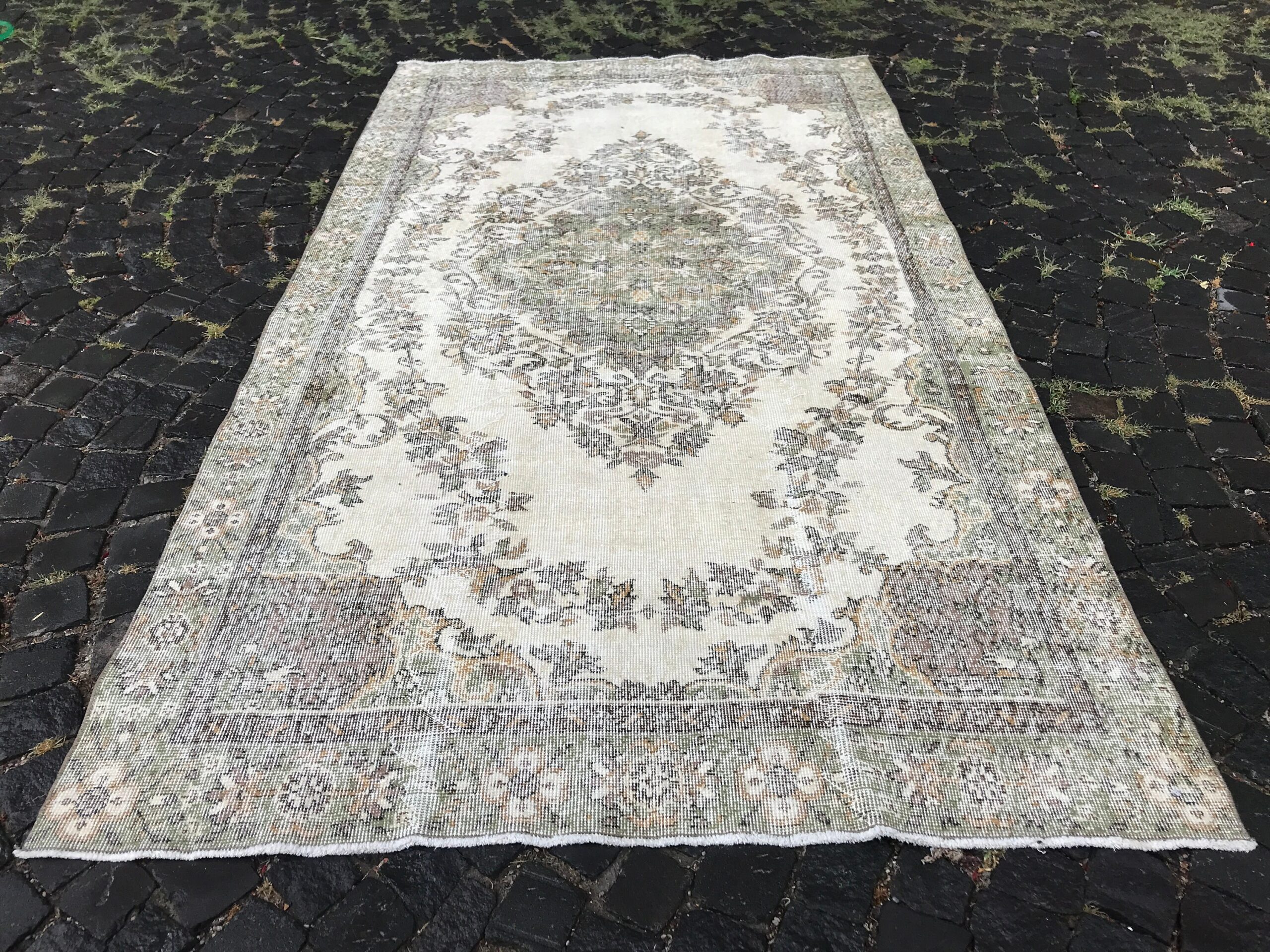 This is a vintage Turkish rug hand-knotted in a small village in Turkey by skilled Anatolian women during around the 1980s. It is made from natural wool (sheep) and dyed using all-natural (vegetable) dyes. Natural materials are more durable than synthetic materials guaranteeing a rug that can last for years while natural dyes provide colors that gets more beautiful as years pass by especially when in direct sunlight.
